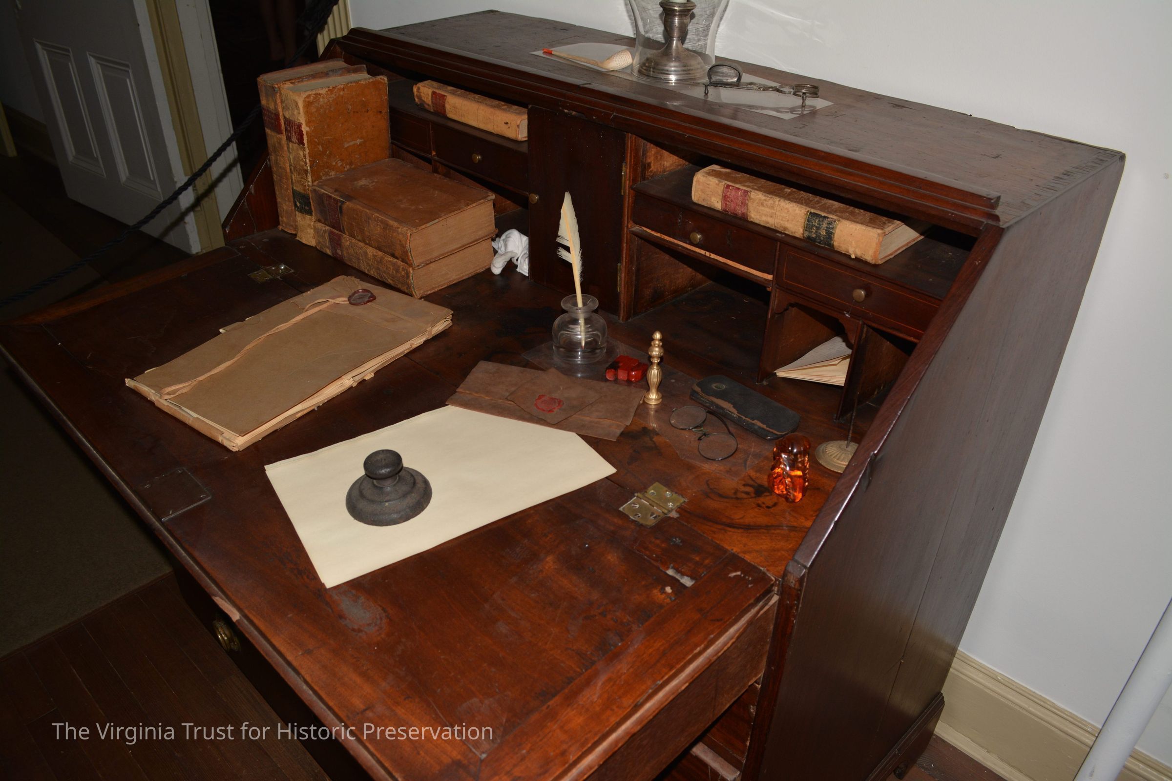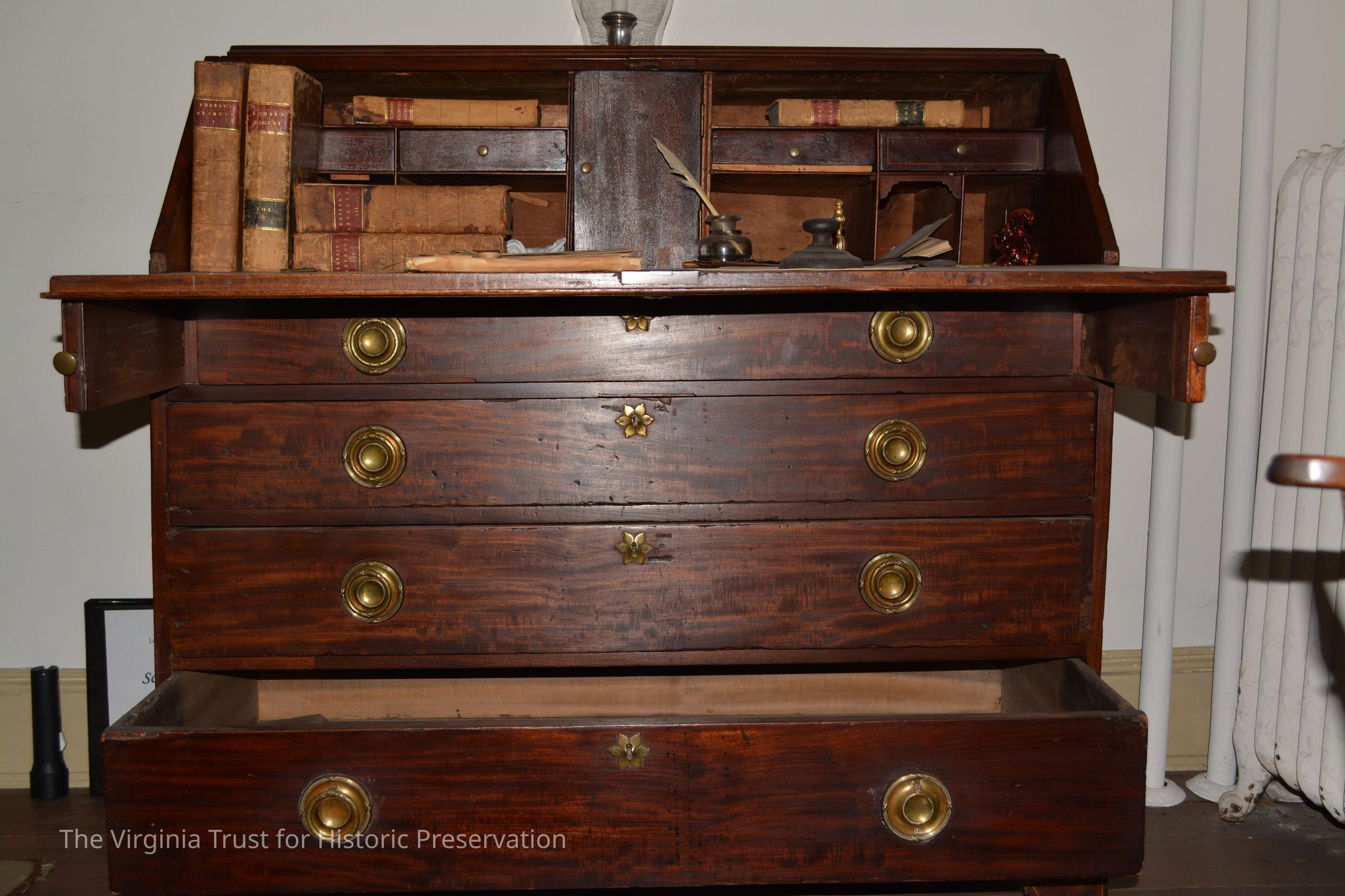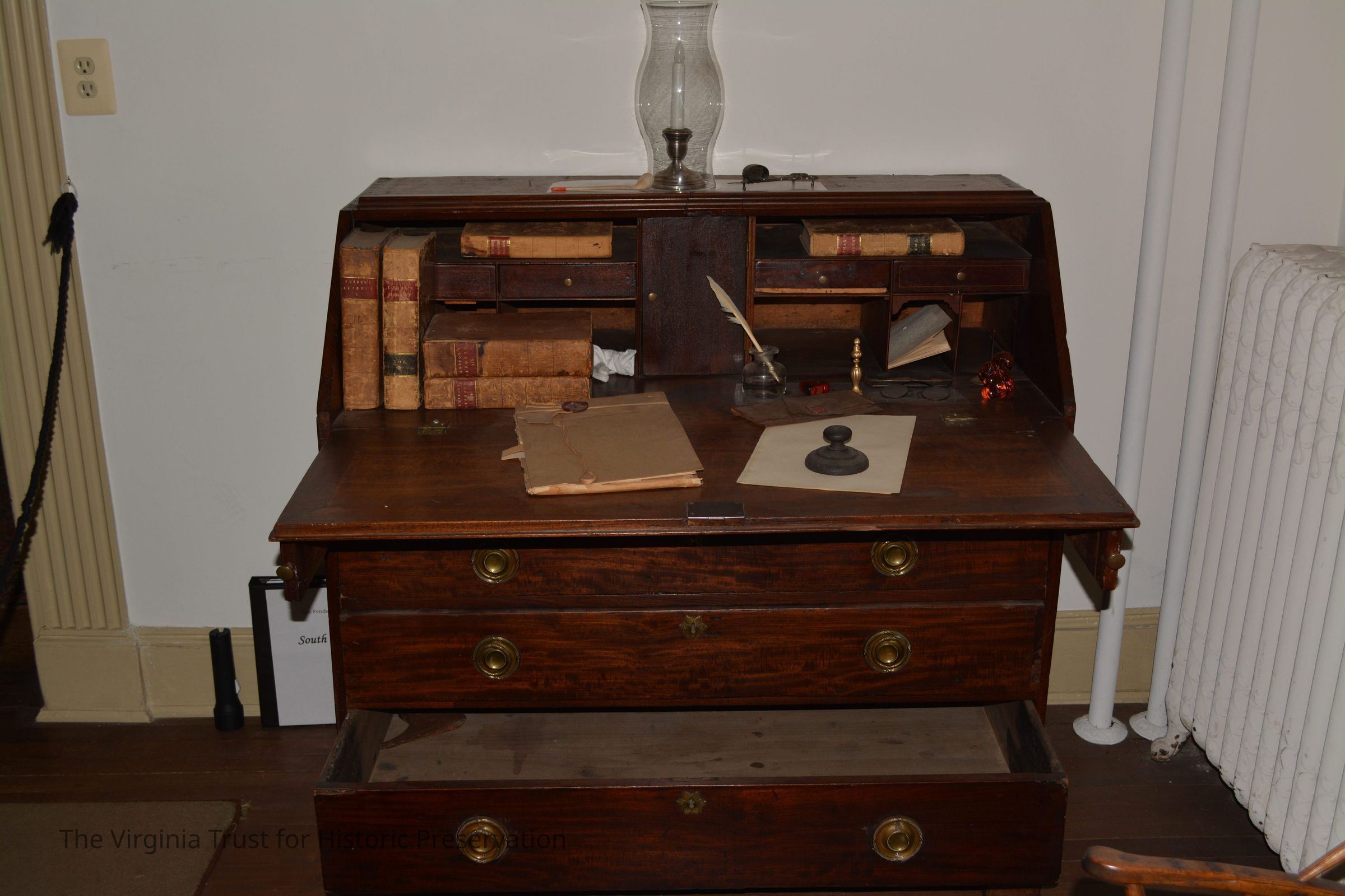 Slant-top writing desk originally belonged to Edmund Jennings Lee. He passed the desk to his eldest son, Edmund Jennings Lee, Jr., who brought the desk to Bedford plantation (West Virginia) when he moved there after marrying his wife, Henrietta Bedinger Lee. Top half of book case was destroyed in a fire when Union troops set the Bedford mansion ablaze during the Civil War.