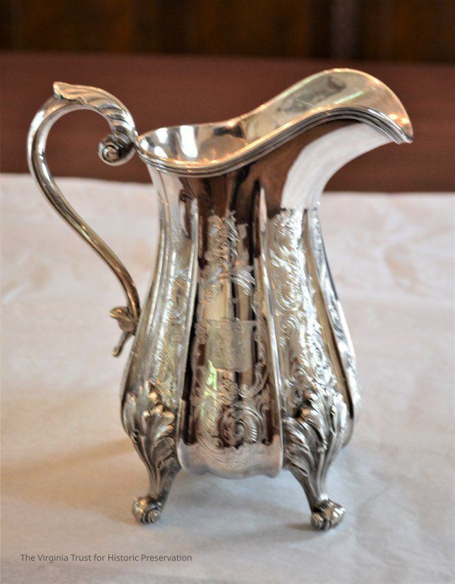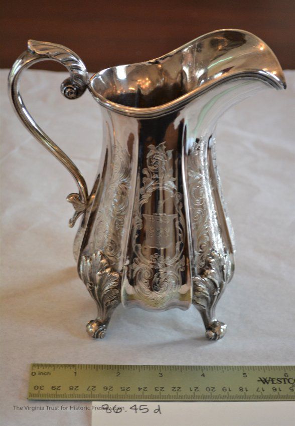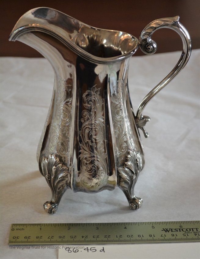 Creamer, part of five piece coin silver tea and coffee service. Lobed, tapering cylindrical body, ridged panels with engraved elaborate scrolling and central etched armorial of Fleming family. Curved spout. Scroll handle with acanthus terminals. Raised on four cast and chased acanthus supports ending with volute scroll feet.