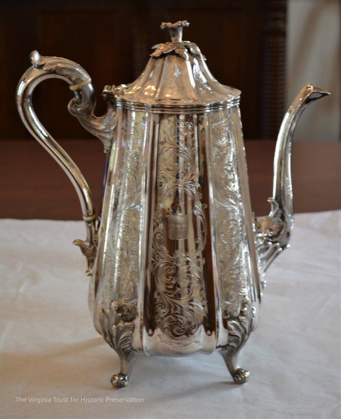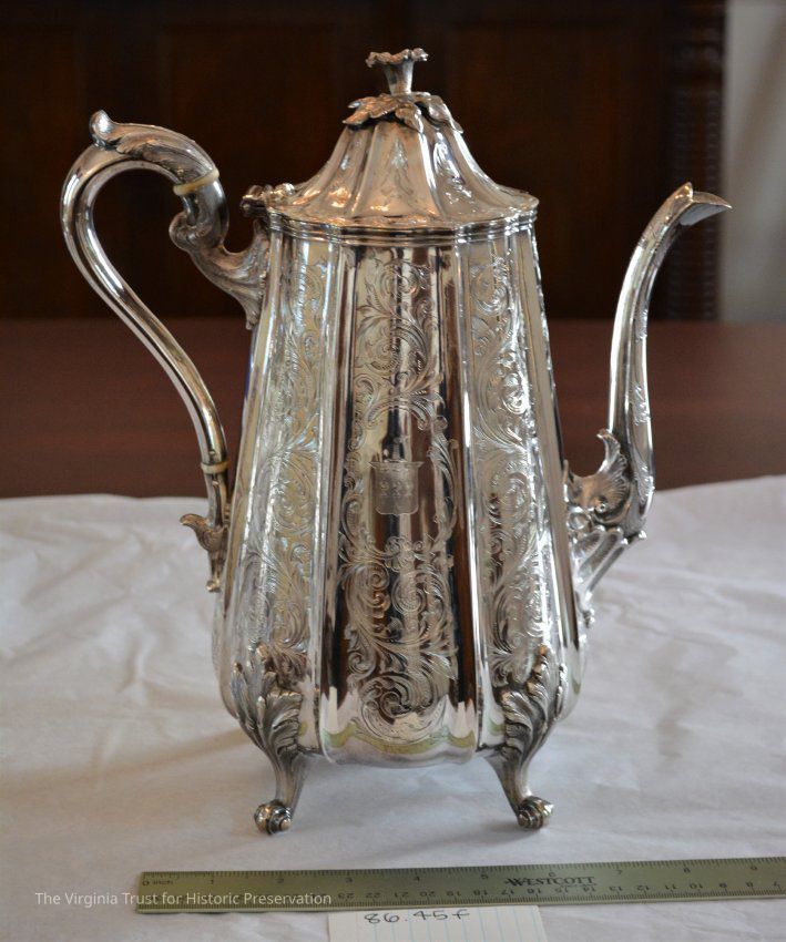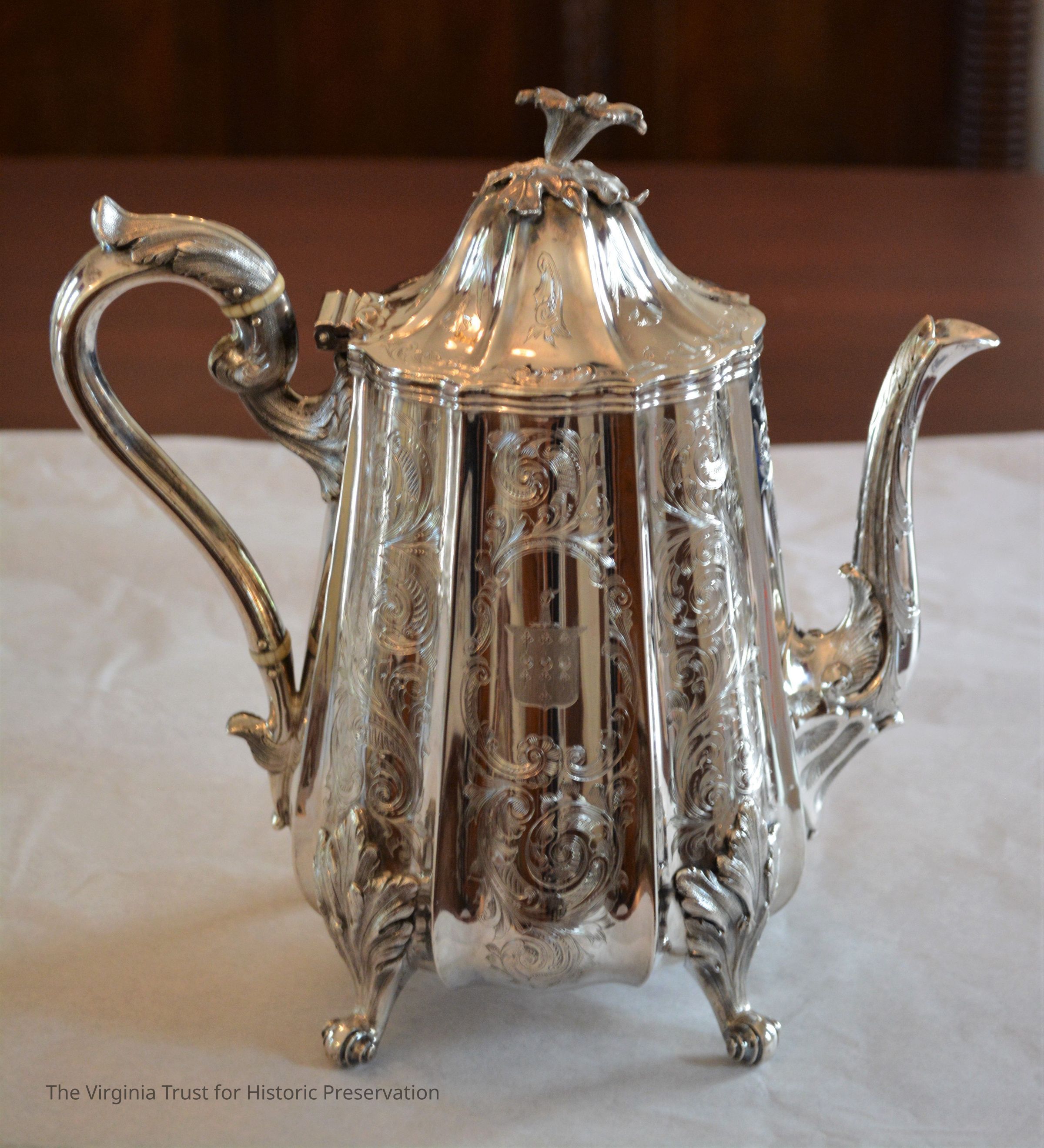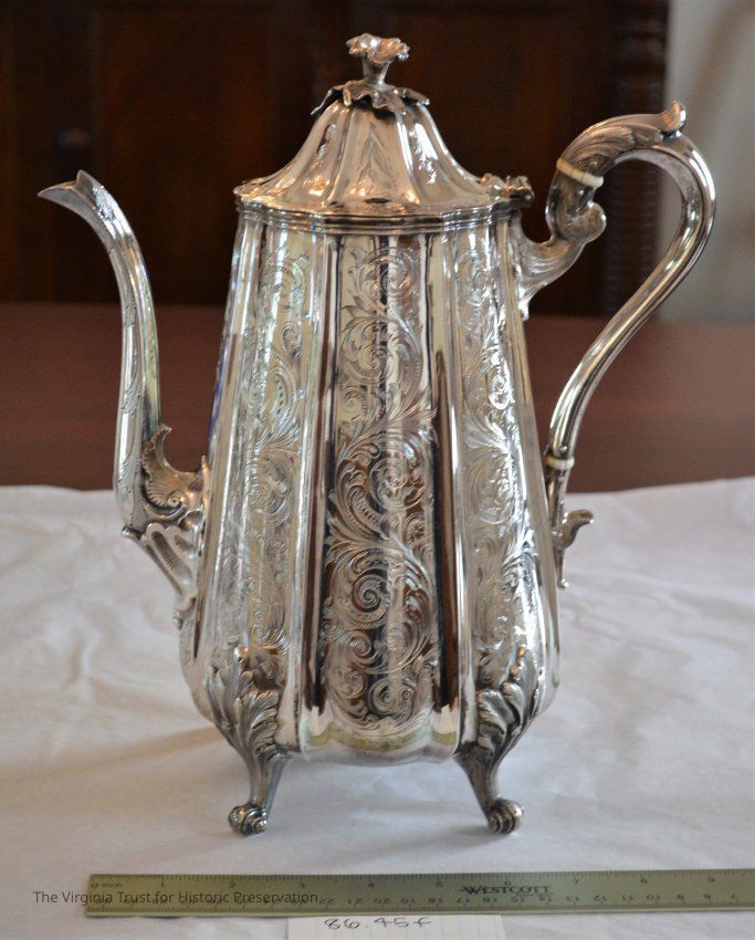 Coffeepot, part of five piece coin silver tea and coffee service. Lobed, tapering cyclindrical body, ridged panels with engraved elaborate scrolling and etched with Fleming coat of arms. Curved spout with two shell surrounds, scroll handle with acanthus terminals. Domed, hinged lid with fully cast bellflower finials. Raised on four cast and chased acanthus supports with volute scroll feet.