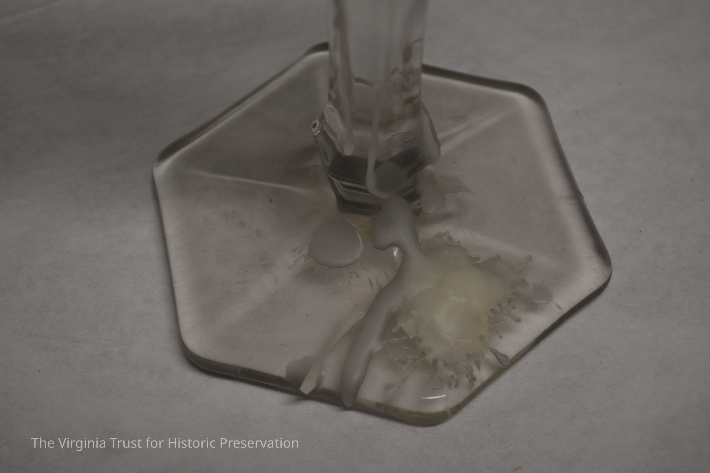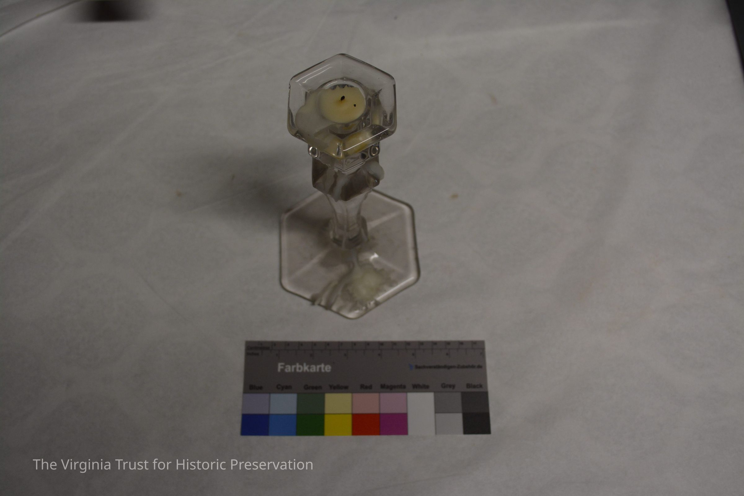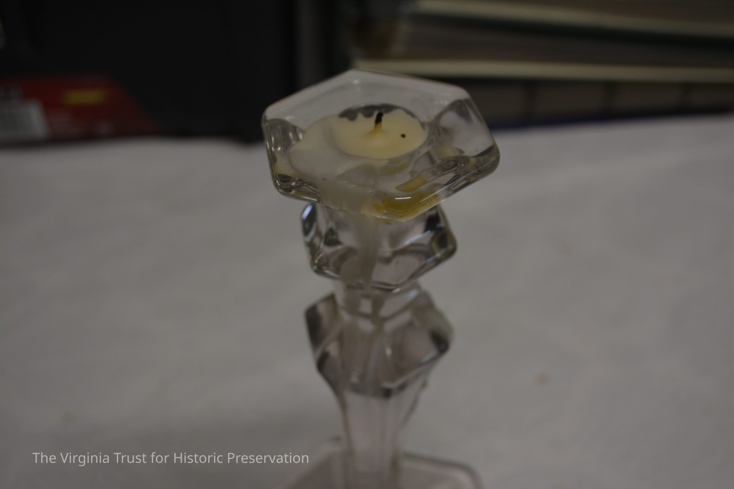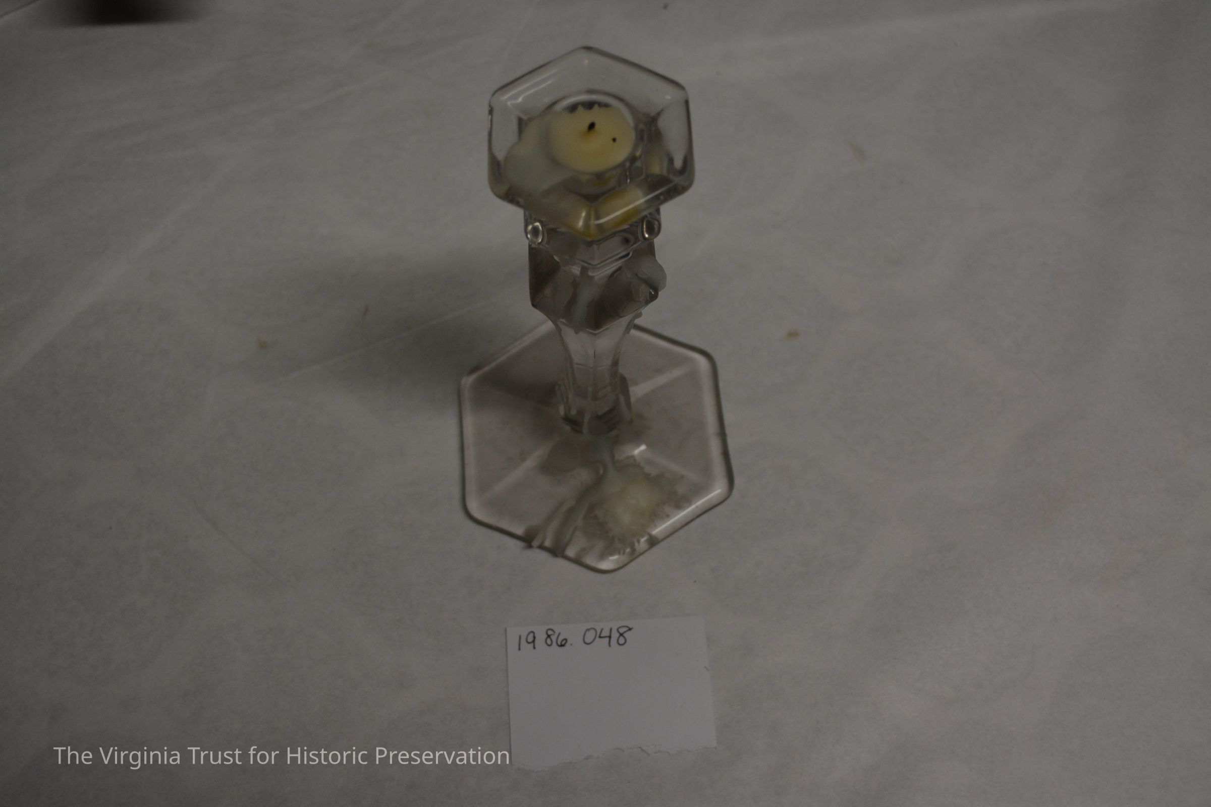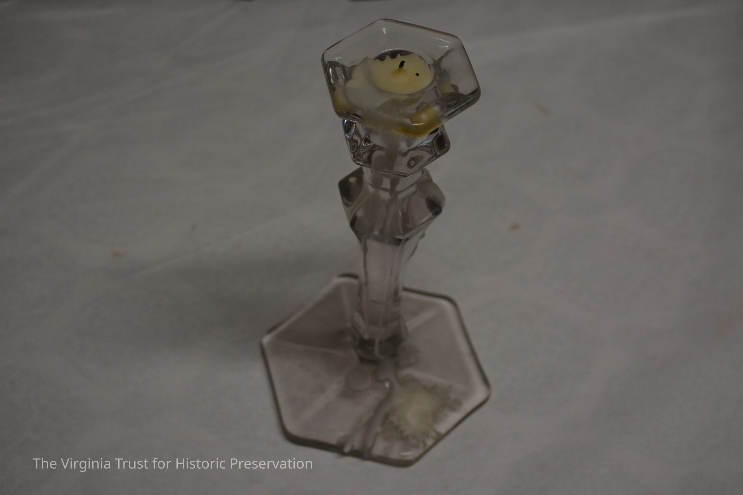 Glass candlestick with hexagonal base. Candle is still inserted in candlestick. Hardened wax on the sides.