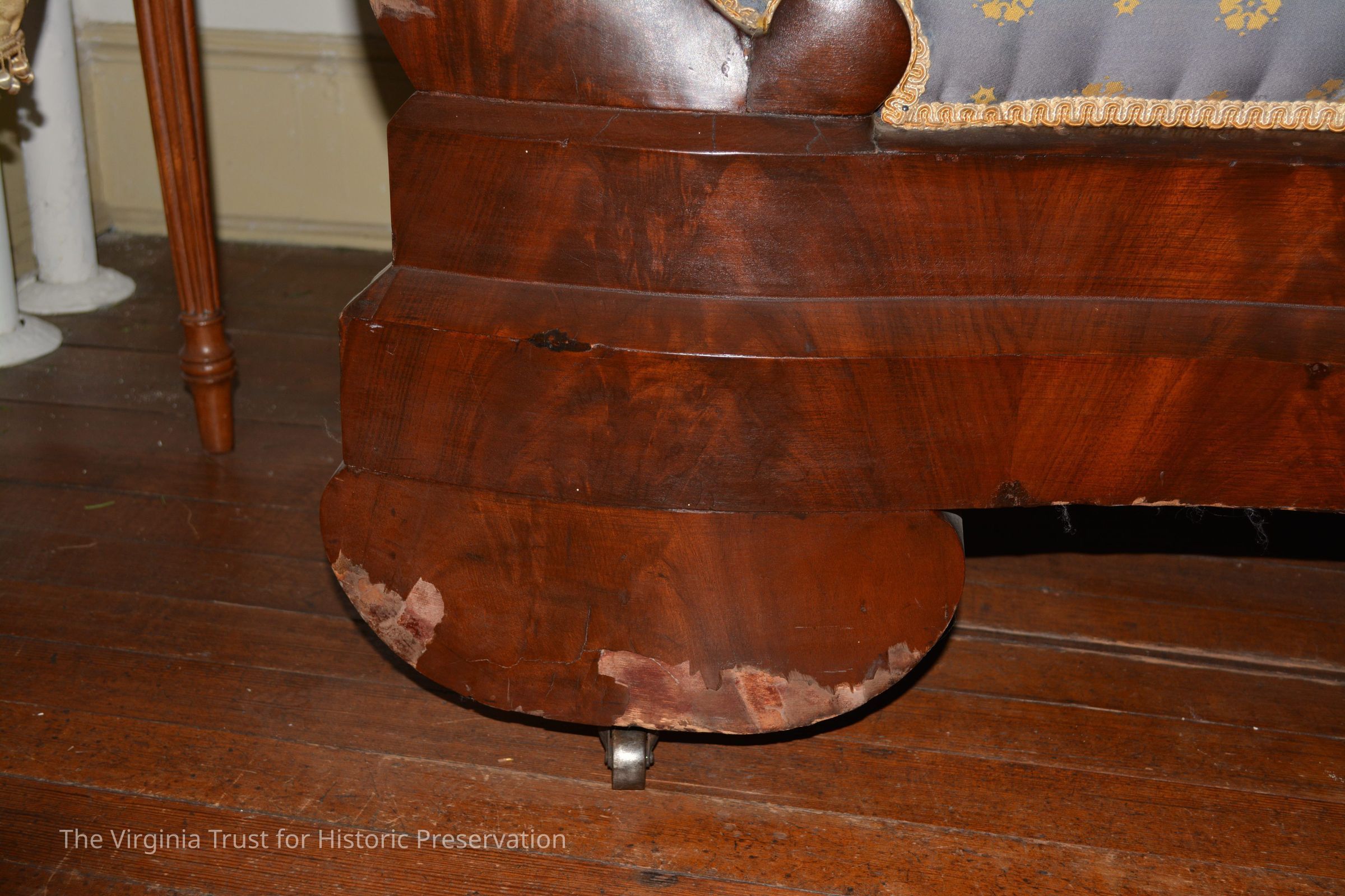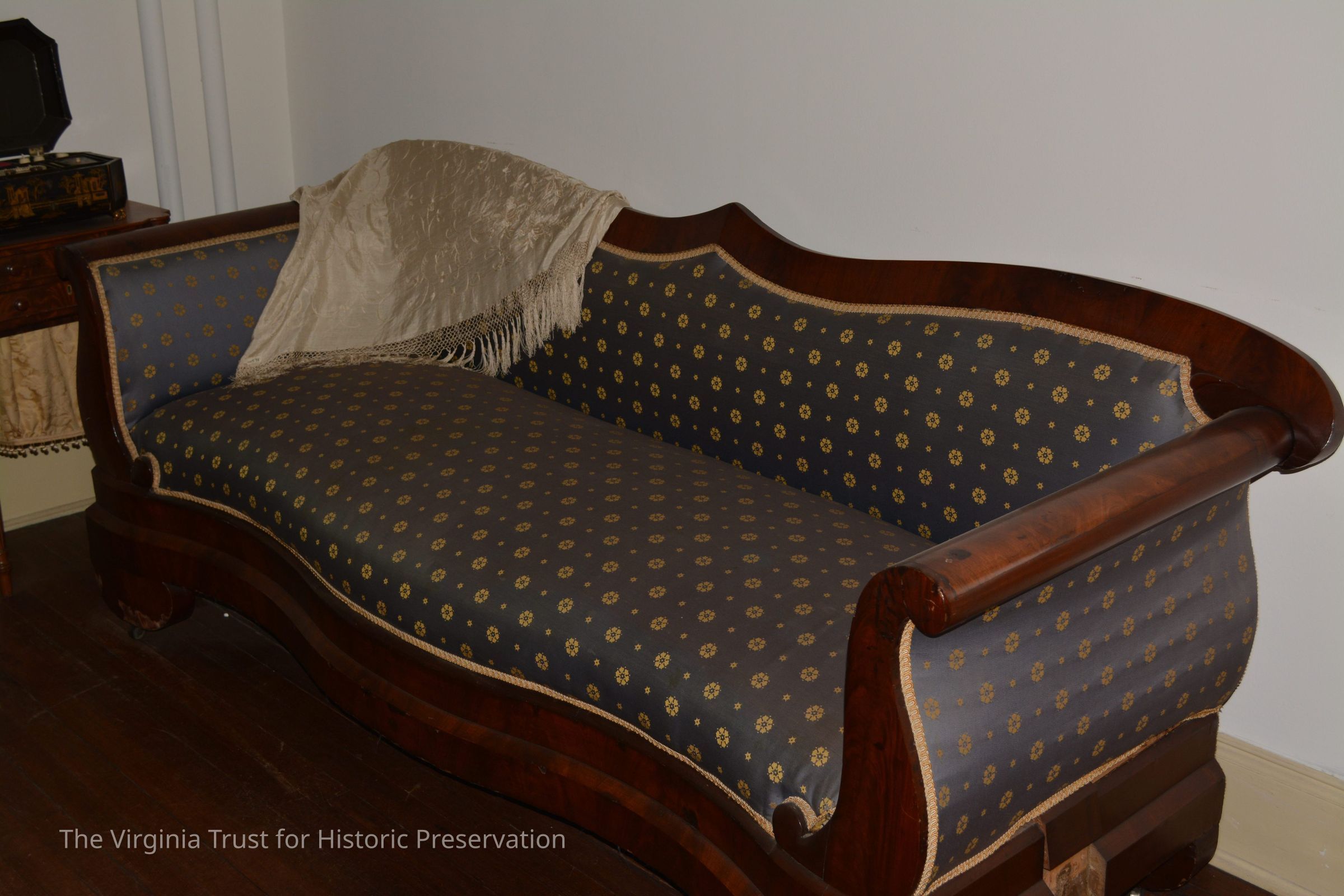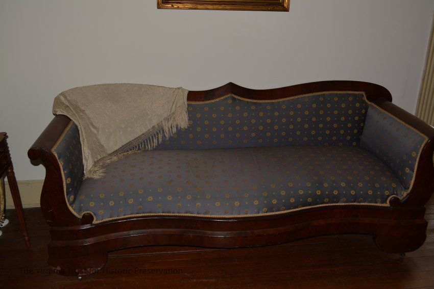 Empire style polished mahogany settee. Blue upholstery (new 4/1976) with gold medallions.