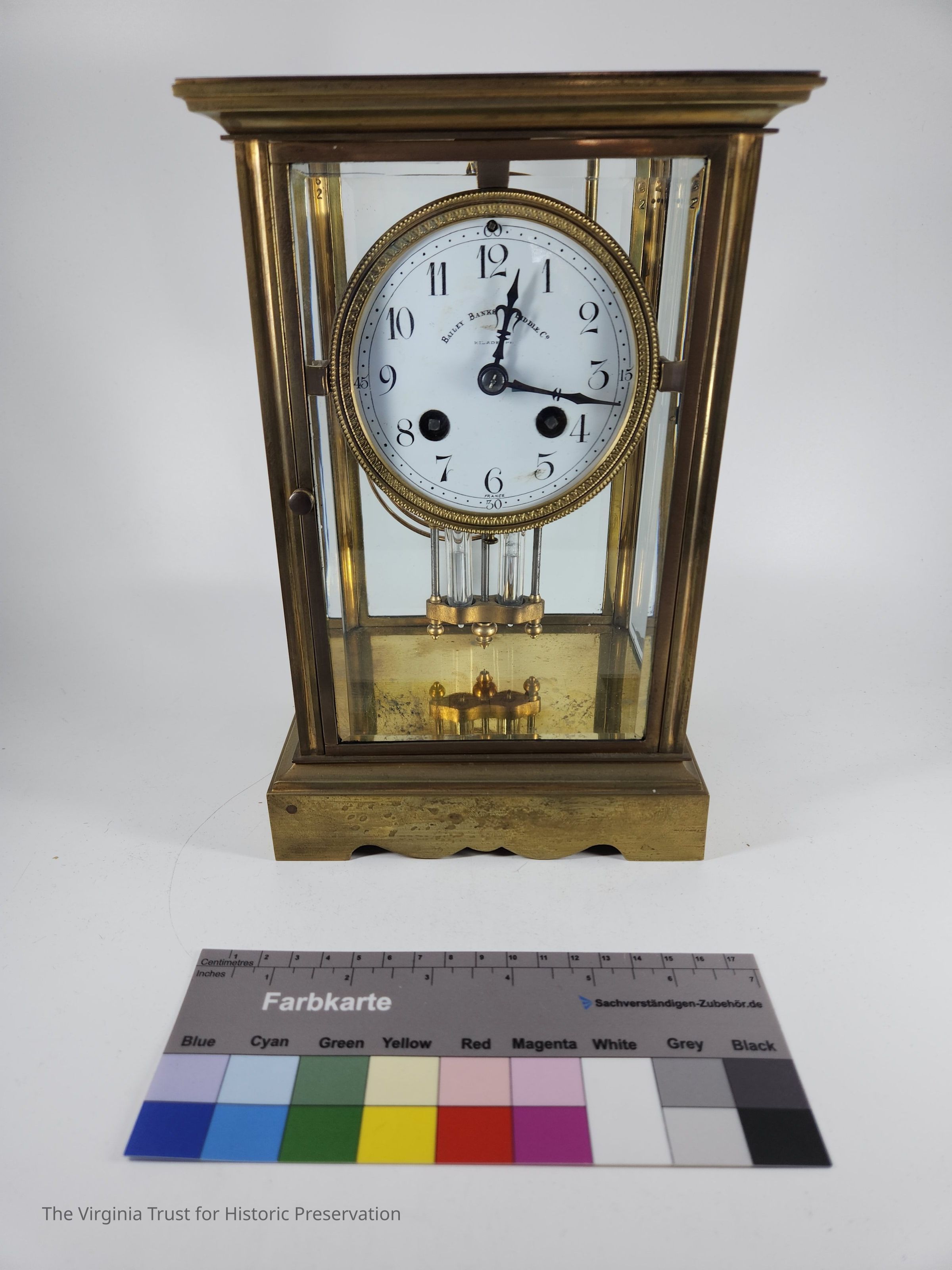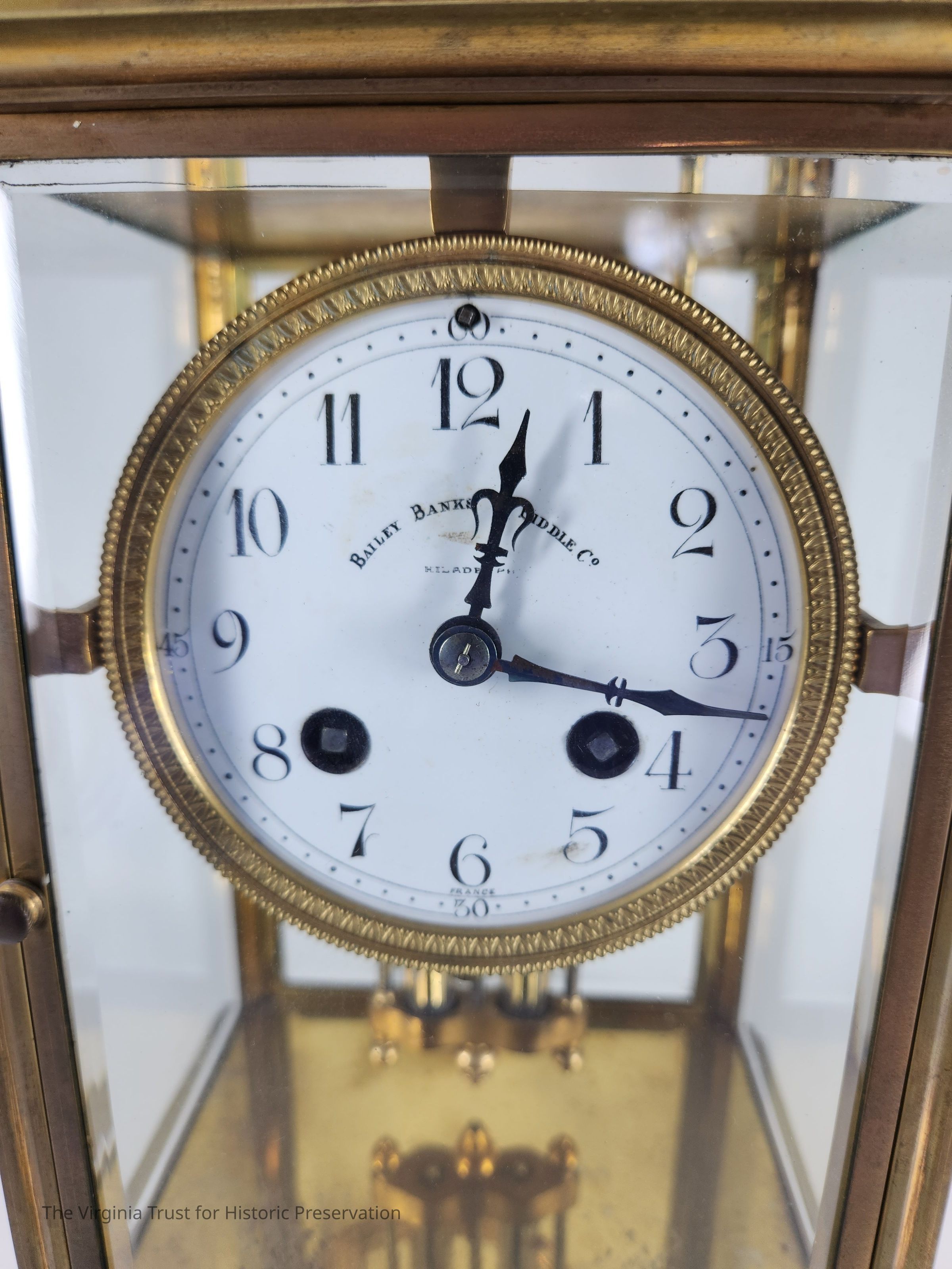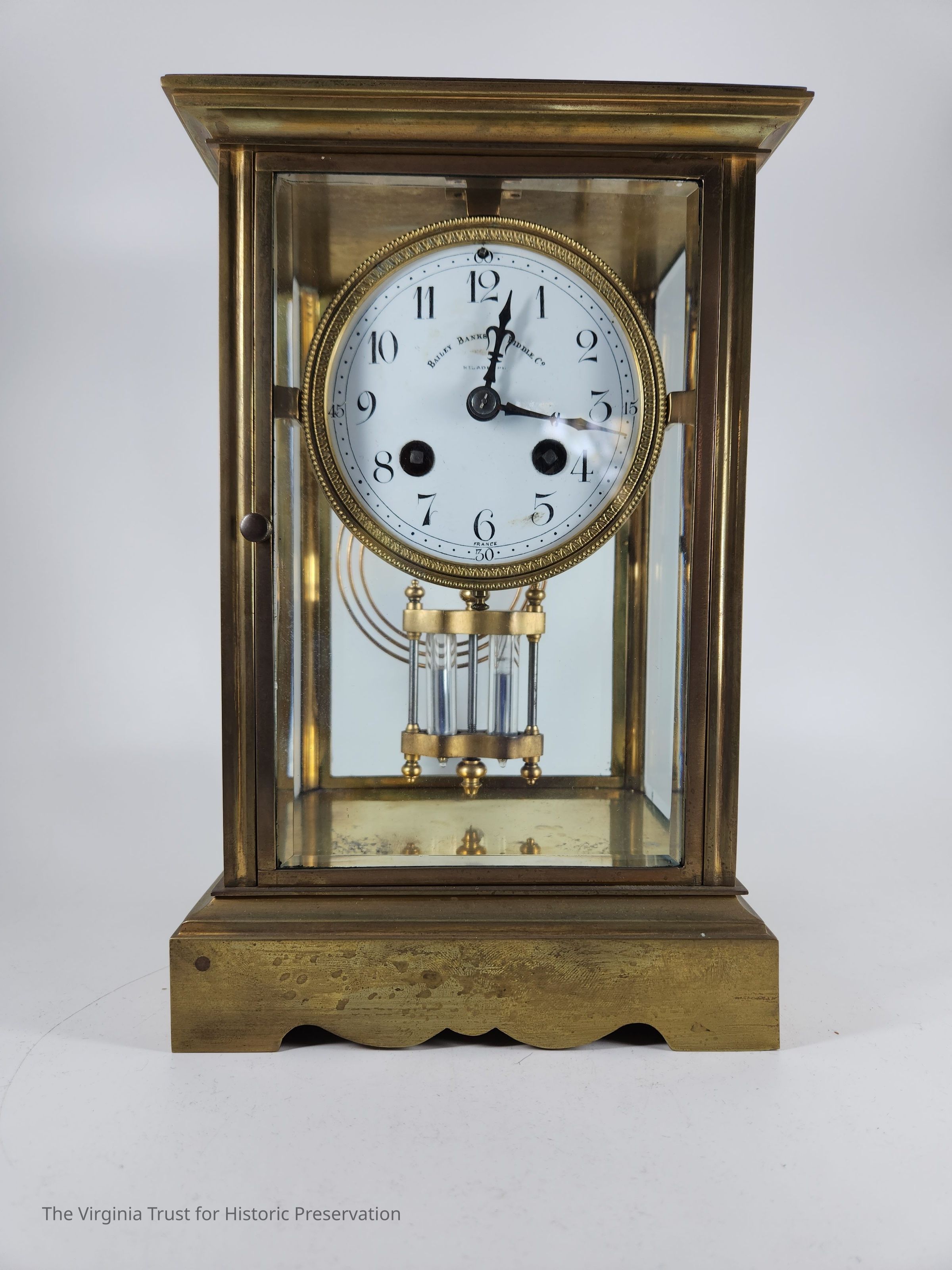 Brass clock with four glass sides marked "Bailey, Banks and Biddle." French crystal regulator clock. Underside stamped with "A.L."