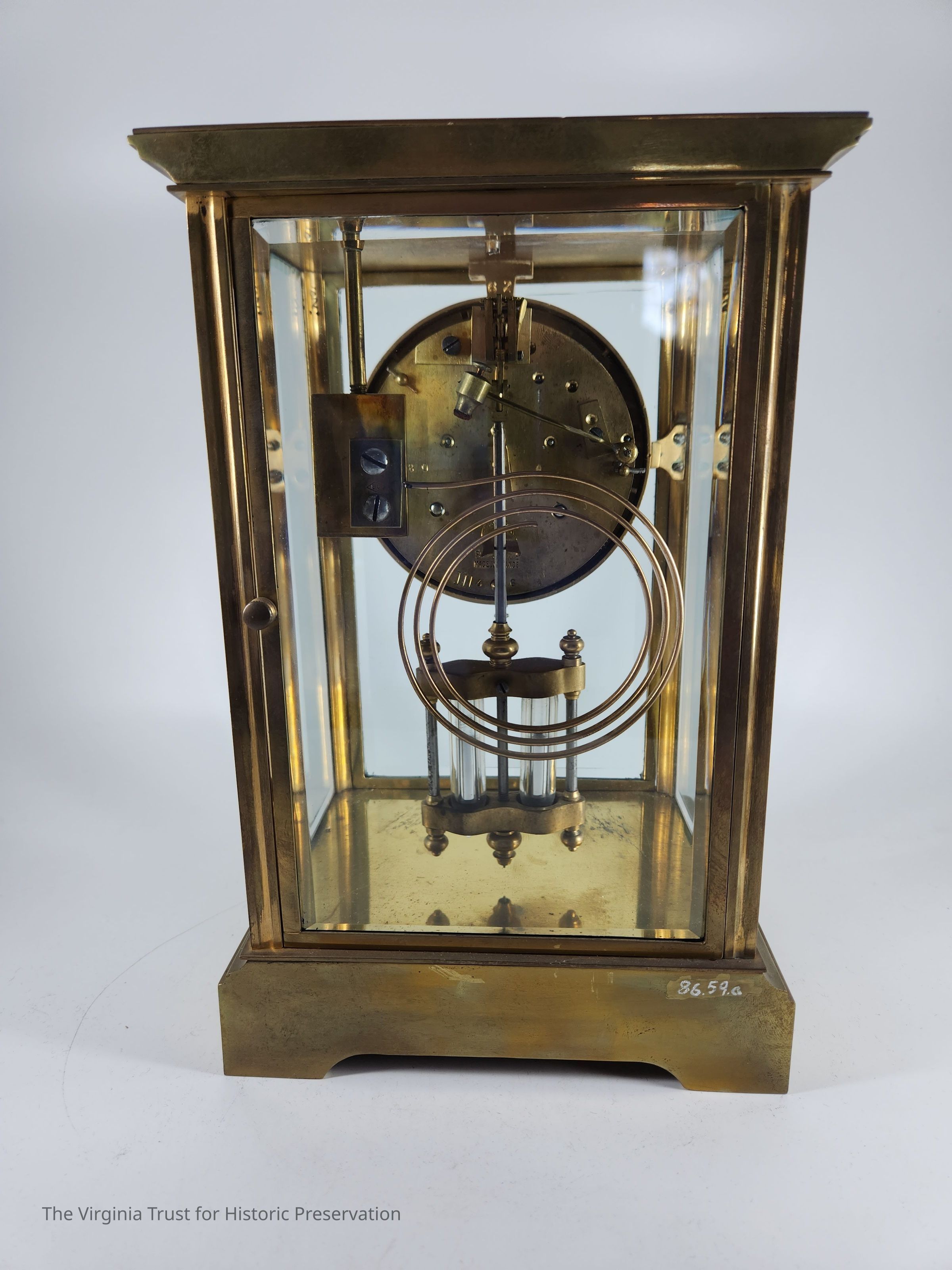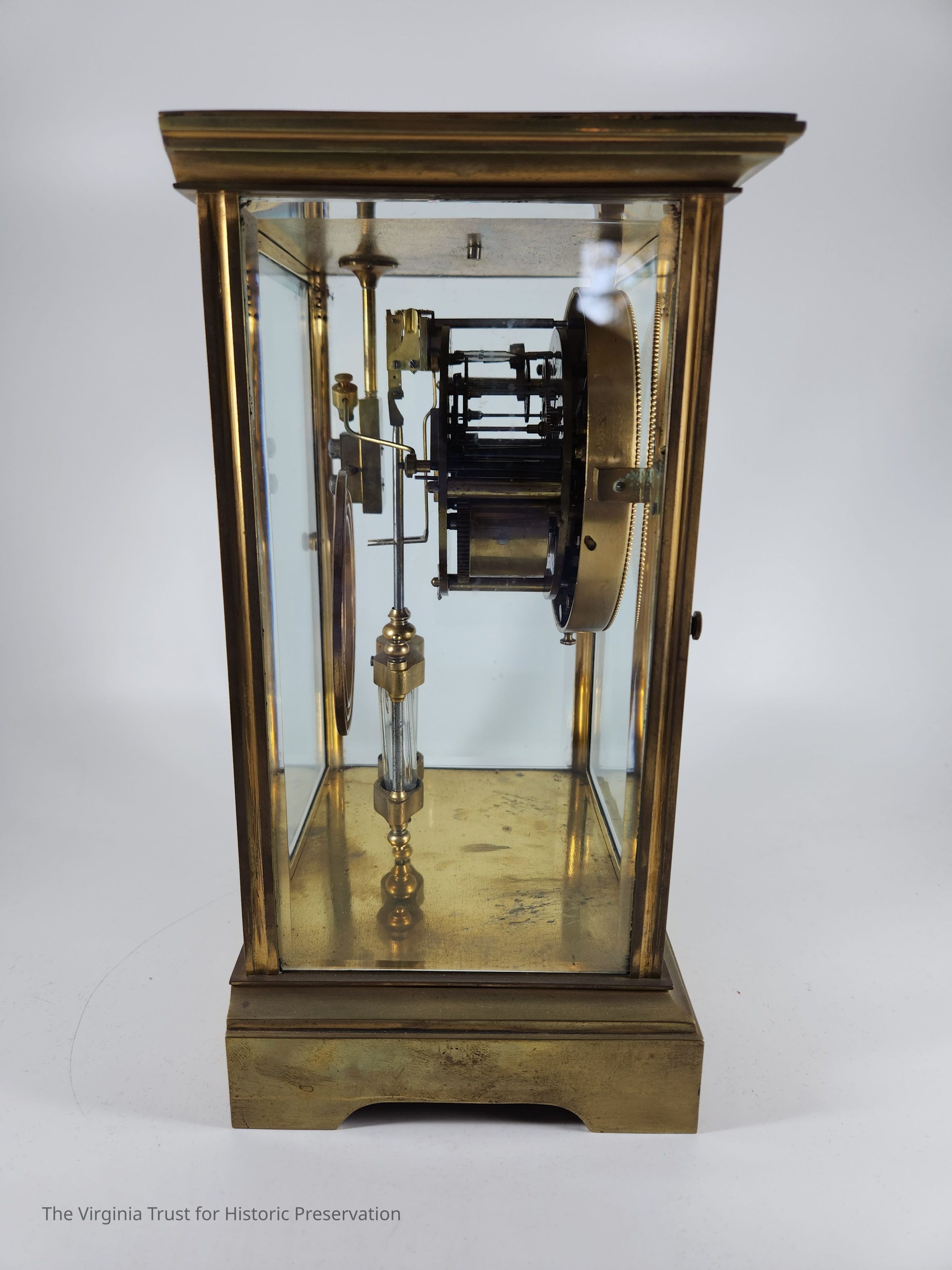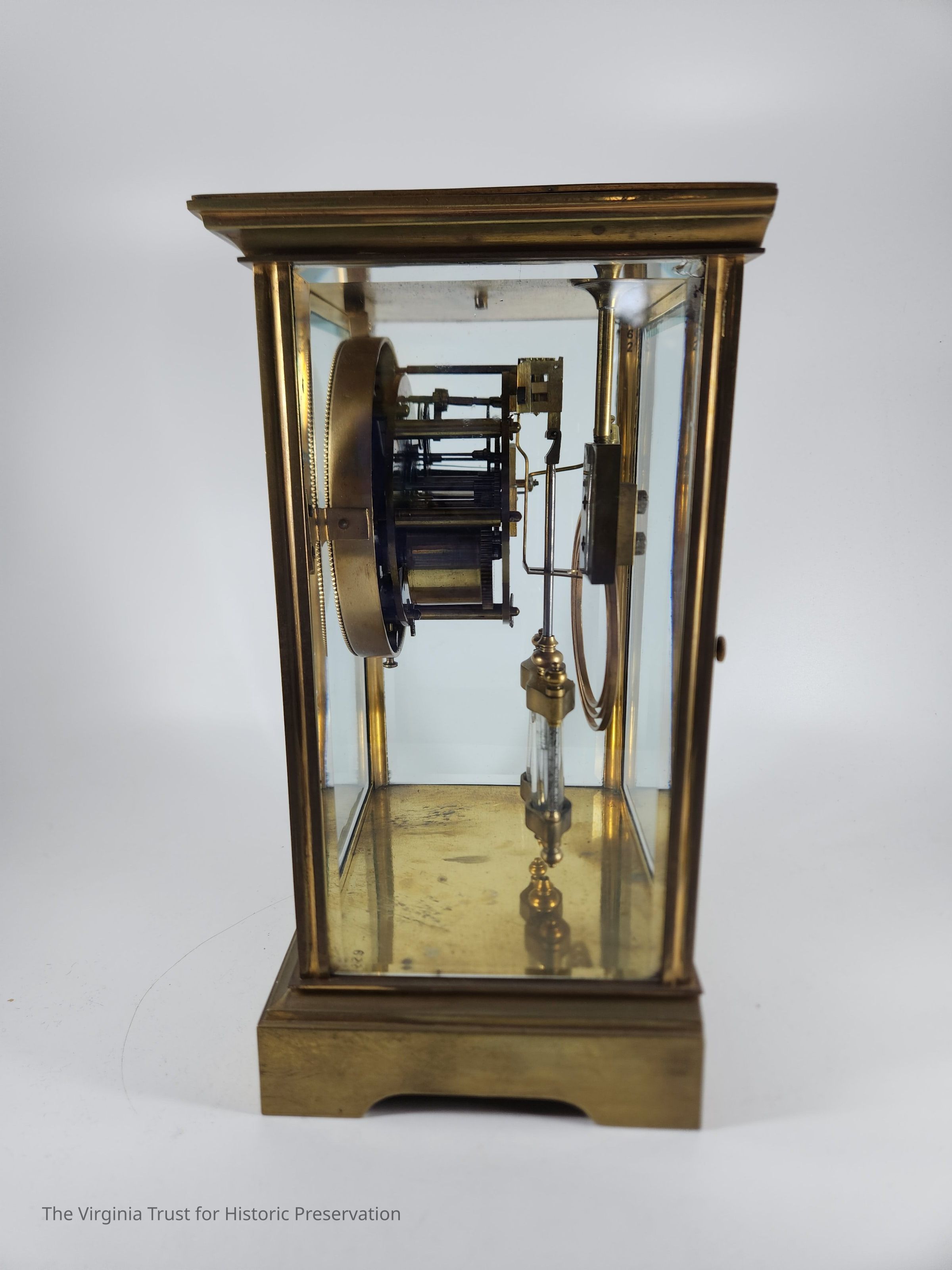 Brass clock with four glass sides marked "Bailey, Banks and Biddle." French crystal regulator clock. Underside stamped with "A.L."