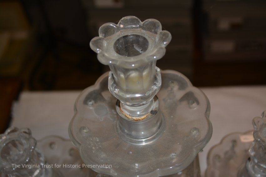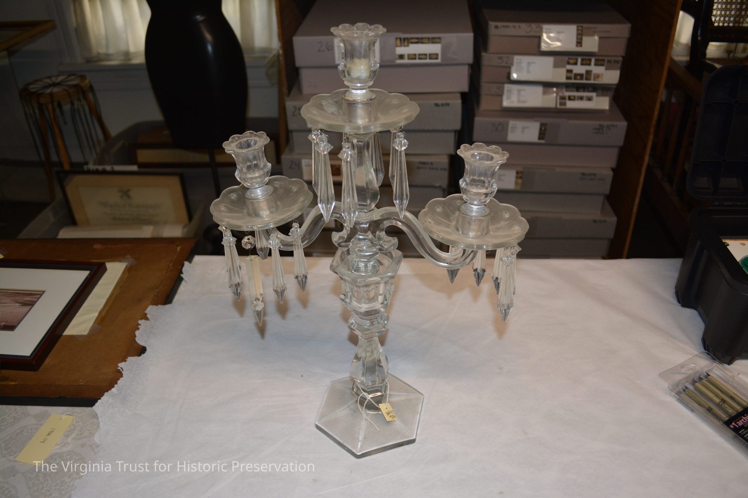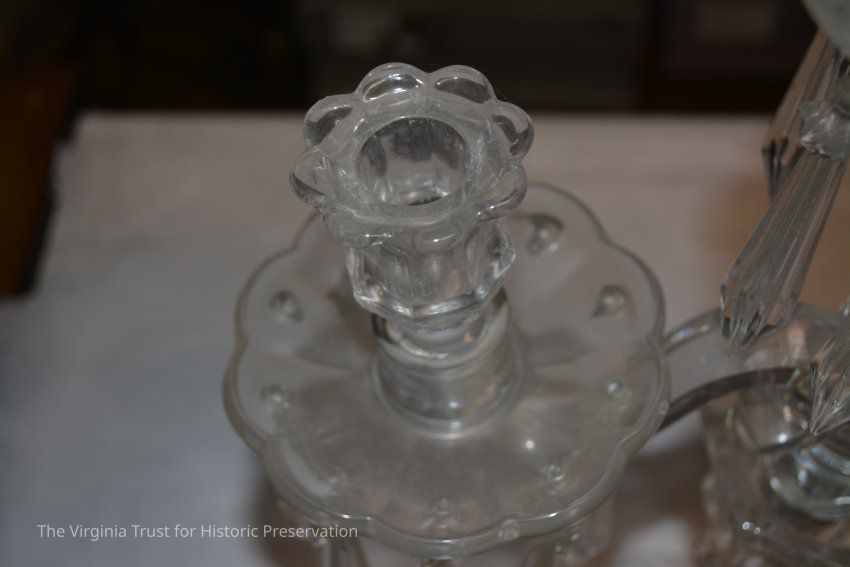 Glass candelabra with a hexagonal base, three-armed. Arms are attached to a base and swivel on the base.