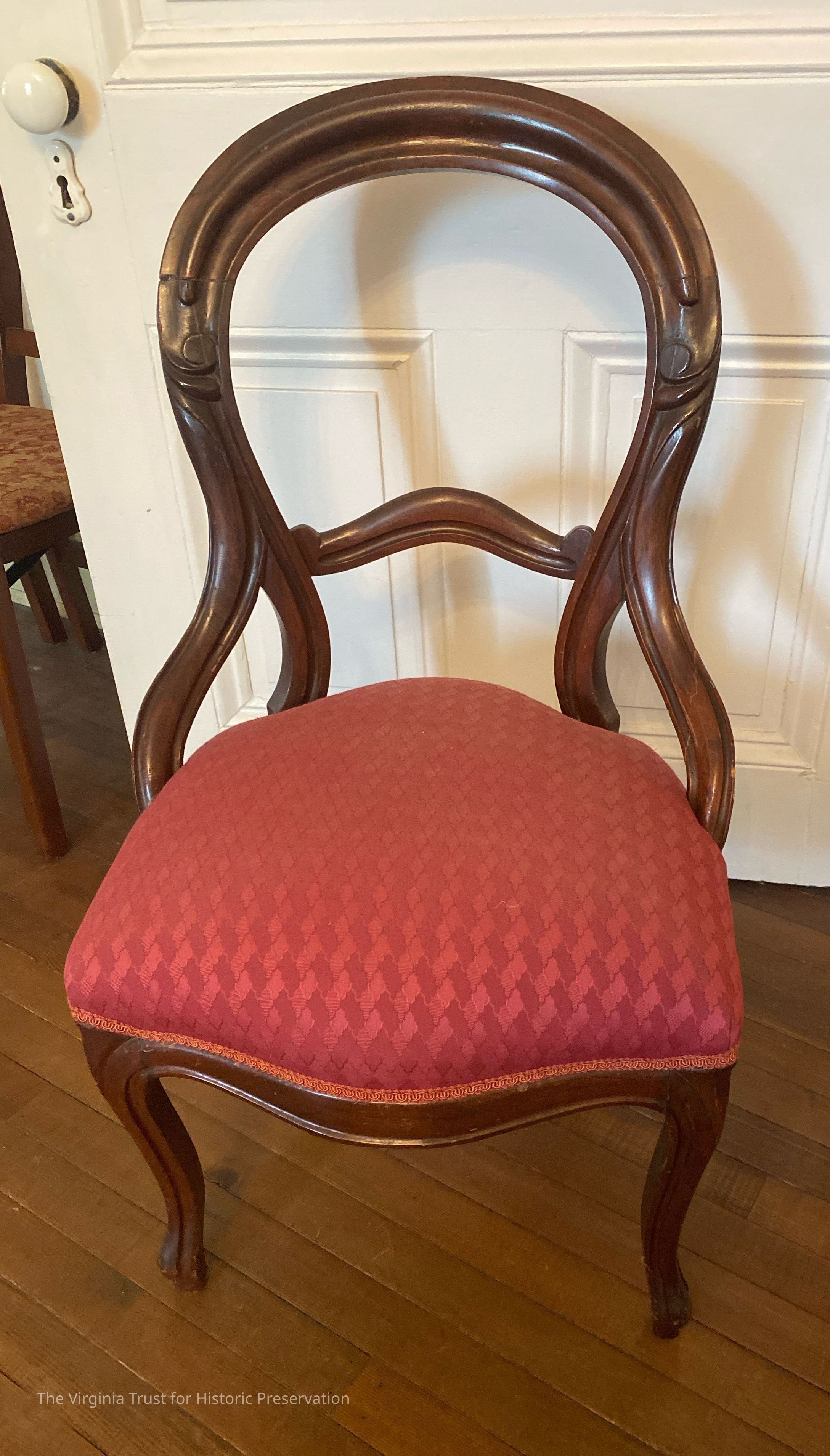 Balloon-back chair with open curved back. Red chevron-designed upholstery. Victorian.