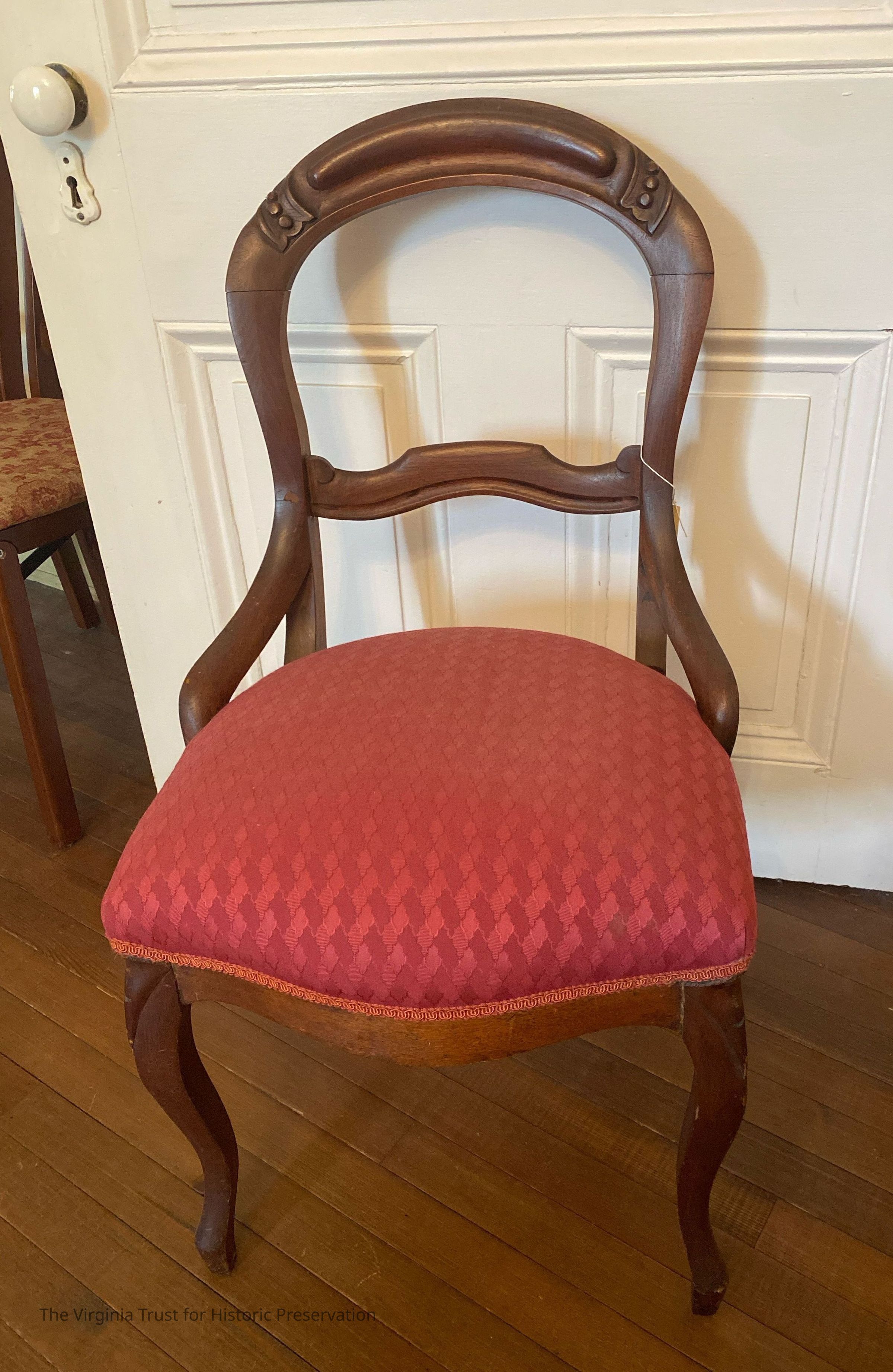 Balloon-back chair with open curved back. Red chevron-designed upholstery. Victorian. This chair has a slightly different chair back from the other three. The curved portion does not narrow as much near the cushion of the chair and carving is slightly different.Dimensions