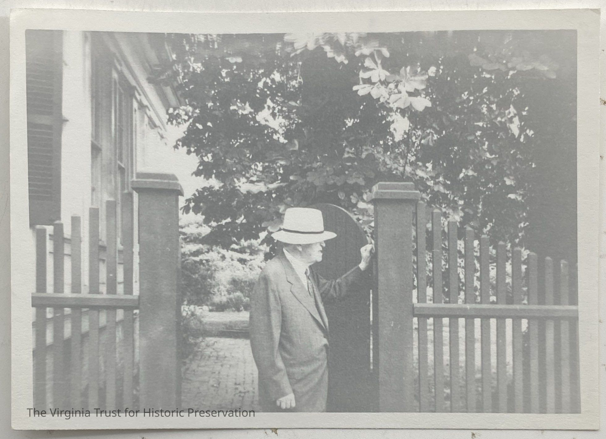 Black and white horizontal photograph of John L. Lewis standing at the garden entrance on Washington Street. Green fence with door opened to garden. Lewis looks at one of the fence posts and wears a suit and hat. Lee-Fendall House and trees in background. White border with straight edges.Dimensions