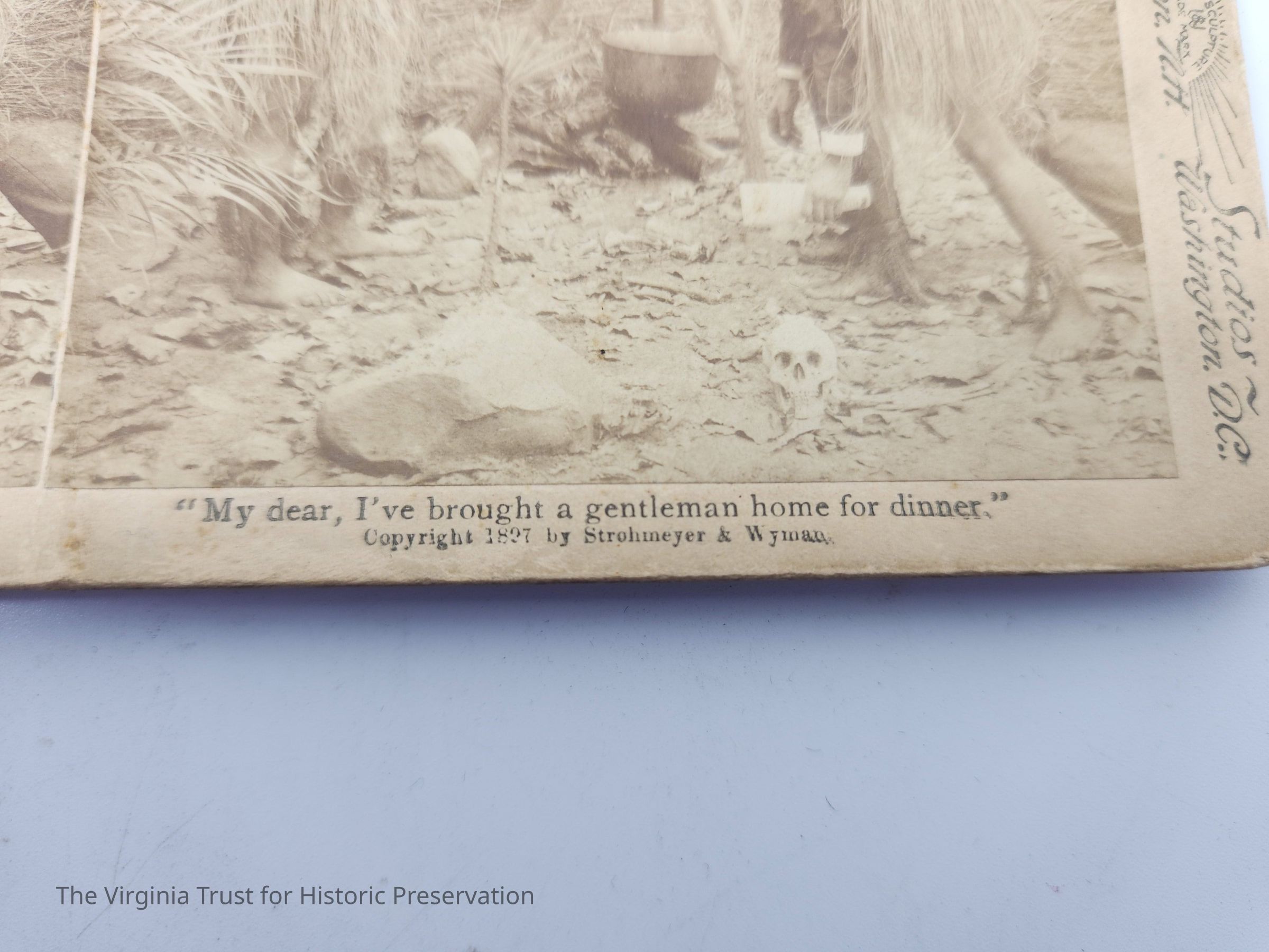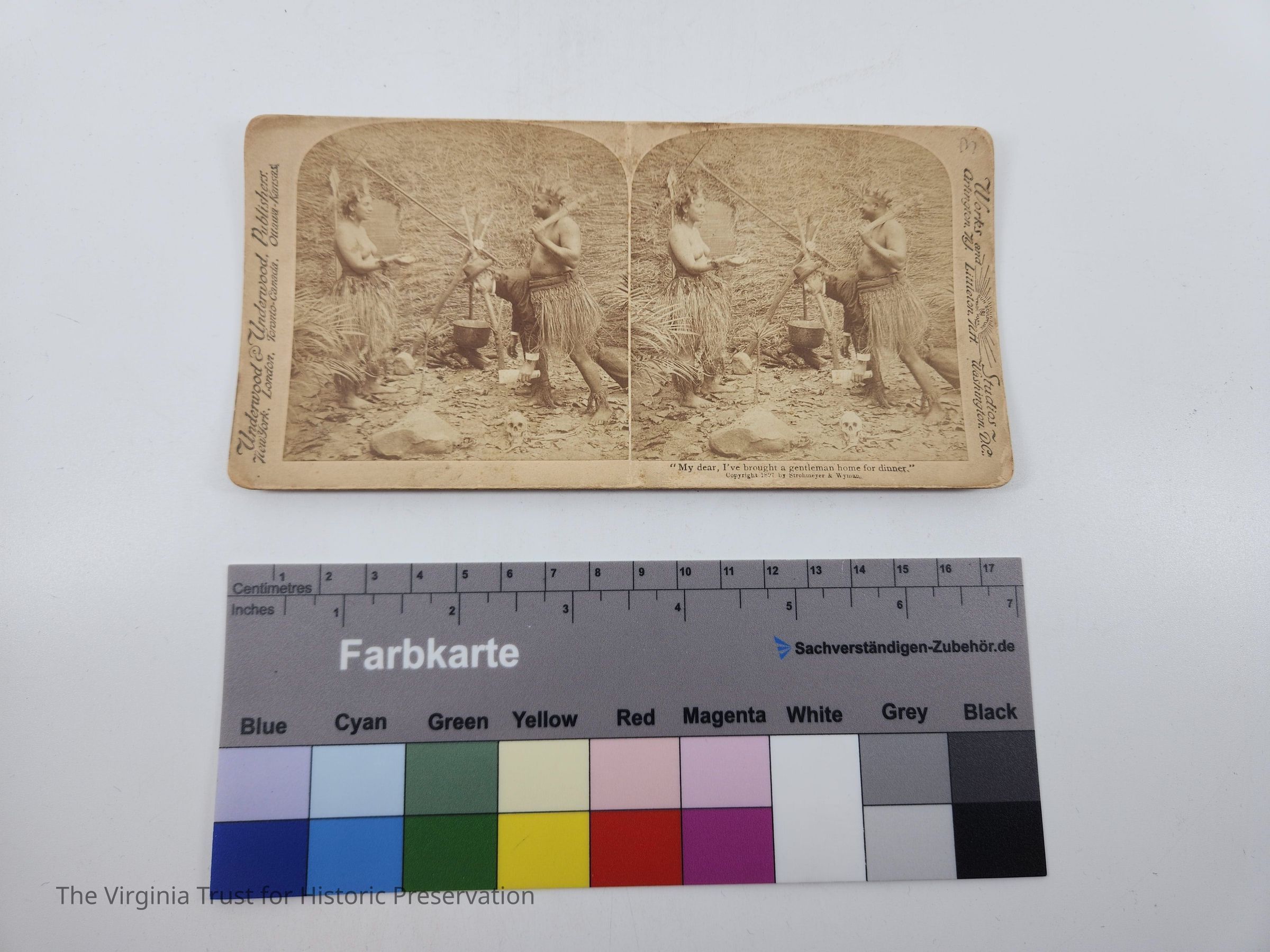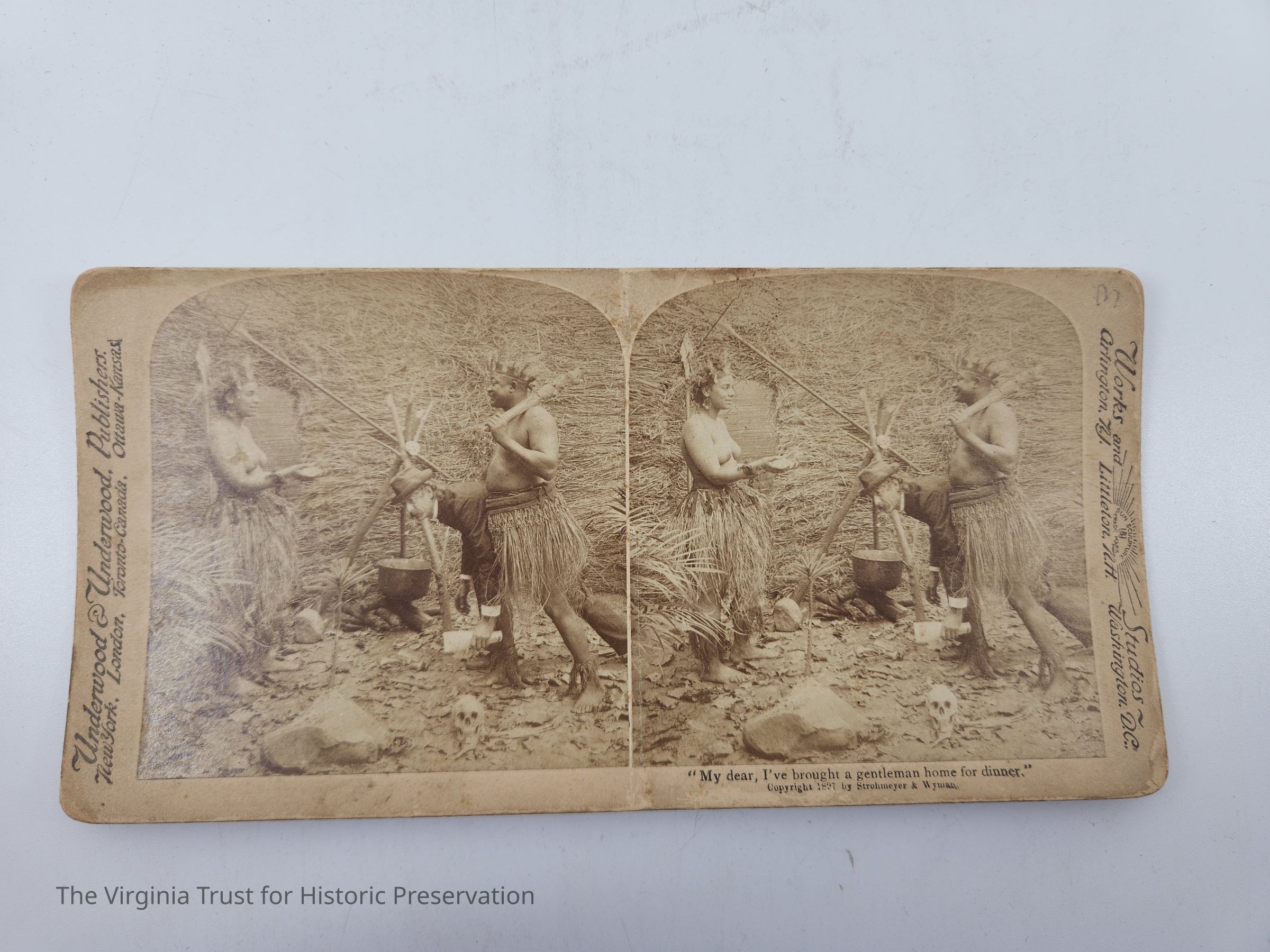 Stereoscopic slide titled "My dear, I've brought a gentleman home for dinner" depicting a man dressed in a grass skirt carrying a man in a hat and suit to a shirtless woman also wearing a grass skirt. Labeled with "Underwood & Underwood Publishers" and "Works and Studios Sun Sculpture Trademark." Copyright 1897 Strohmeyer & Wyman. Translations of the title located on the back