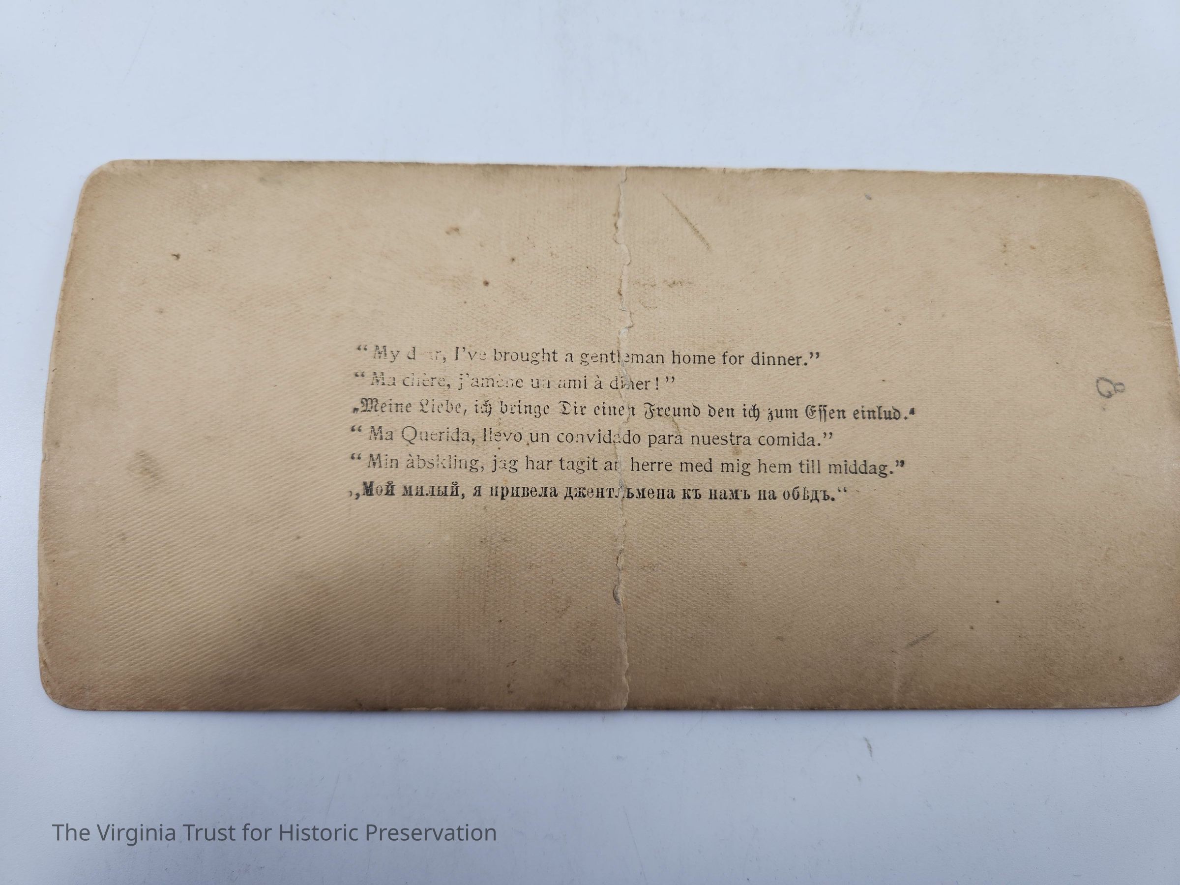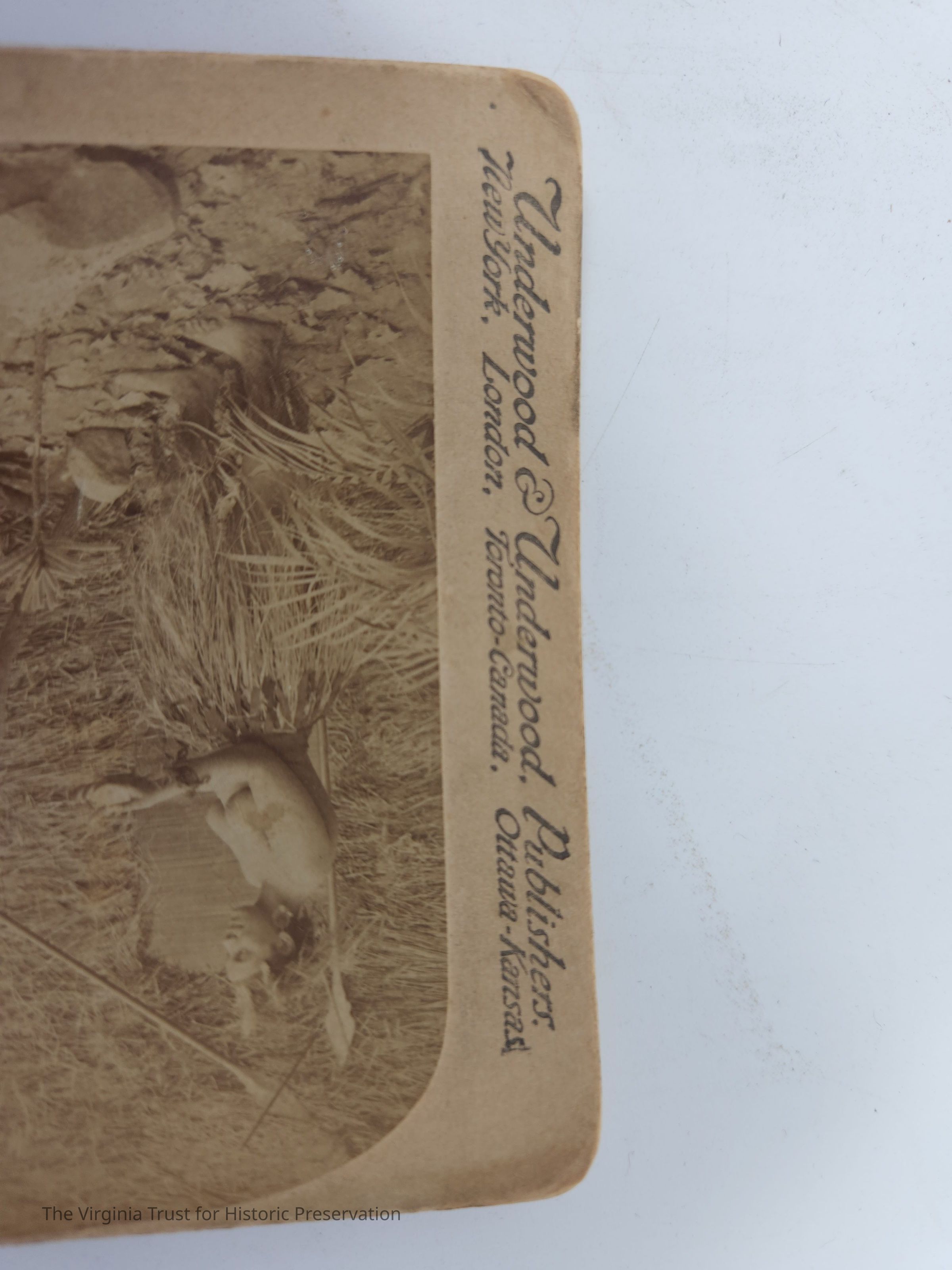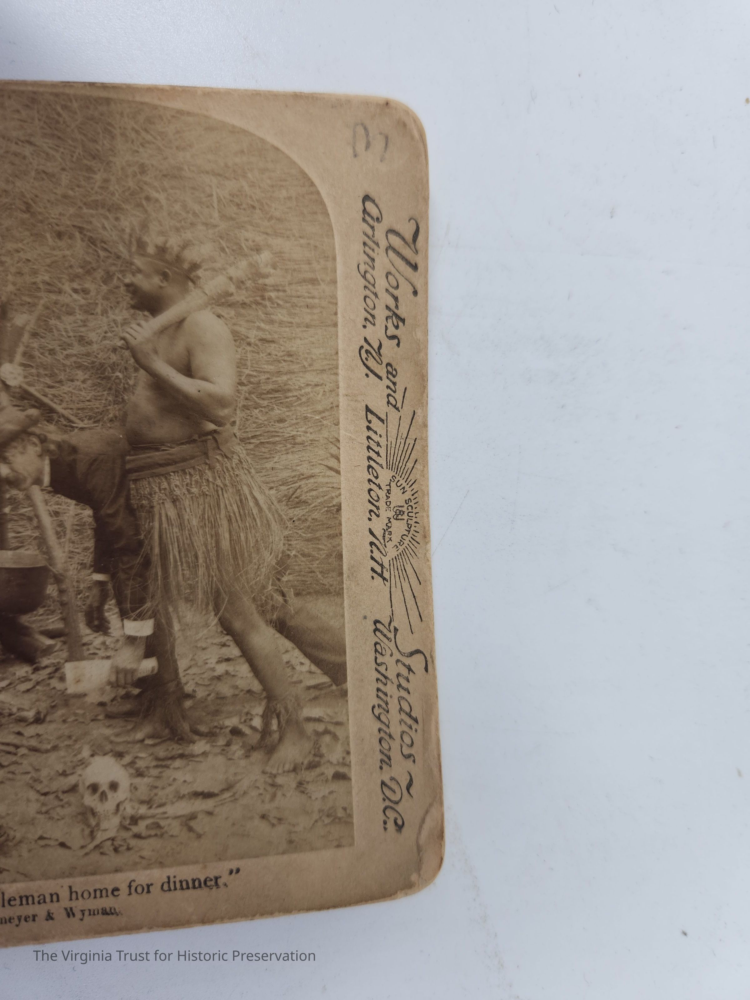 Stereoscopic slide titled "My dear, I've brought a gentleman home for dinner" depicting a man dressed in a grass skirt carrying a man in a hat and suit to a shirtless woman also wearing a grass skirt. Labeled with "Underwood & Underwood Publishers" and "Works and Studios Sun Sculpture Trademark." Copyright 1897 Strohmeyer & Wyman. Translations of the title located on the back