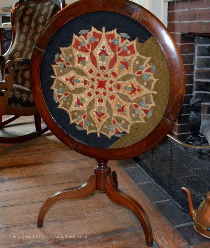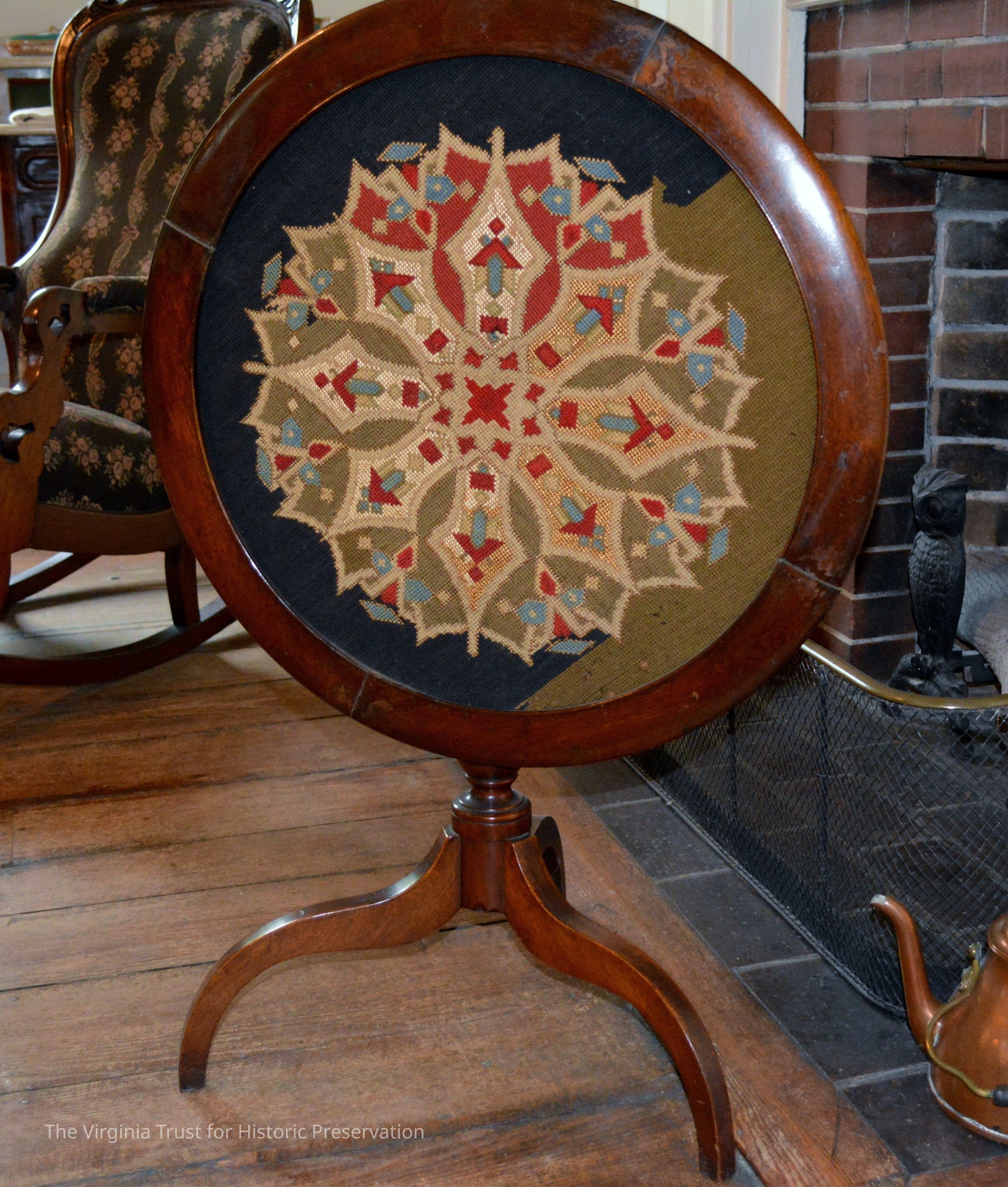 Round needlepoint fire screen on a tripod stand. Reportedly worked on by Sarah Lee, wife of Edmund Jennings Lee. The screen provides protection from the heat of nearby flames but also allows warmth to get through. This one is particularly large for the fireplace in the room. By the middle of the nineteenth century, it evolved into a favorite place for women to display their needlework. While it may not look like it, the screen is actually finished.