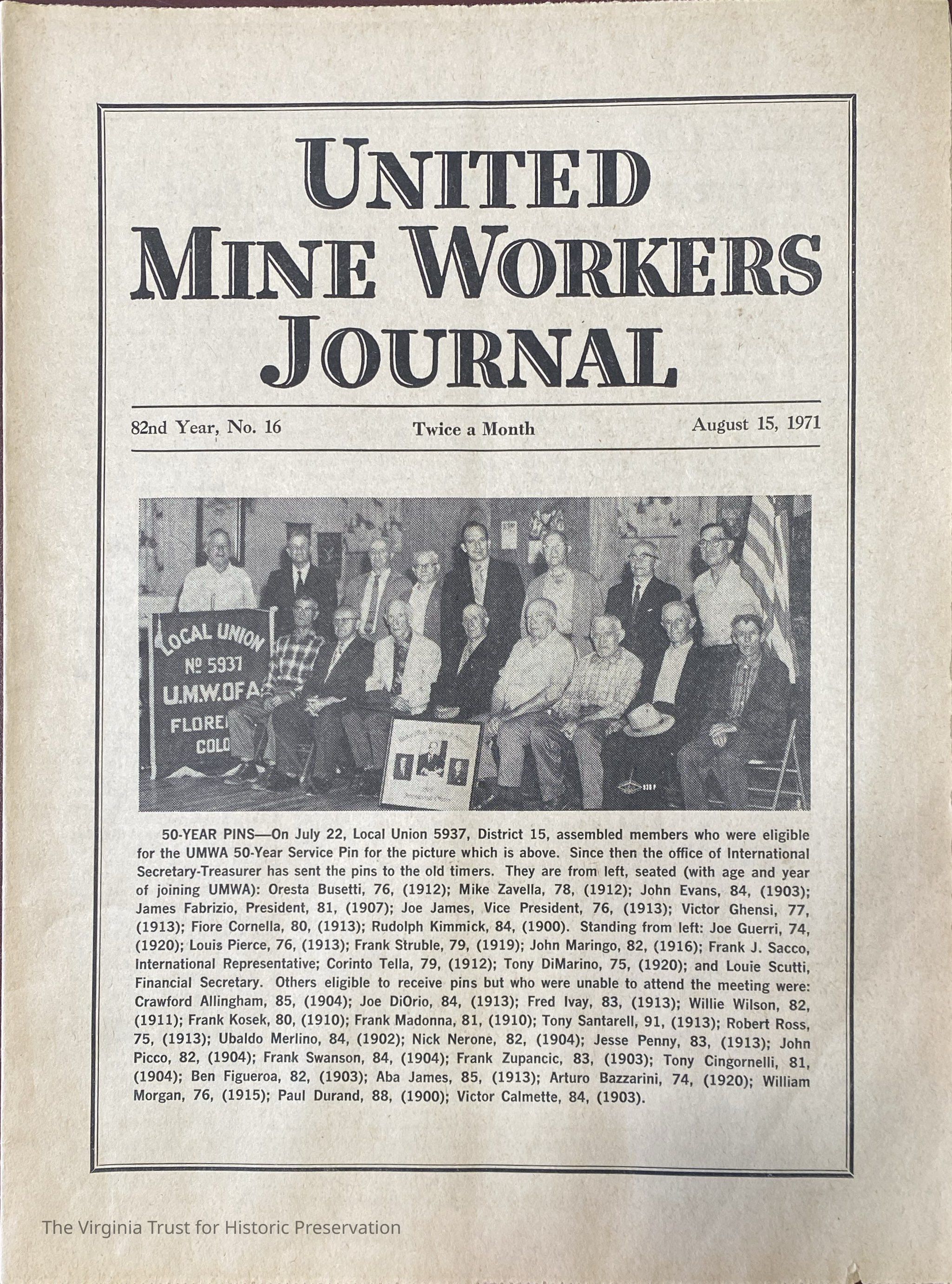 United Mine Workers of America Journal. Year 82, No. 16. August 15, 1971. Cover image is of members of the Local Union 5937, District 15 receiving their 50 year pins. Image with accompanying caption.Dimensions
