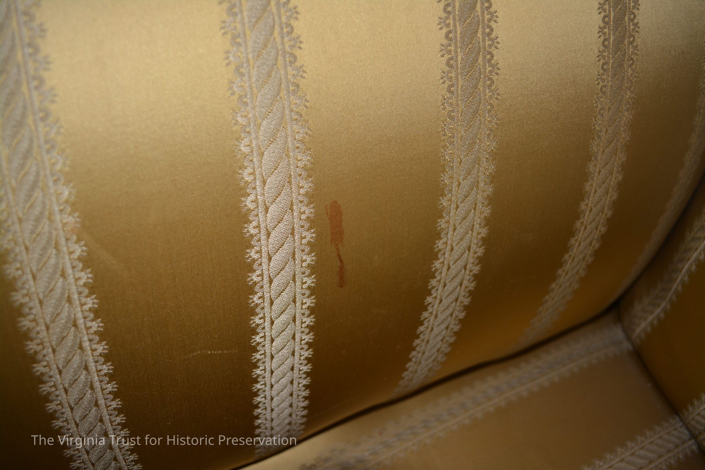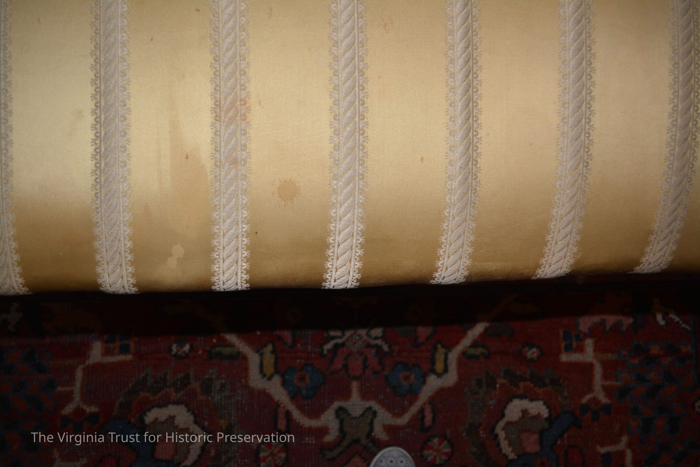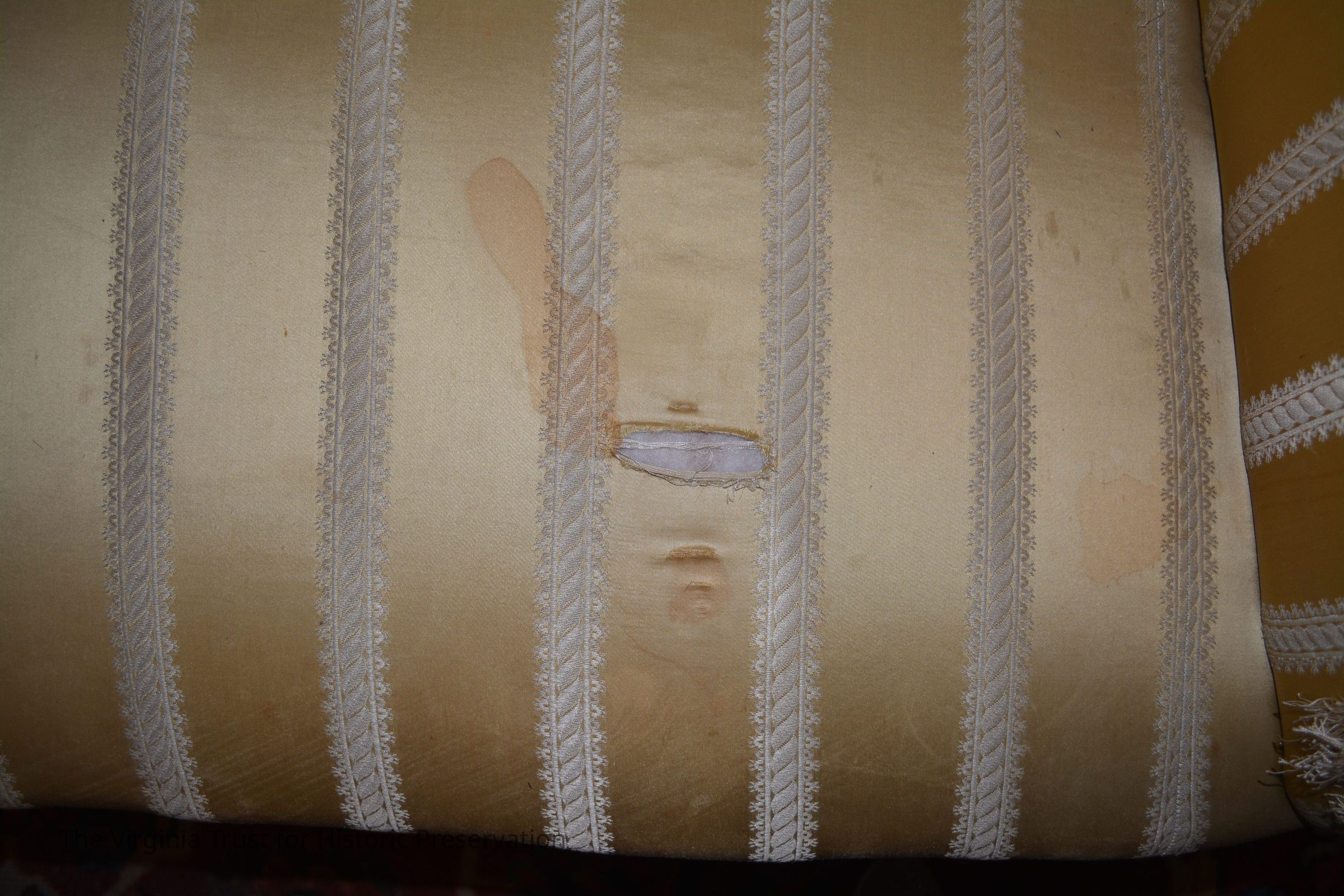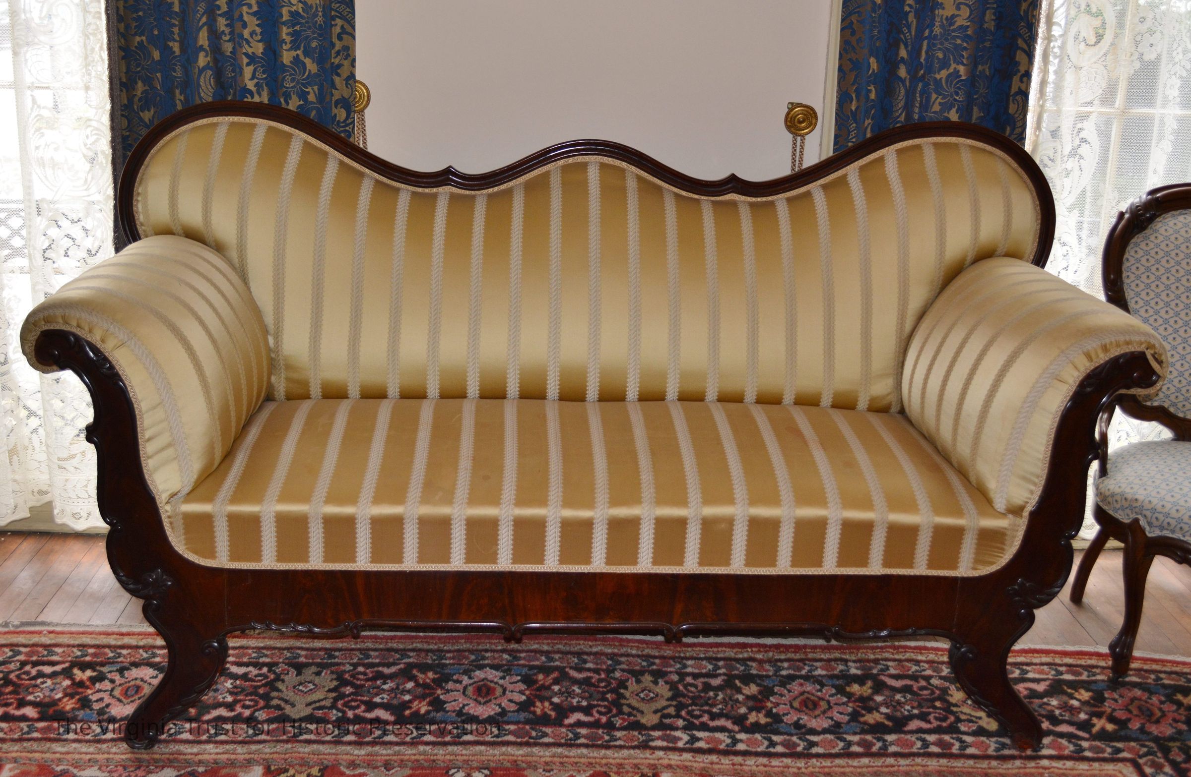 Large Victorian settee covered in yellow striped satin. Carved detail on arms, legs. Polaroid photos of settee are in the object's paper file.
