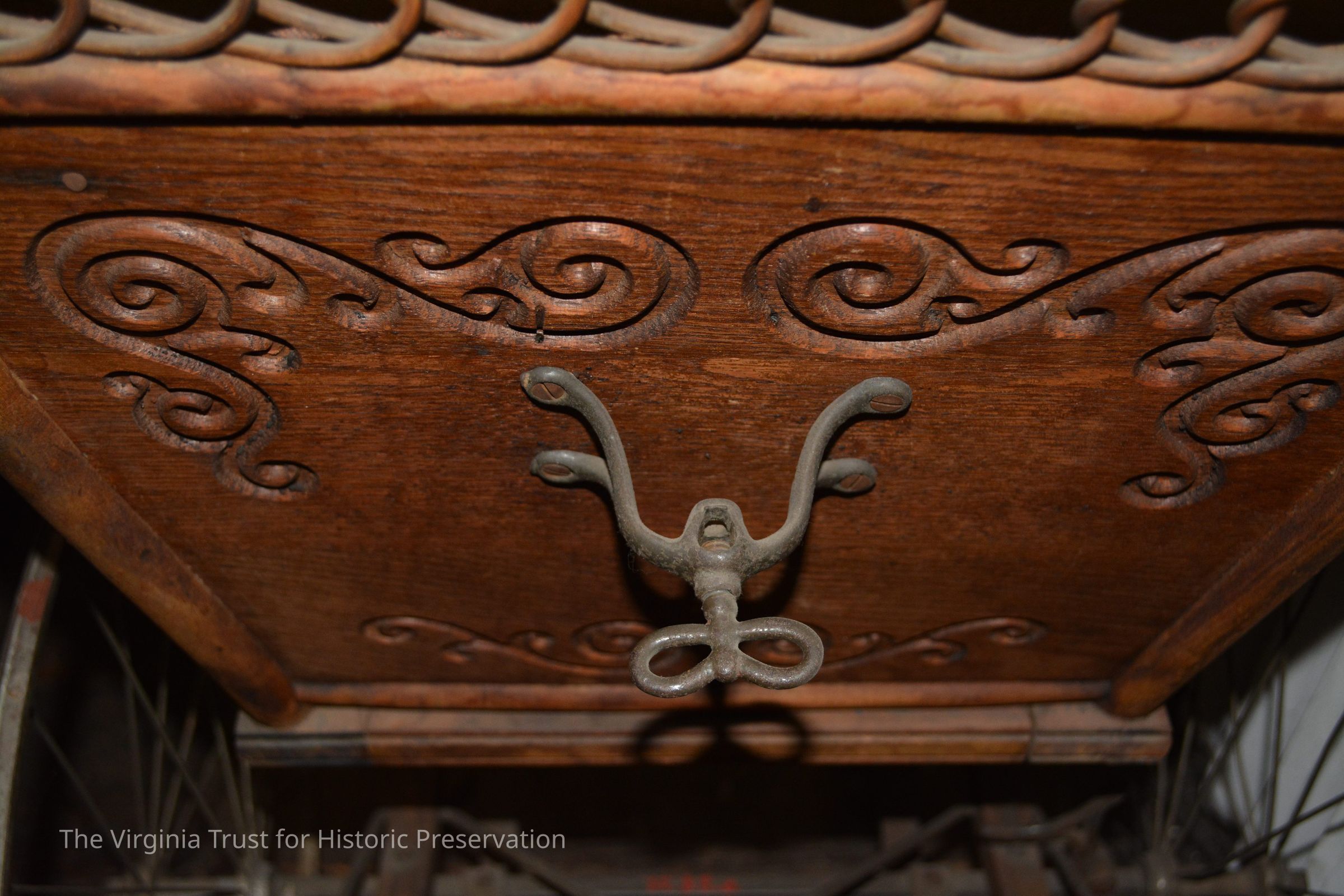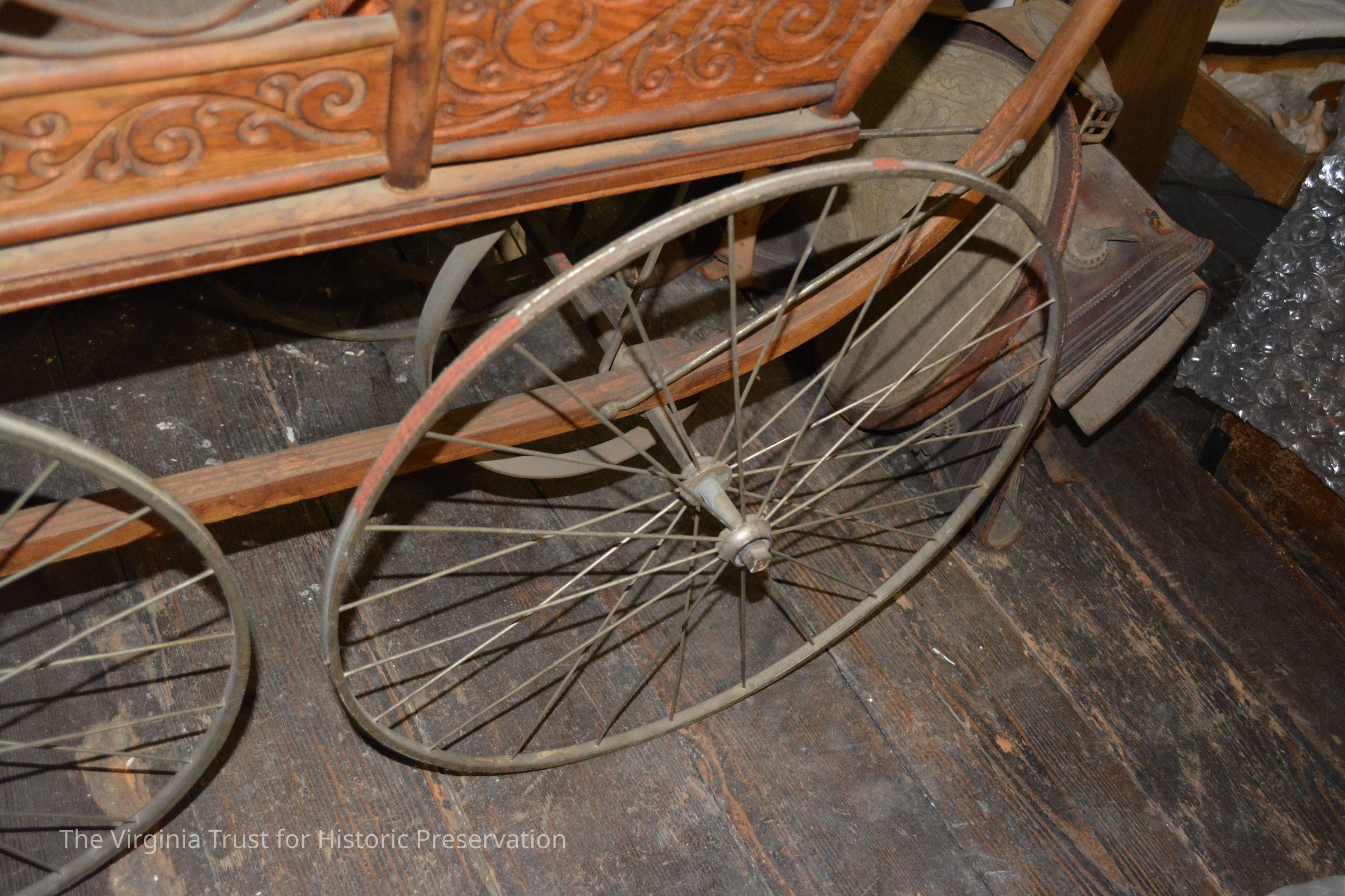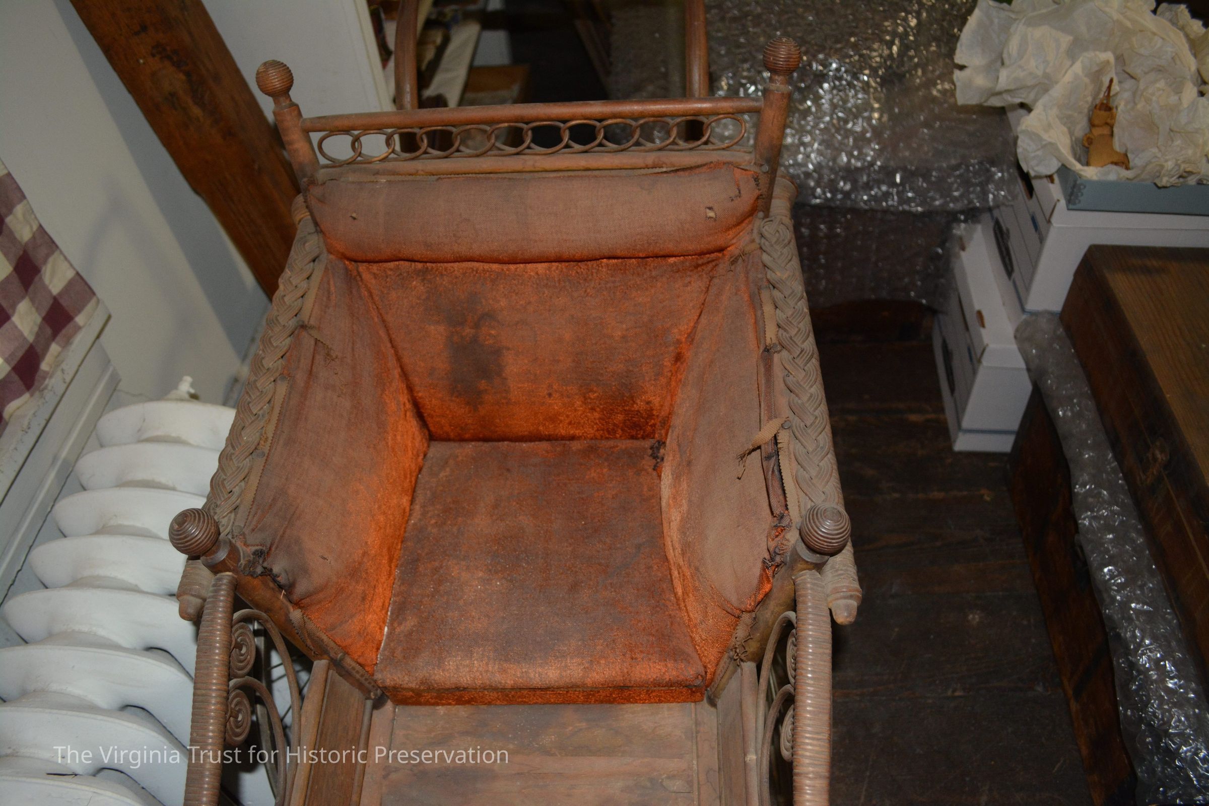 Wicker baby carriage with wire wheels, orange-ish velvet upholstery. White cotton parasol (1986.088 B) fits into a rear socket.