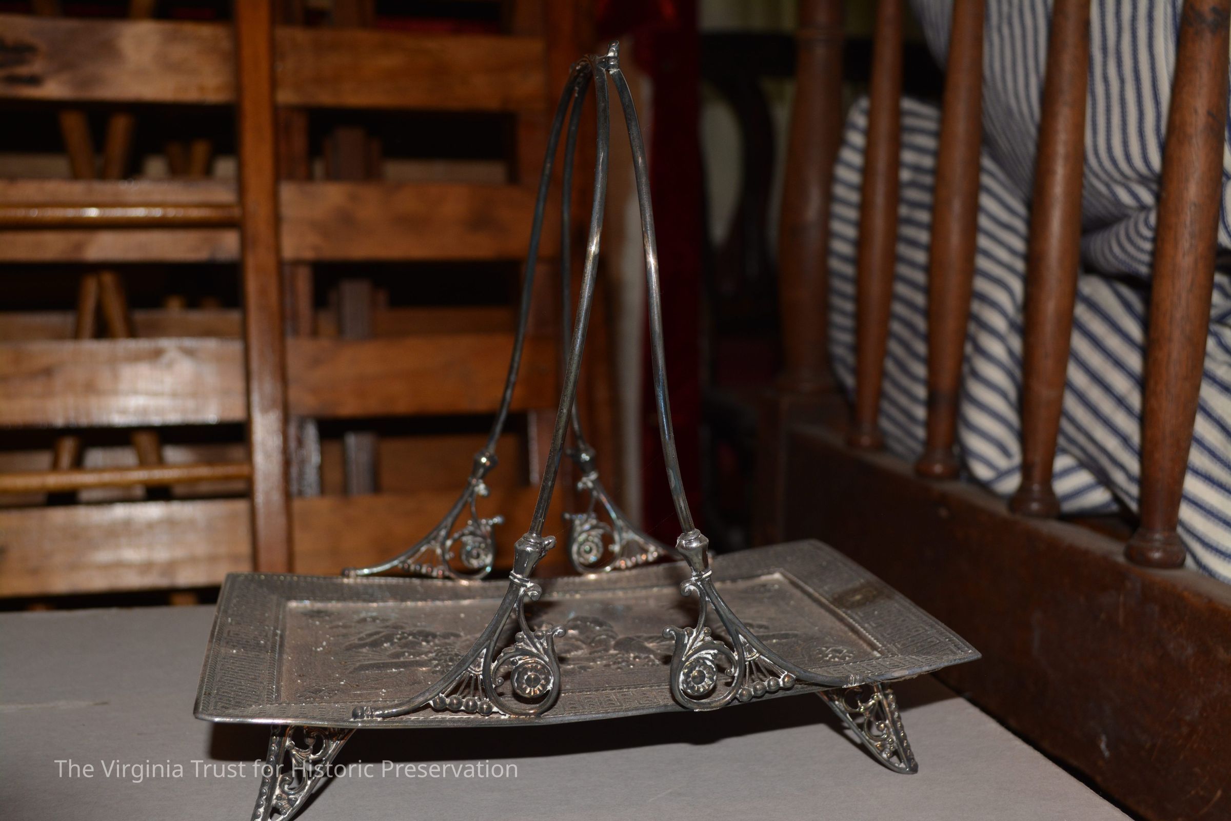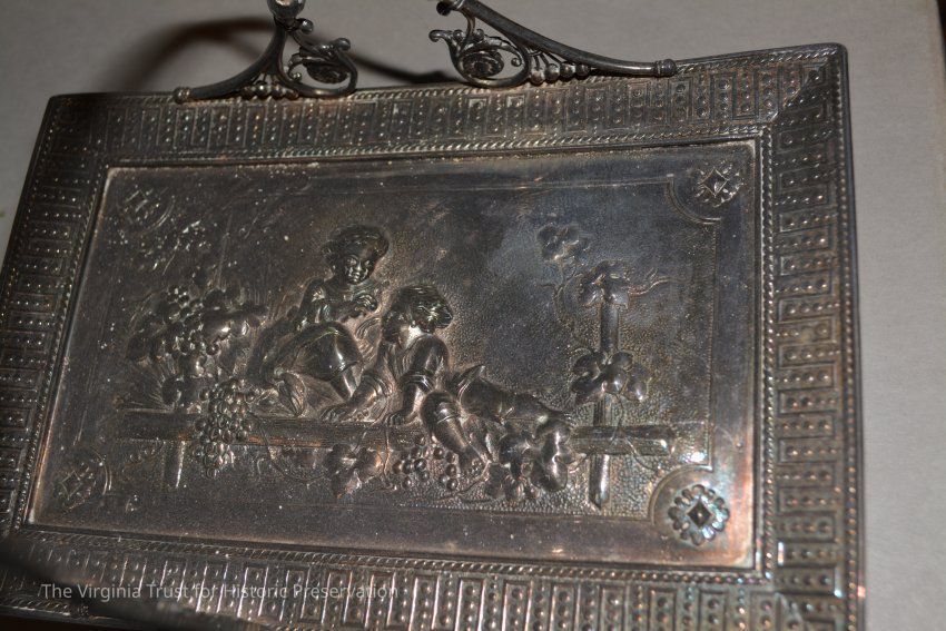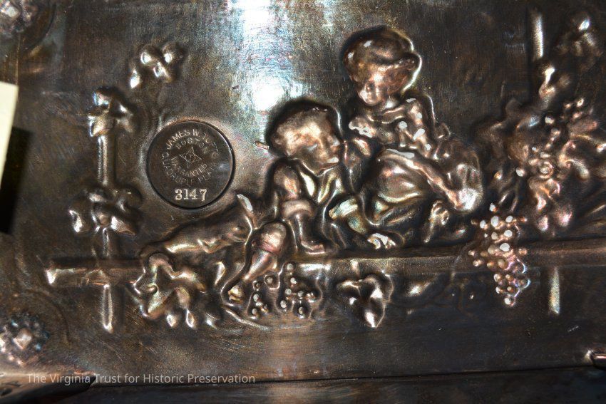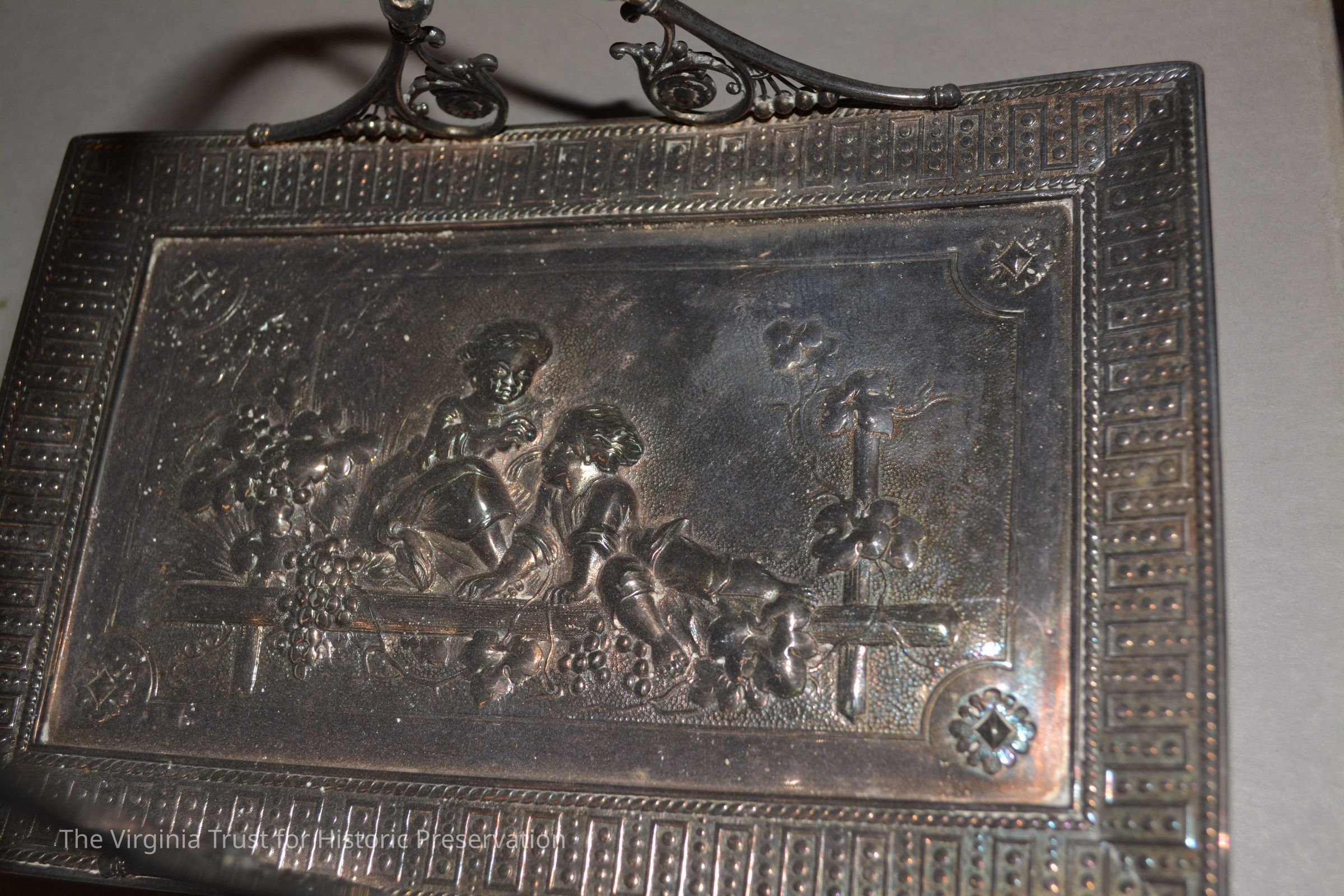 Silver card tray, with raised design: Children on a bench of a fence rail with grapes around them. Mark on bottom: James W. Tufts, Boston. Warranteed, quadruple plate. "3147" stamped on mark.Dimensions