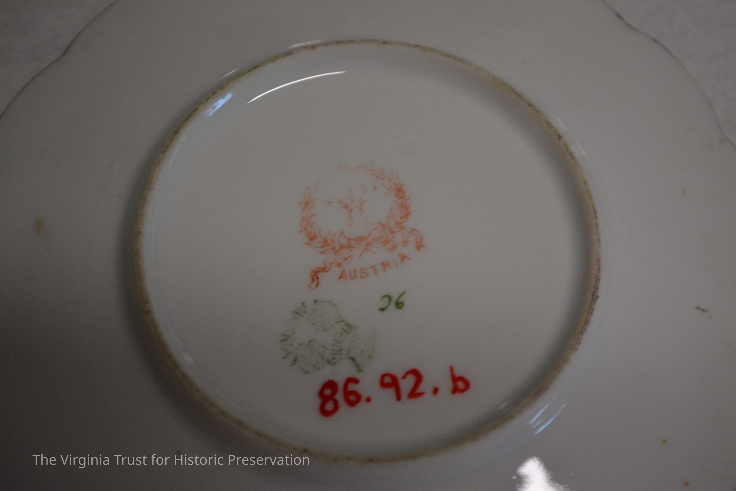 One of six saucers. Green rim with gold banding and peonies on saucers. Marked "Austria", "Vienna, Austria", "26", "61", and "TK" on underside. Matching ramekins have peony in center on bottom.Dimensions