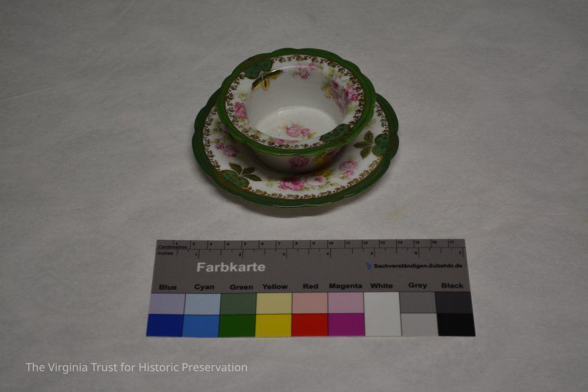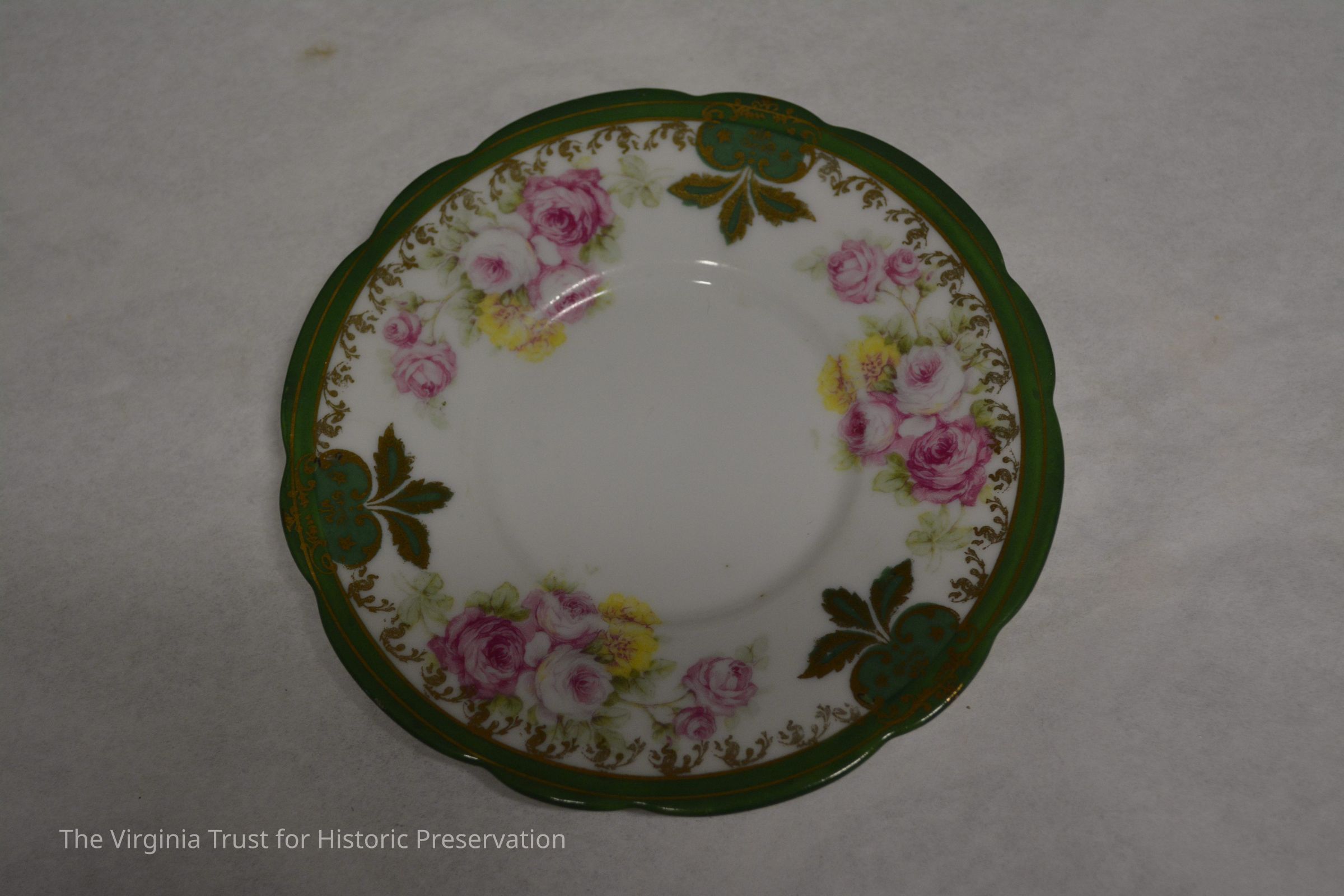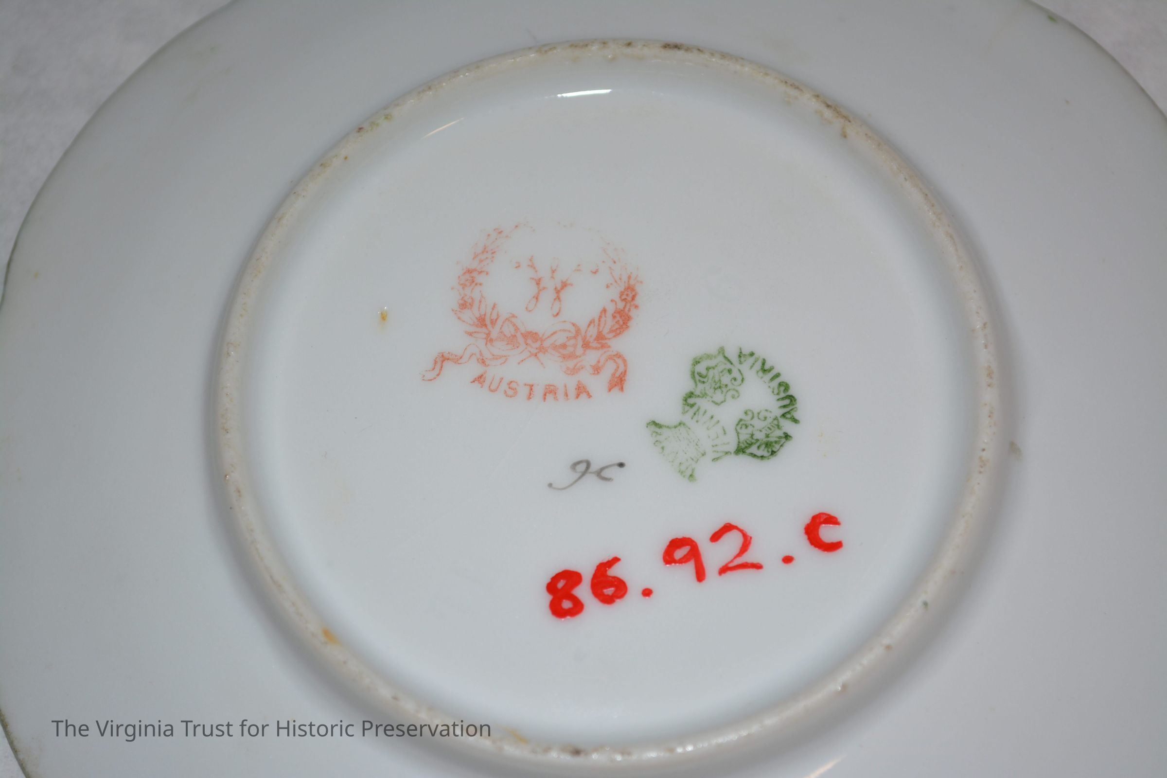 One of six saucers. Green rim with gold banding and peonies on saucers. Marked "Austria", "Vienna, Austria", "26", "61", and "TK" on underside. Matching ramekins have peony in center on bottom.Dimensions