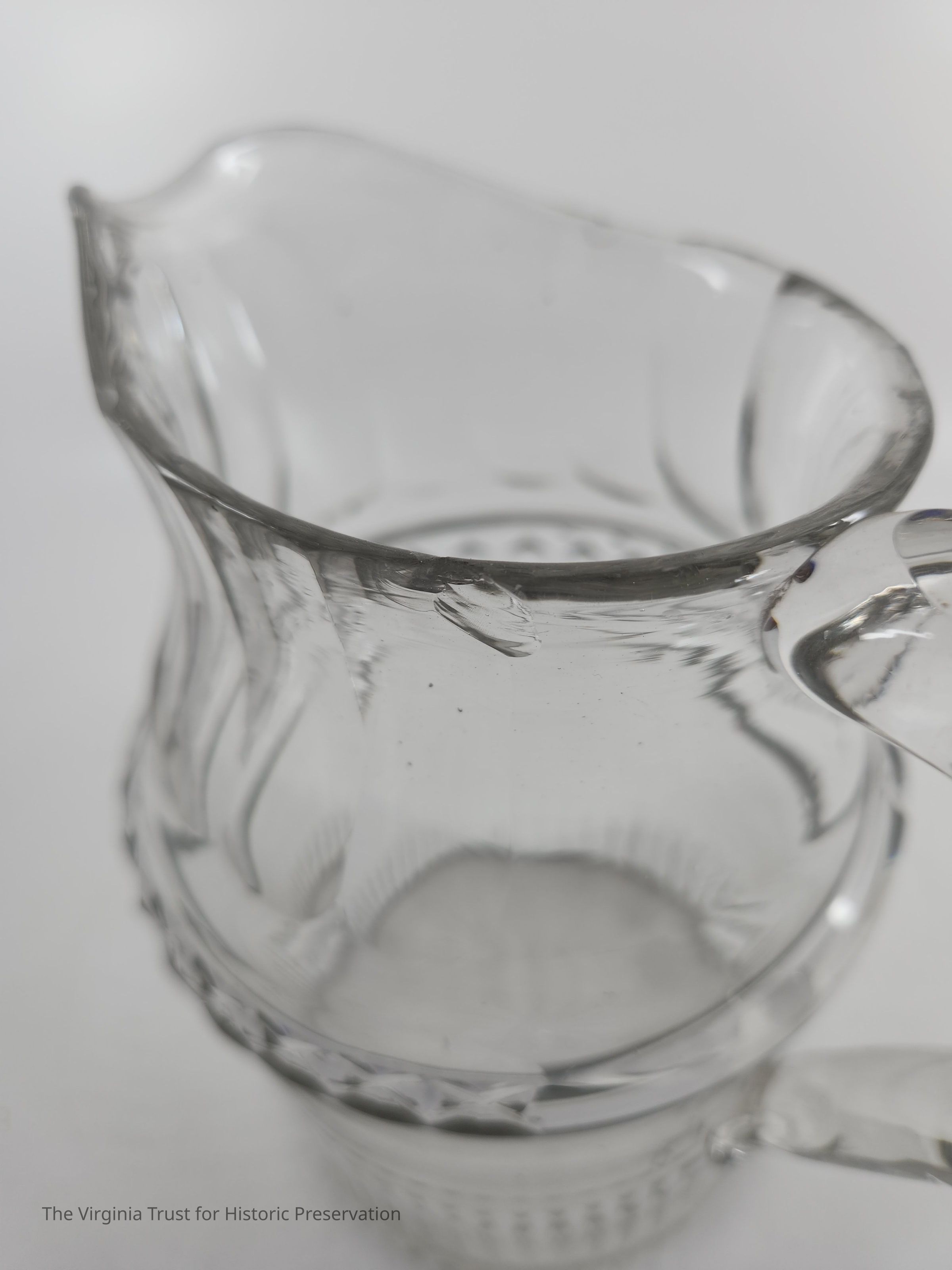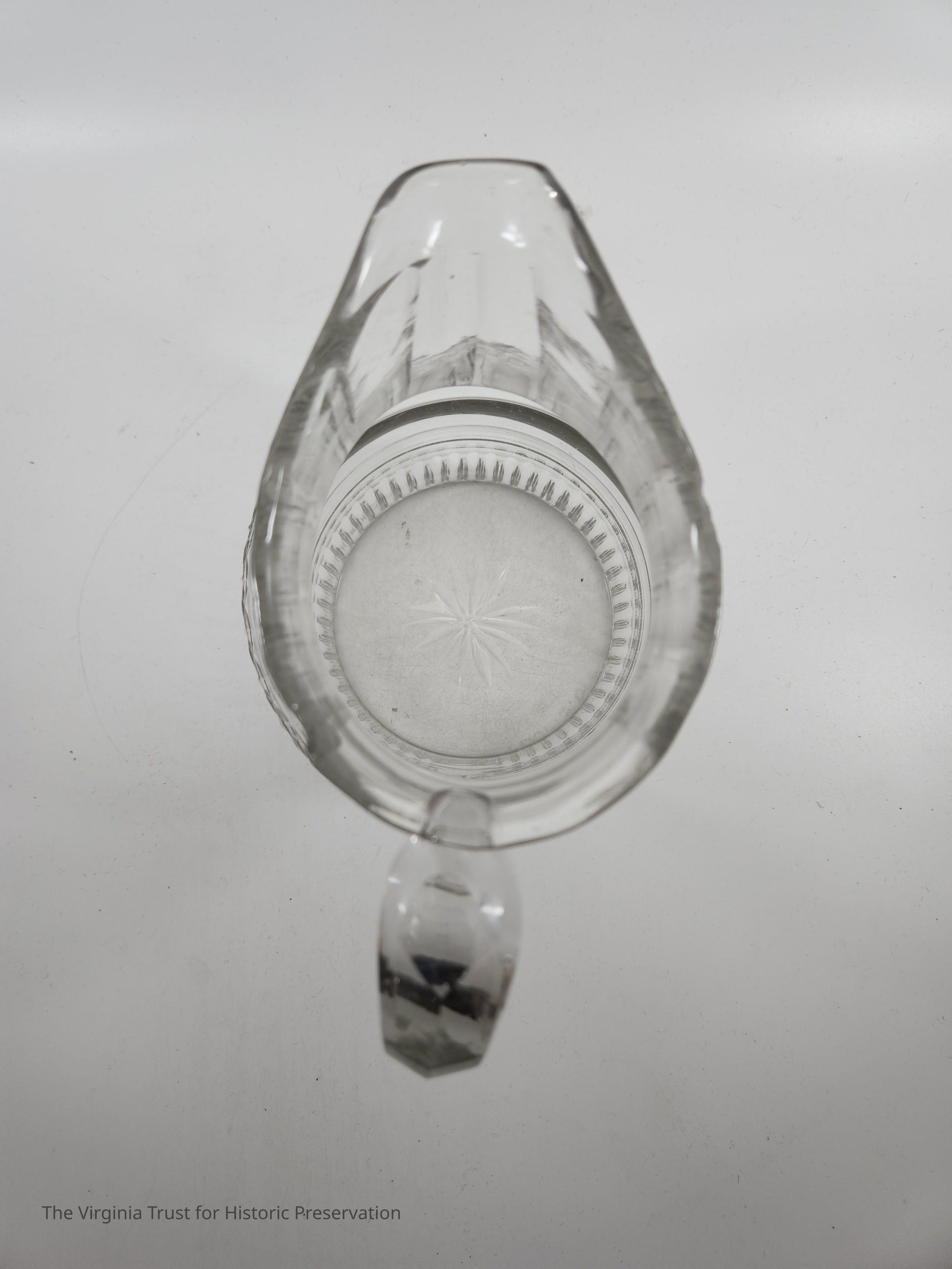 Irish cut-glass water jug with handle and incised designs.