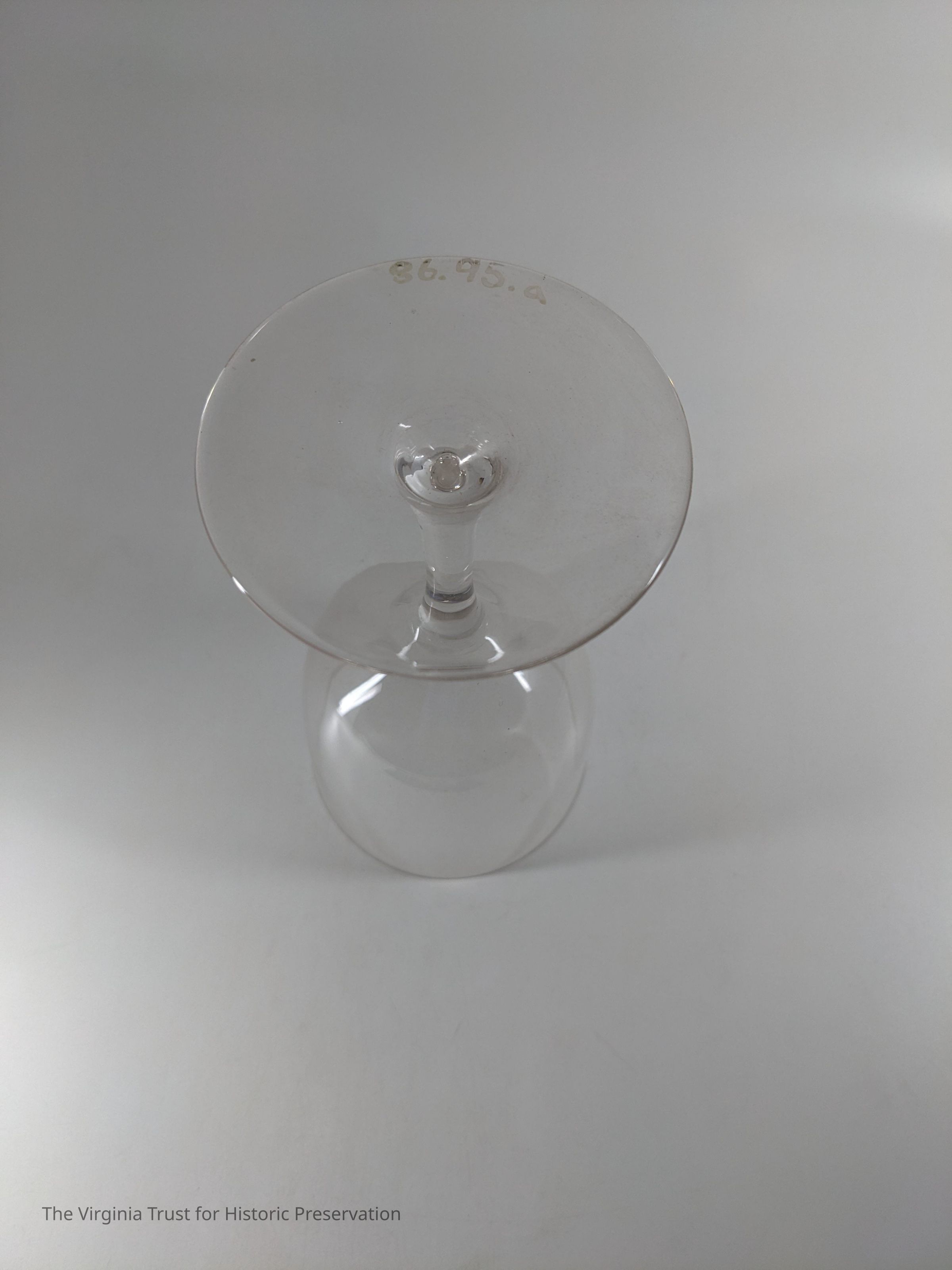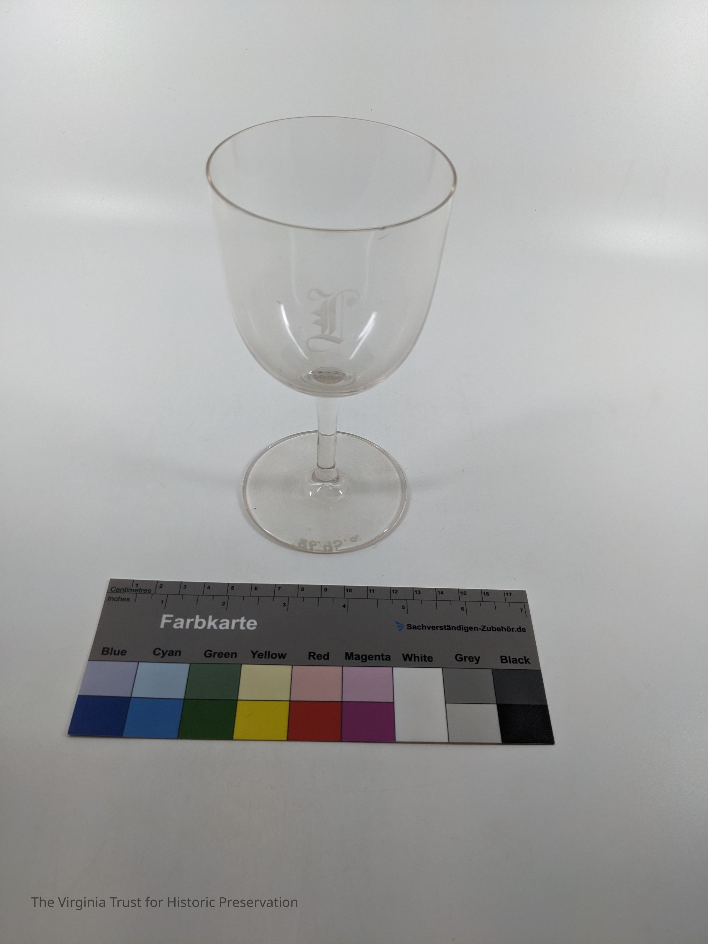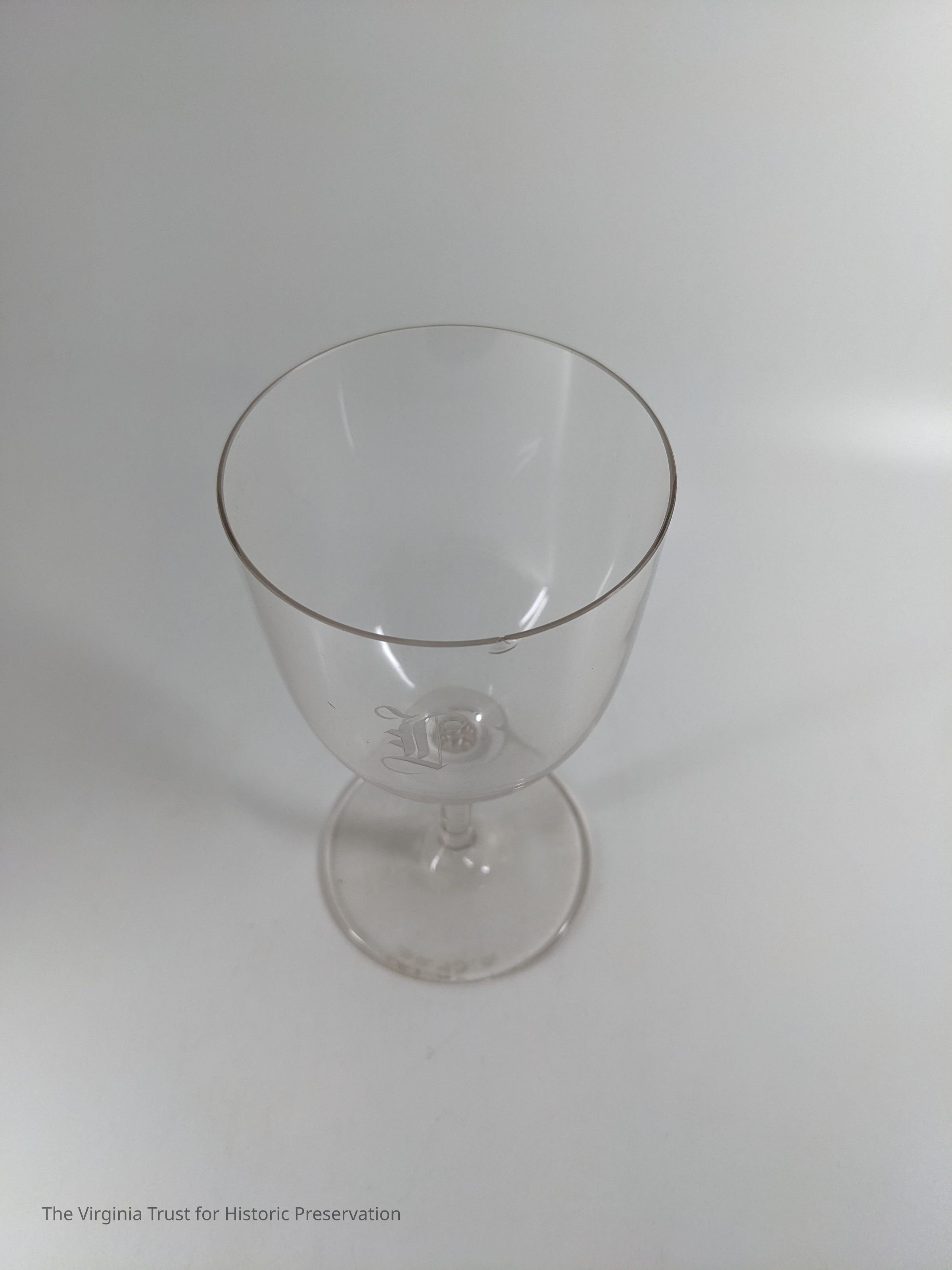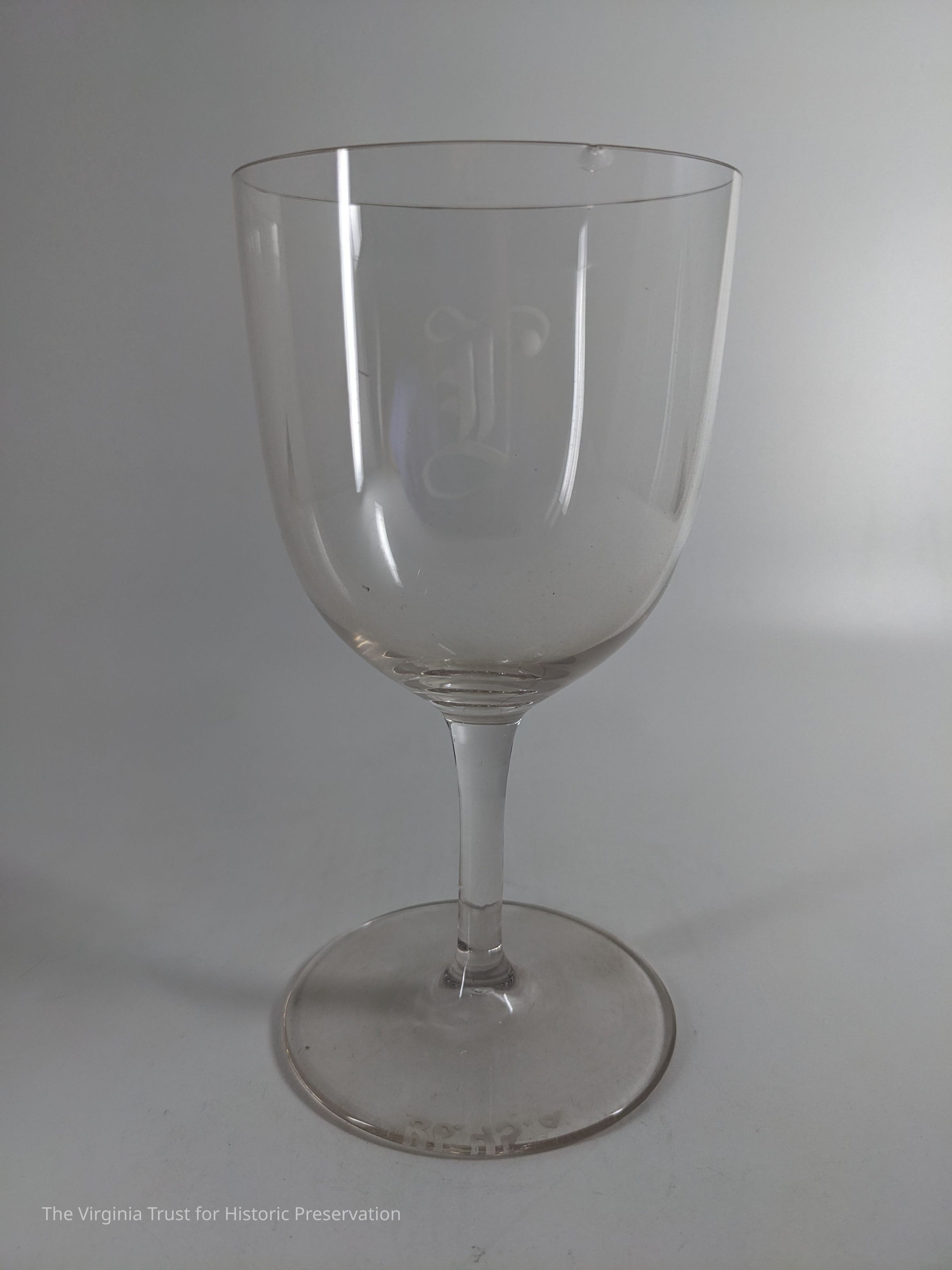 One of a set of five crystal glass stemmed water goblets with etched "L." The "L" has a short horizontal part, glass is very thin.