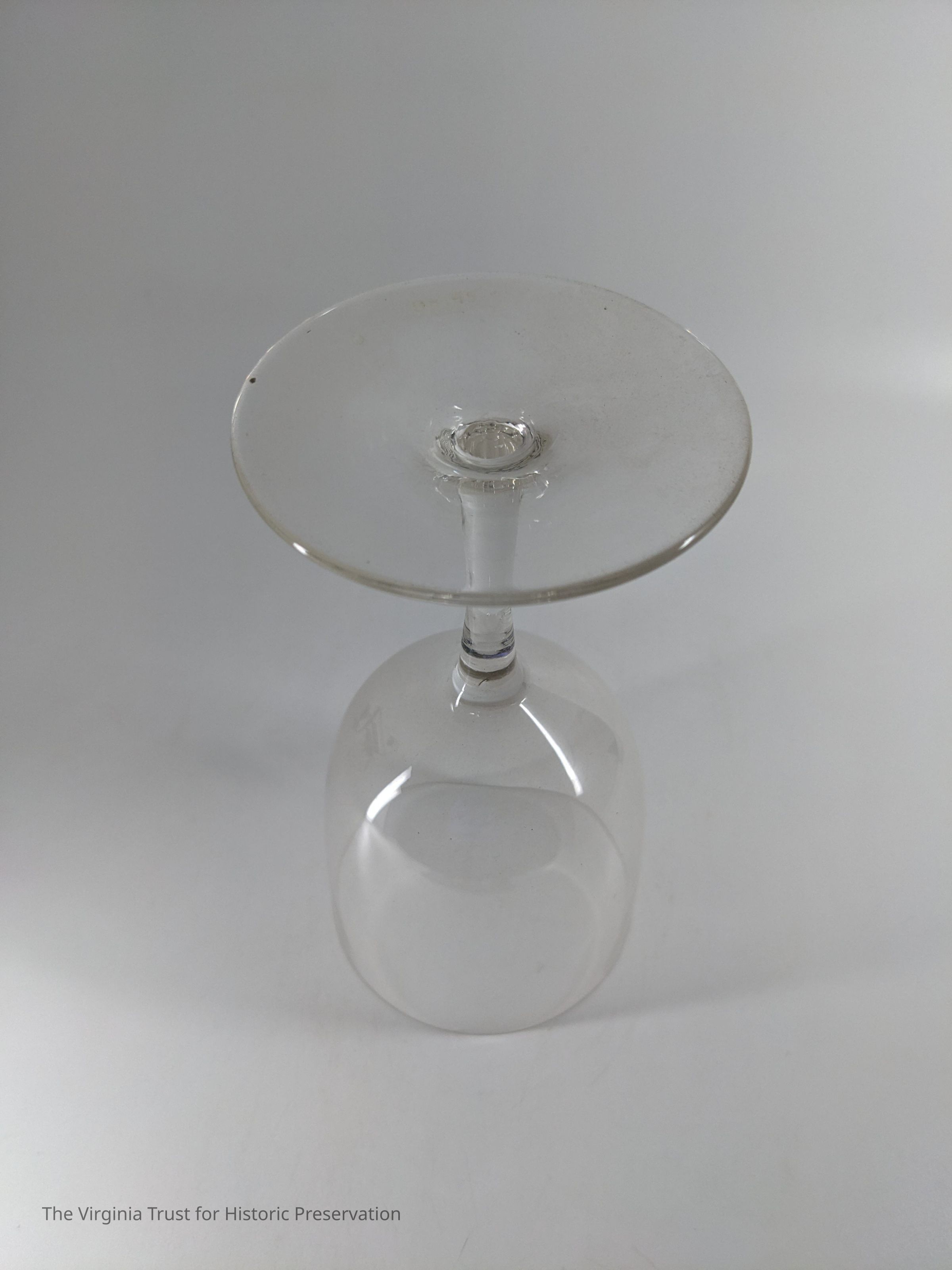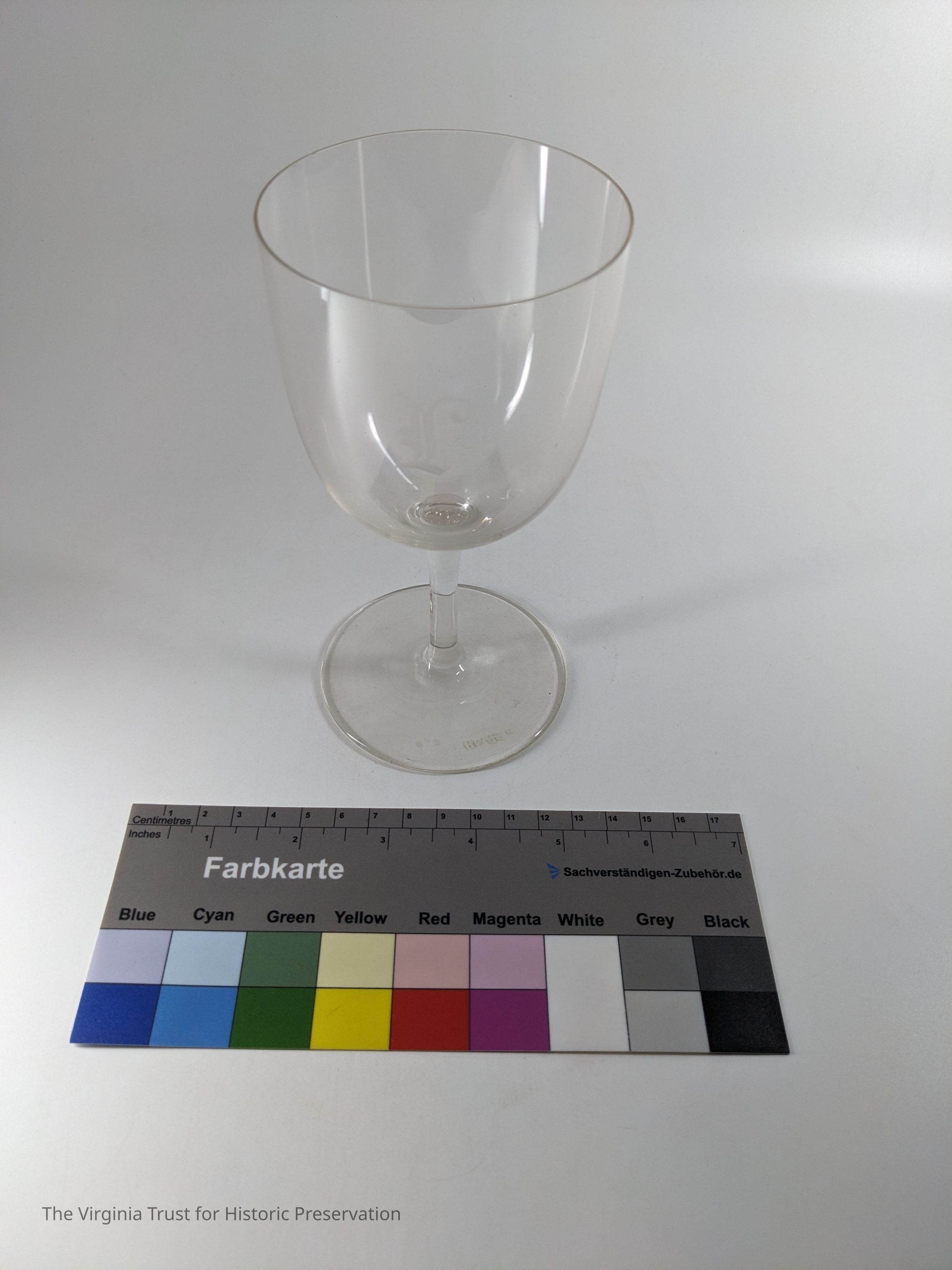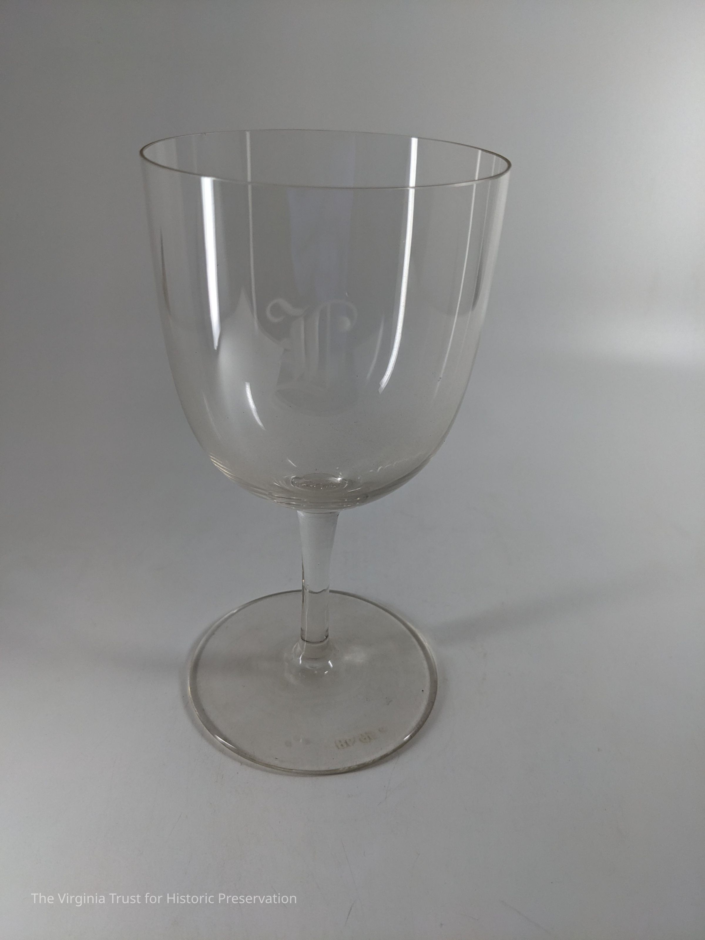 One of a set of five crystal glass stemmed water goblets with etched "L." The "L" has a short horizontal part, glass is very thin.