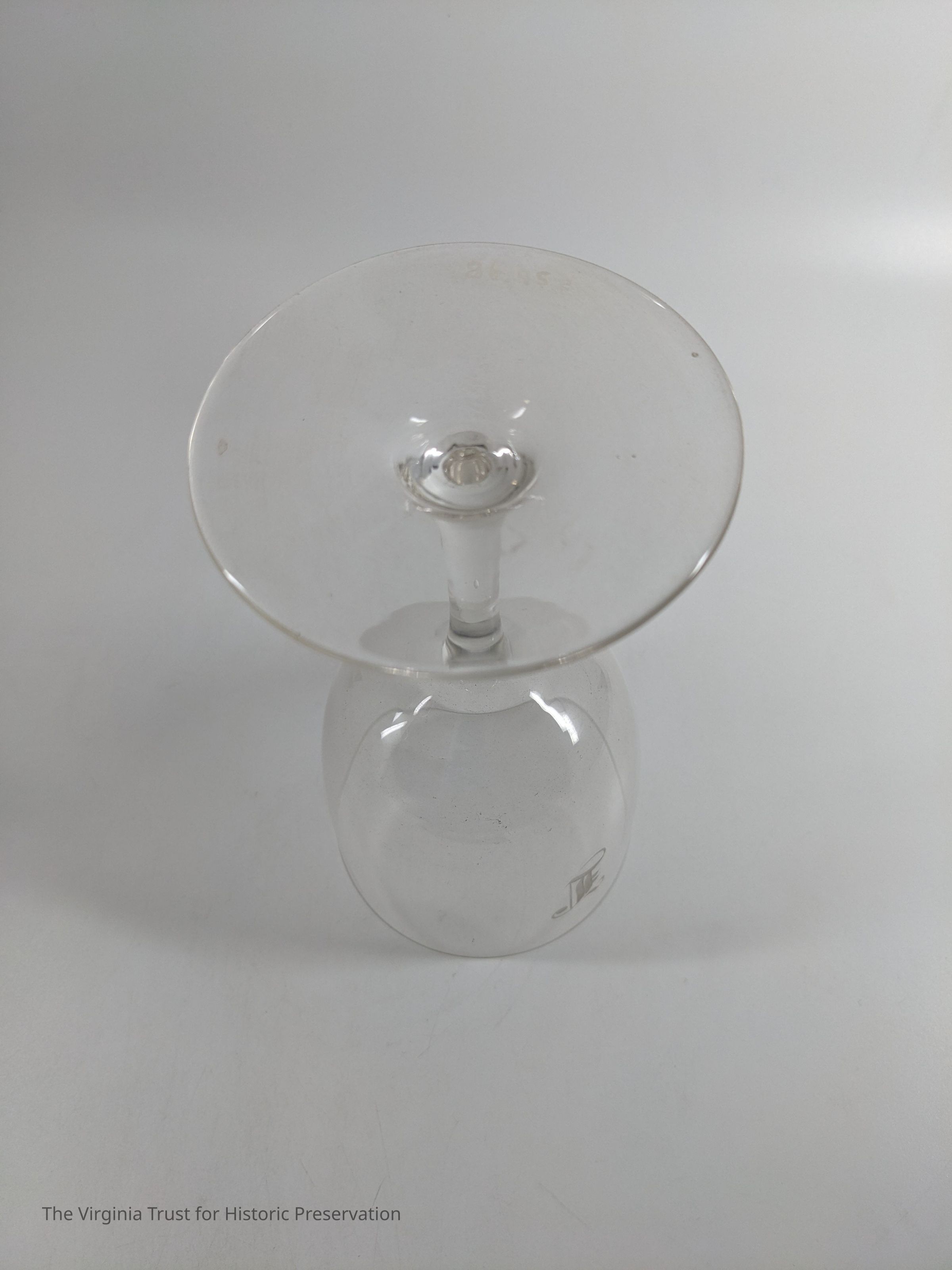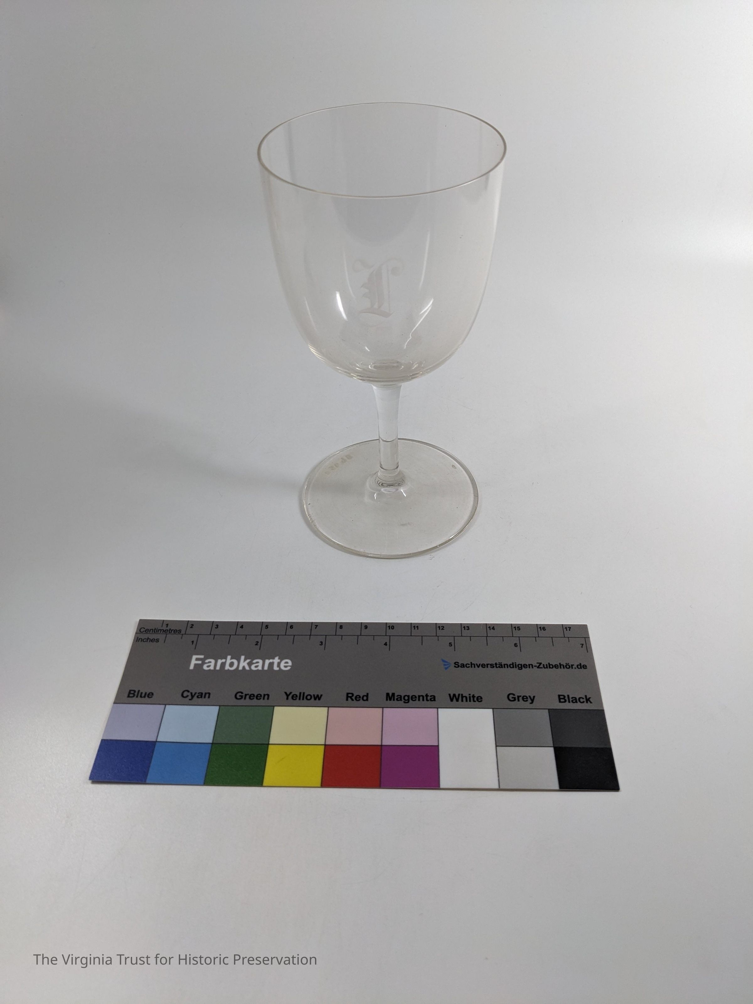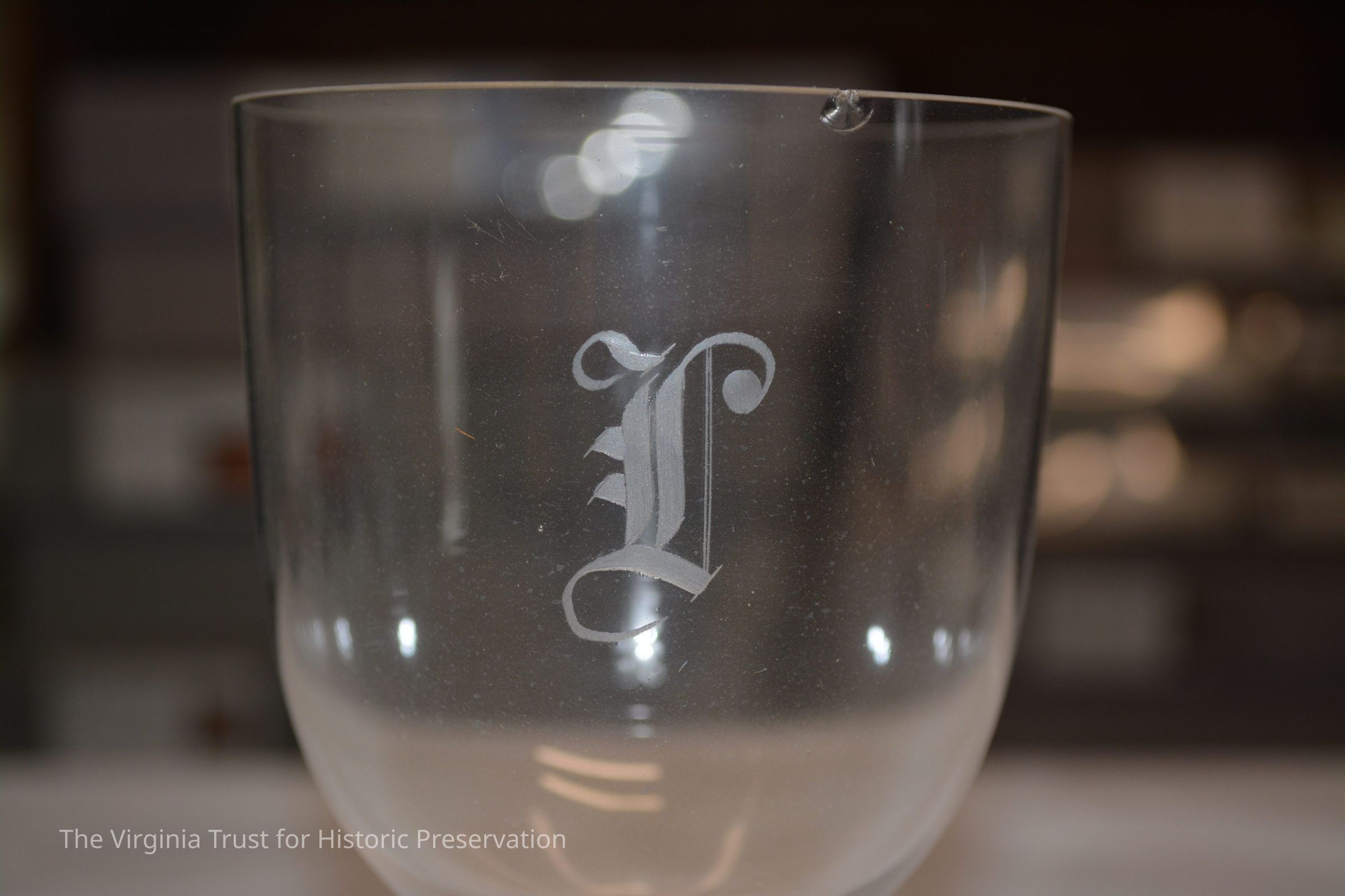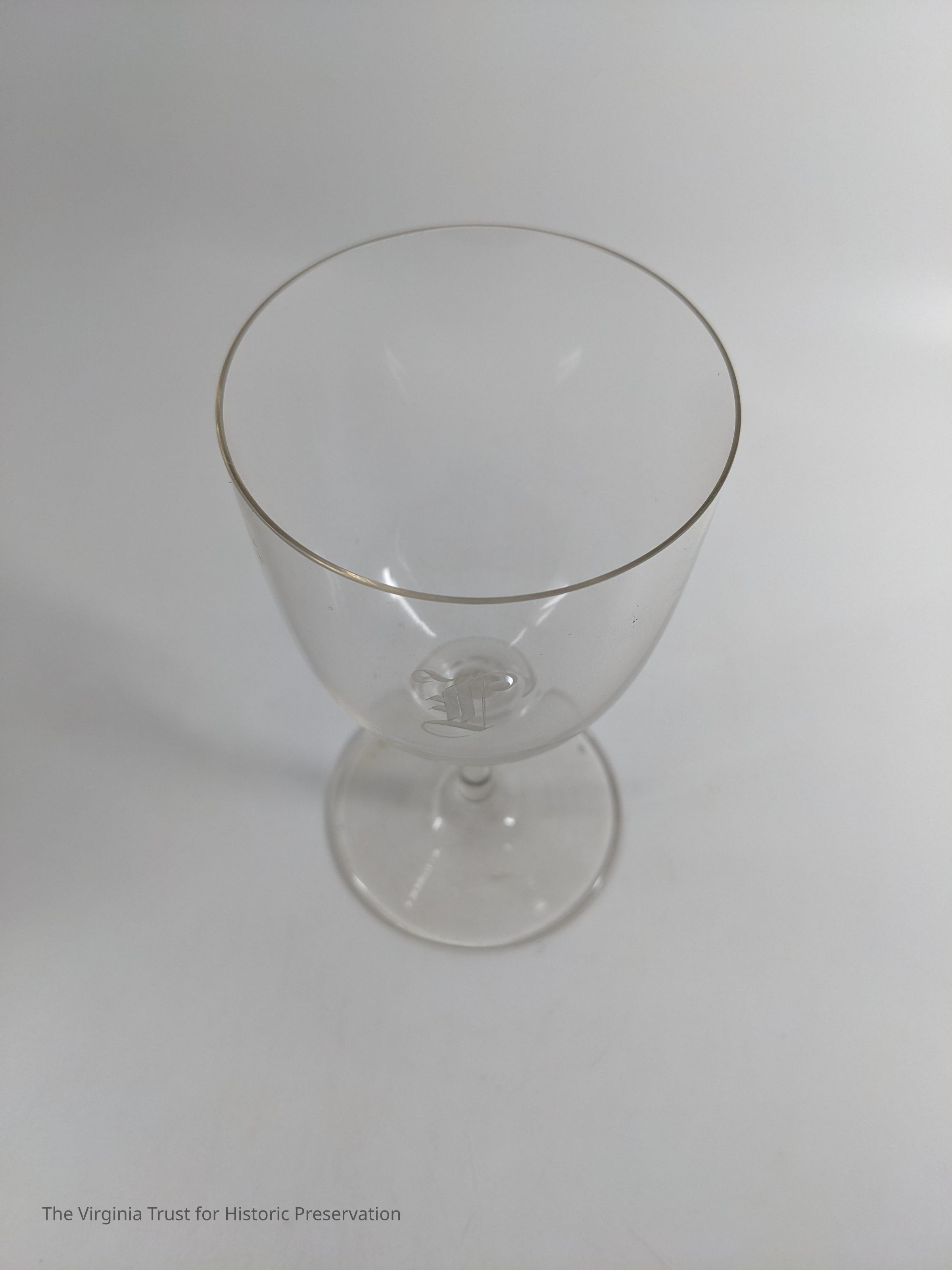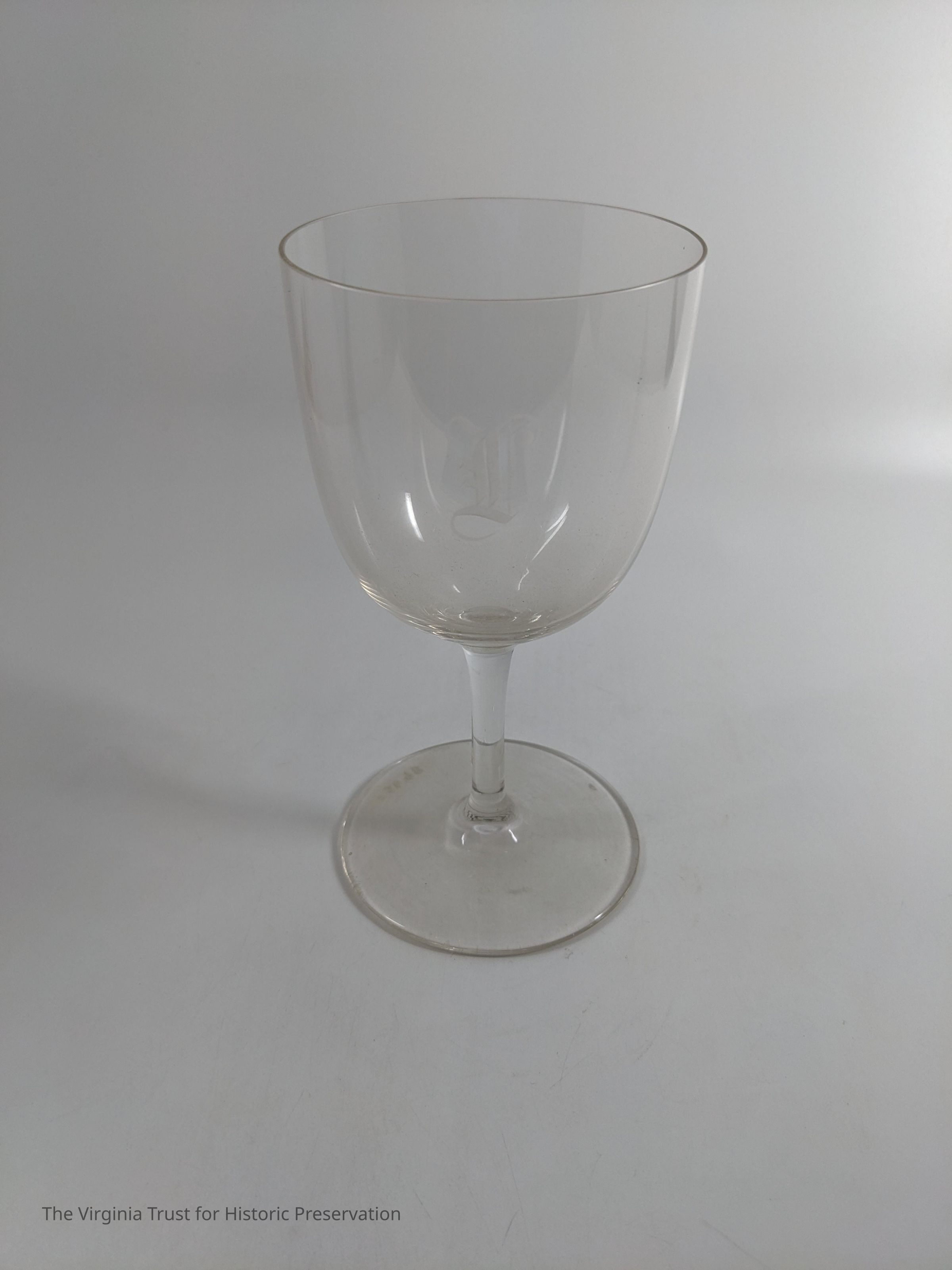 One of a set of five crystal glass stemmed water goblets with etched "L." The "L" has a short horizontal part, glass is very thin.