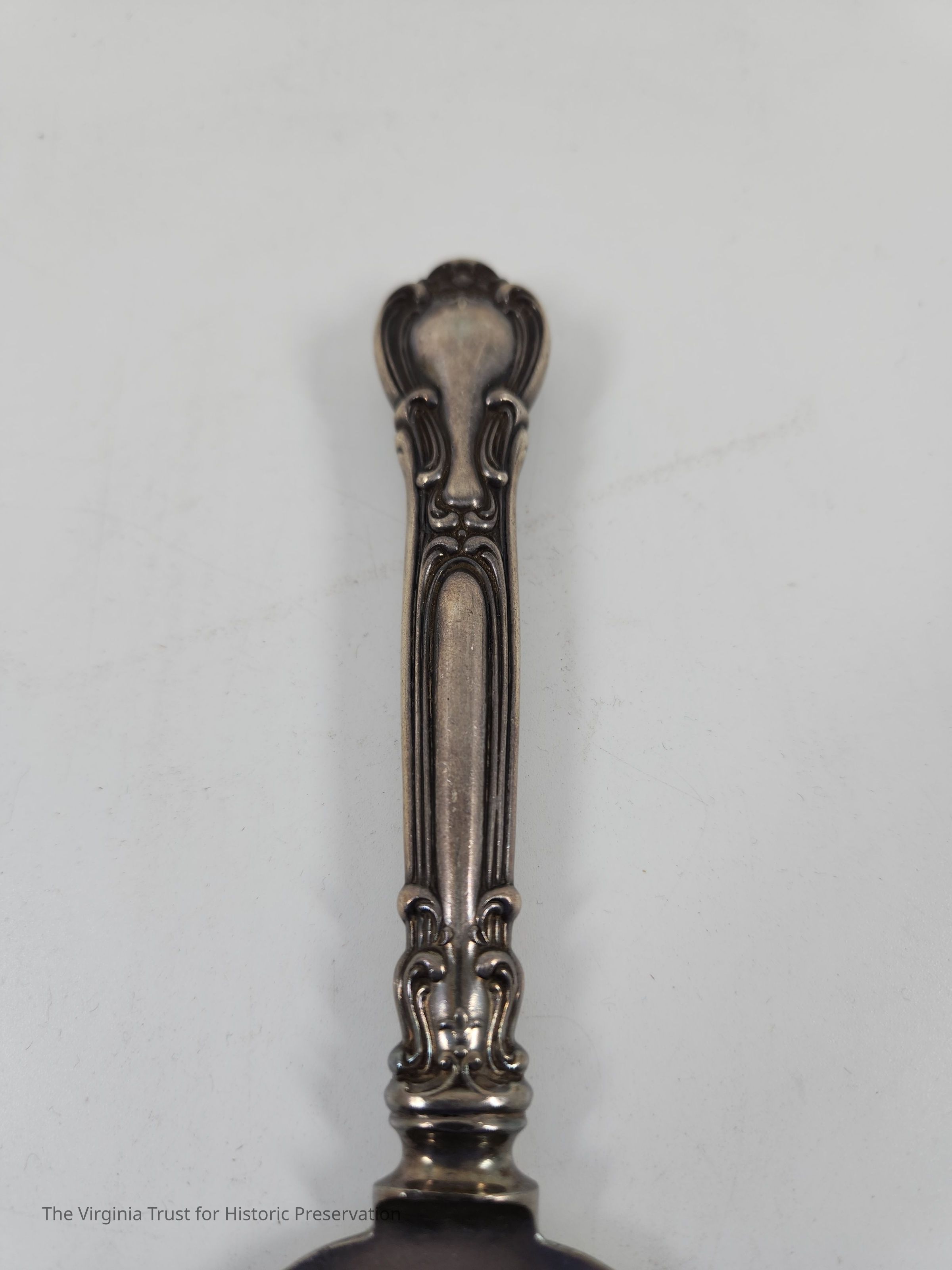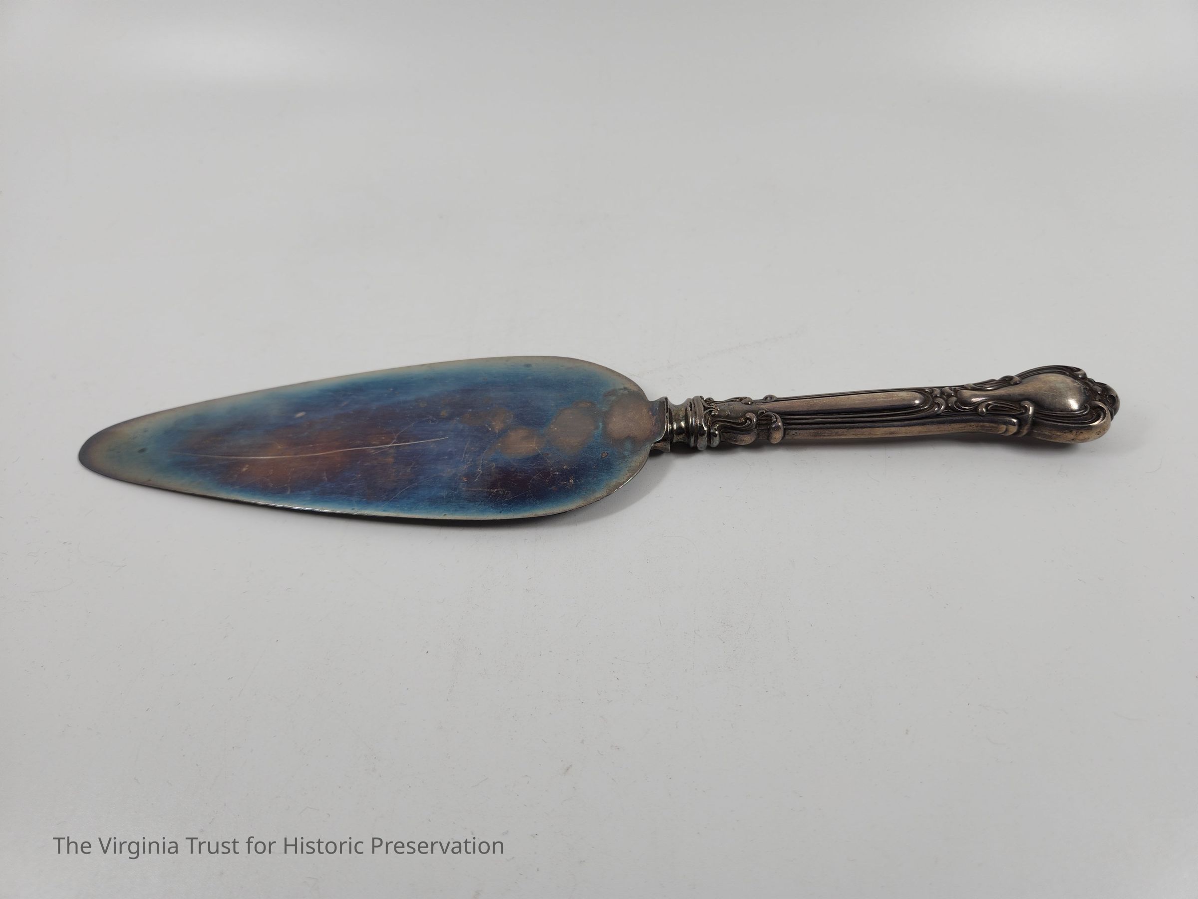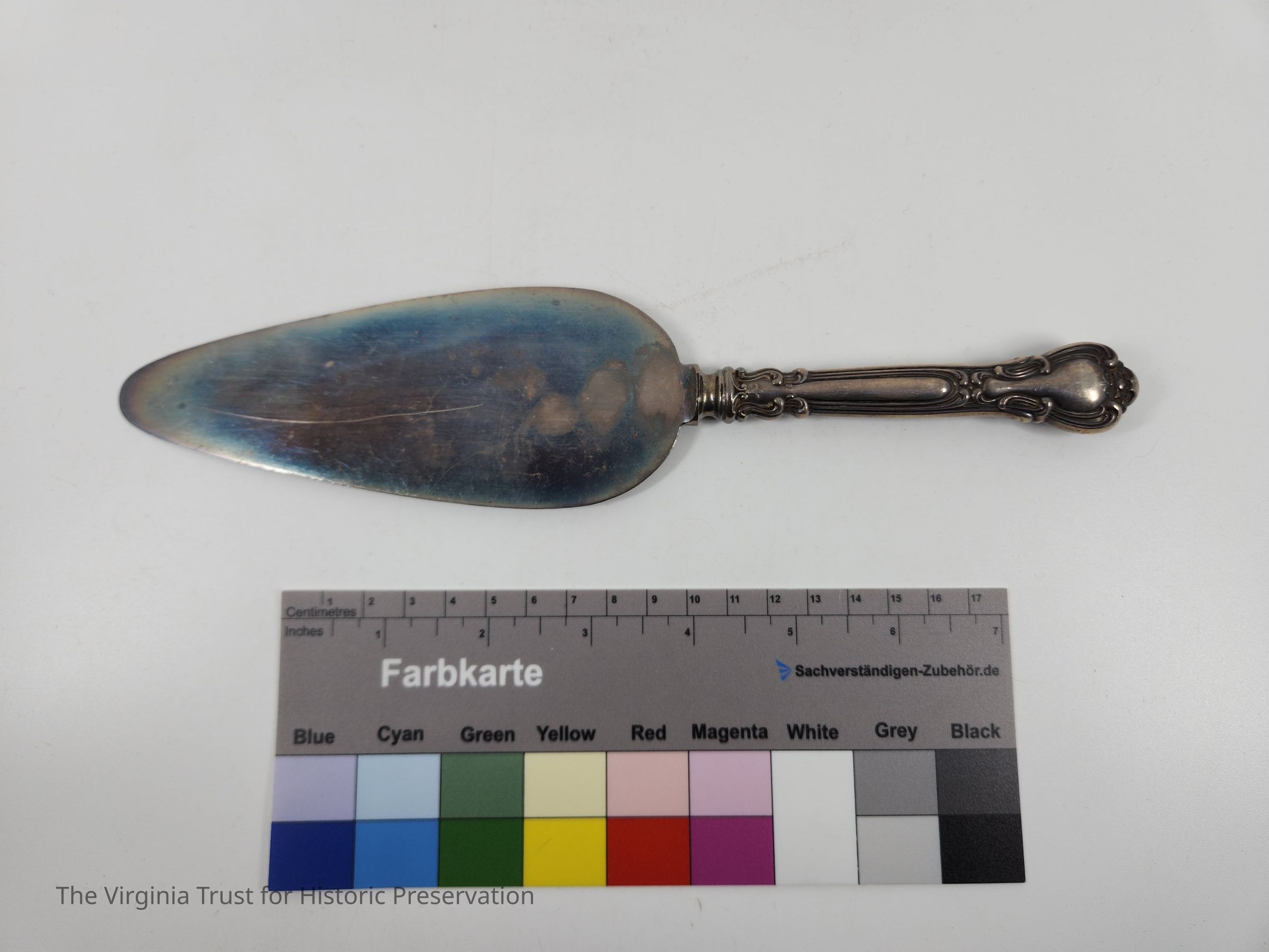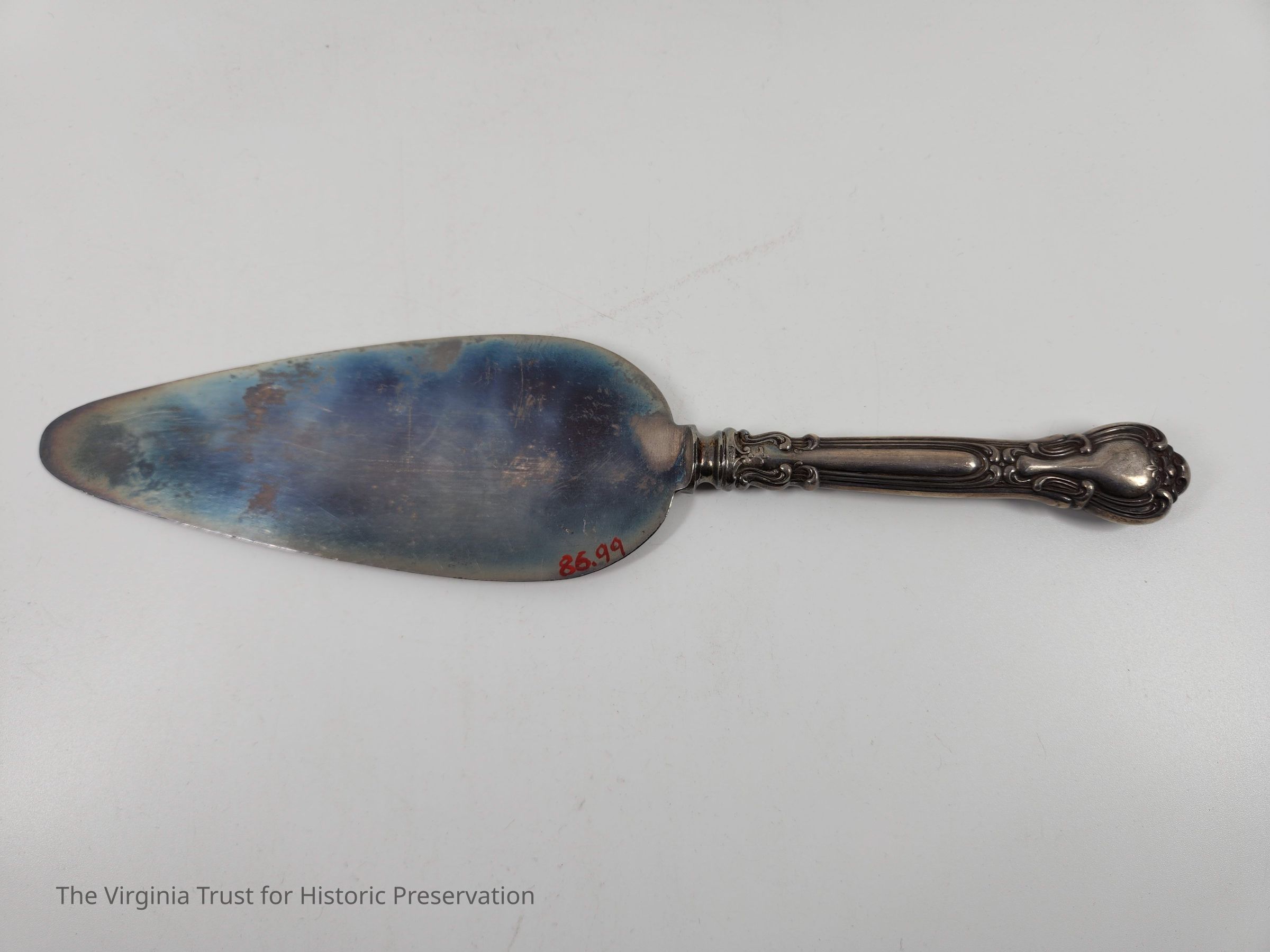 Silver cake server with sculpted decoration on tapering handle in Gorham's Chantilly design (the most popular sterling flateware design ever produced). Serving end tip is rounded, serving wedge is rounded as well; handle tapers from the end of the serving wedge and has sculpted decoration. Chantilly's distinctive scroll design and fleur-de-lis accents were inspired by the Rococo style of early 18th century France.