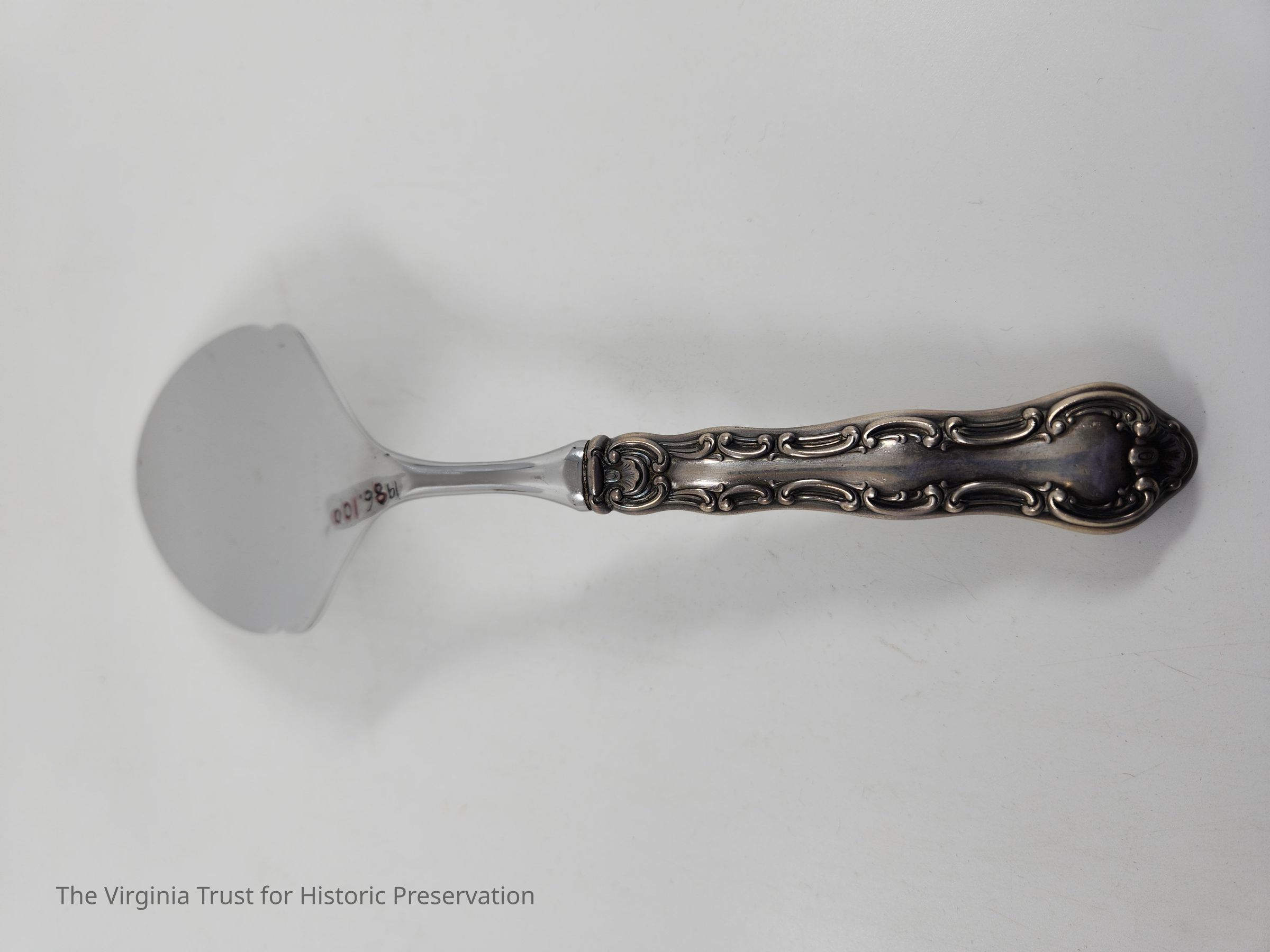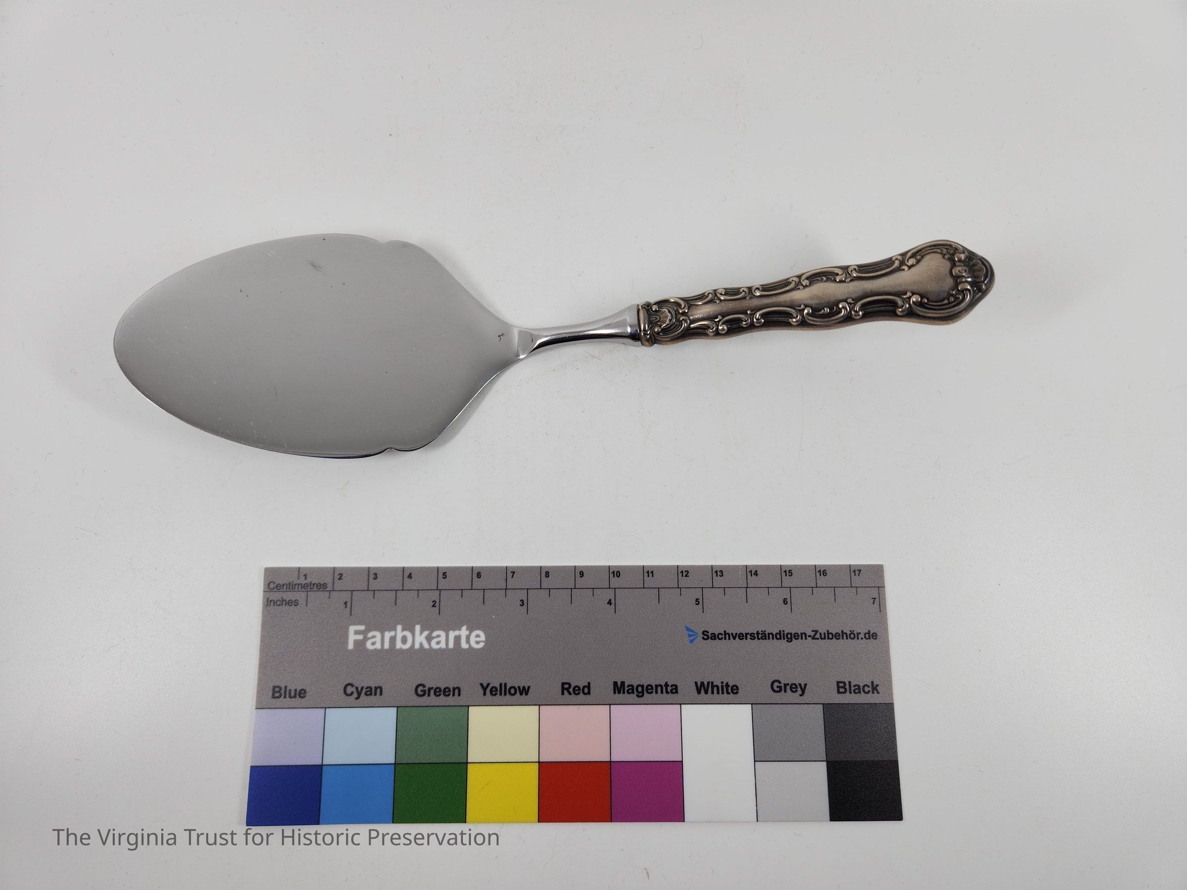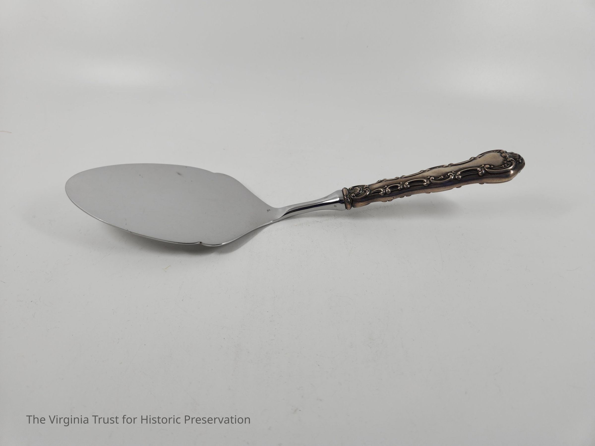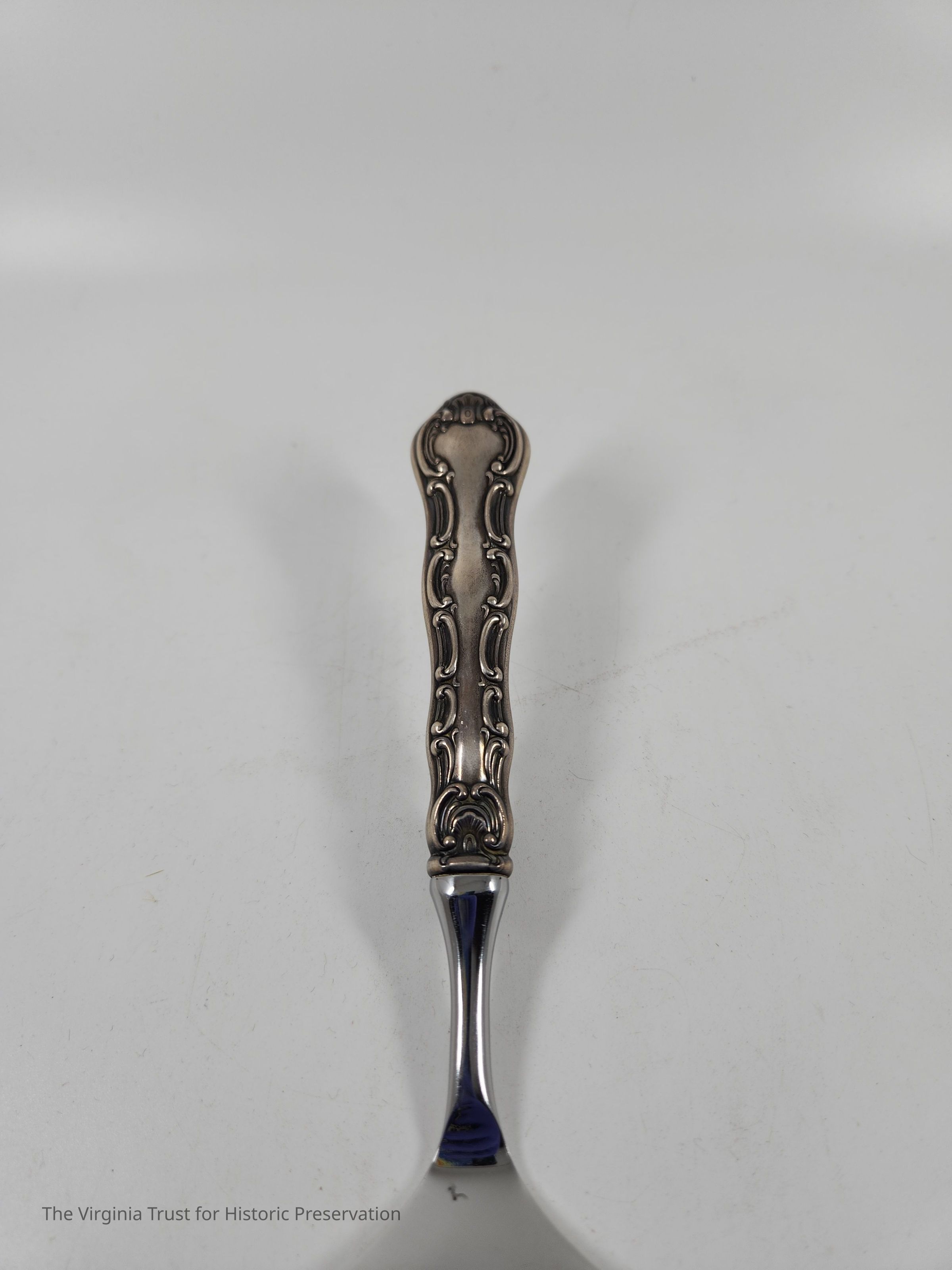 Flat stainless steel cake server with sterling silver scalloped handle and C scrolls in Gorham's in Strasbourg deisgn, a tip-heavy silverware pattern featuring a glossy finish, playful scrollwork, and plume design. Reverse scrolls, beginning at the serving wedge bottom to the top. Marked "stainless".Dimensions