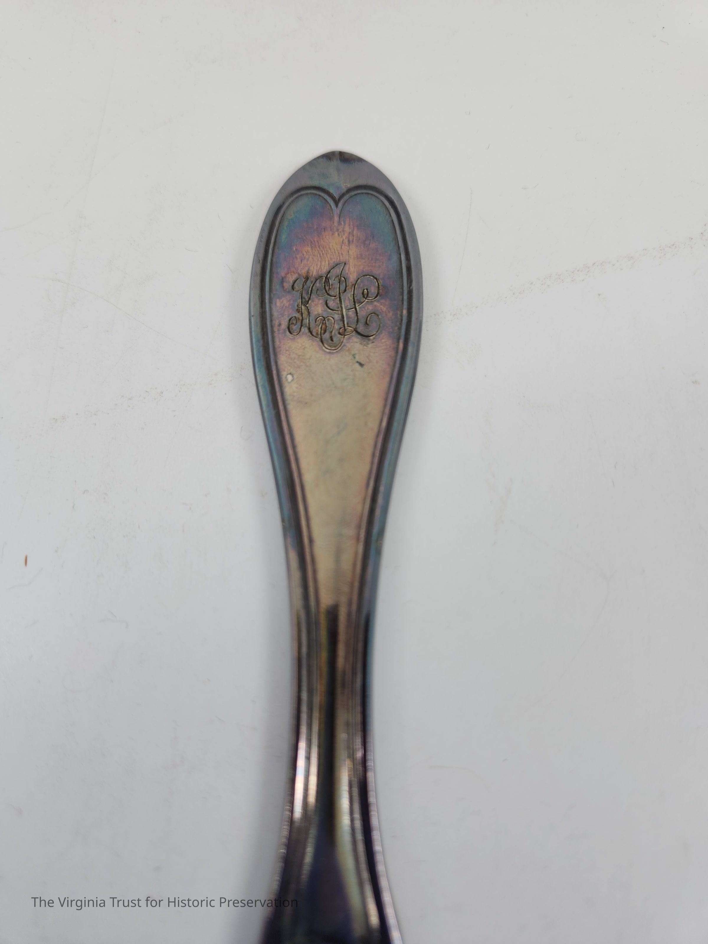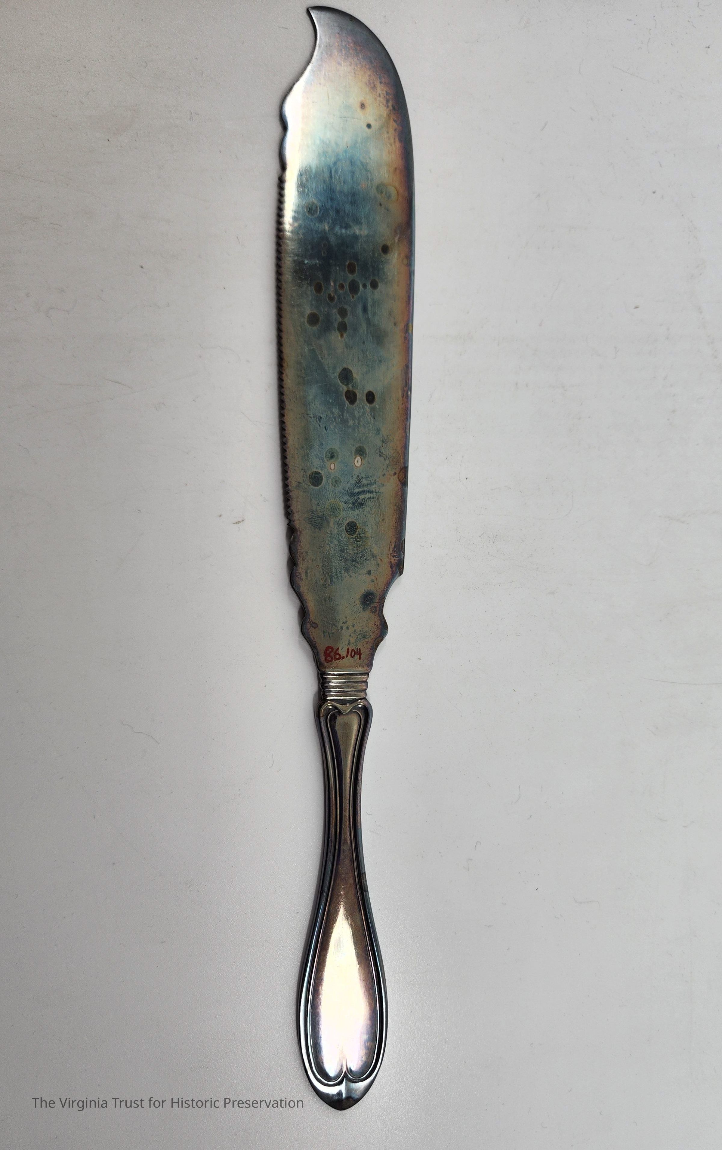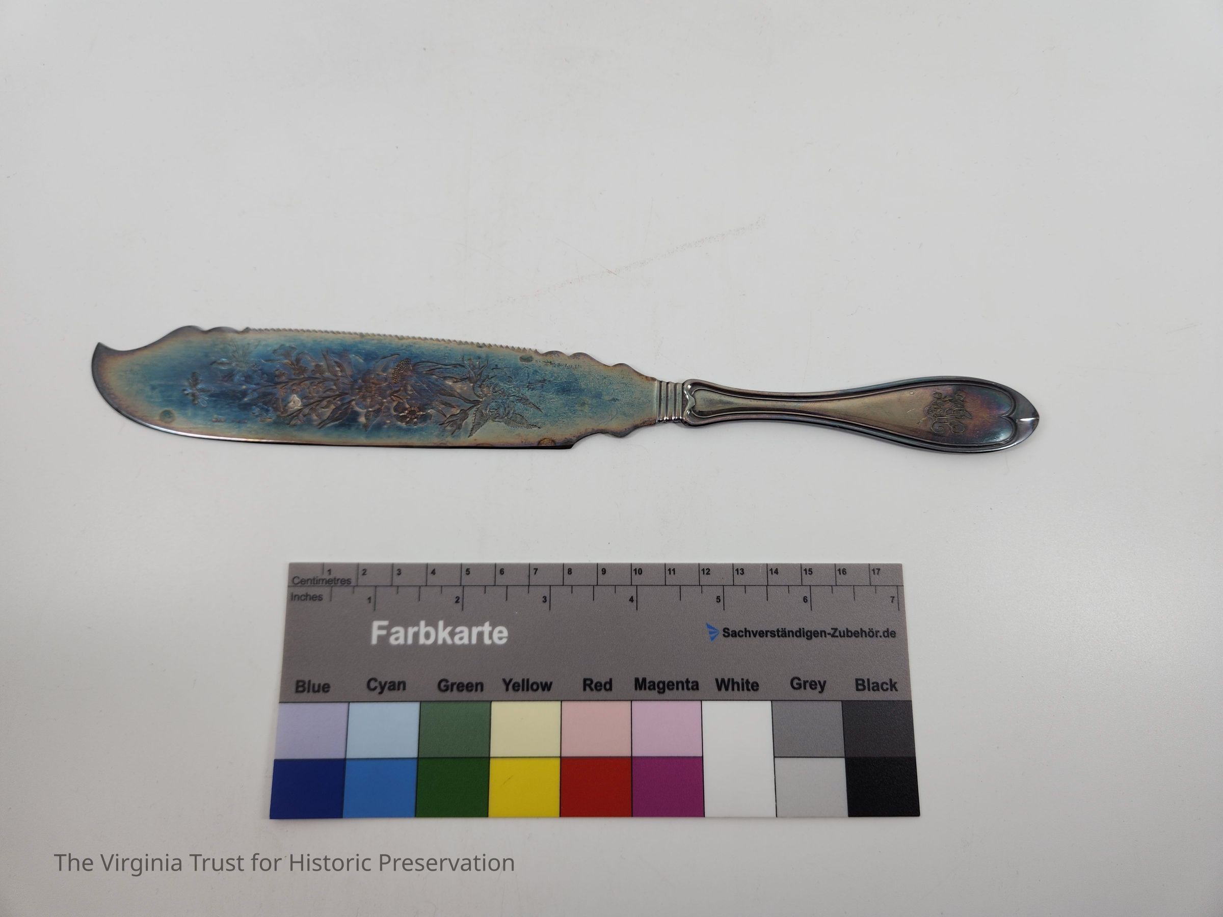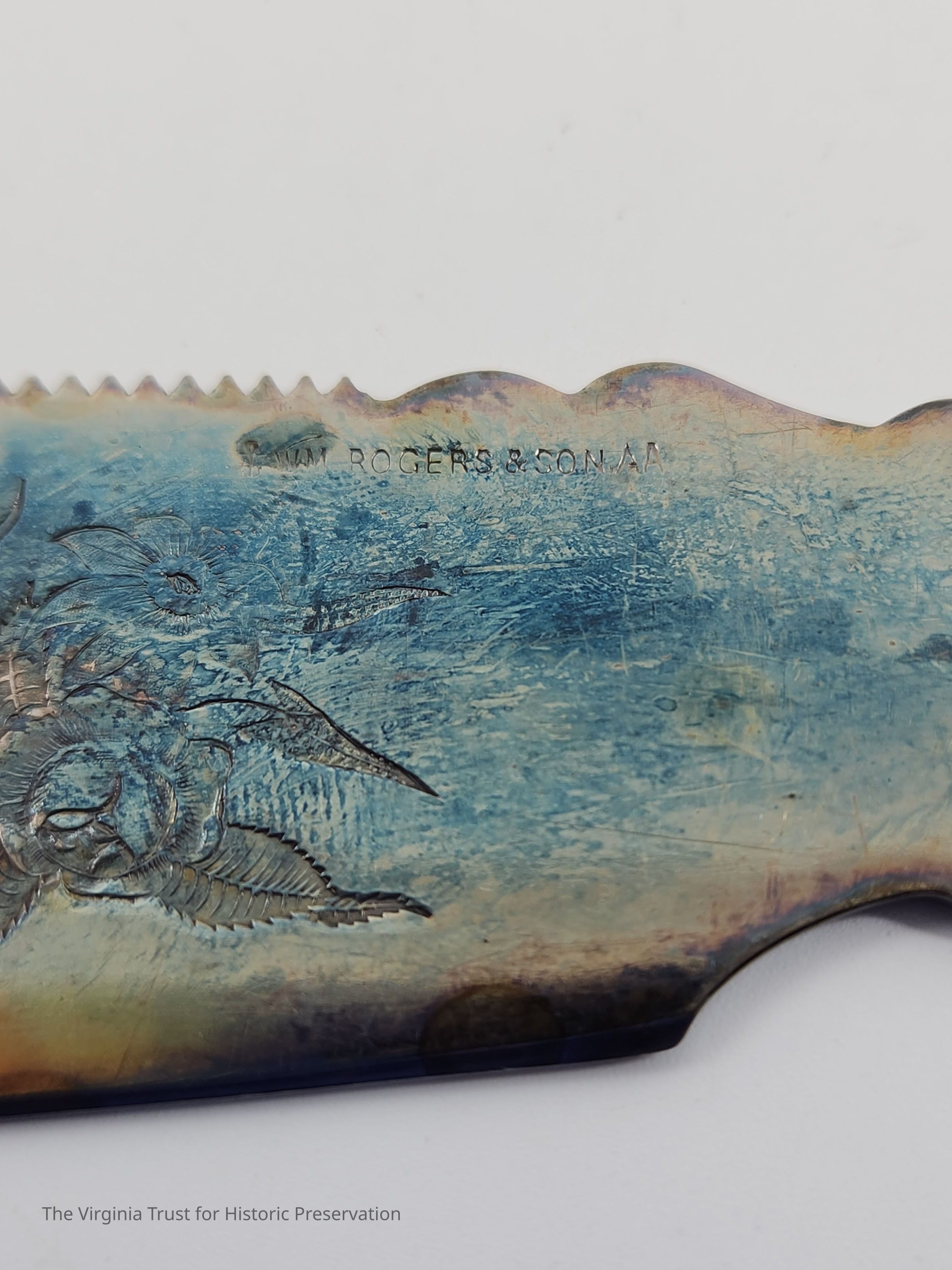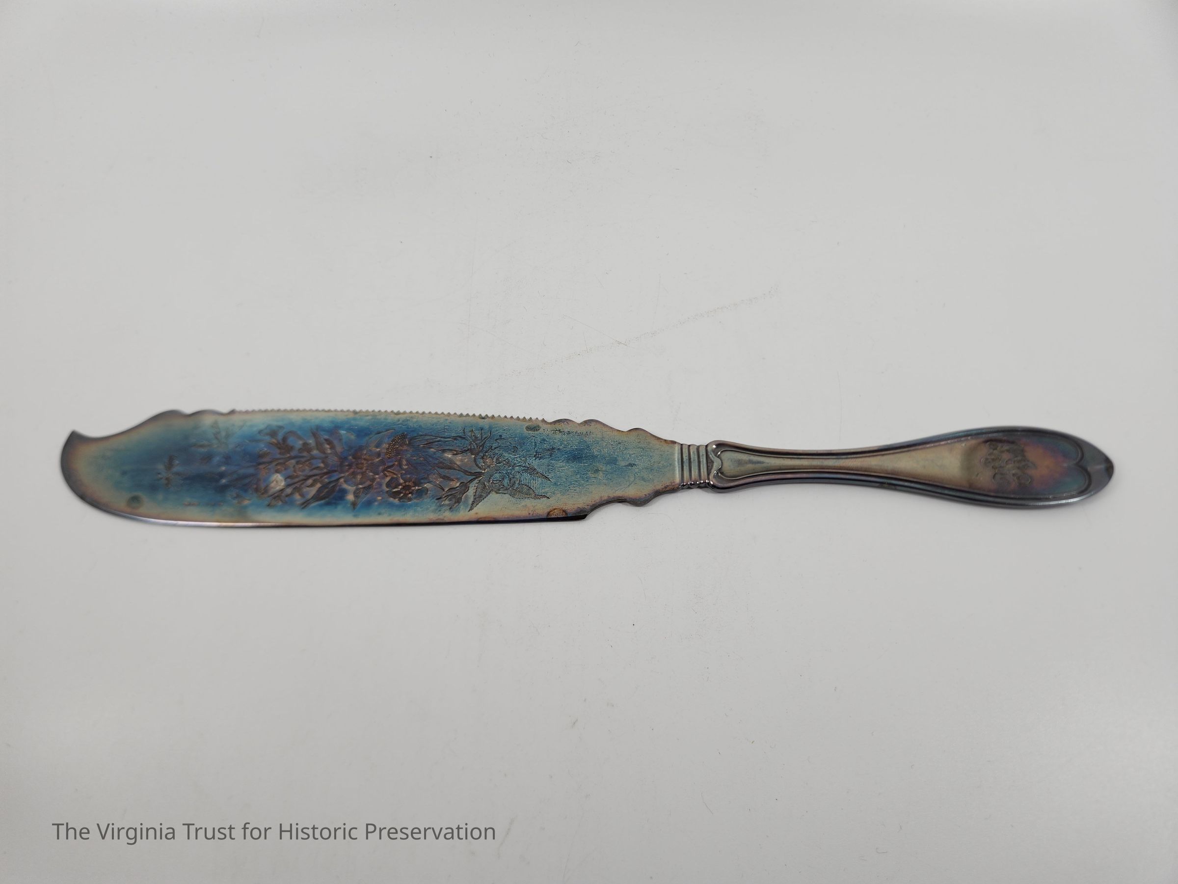Ornate dessert knife. Handle has initials etched onto it. Blade has floral motif etched into it. Likely used for very special occasions. Flower and wasp design on blade.