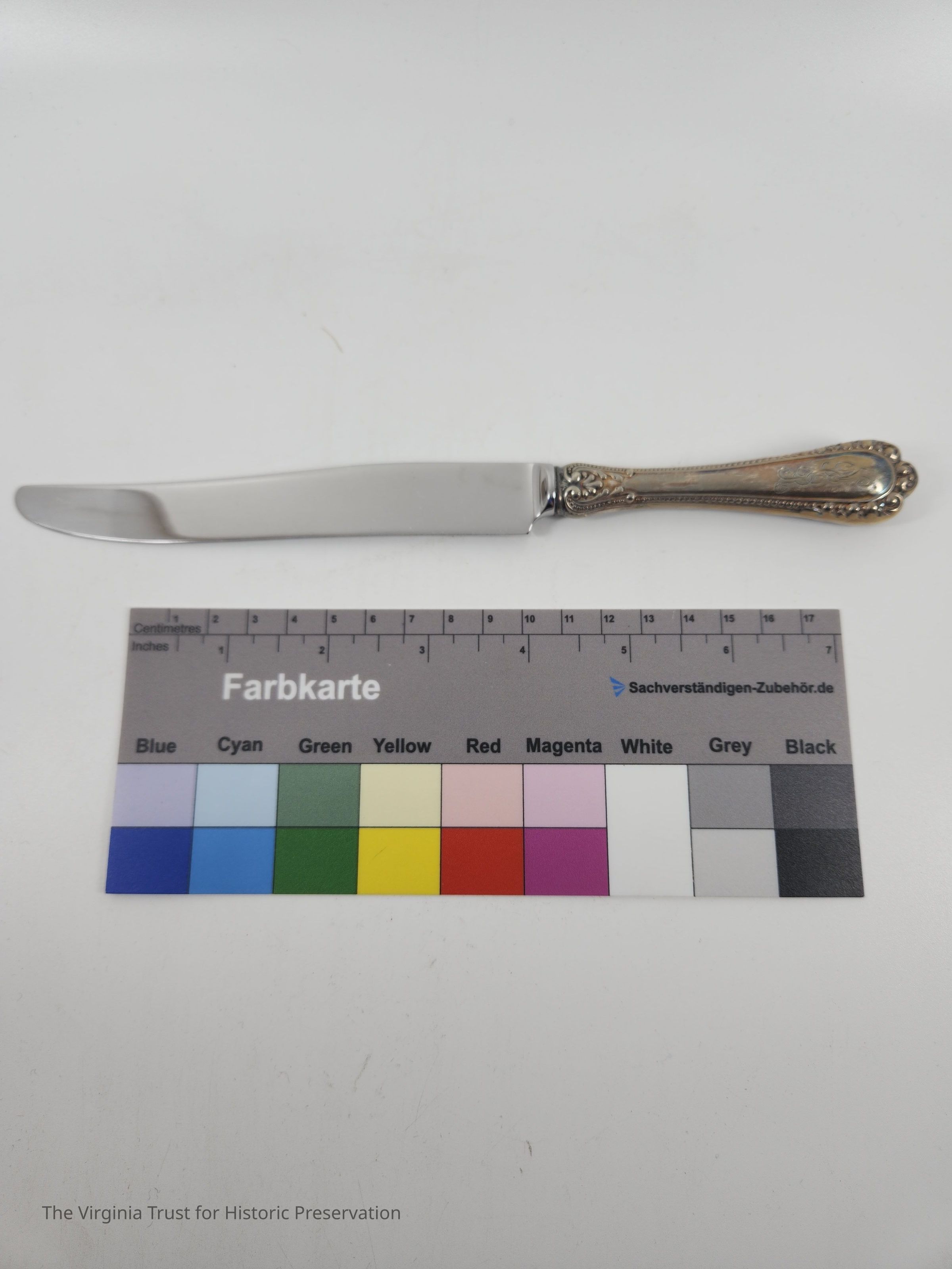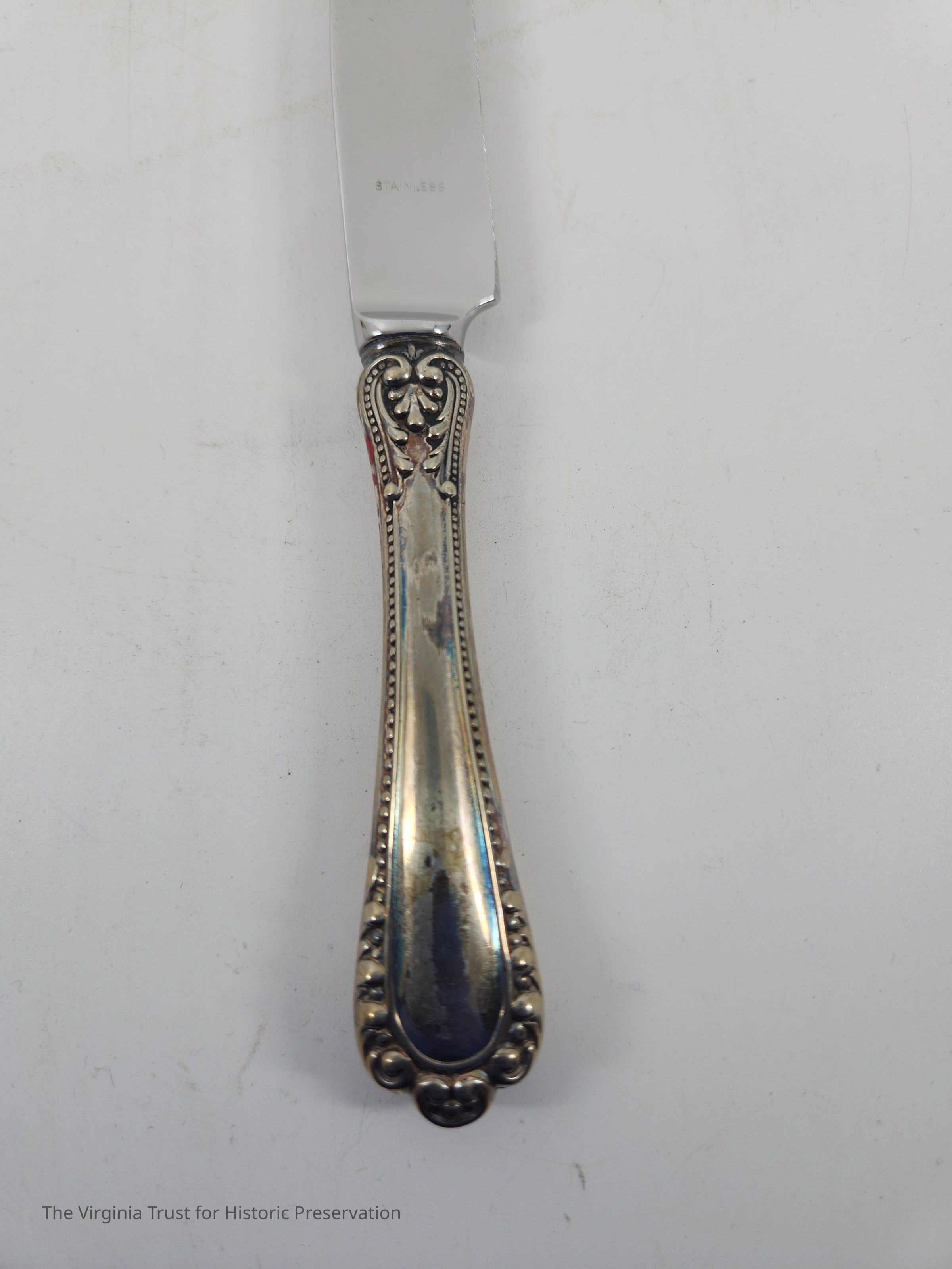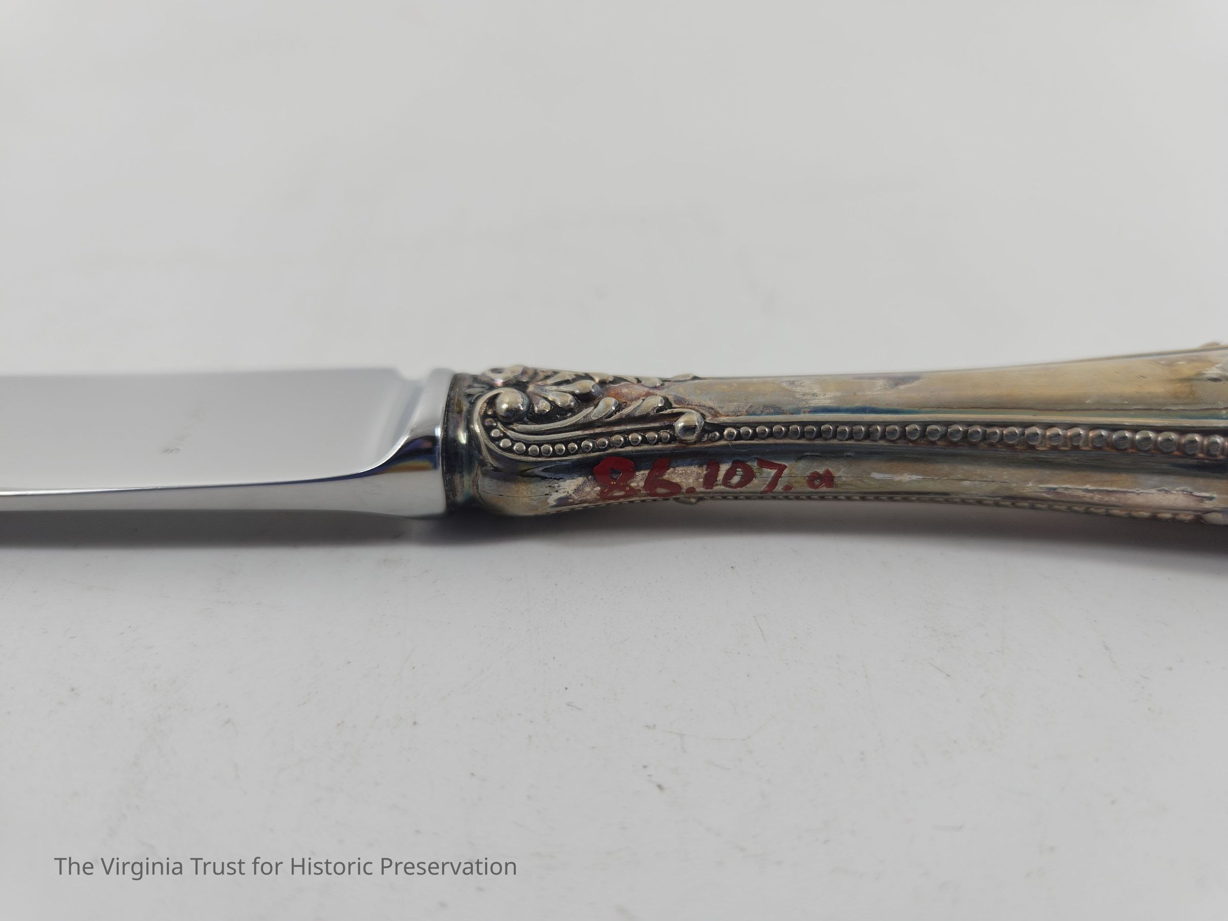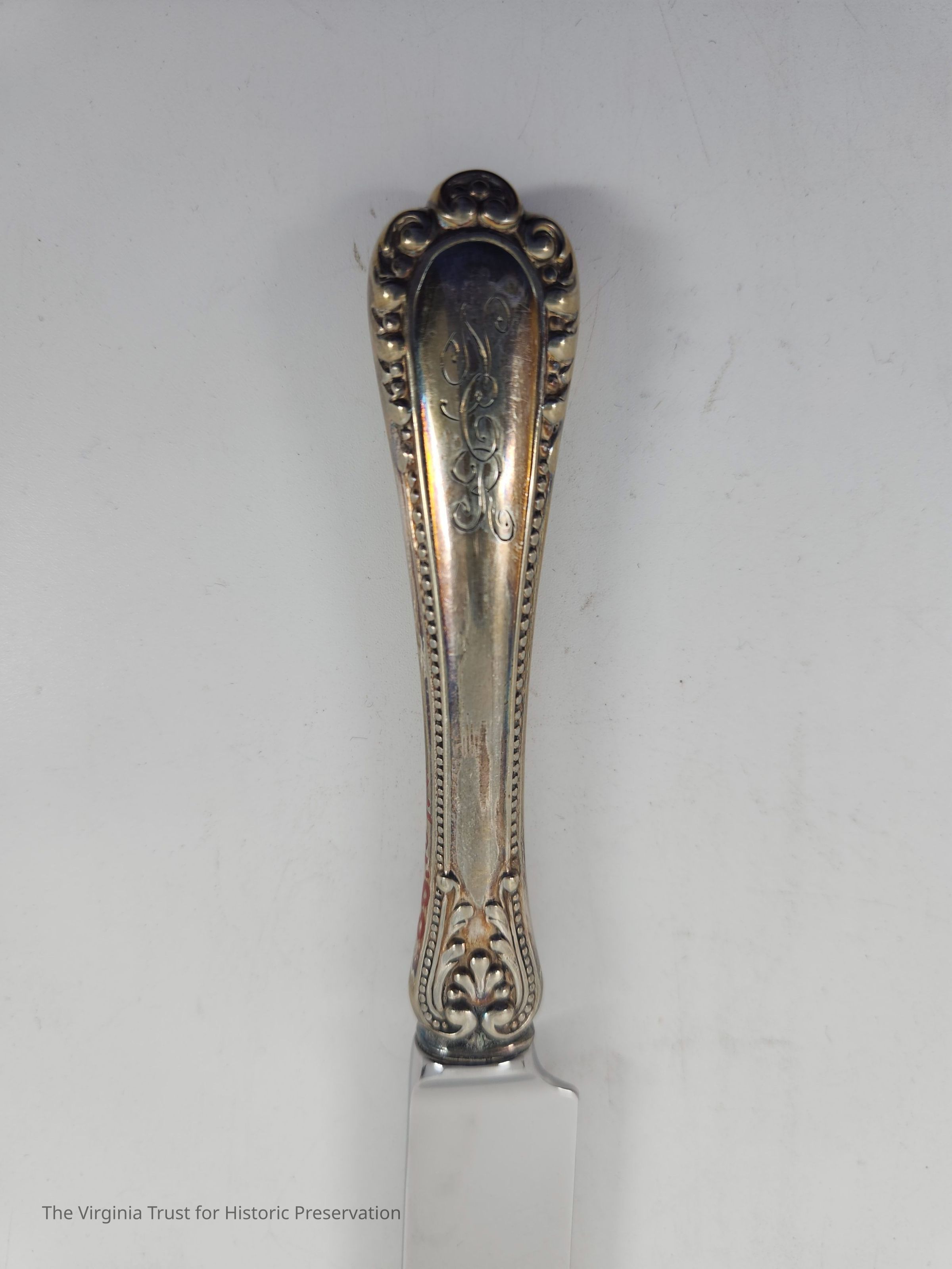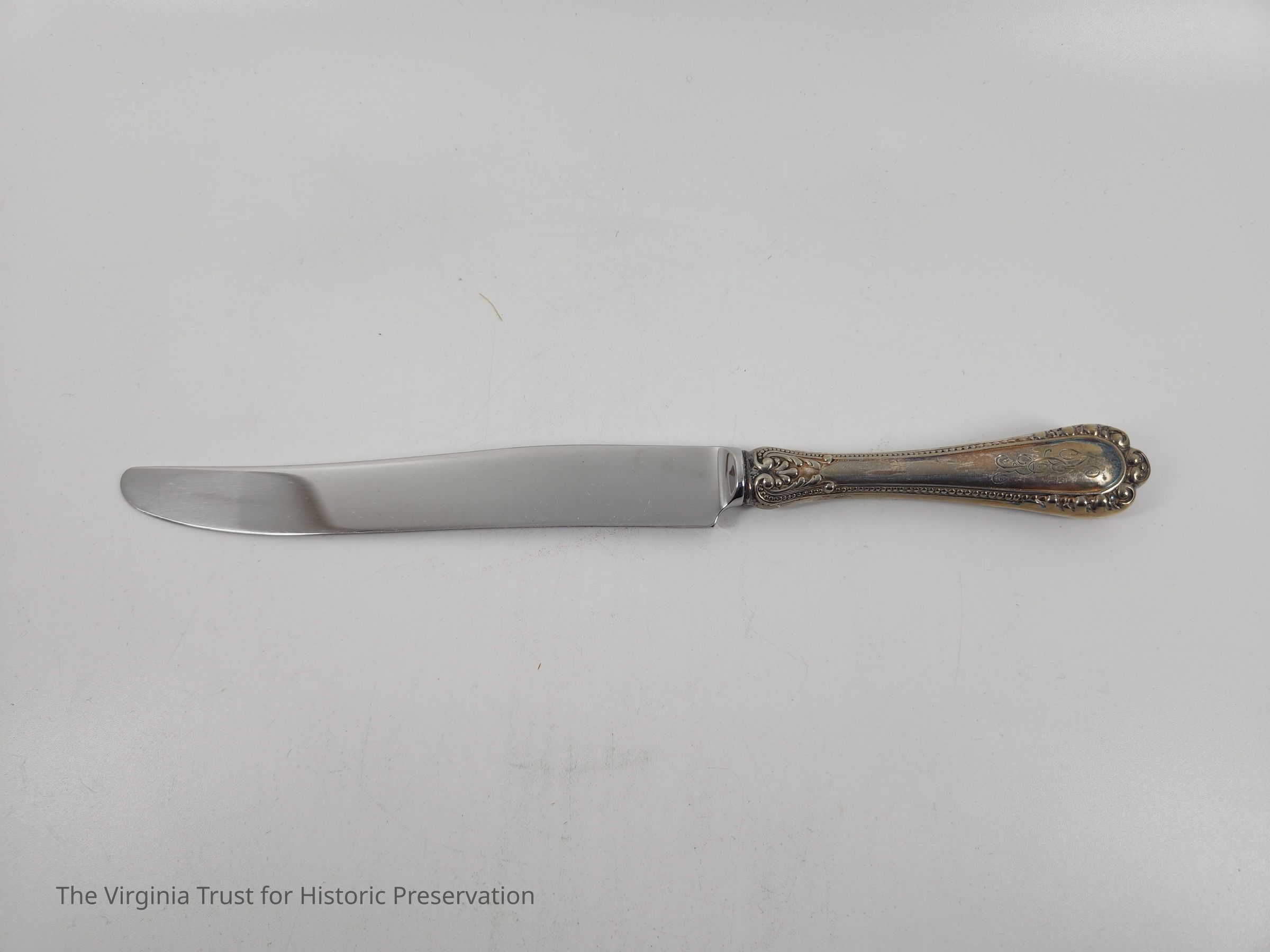 Part of a set of 12 heavy plate silver knives in the Gorham Manufacturing Company 1896 Winthrop pattern. Six knives (1986.107 A-F) monogrammed "NCR" and other six blunt blade knives monogrammed "NBC" (1986.107 G-L). Four have stainless steel blades that were put in in February of 1981 and eight have their original steel blades.