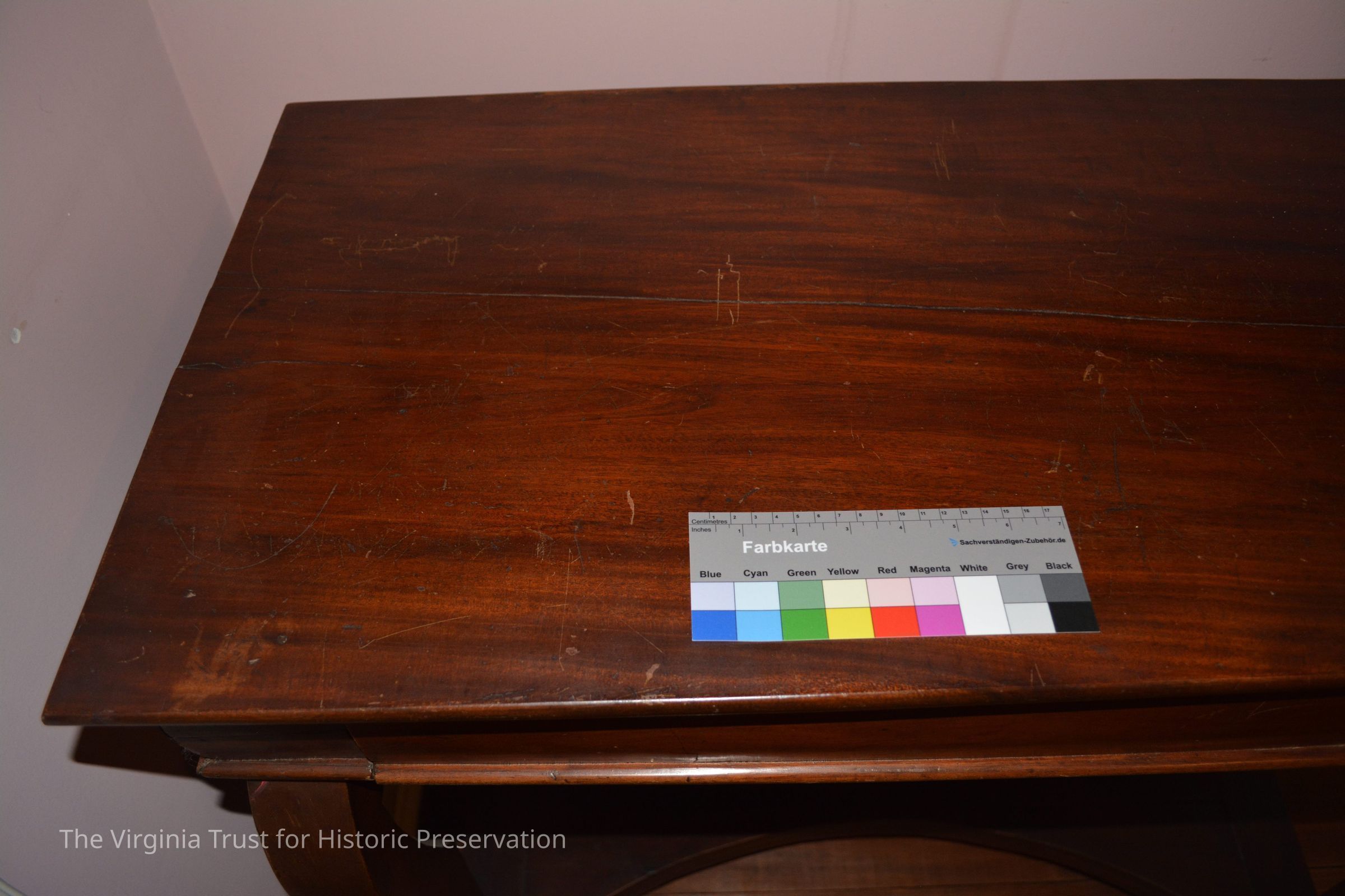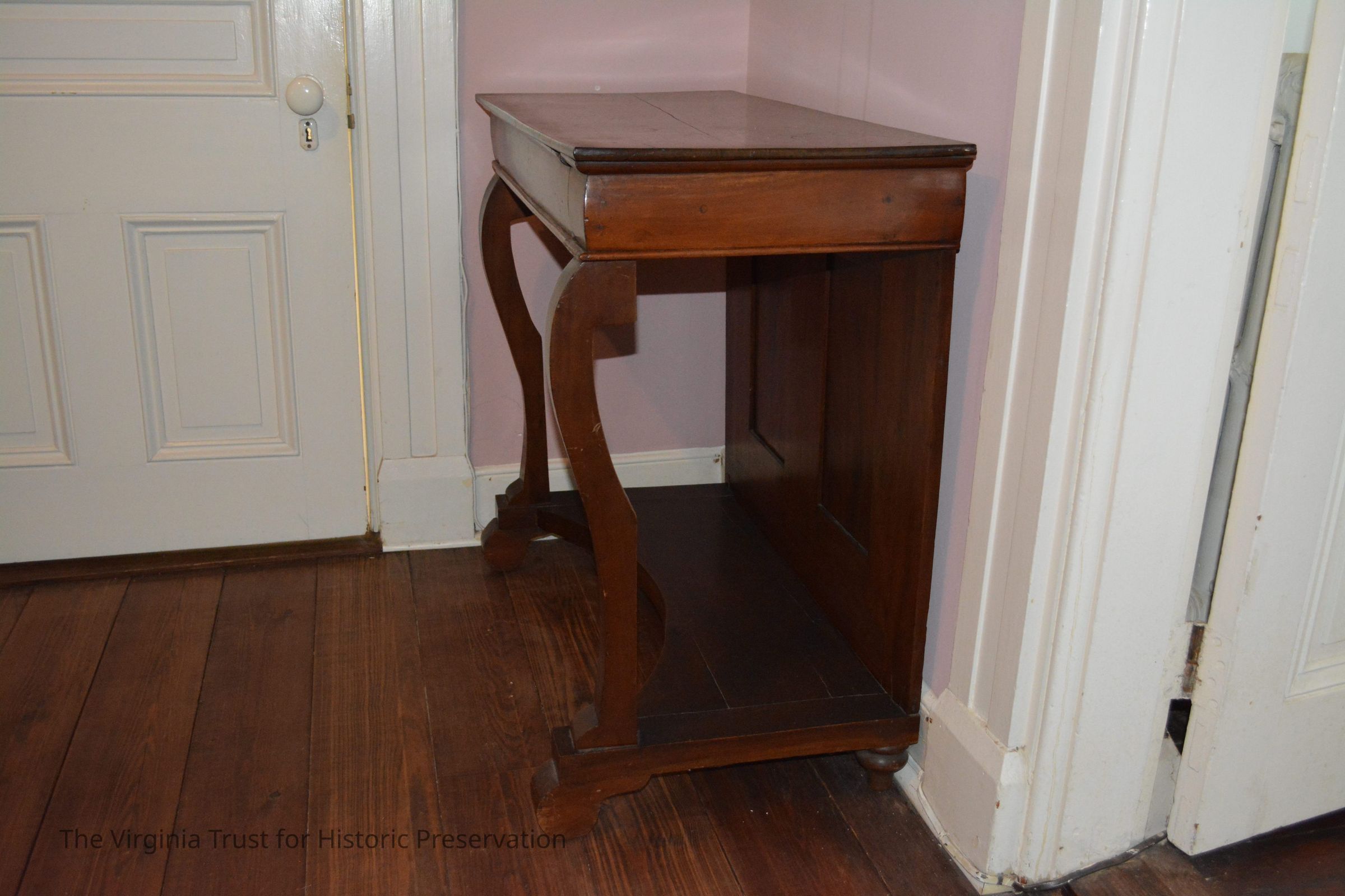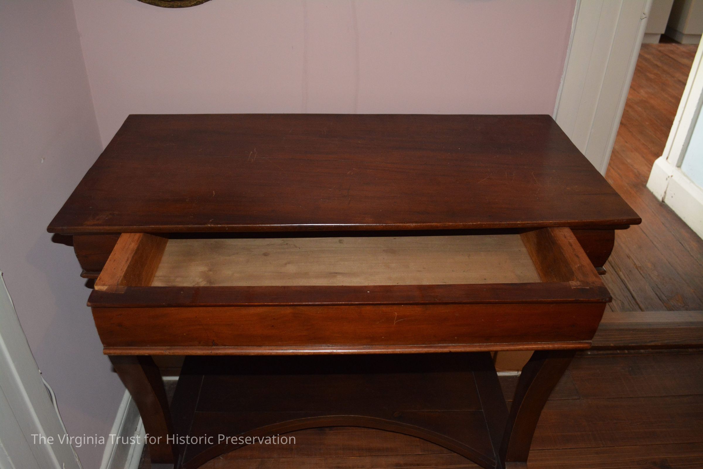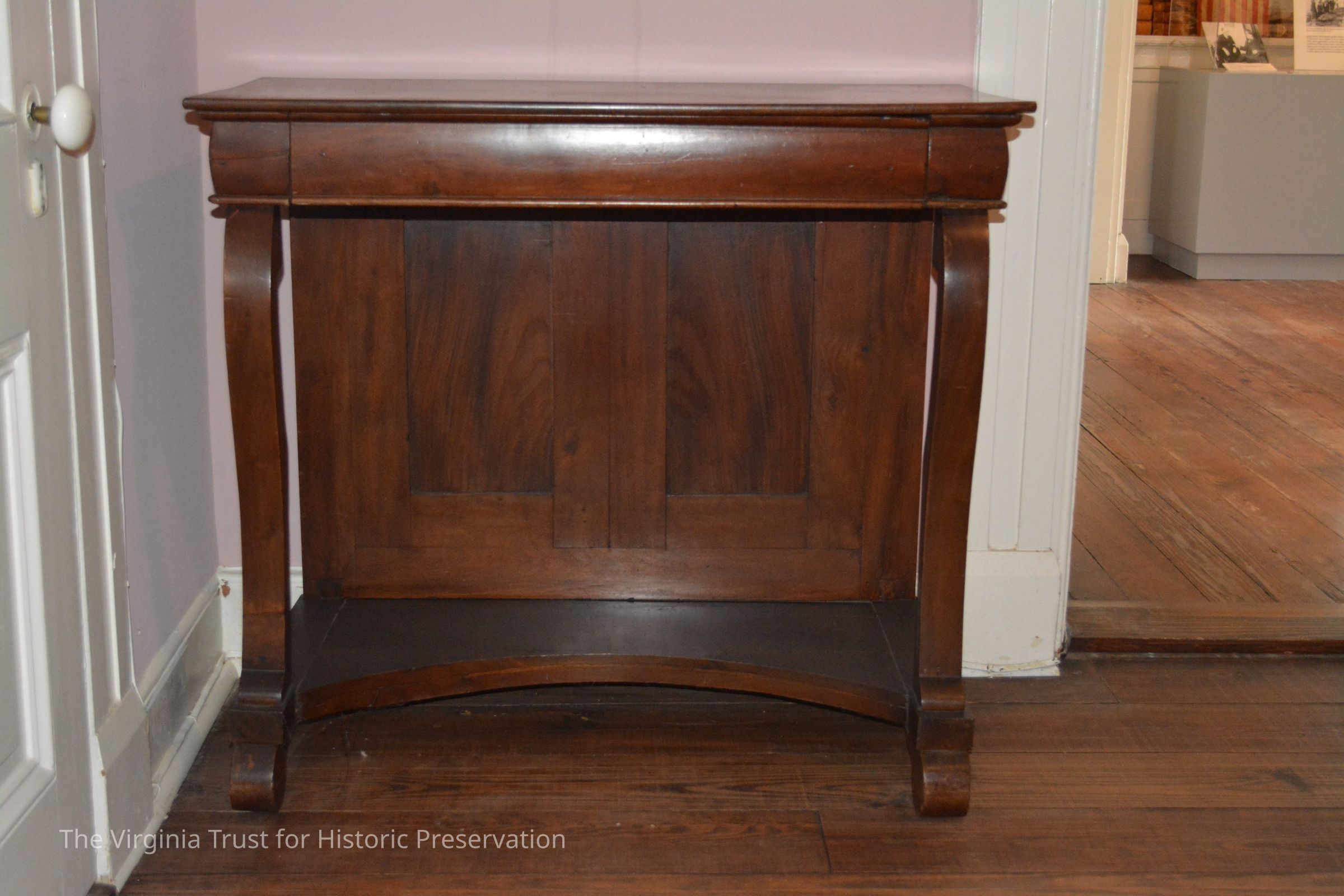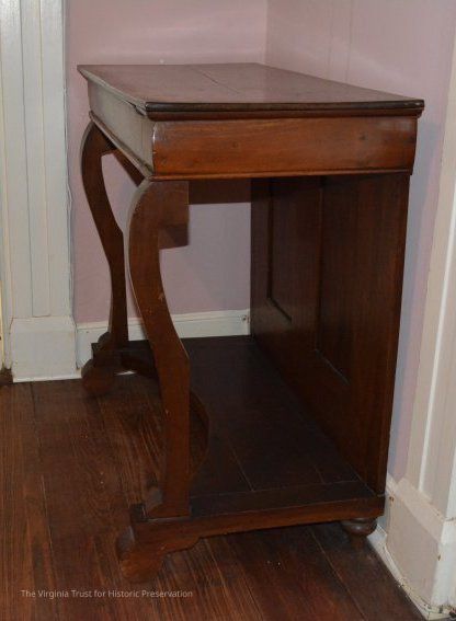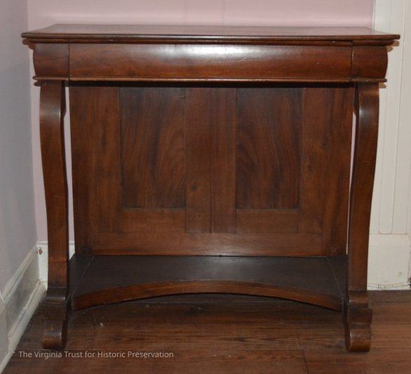 Empire style pier table of the early Federal period. No mirror. Antique American Mahogany Pier Table. Oblong top with ogee-molded frieze; supported by two reverse S-curve brackets. Solid panel back (no mirror); scrolling feet. Marble top possibly replaced with mahogany.Dimensions