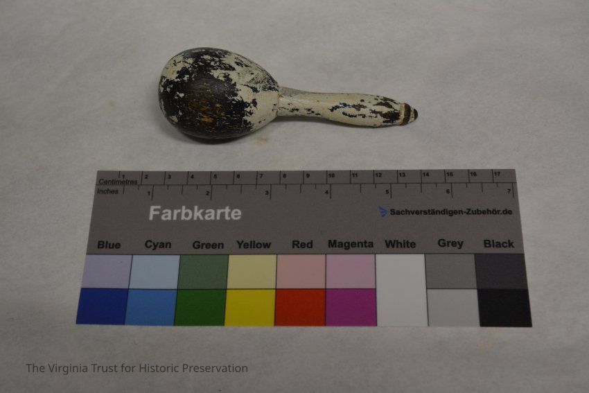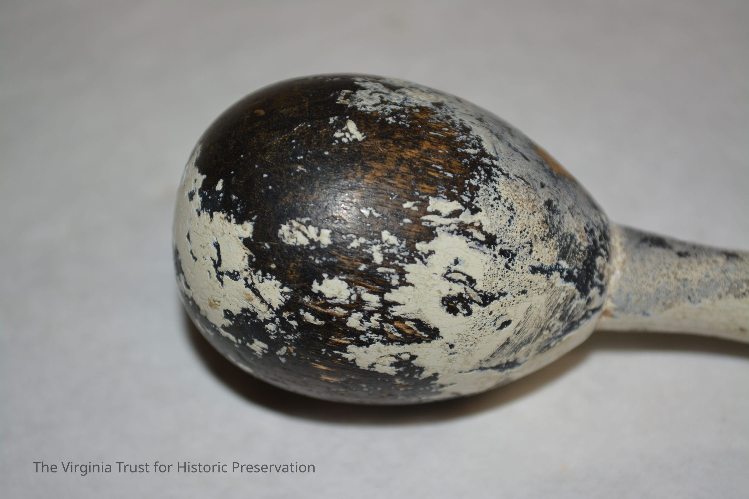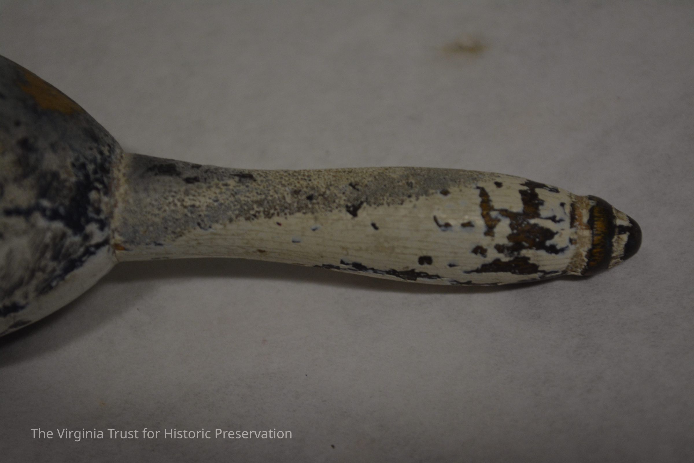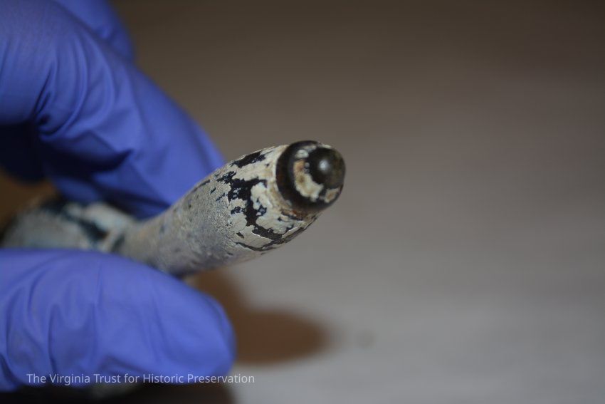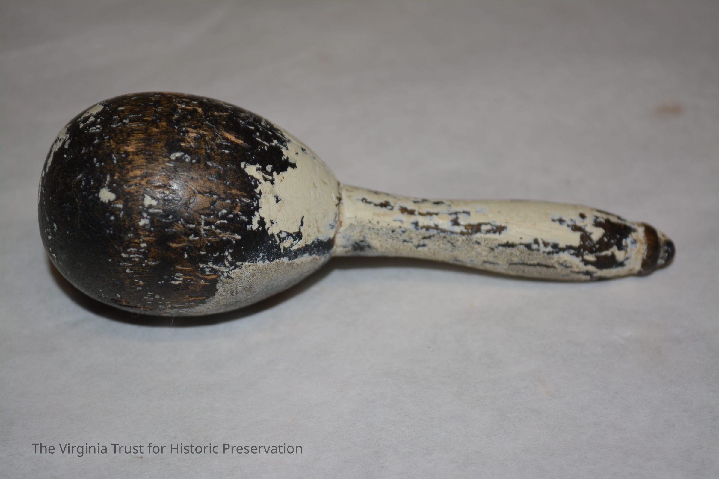 Black and white darning bodkin. Object is located in a round basket (1987.14) with other sewing supplies.
