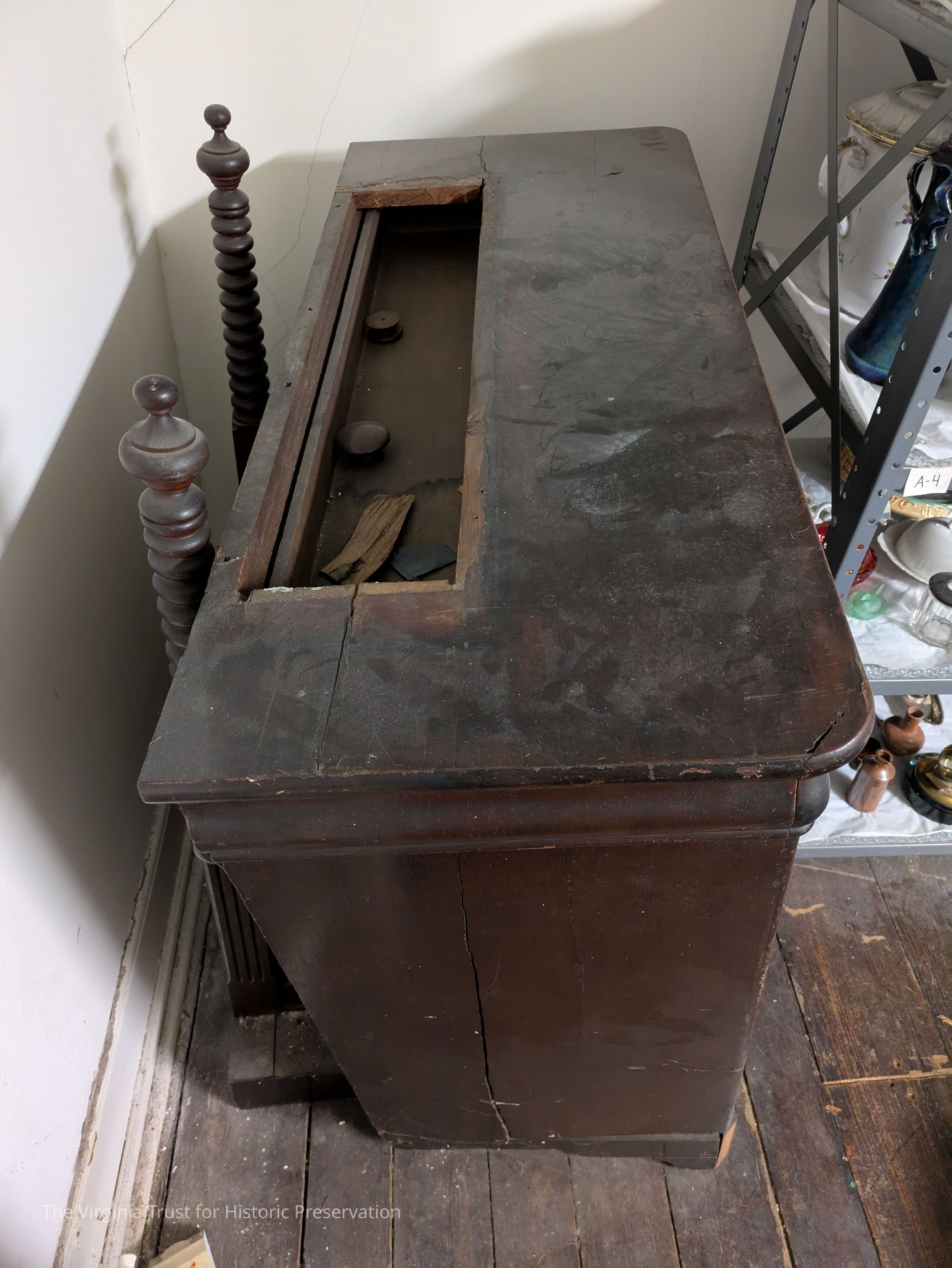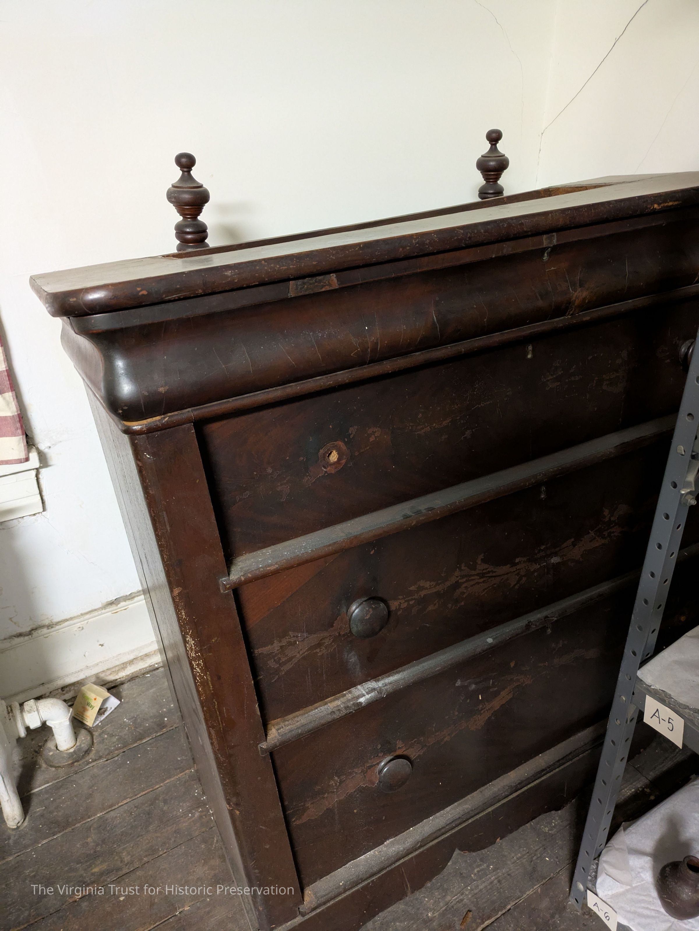 Empire dresser. Three large drawers with wood knobs, plain top drawer. Separate top mirror on spiral turned posts with two small drawers. Top later added by family.Dimensions