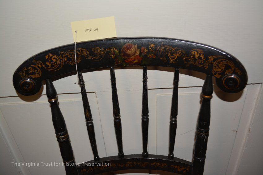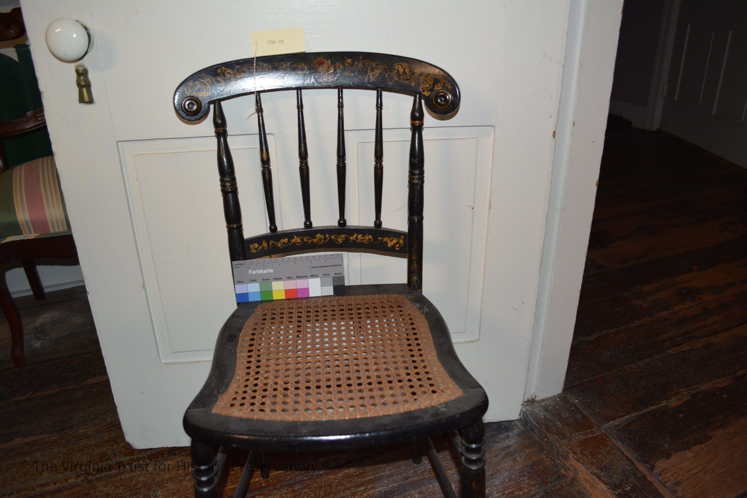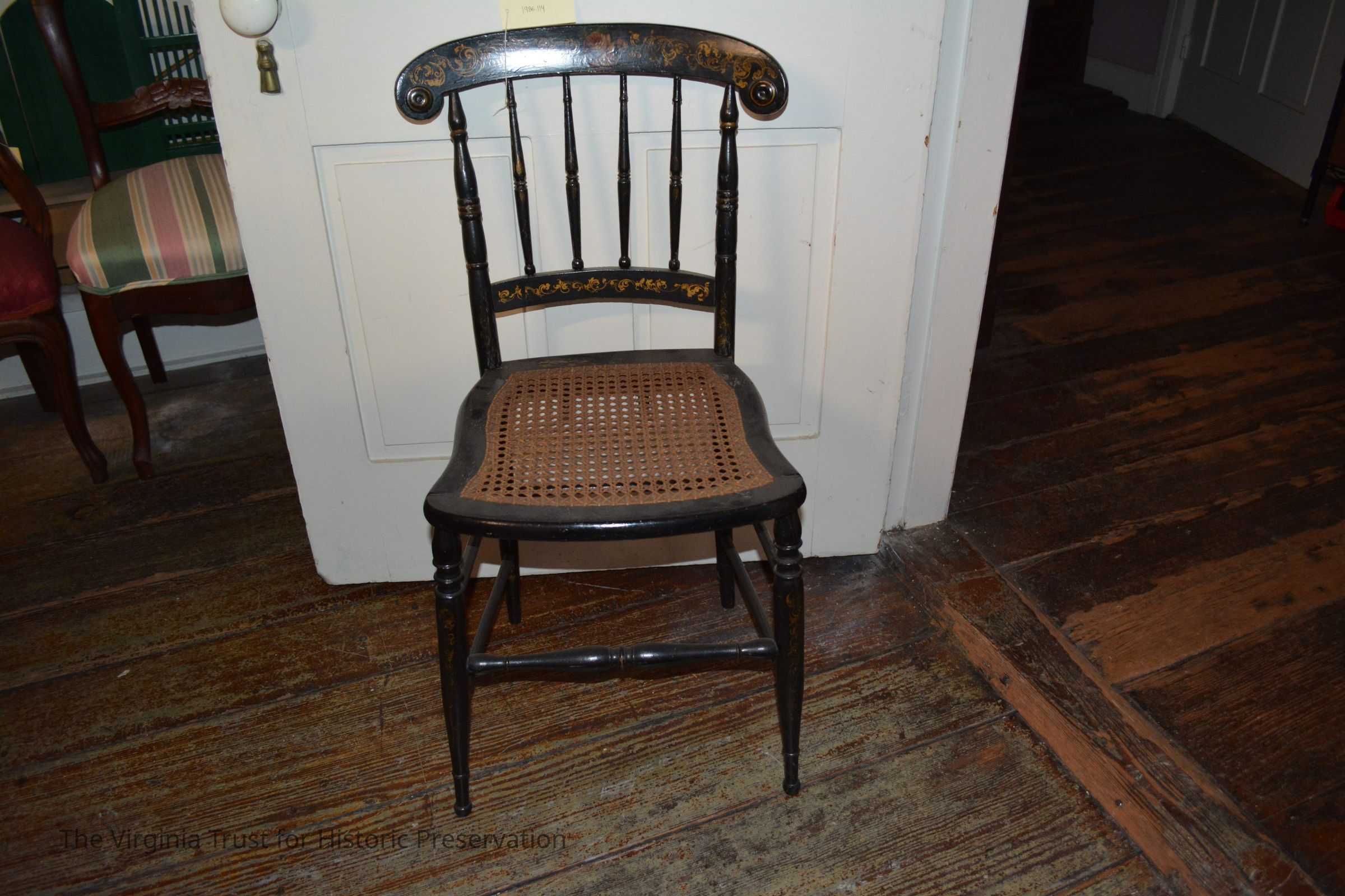 Late 19th century painted and stenciled Hitchkock- style side chair. Black with colored floral design on crest and gold painted scrollwork. Cane seat bottom, four spindle back. One of a set of three (two side chairs and a rocker).