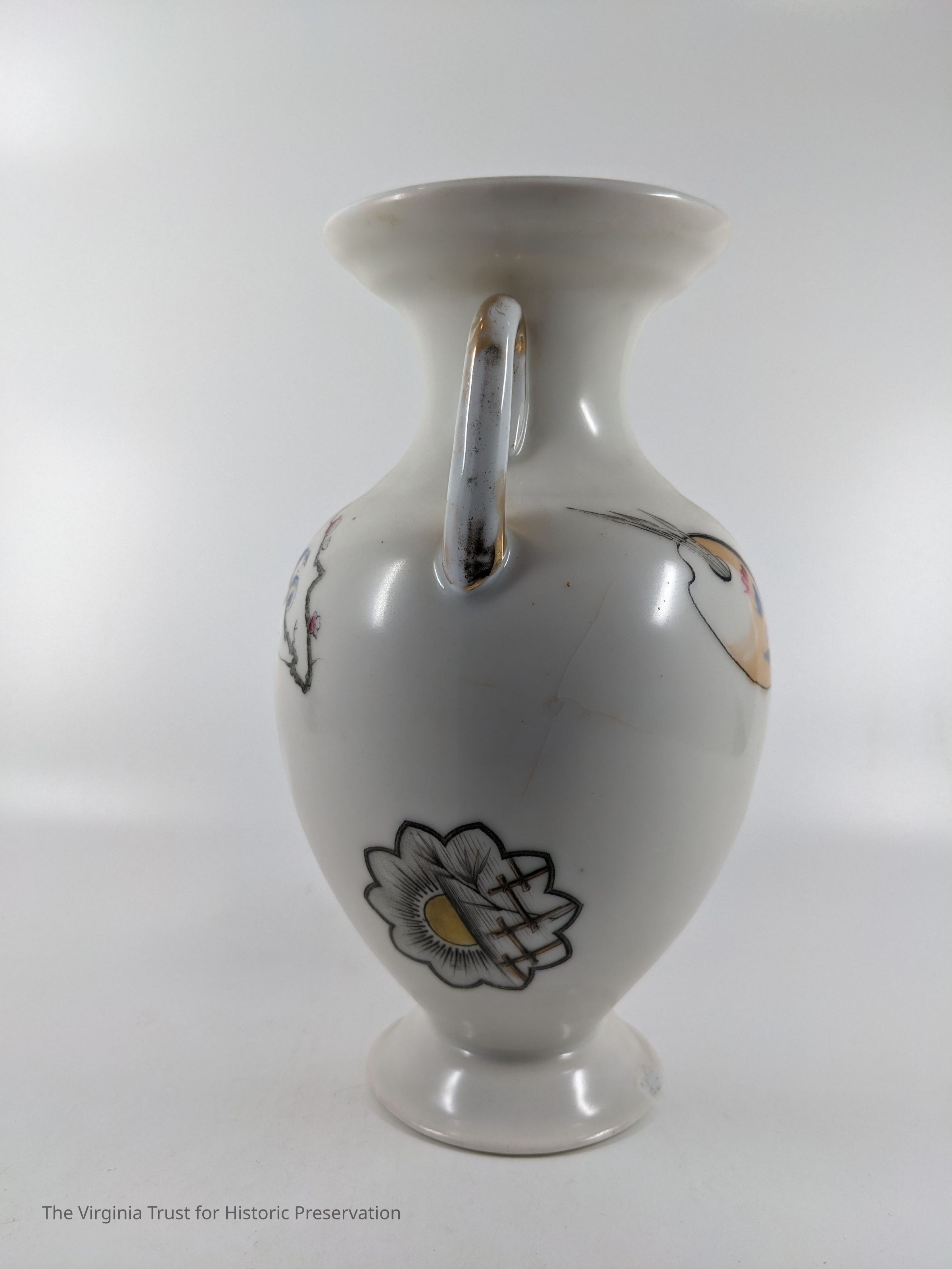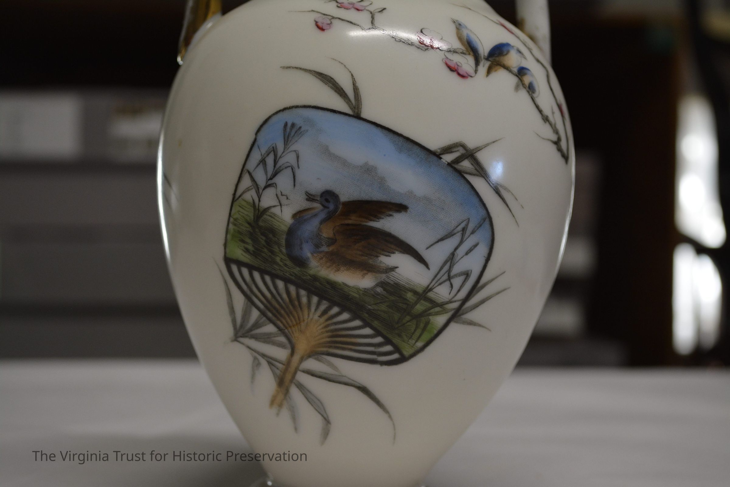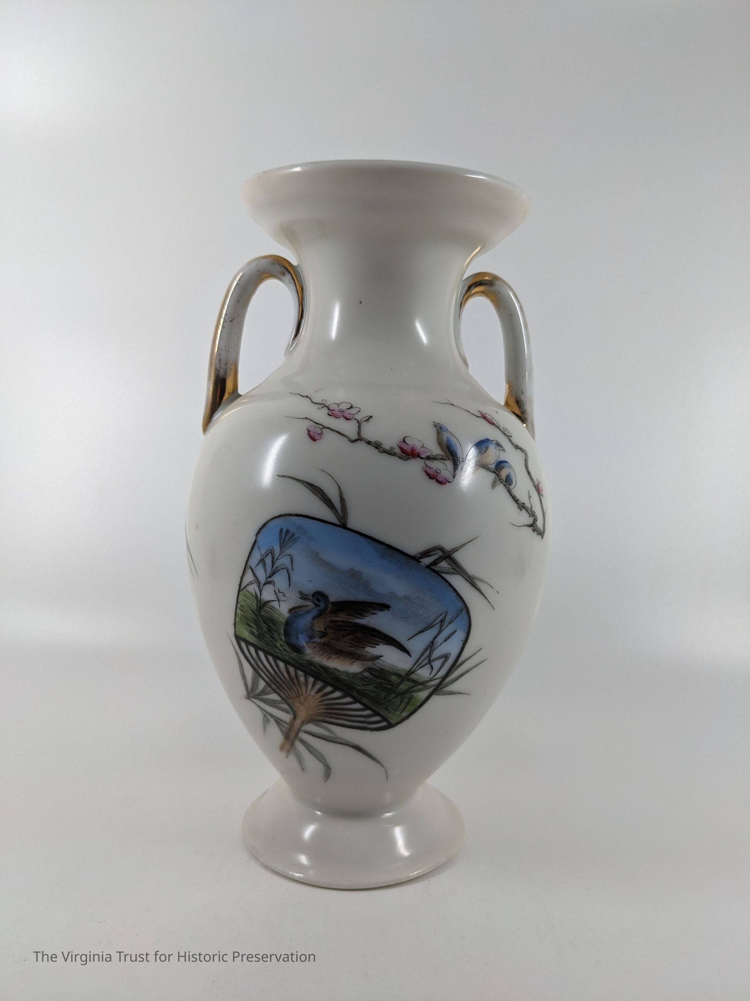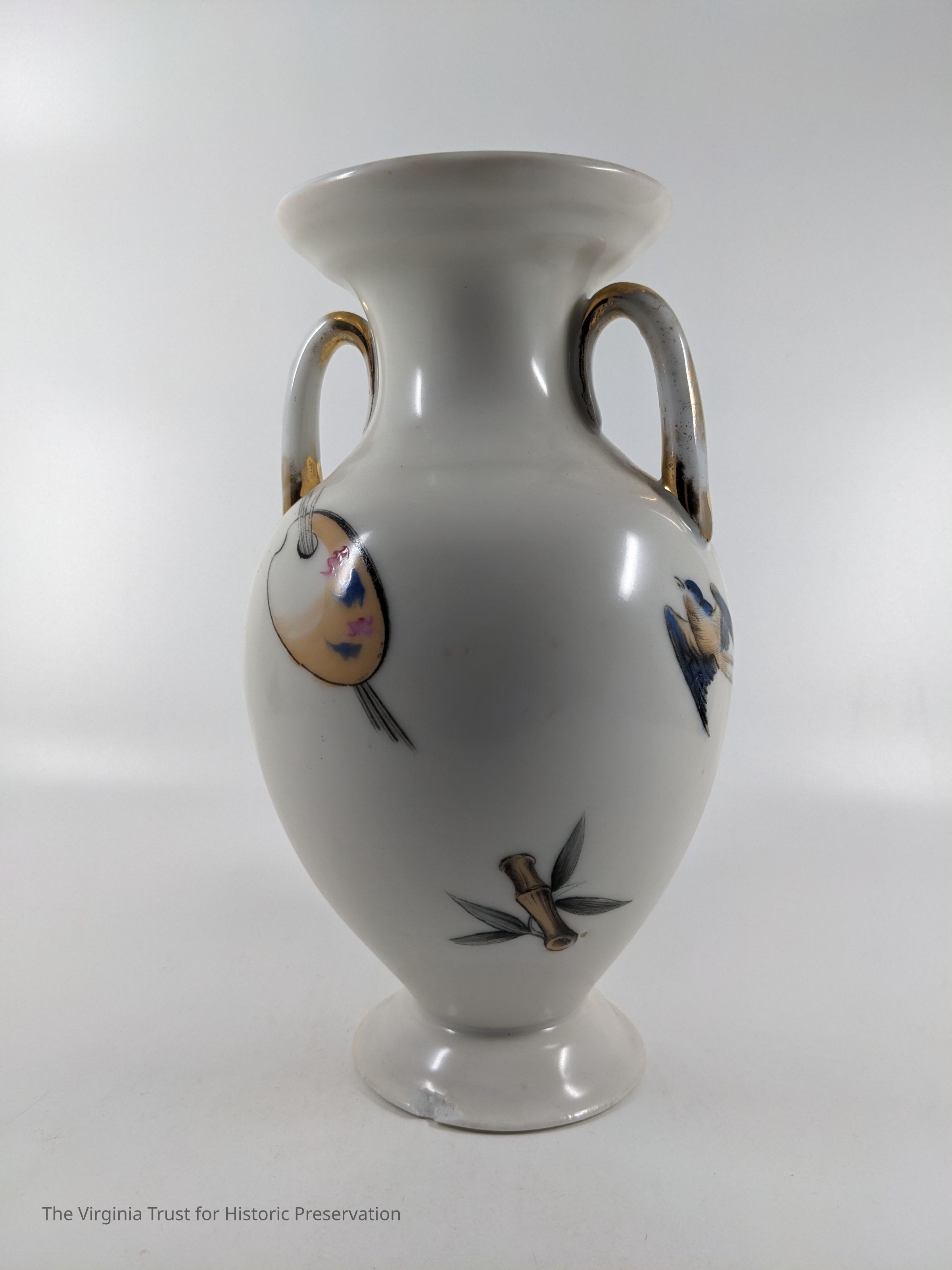 One of a pair of vases. White china with an oriental design. Multiple designs on this vase that include a hand fan with a duck illustrated in it, paint palette, bluebirds perched on a branch with pink flowers, white flower, and a piece of bamboo. Black ink mark on bottom- maybe an "H".
