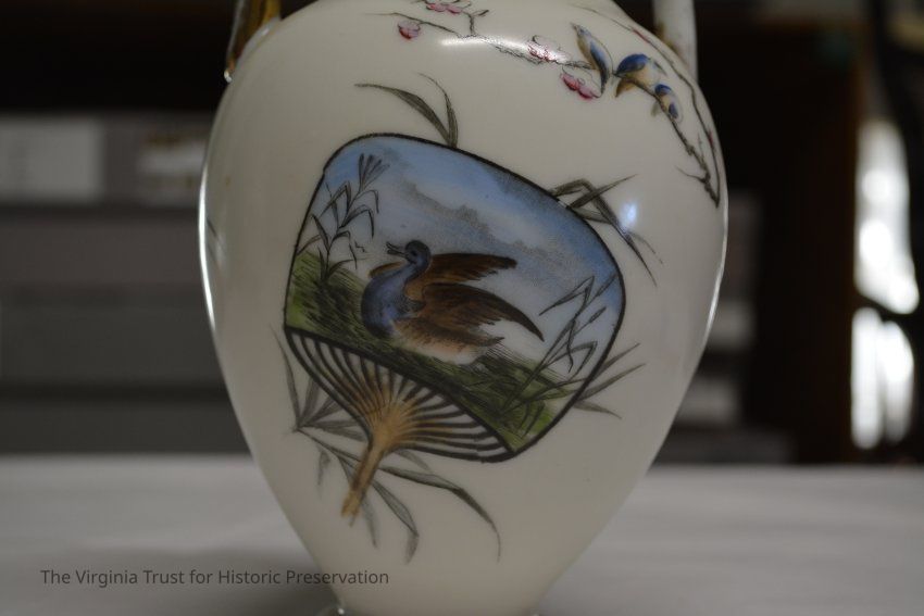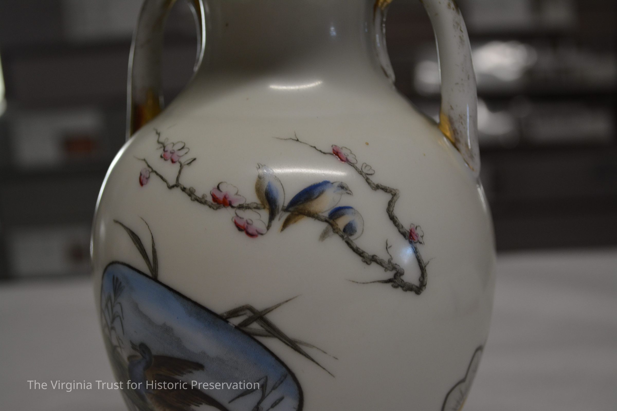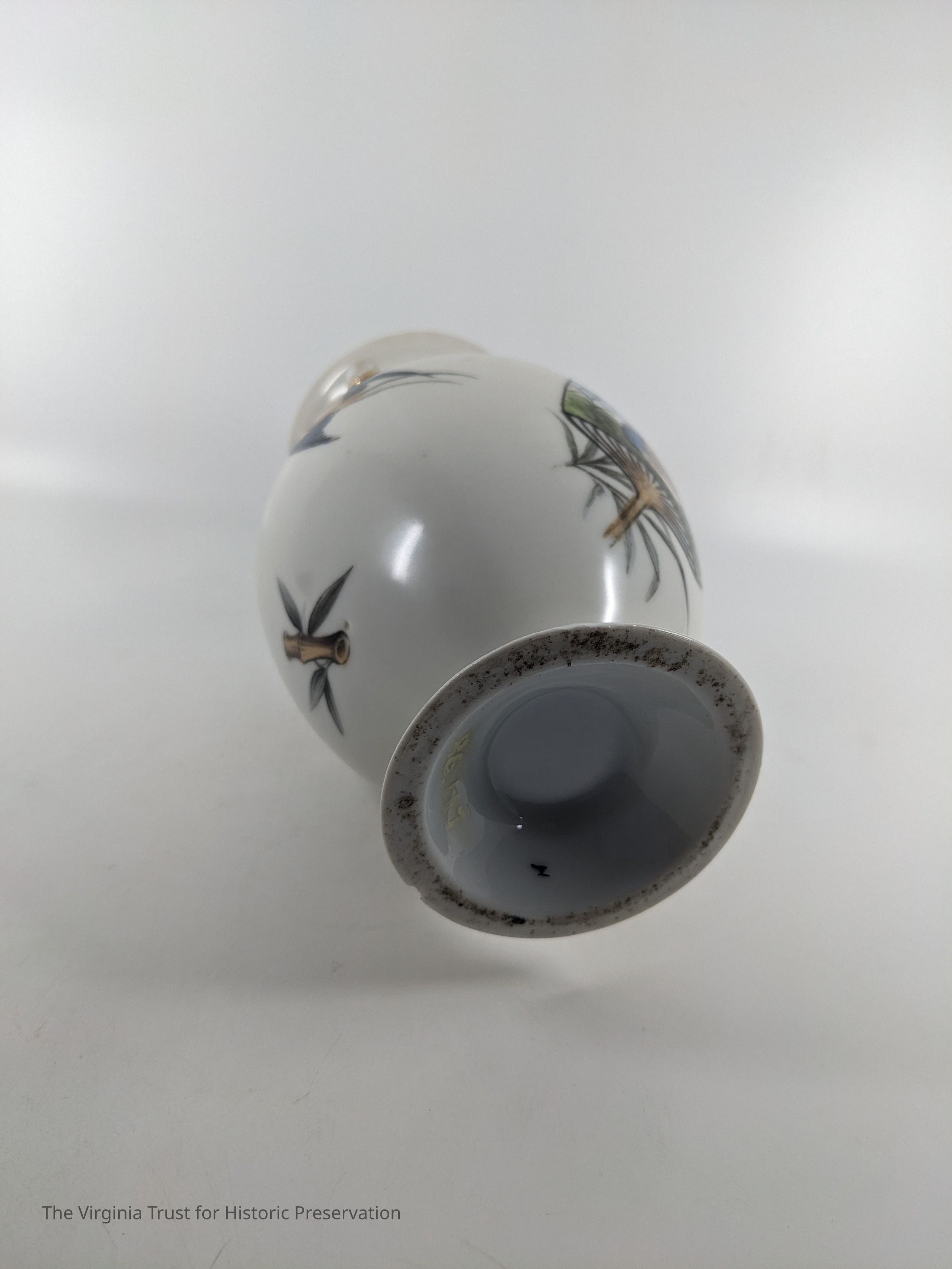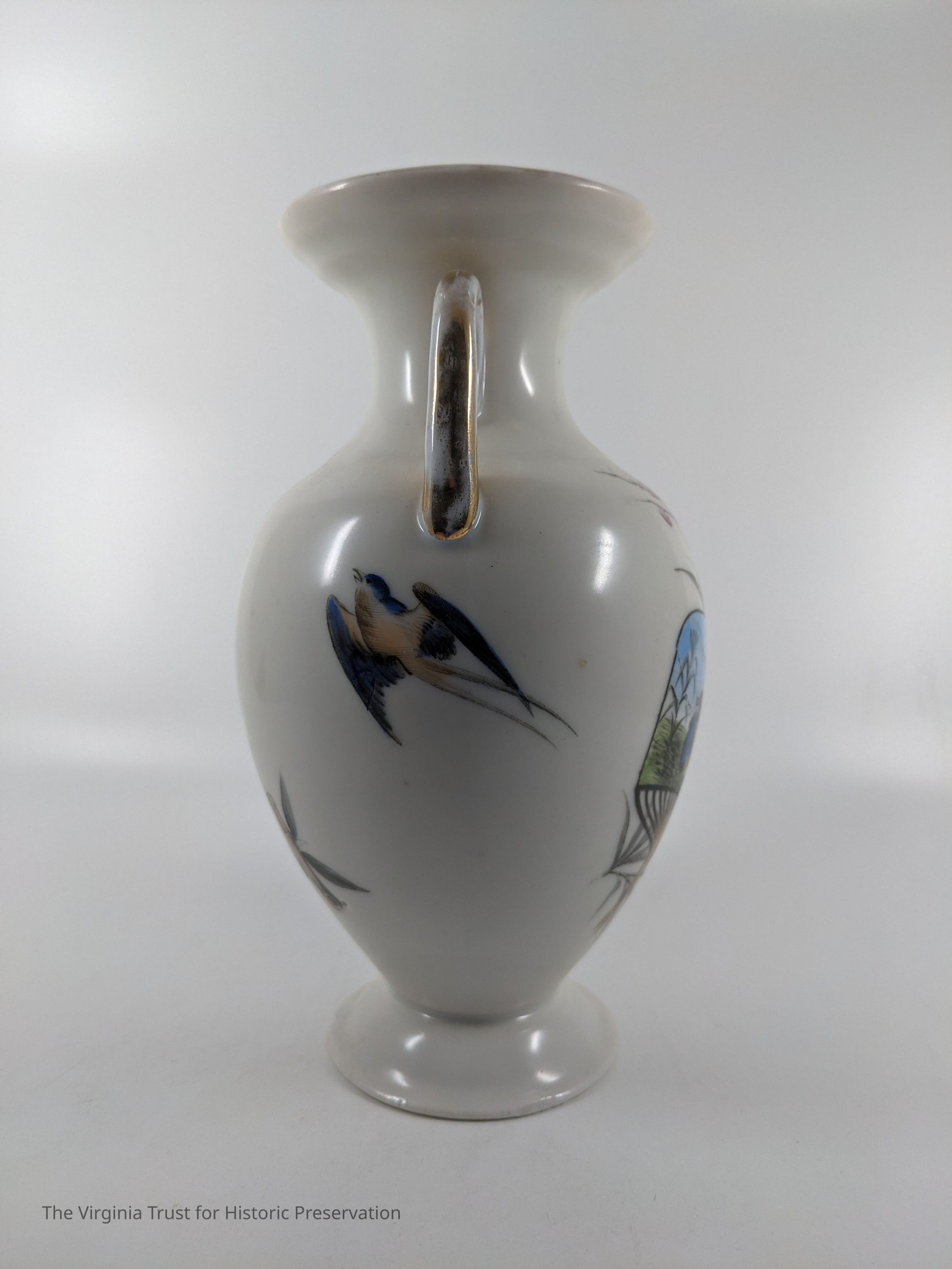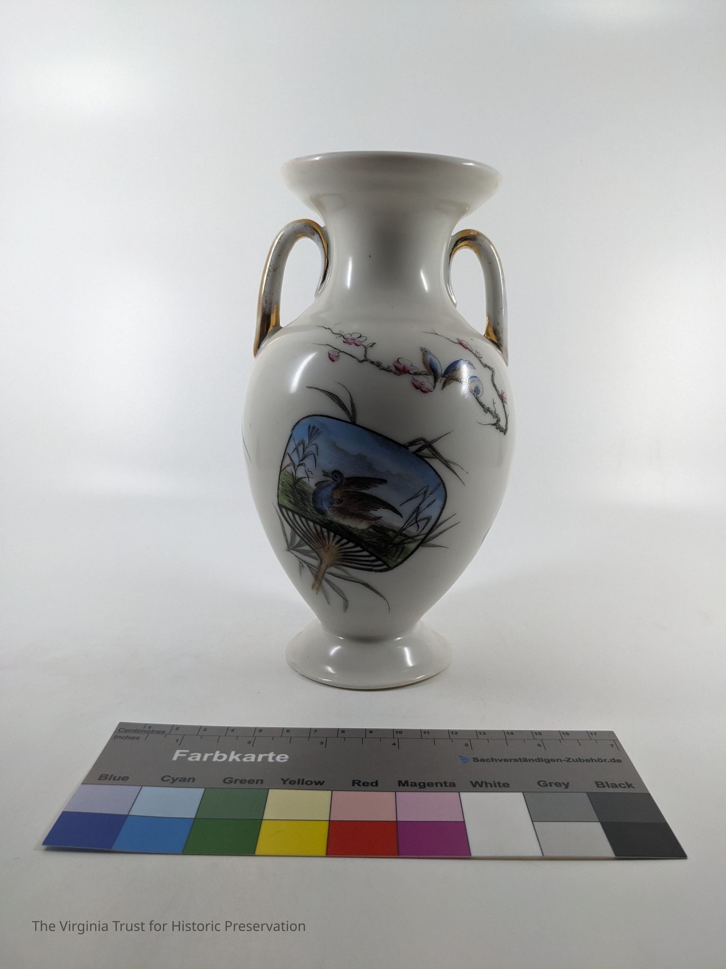One of a pair of vases. White china with an oriental design. Multiple designs on this vase that include a hand fan with a duck illustrated in it, paint palette, bluebirds perched on a branch with pink flowers, white flower, and a piece of bamboo. Black ink mark on bottom- maybe an "H".