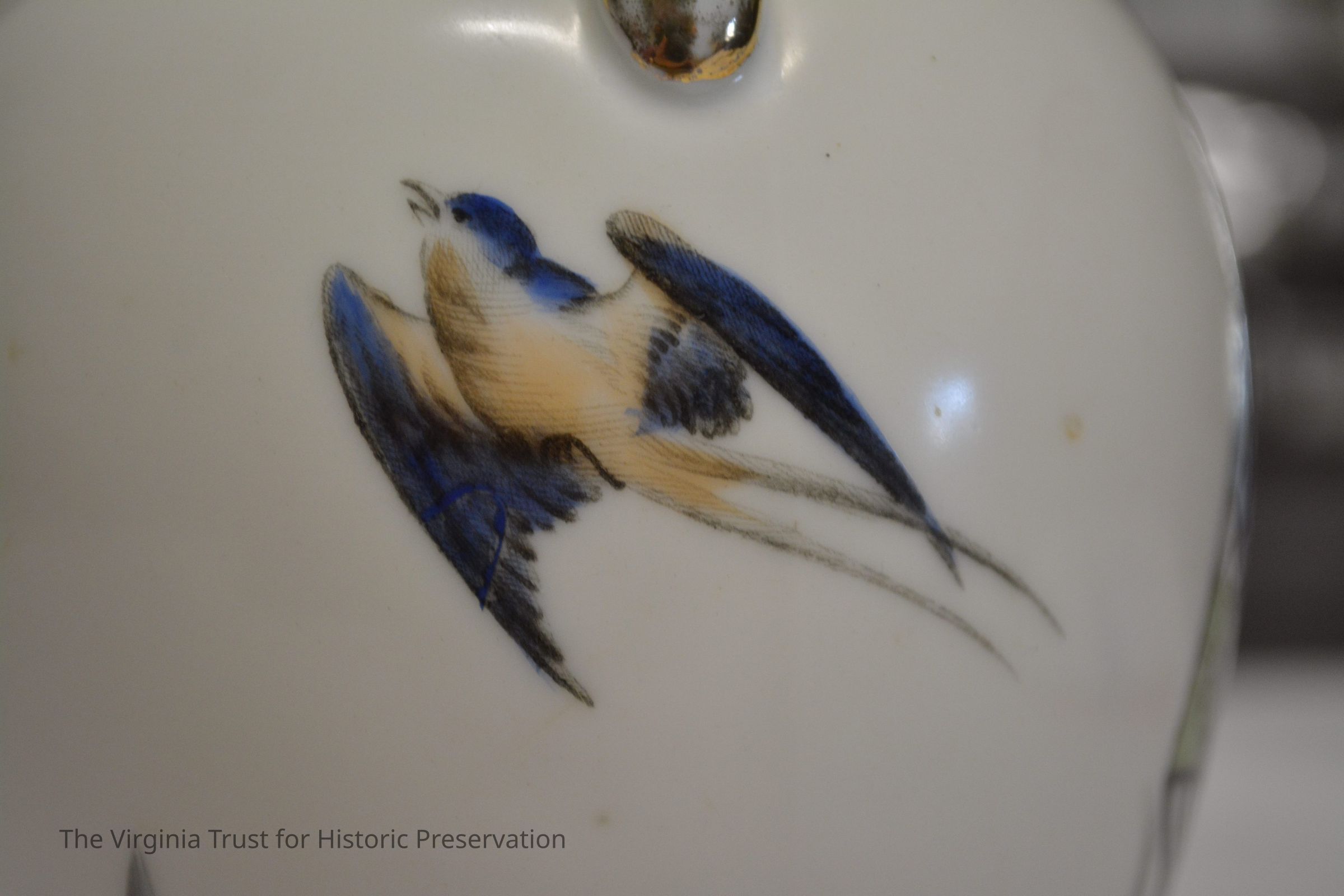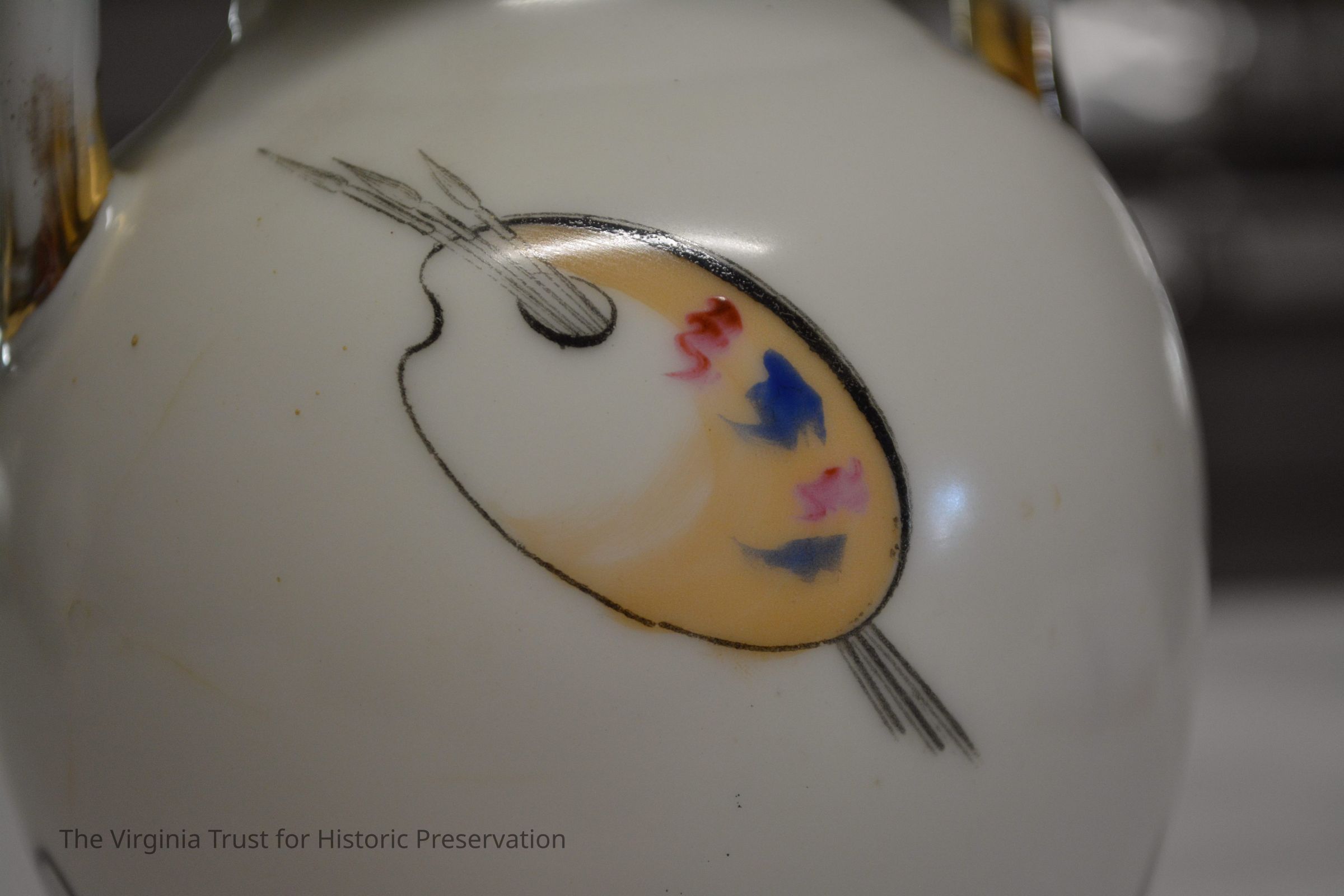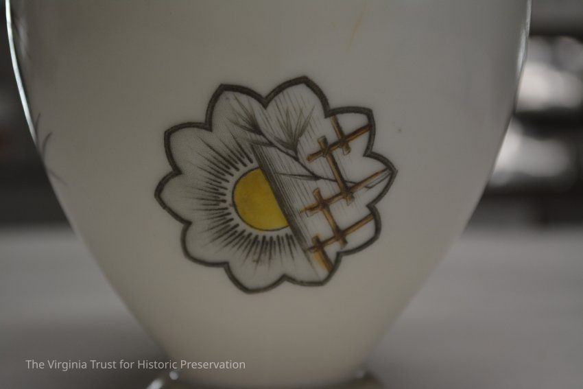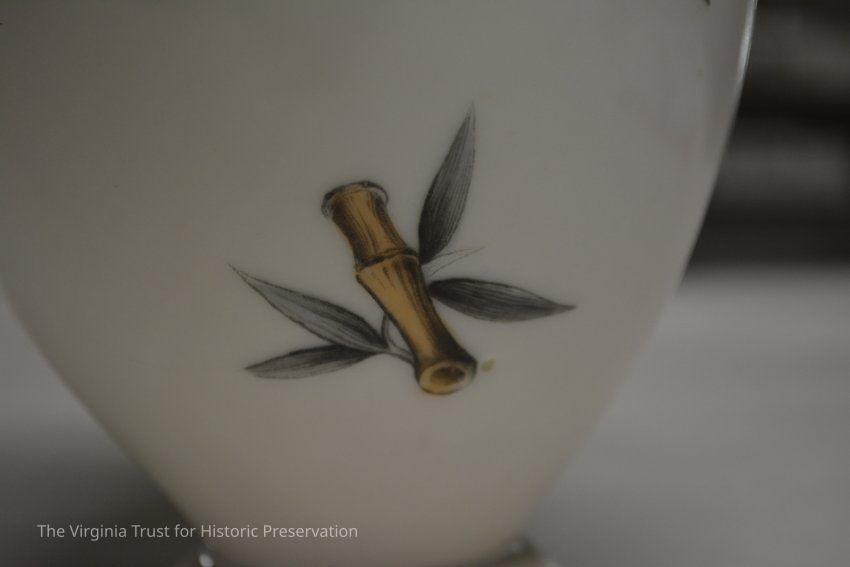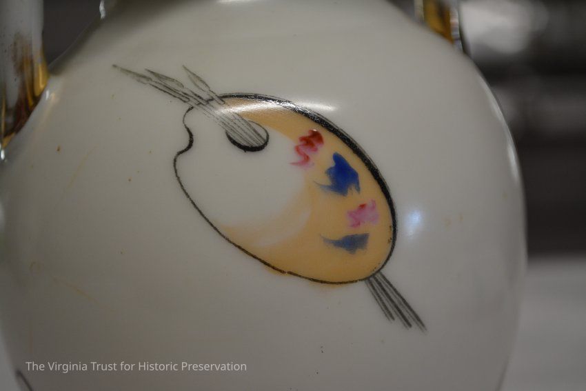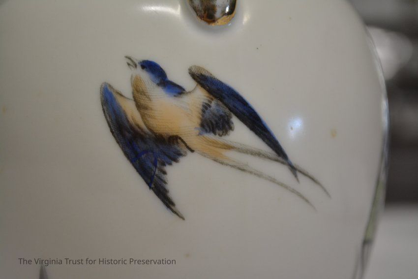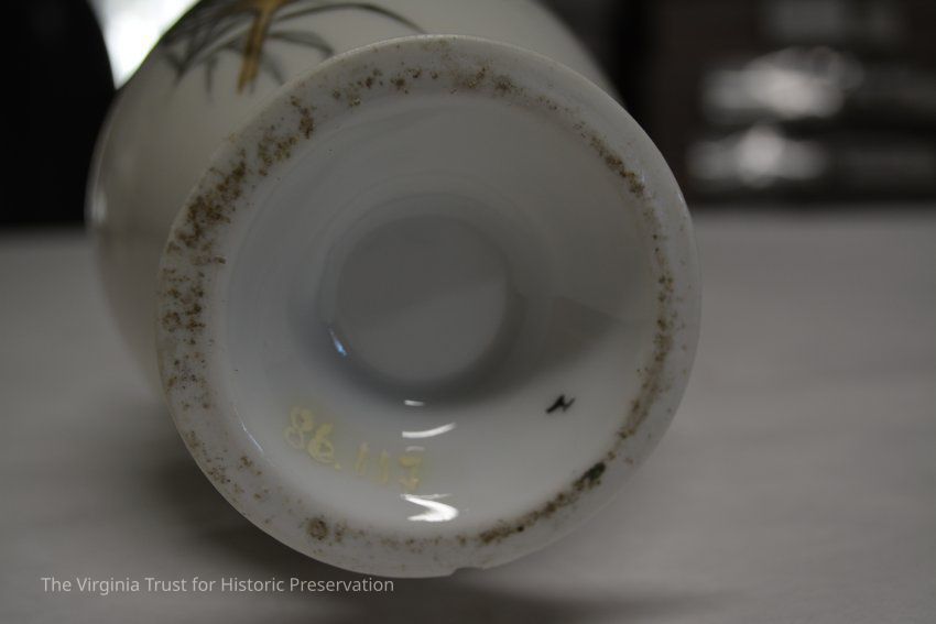One of a pair of vases. White china with an oriental design. Multiple designs on this vase that include a hand fan with a duck illustrated in it, paint palette, bluebirds perched on a branch with pink flowers, white flower, and a piece of bamboo. Black ink mark on bottom- maybe an "H".