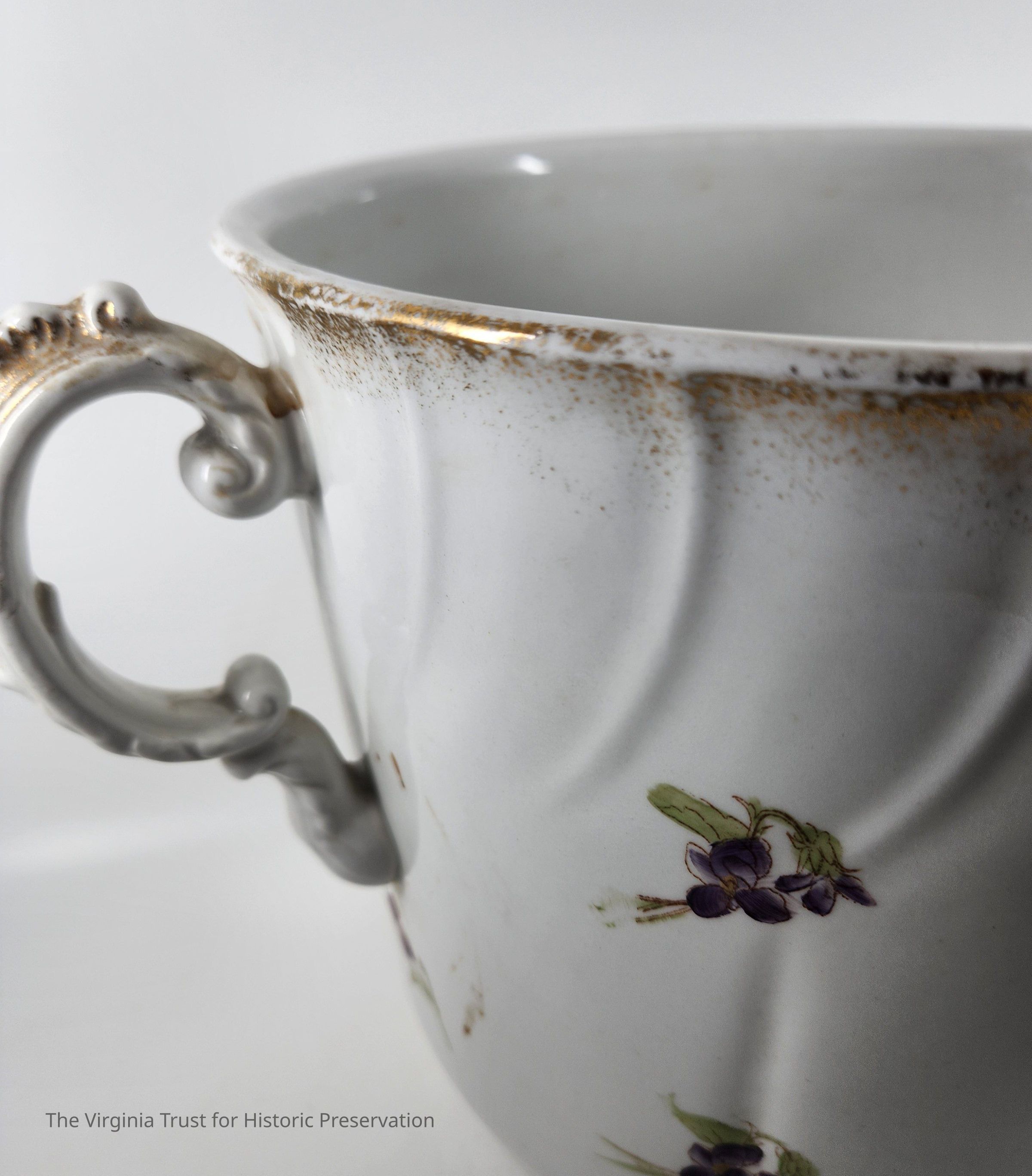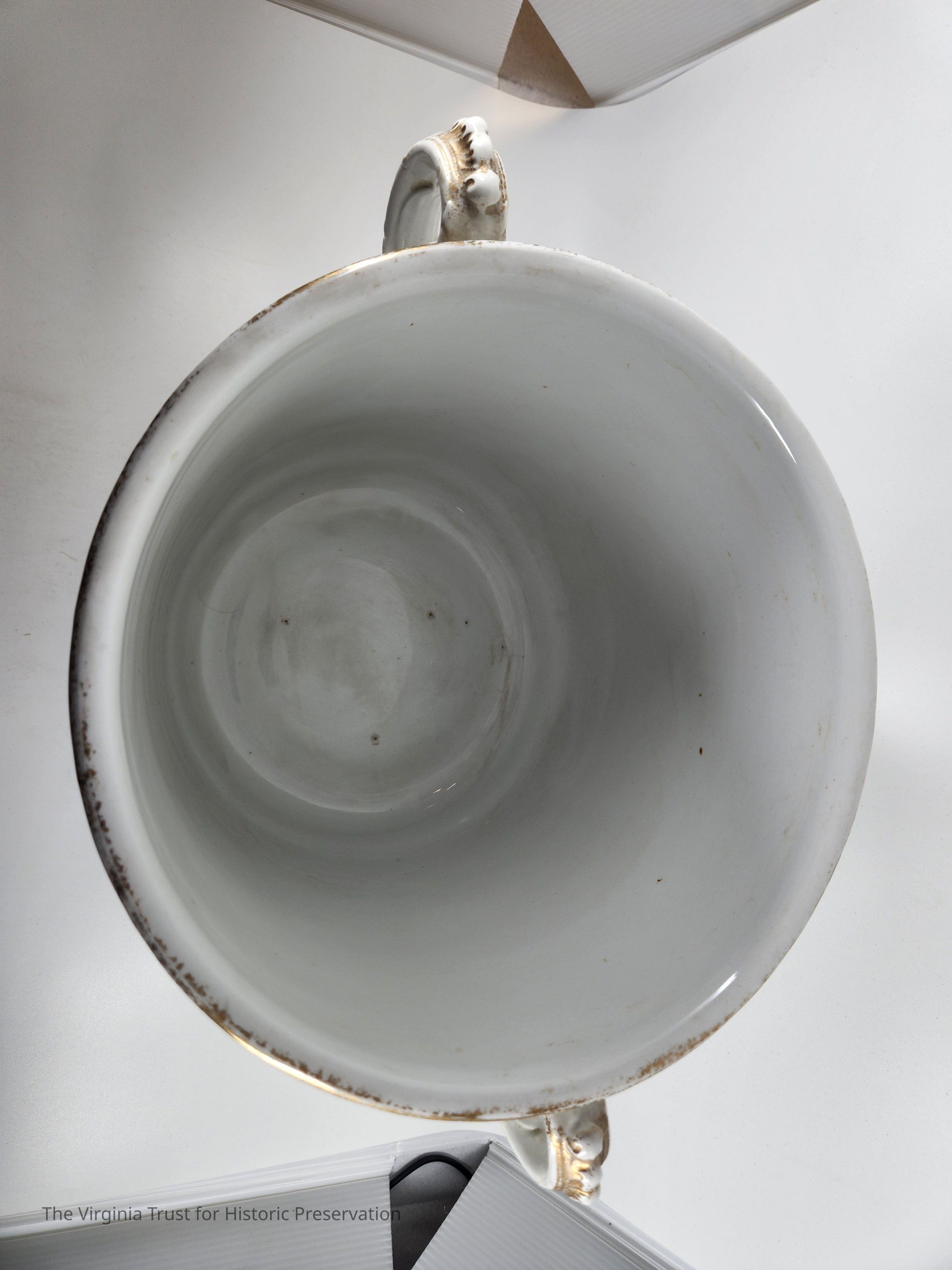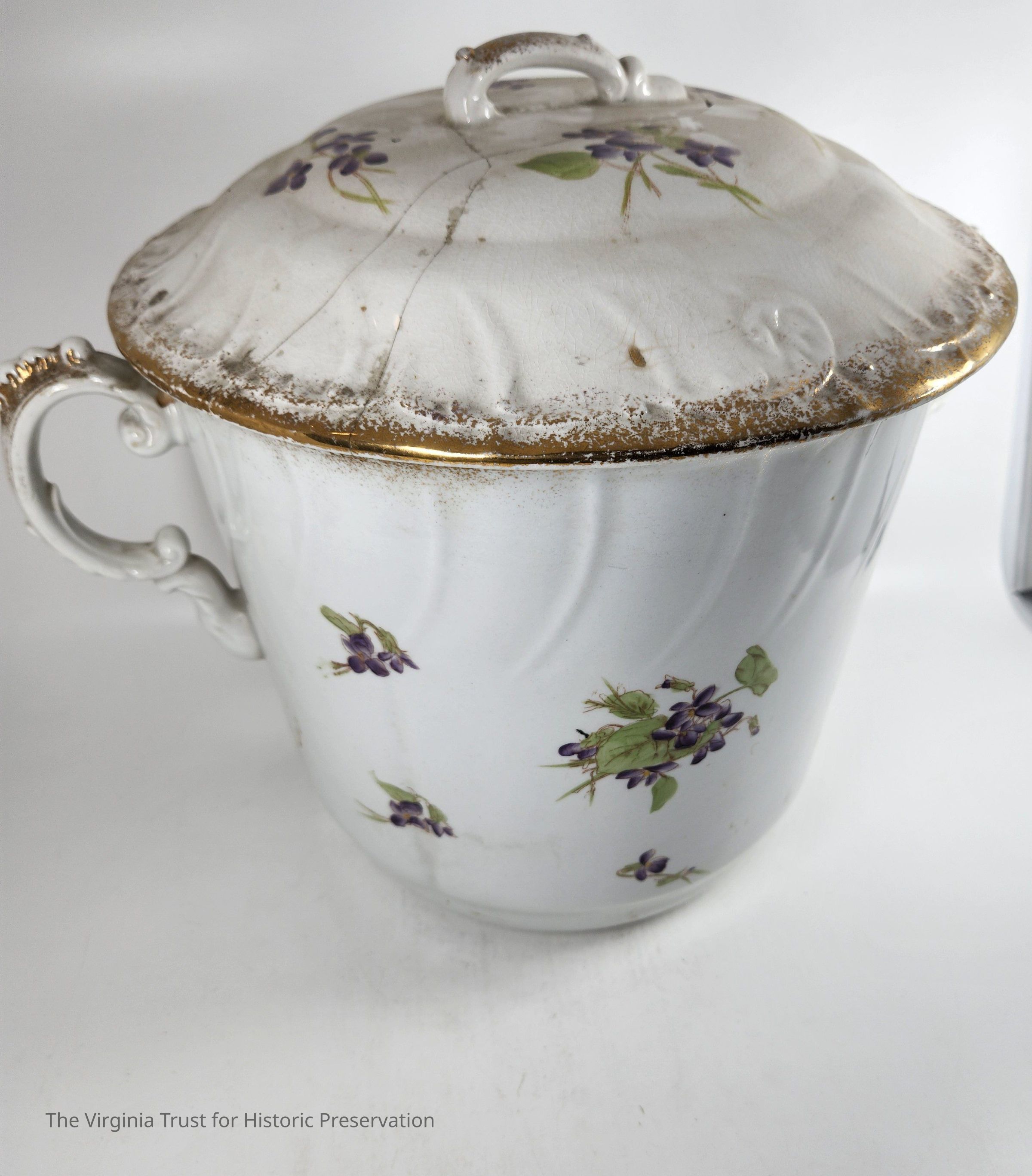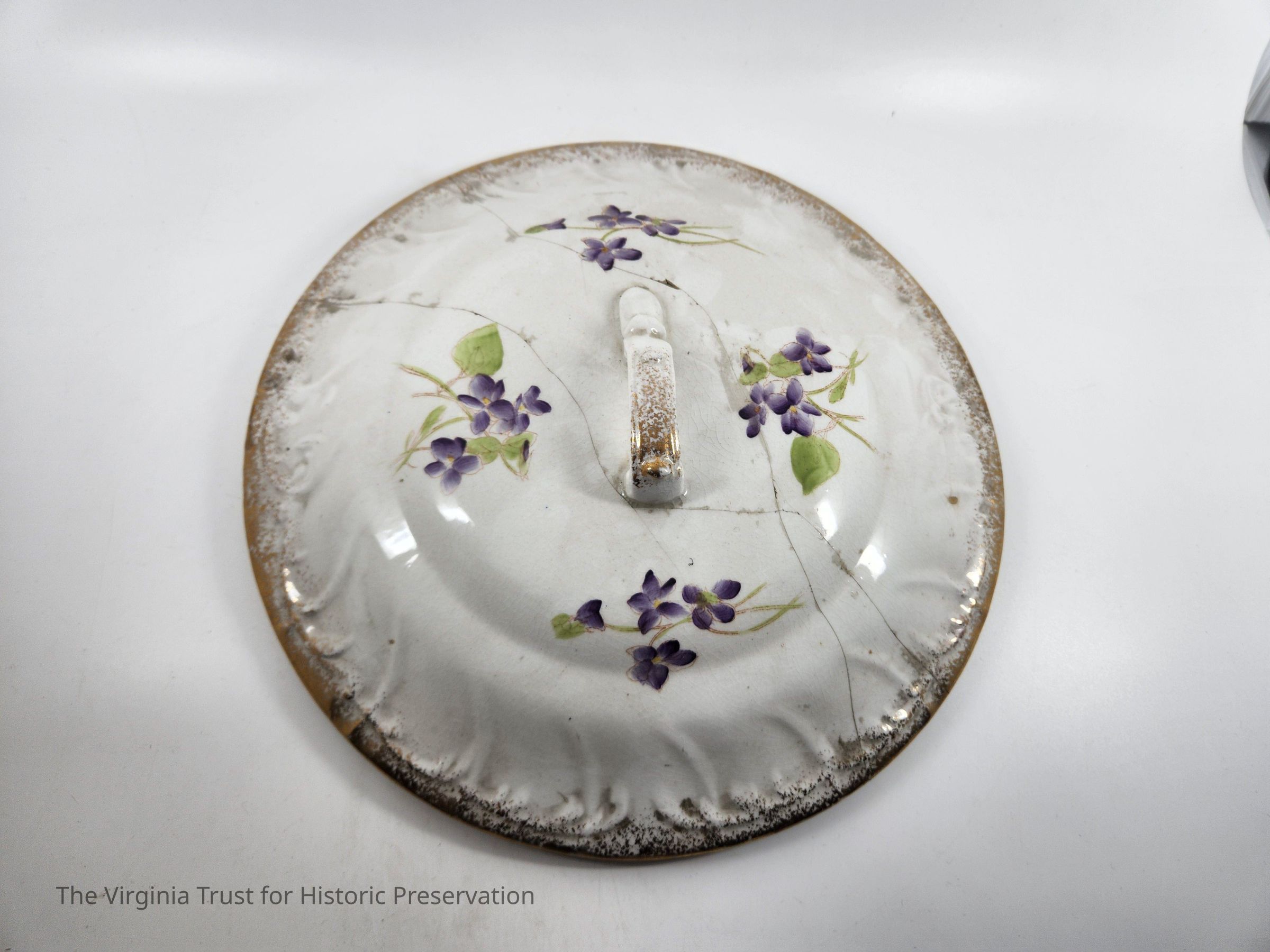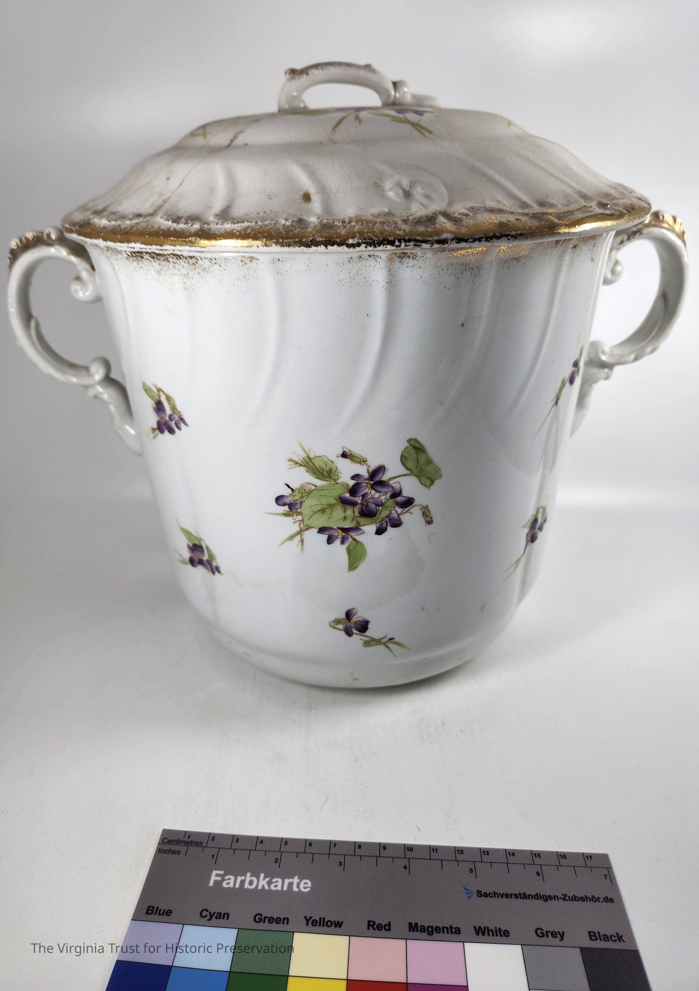 One jar with lid. White porclain with painted violets. Included in a set with a bowl, pitcher and chamber pot.