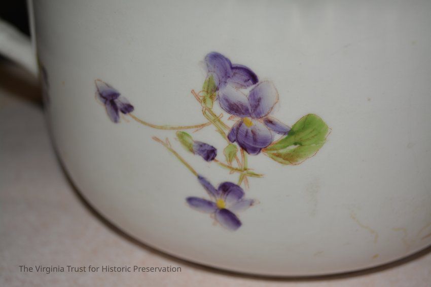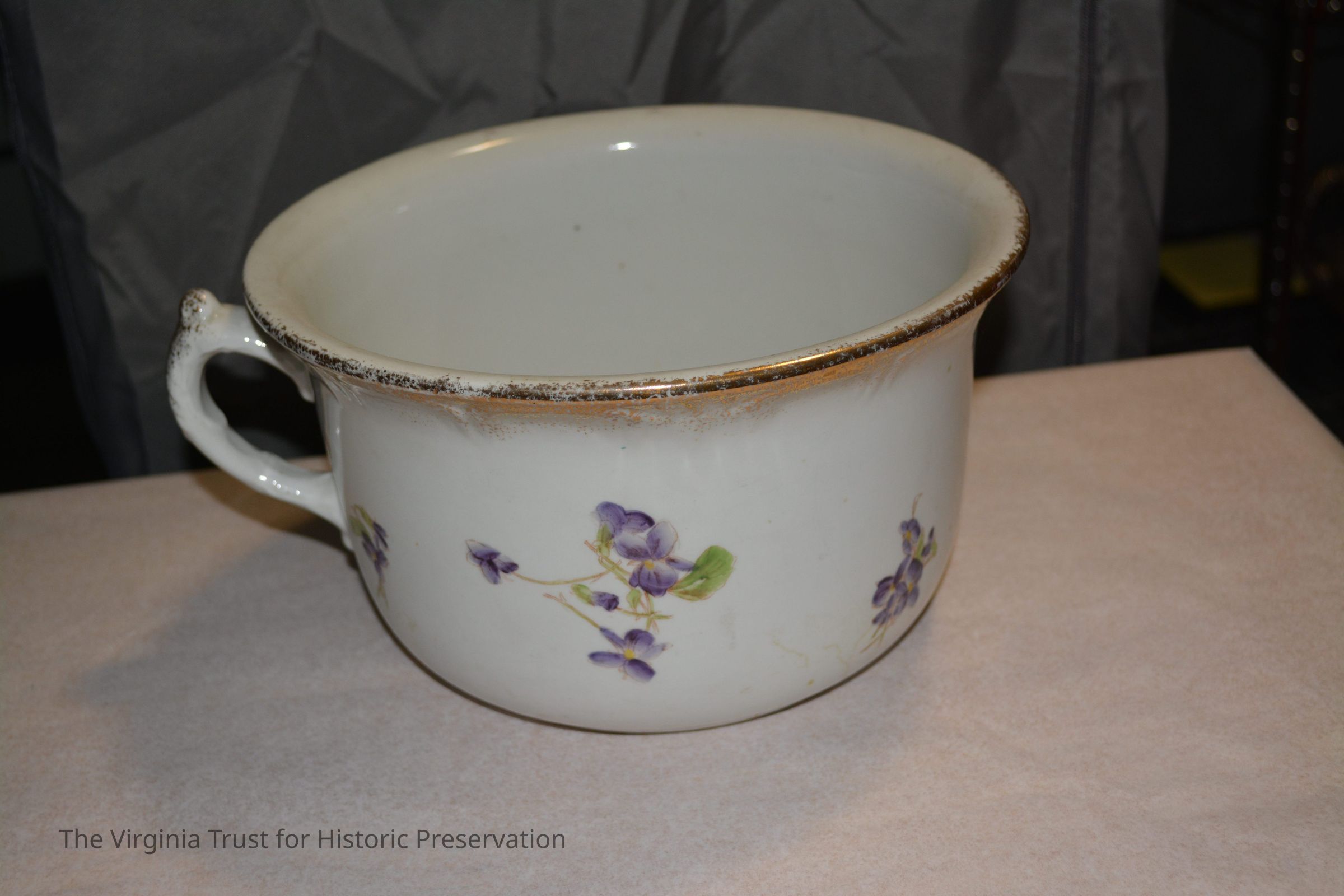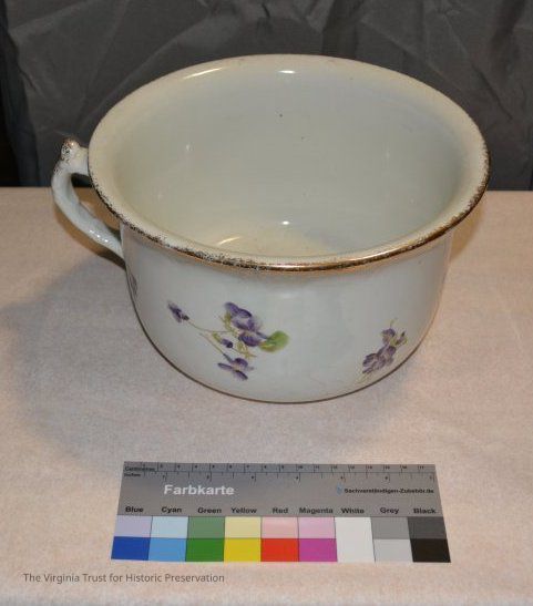 Chamber pot with one handle. White porcelain with painted violets.