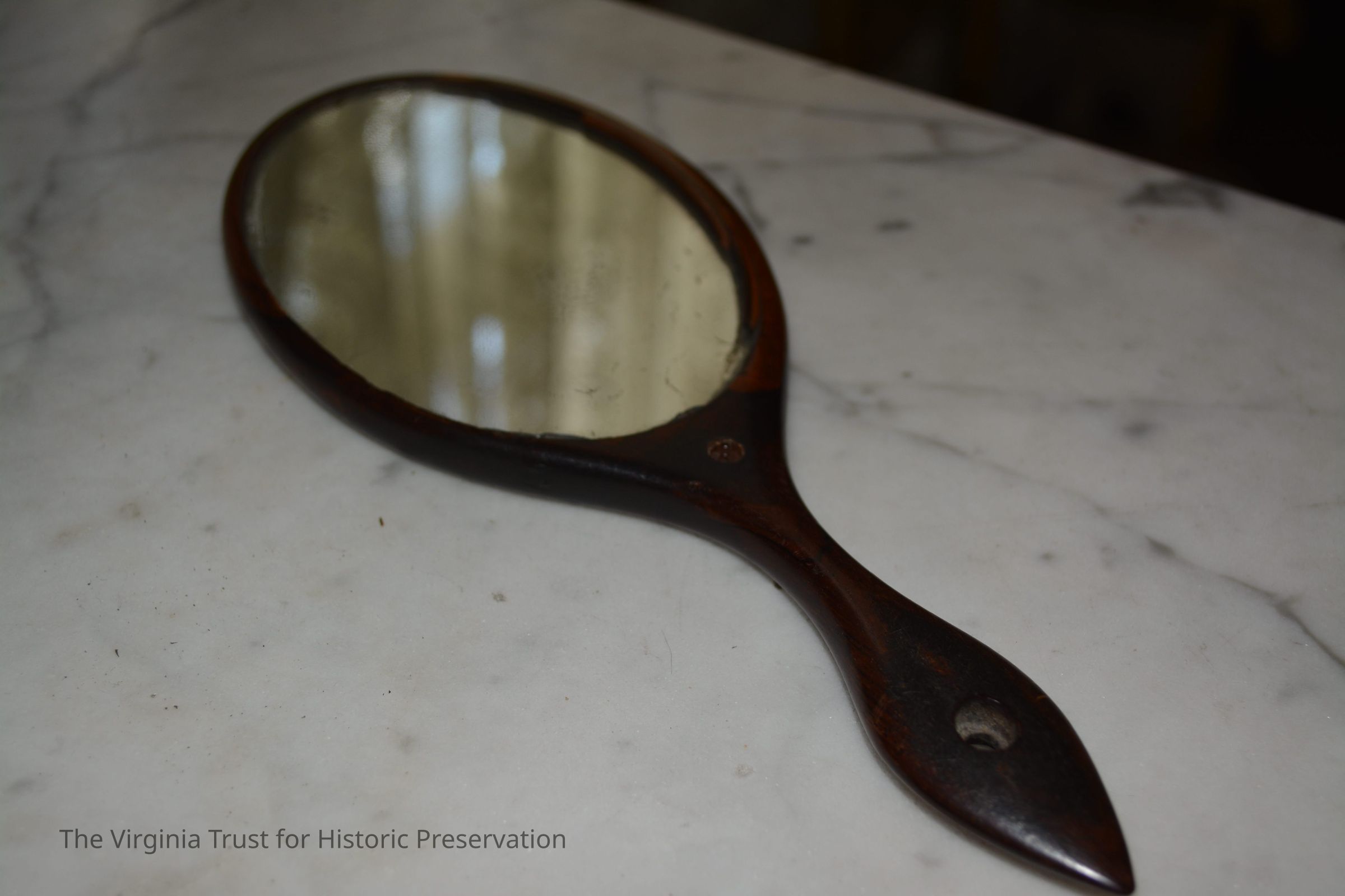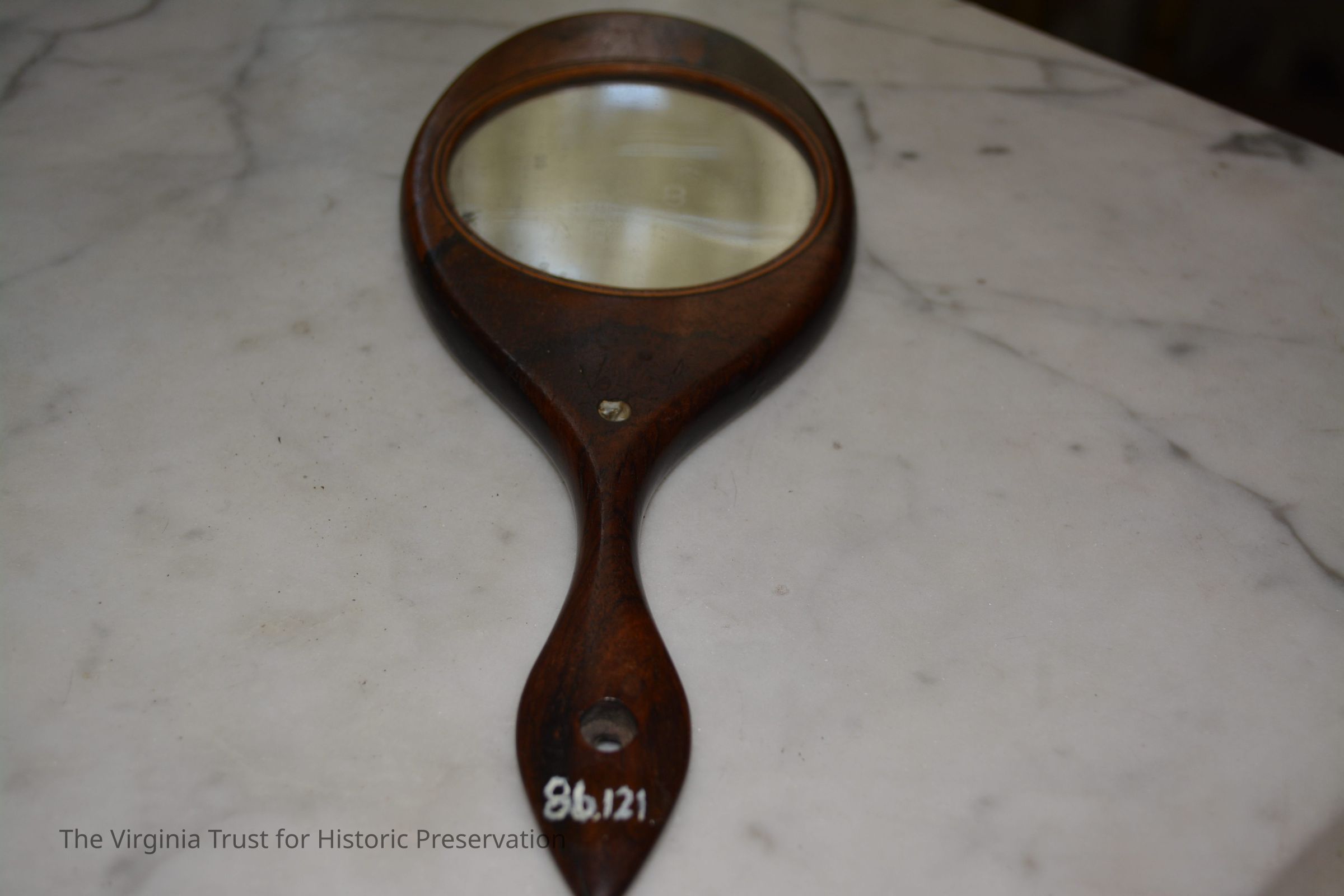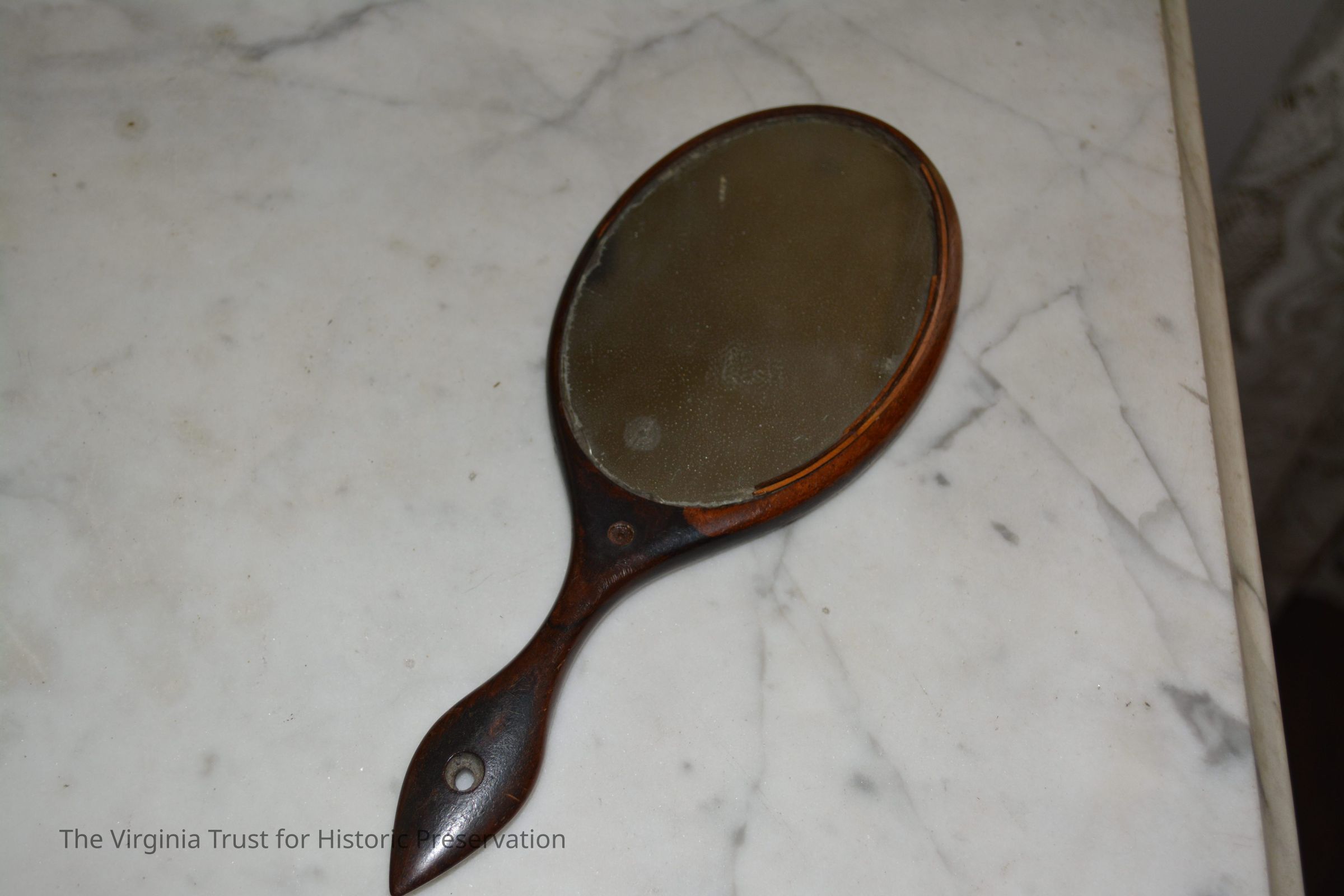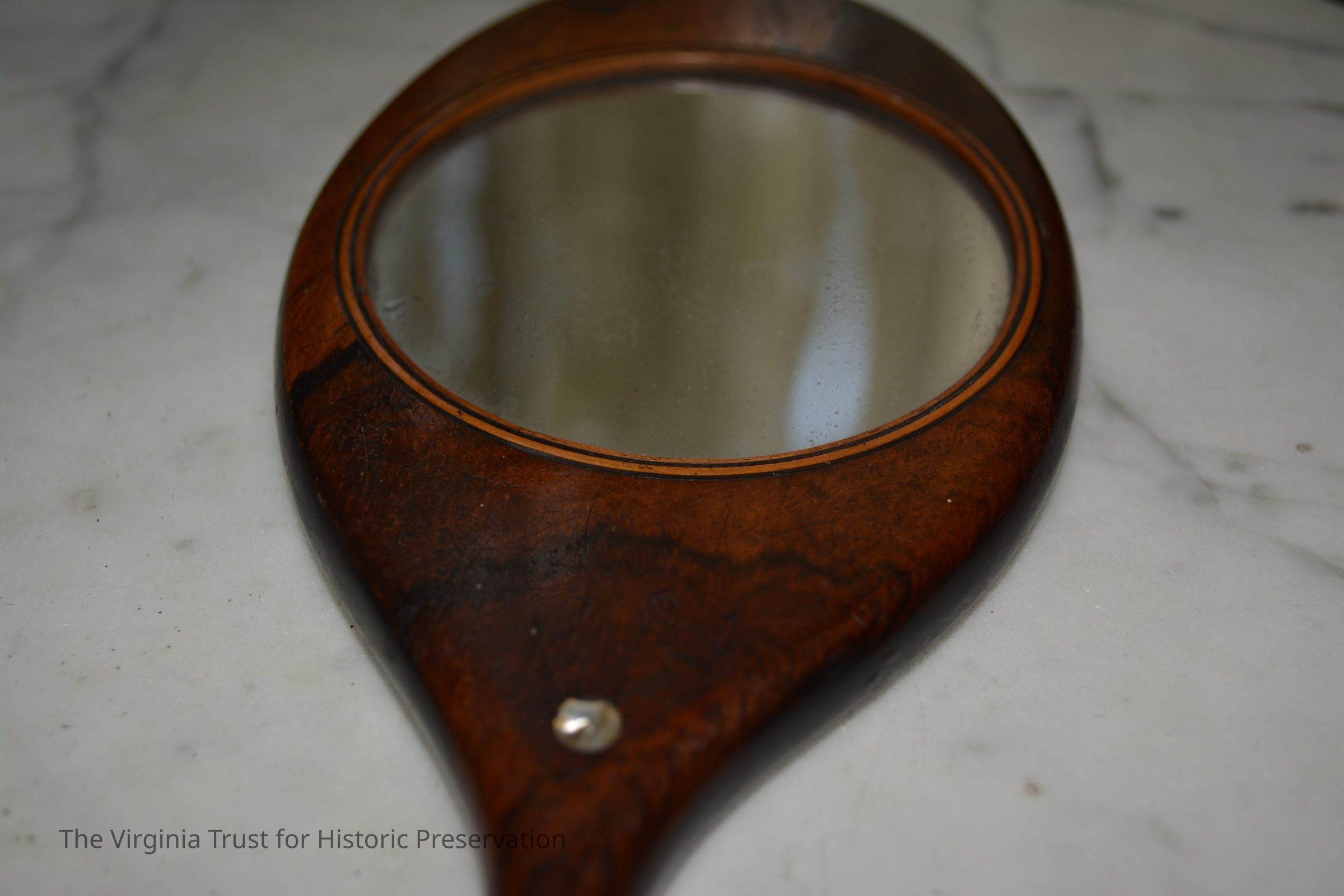 Hand mirror. Wood with mirrors on both sides. Mother-of-pearl dot inset. One inner rim broken and missing.