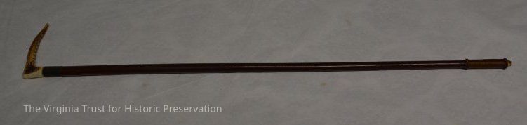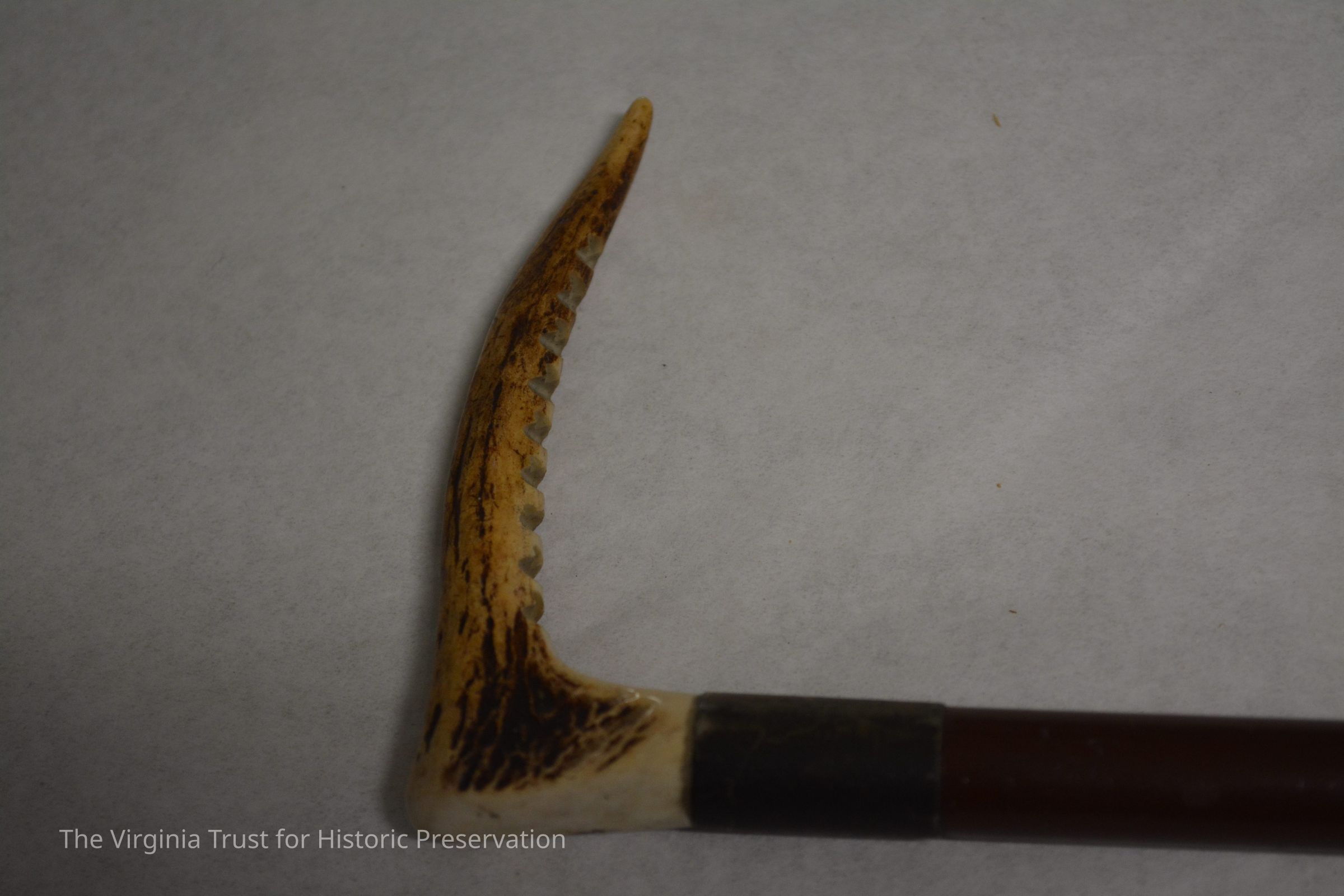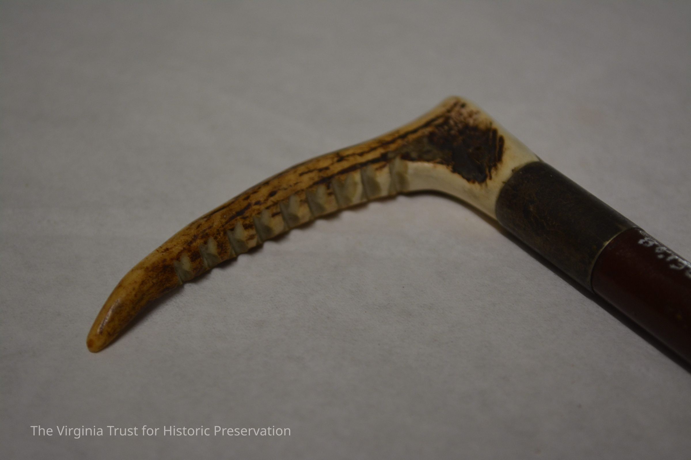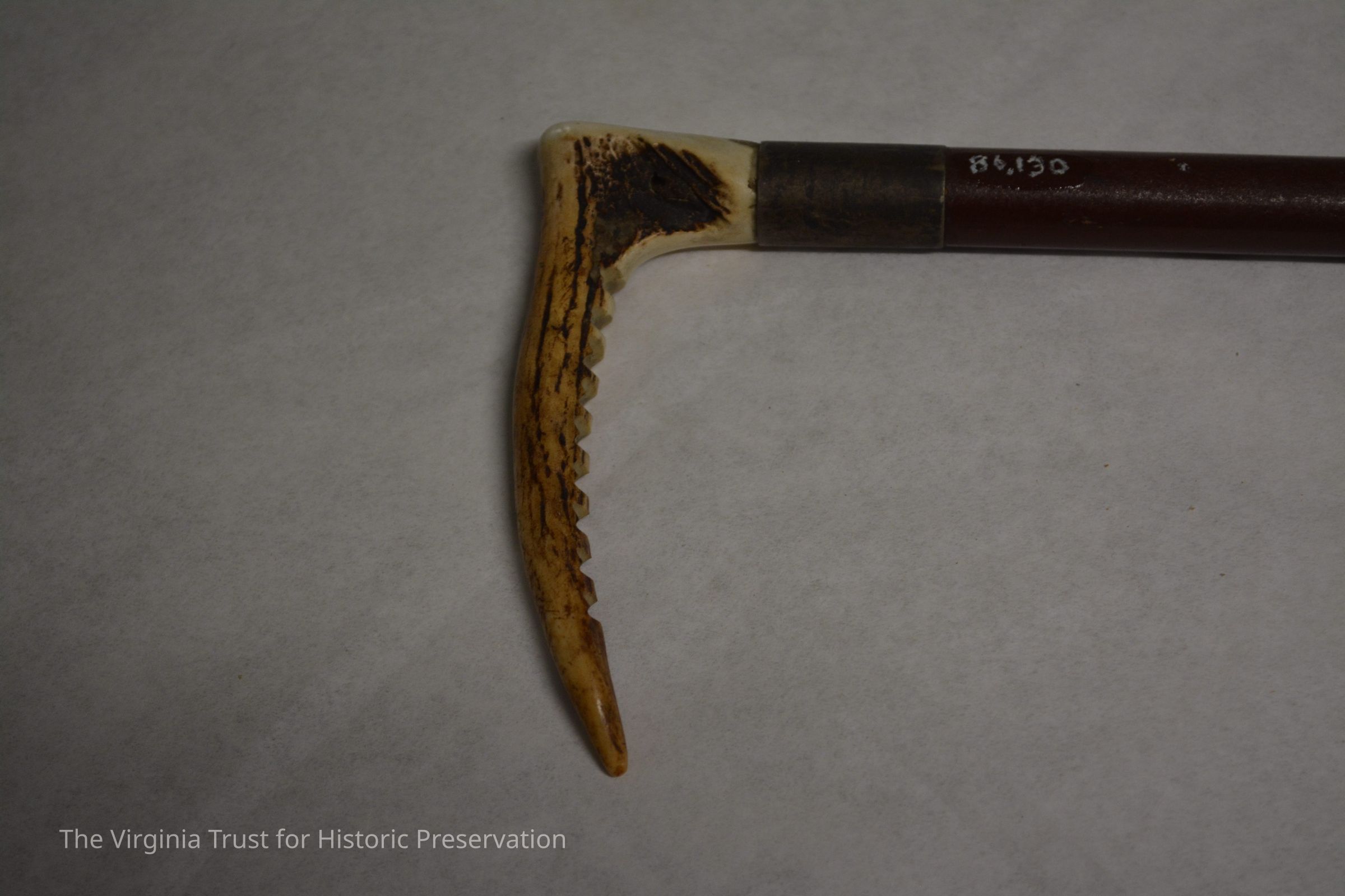 Bone is carved with notches along the inside. Connected to wooden stick by a metal connector. Opposite end of crop has thread woven around it.