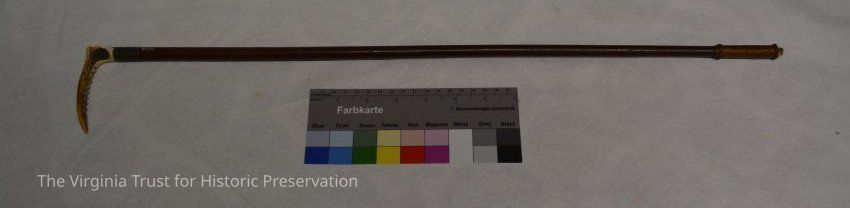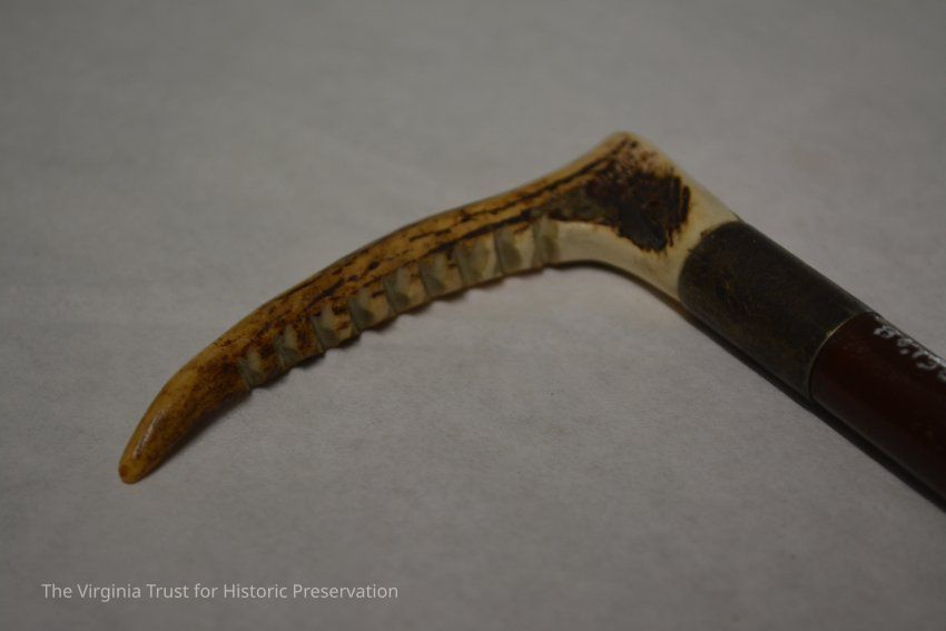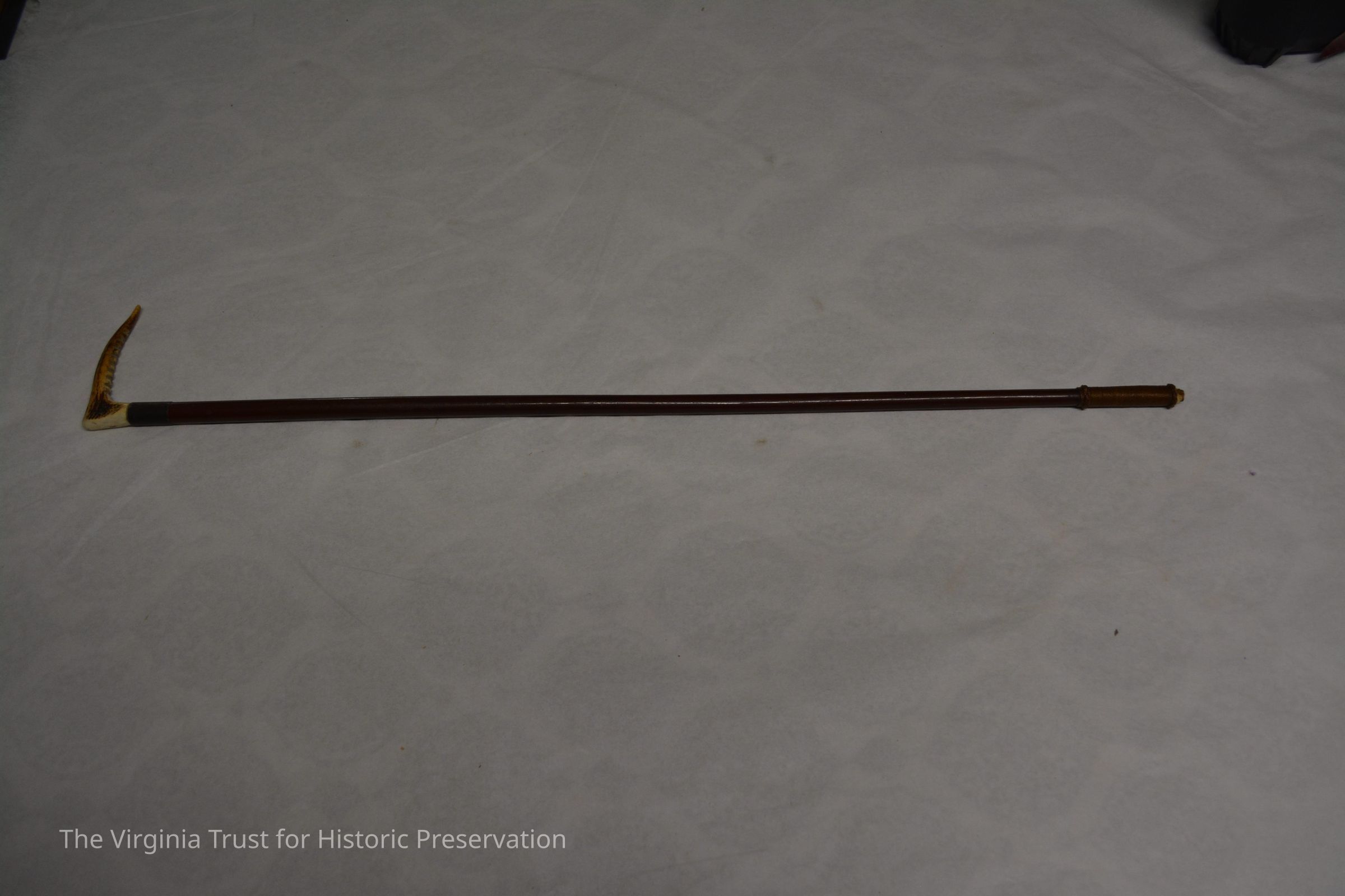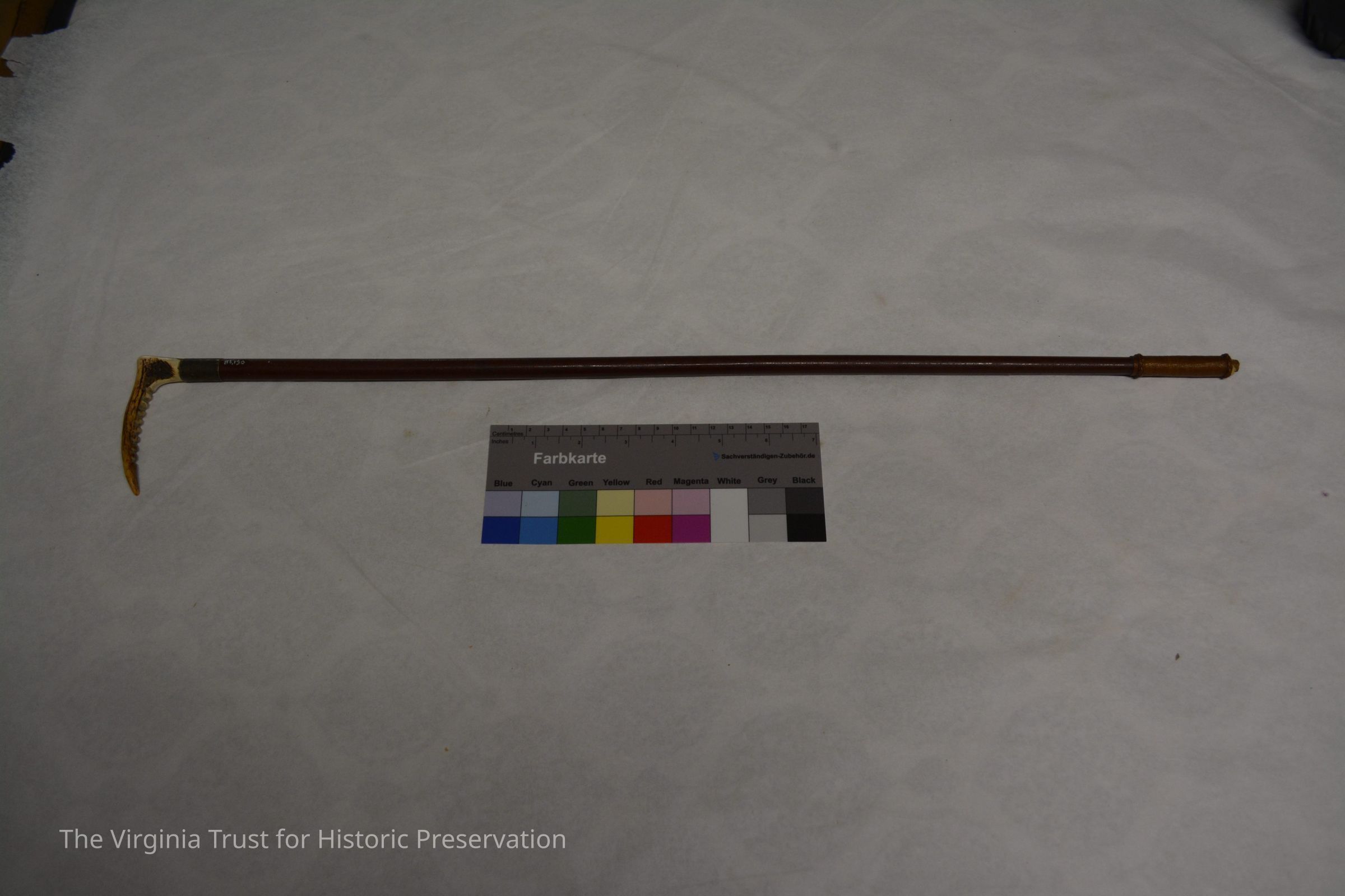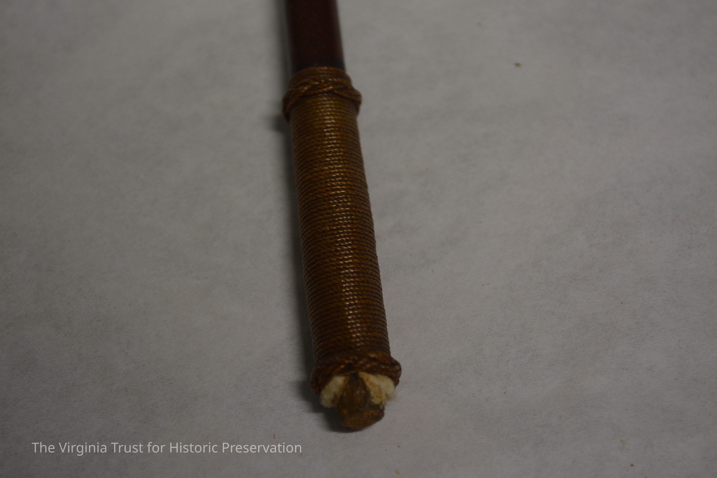 Bone is carved with notches along the inside. Connected to wooden stick by a metal connector. Opposite end of crop has thread woven around it.