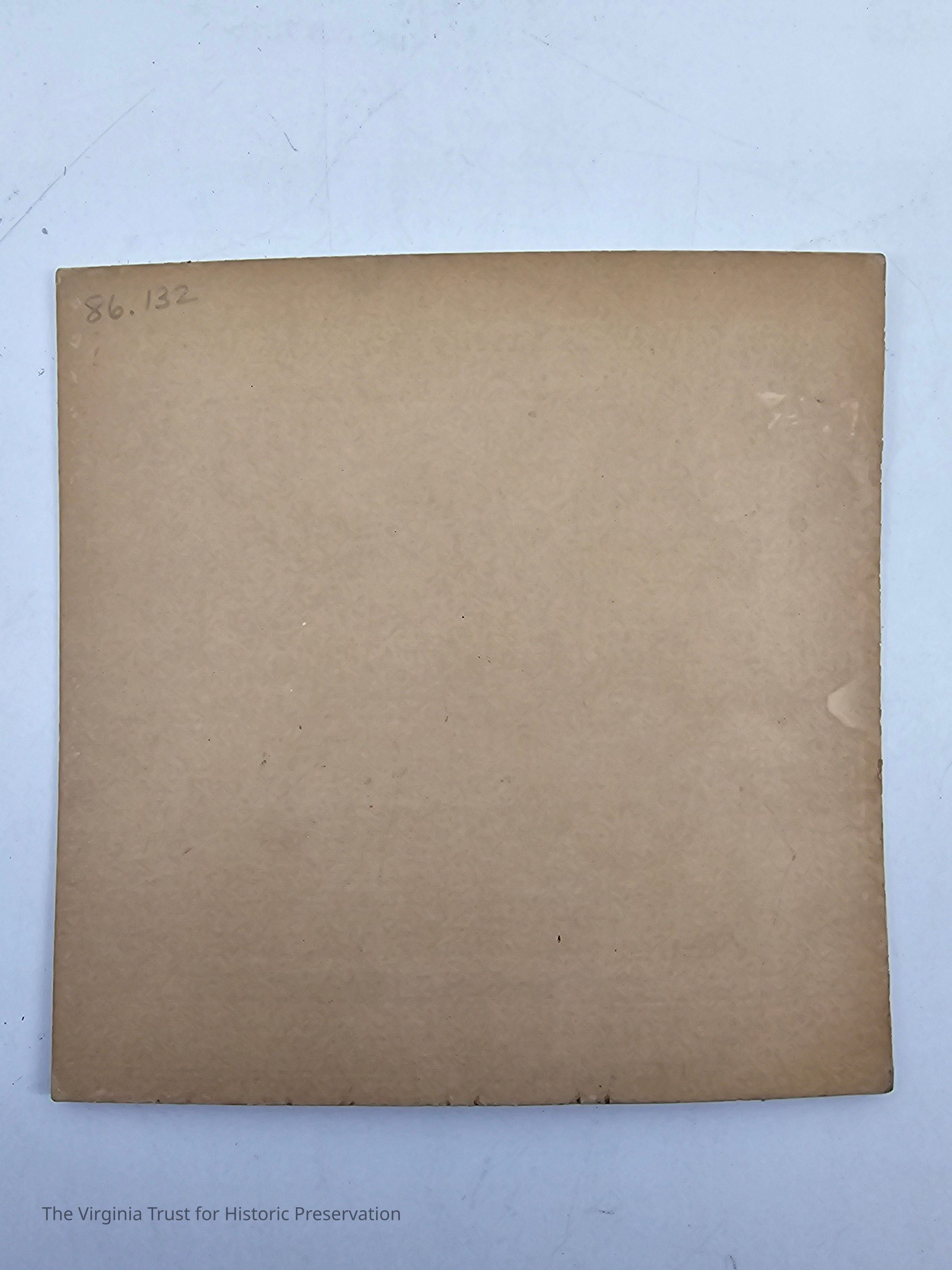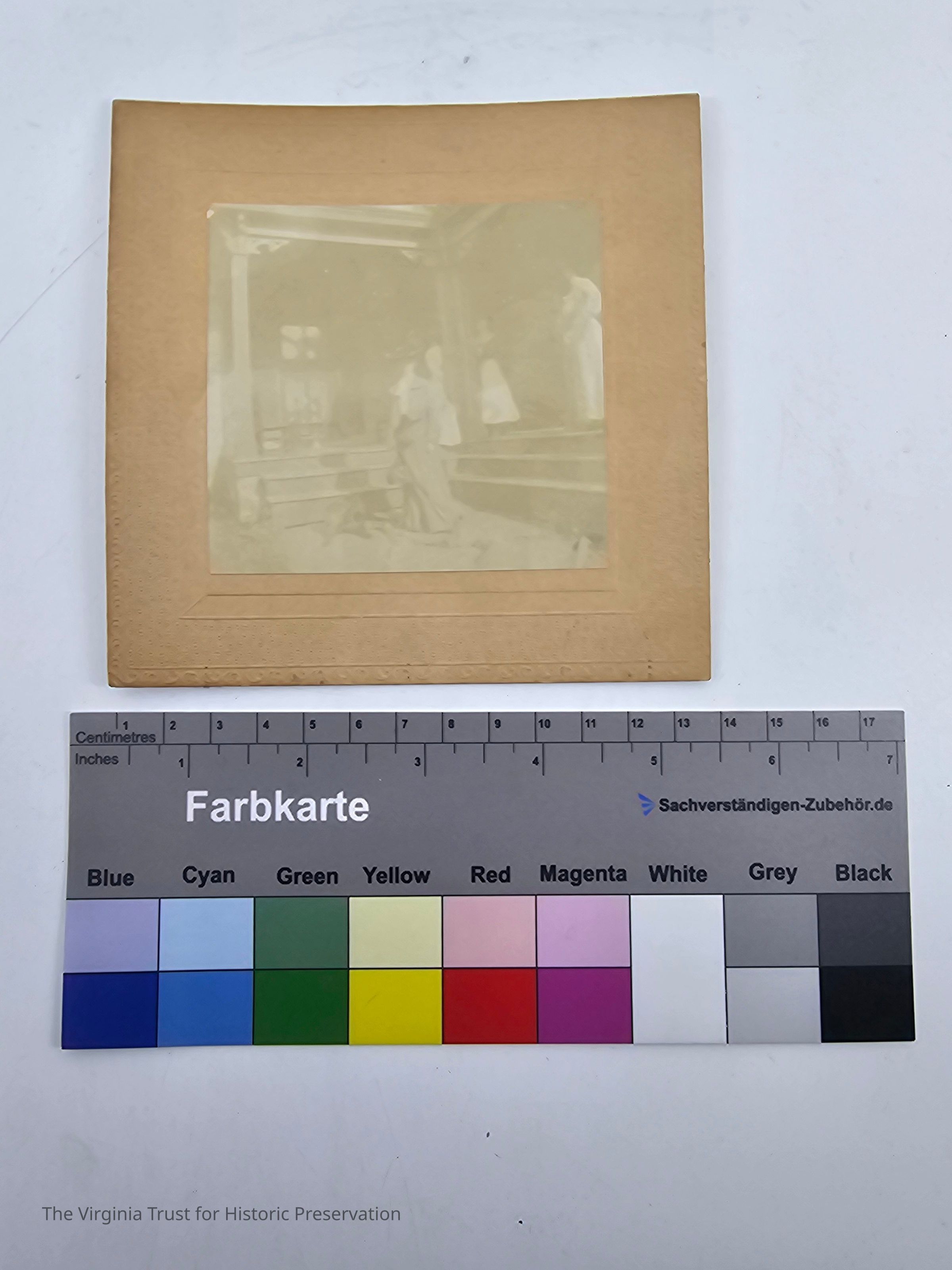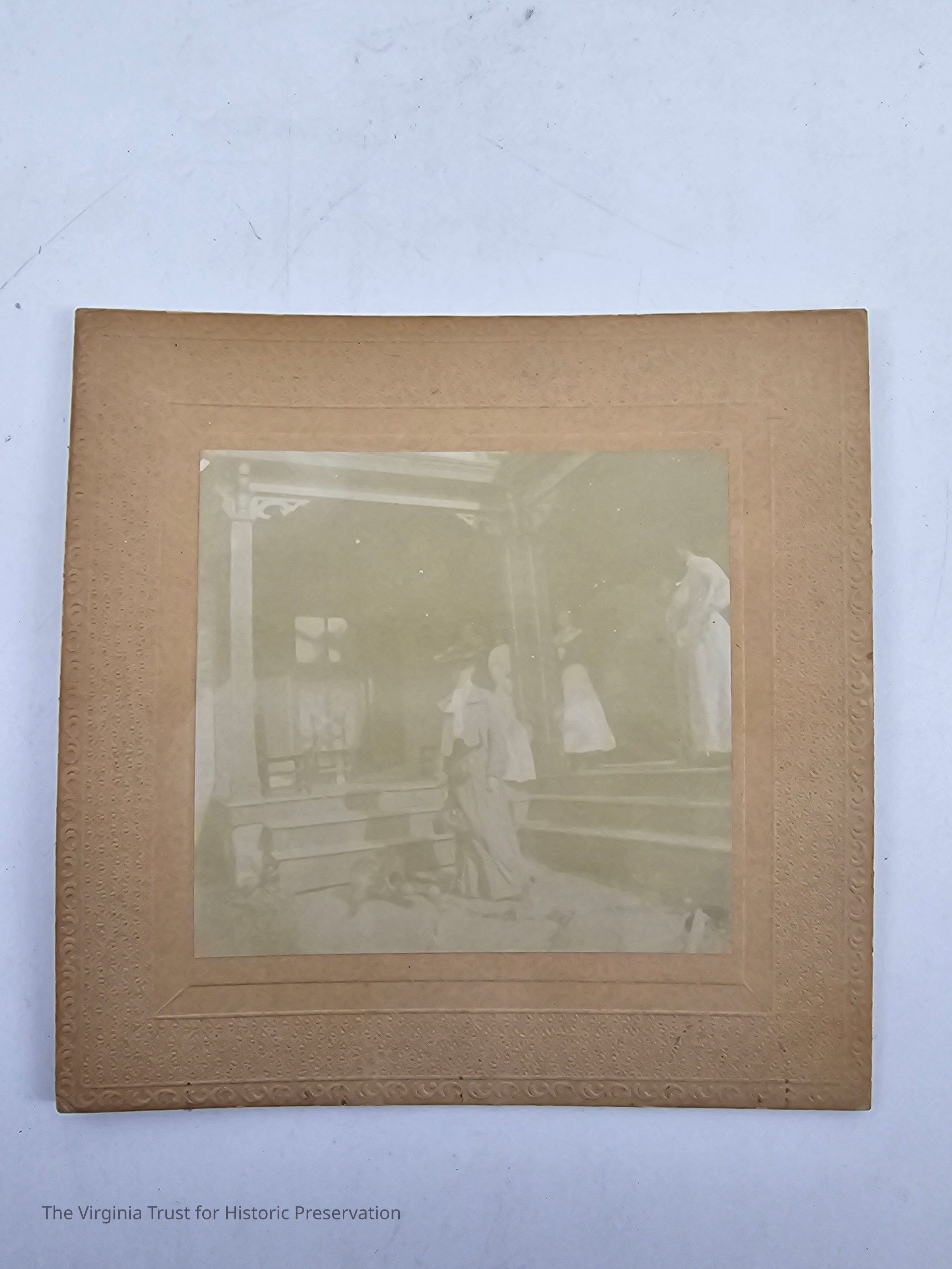 "Woman in Courtyard". One woman with dog posed in front of a porch. Four other women standing on the porch behind. Photo badly faded.