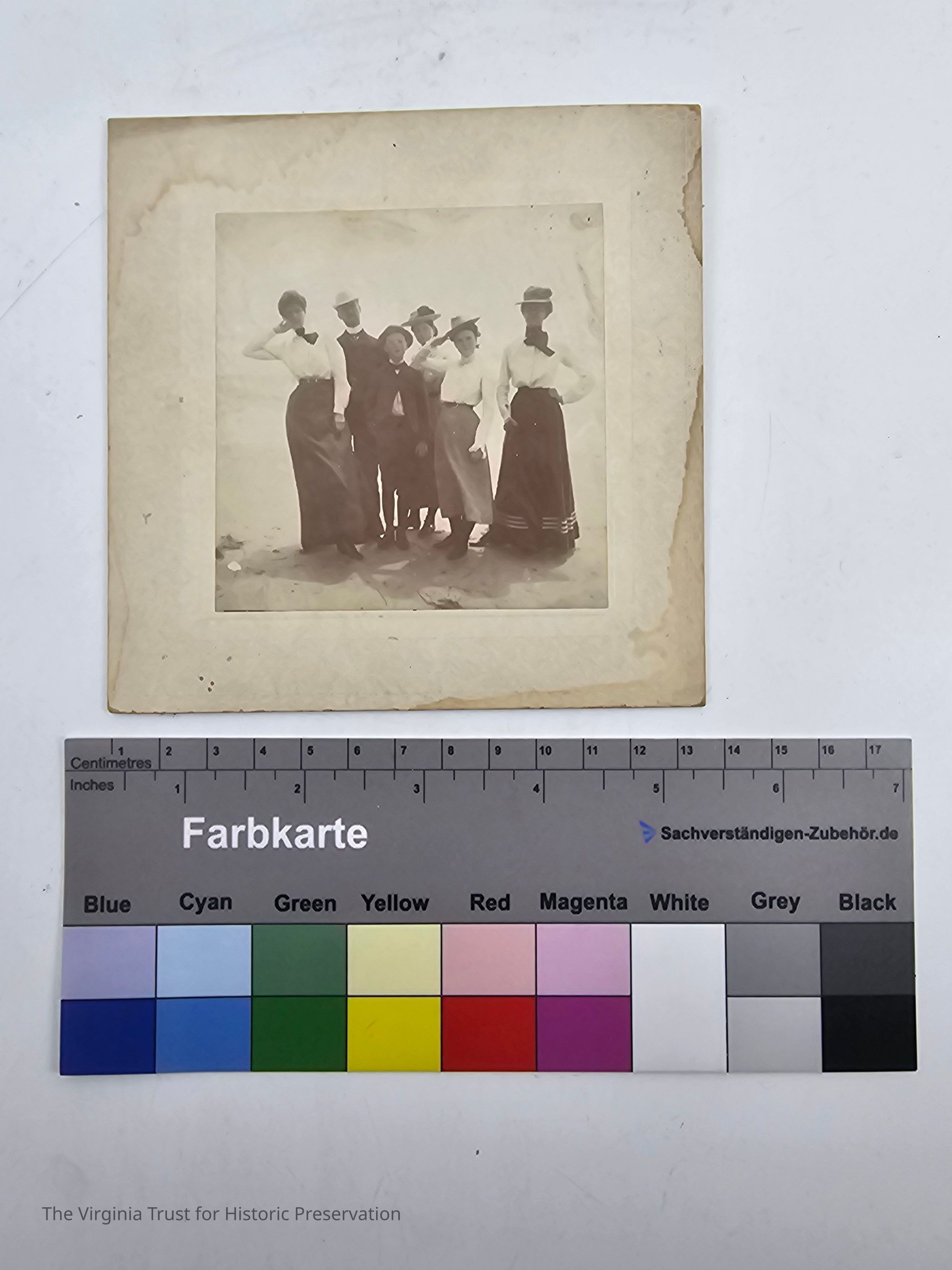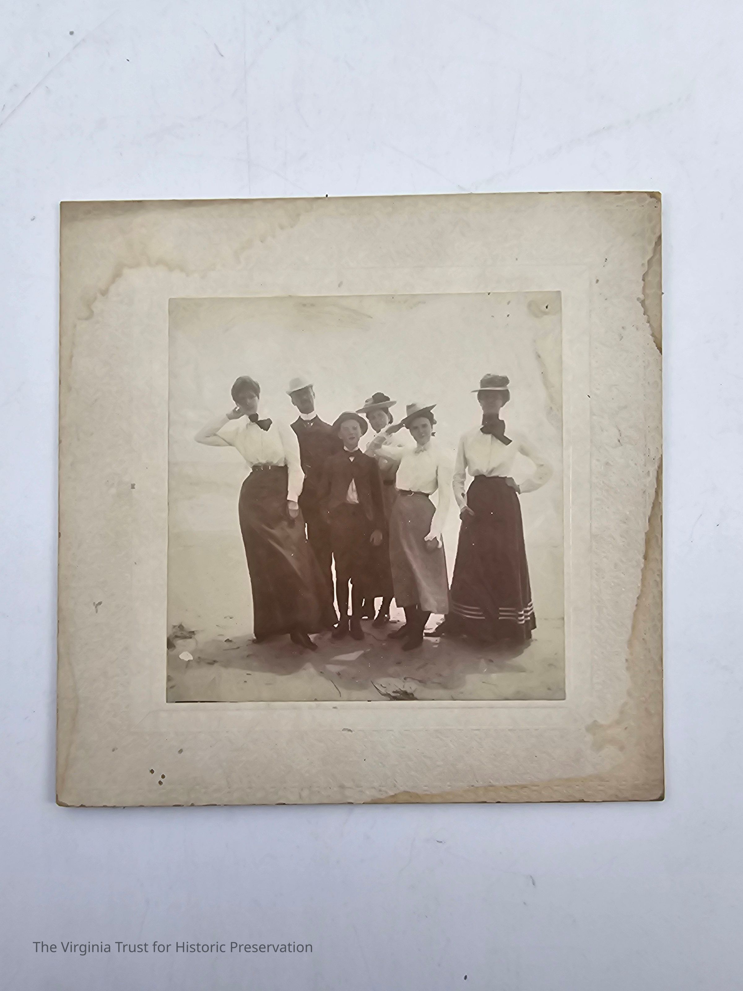 One of 24 theater programs, souvenirs, photos, and papers collected by Maude Downham. Group of six (four women and two men) posed together at the seashore.