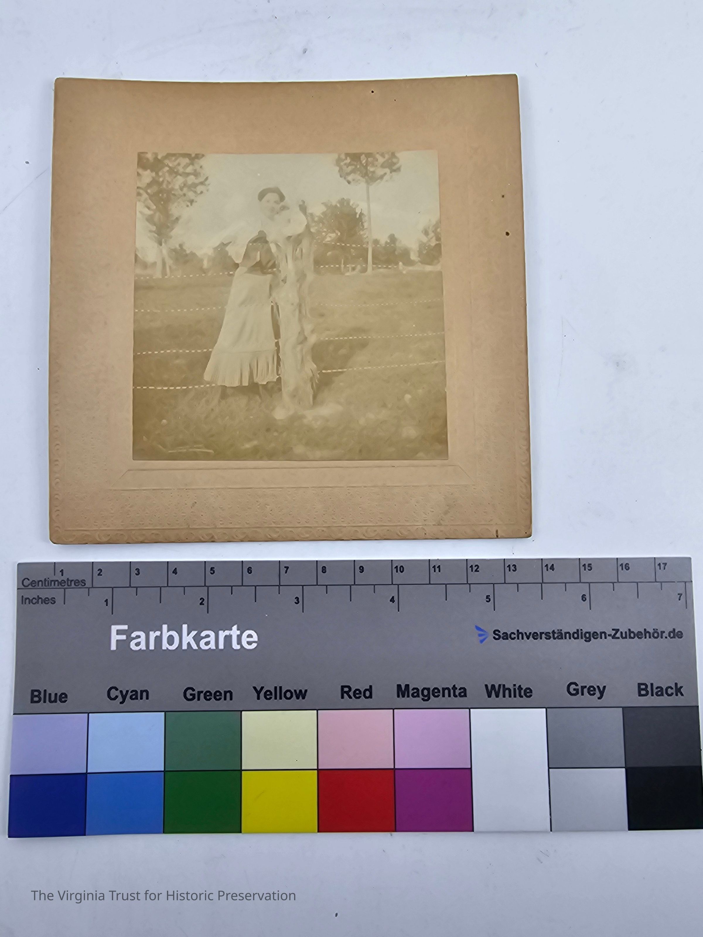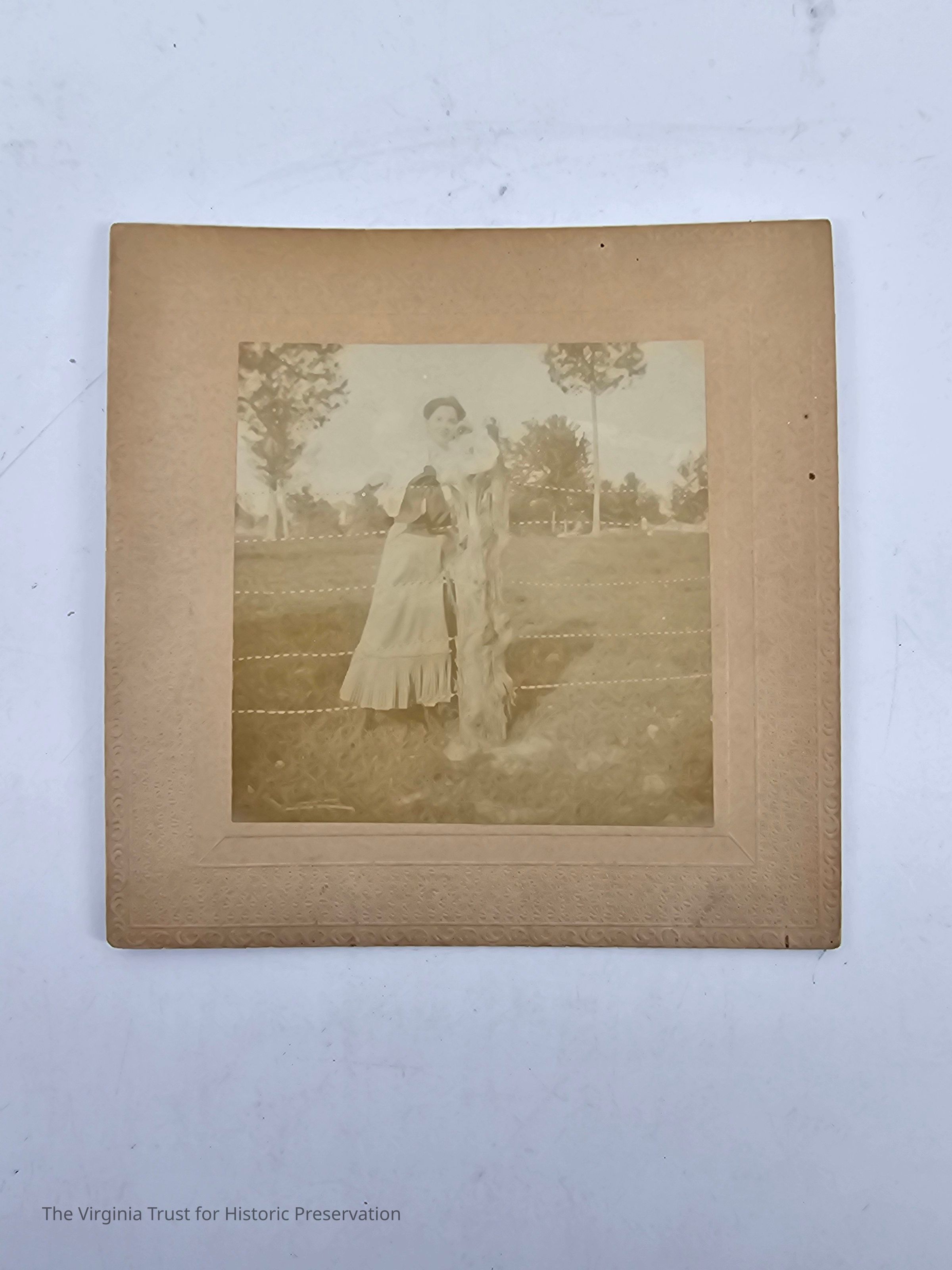 One of 24 theater programs, souvenirs, photos, and papers collected by Maude Downham. "Woman at Ranch". Woman leaning on a fence post. Photo faded.