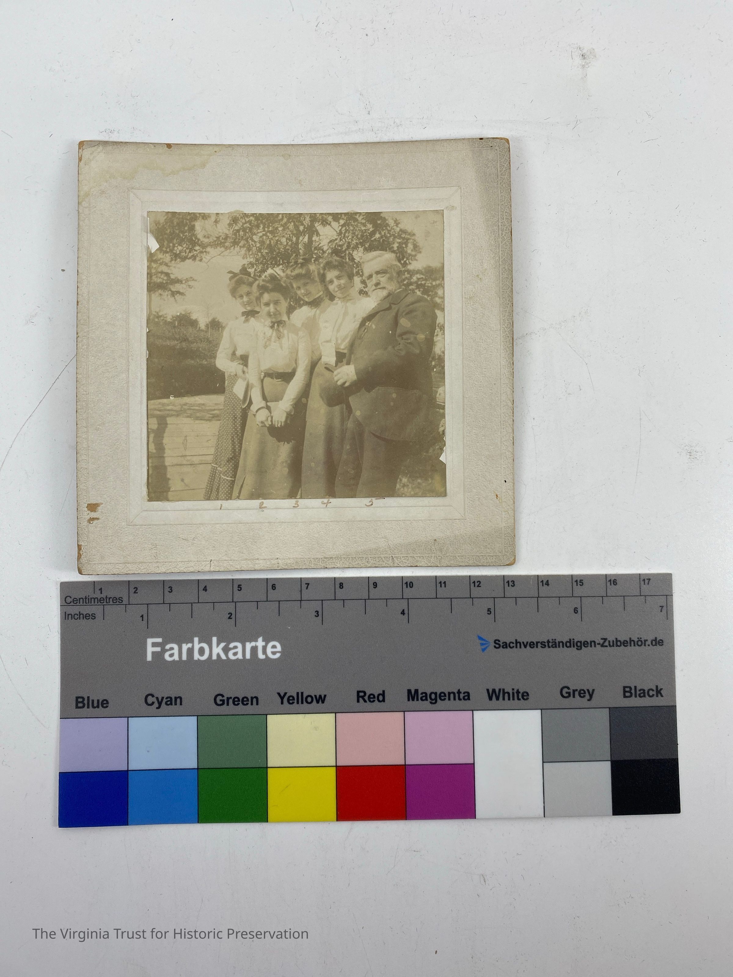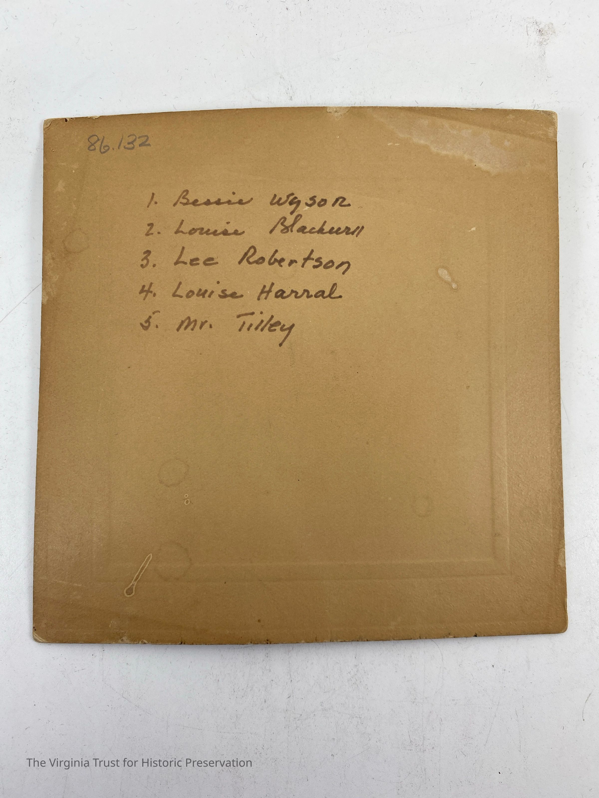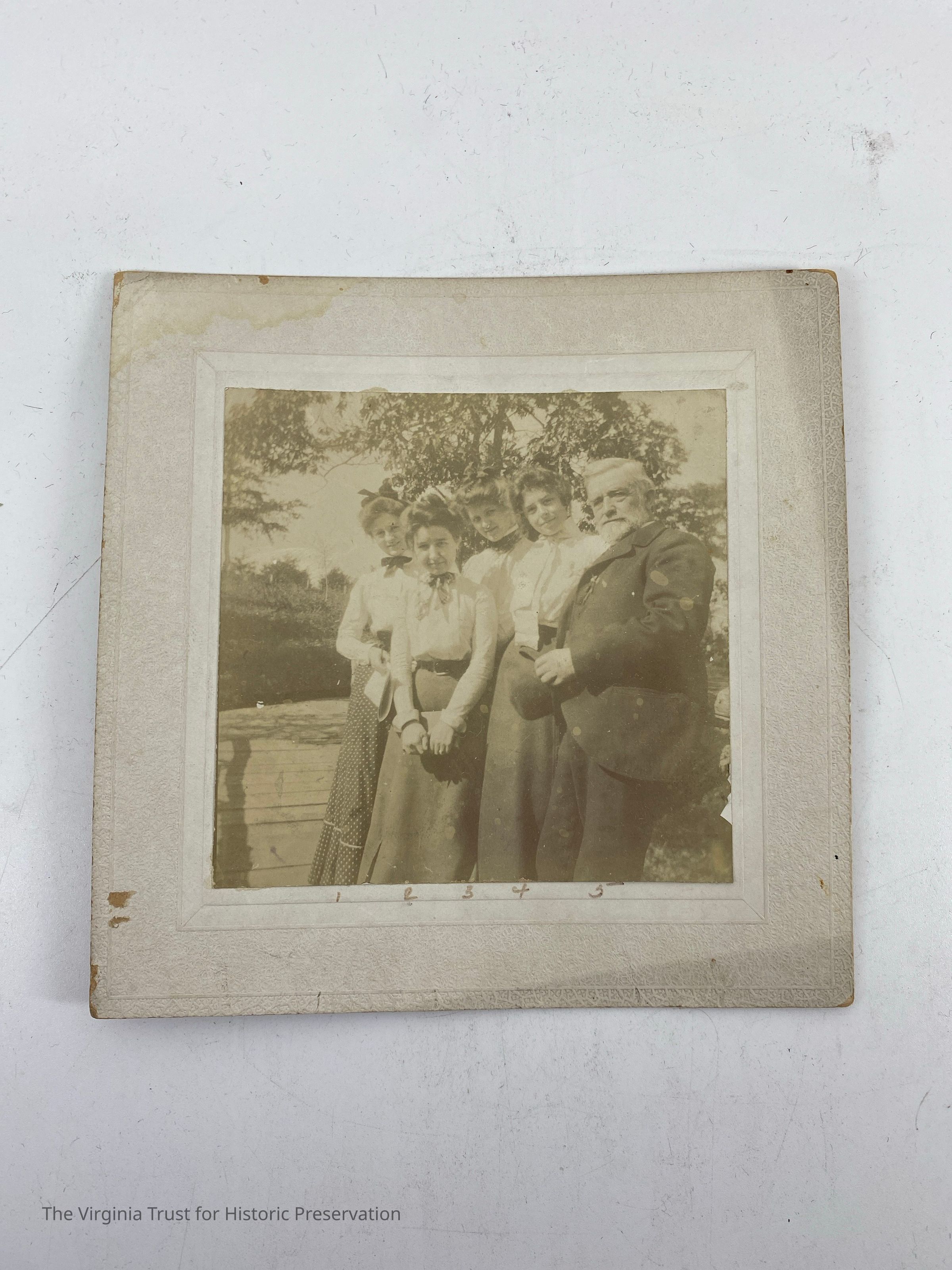 "Mr. Tilley & Ladies". Four women with an older gentleman. Numbers are written beside the people and the key is written on the back. 1. Bessie Wysor 2. Louise Blackwell 3. Lee Robertson 4. Louise Harral 5. Mr. Tilley.