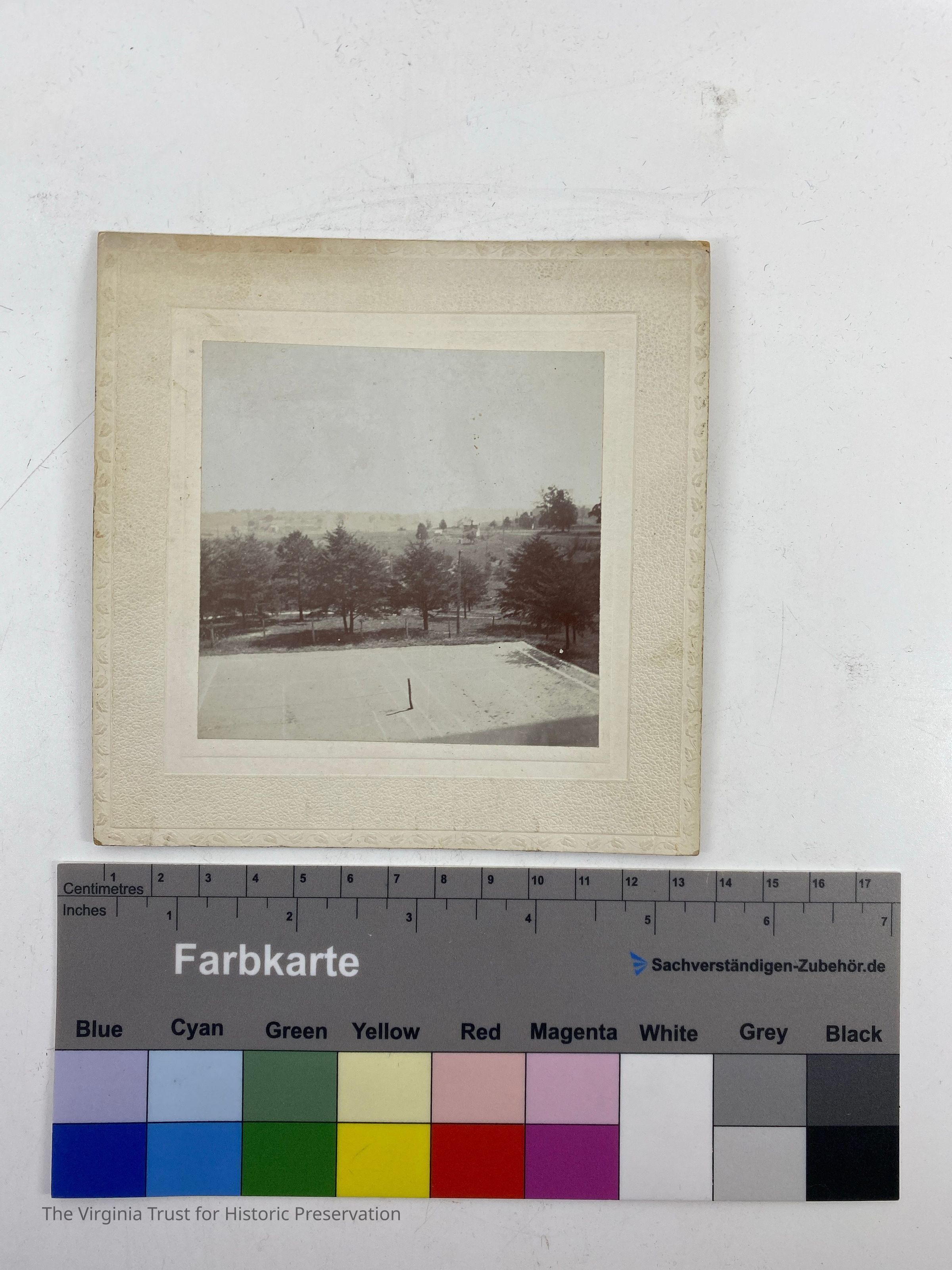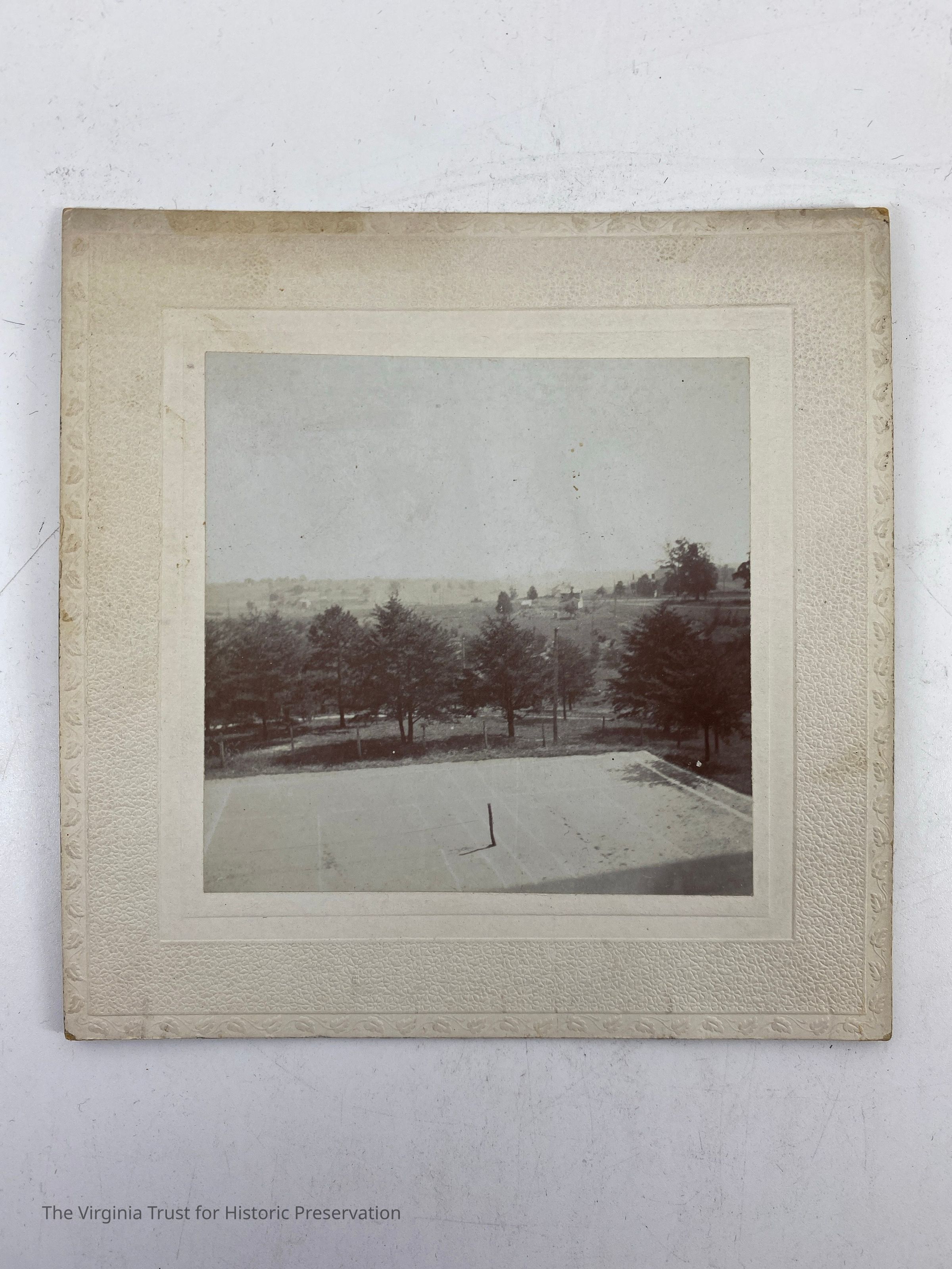One of 24 theater programs, souvenirs, photos, and papers collected by Maude Downham. Landscape with a tennis court in the foreground.