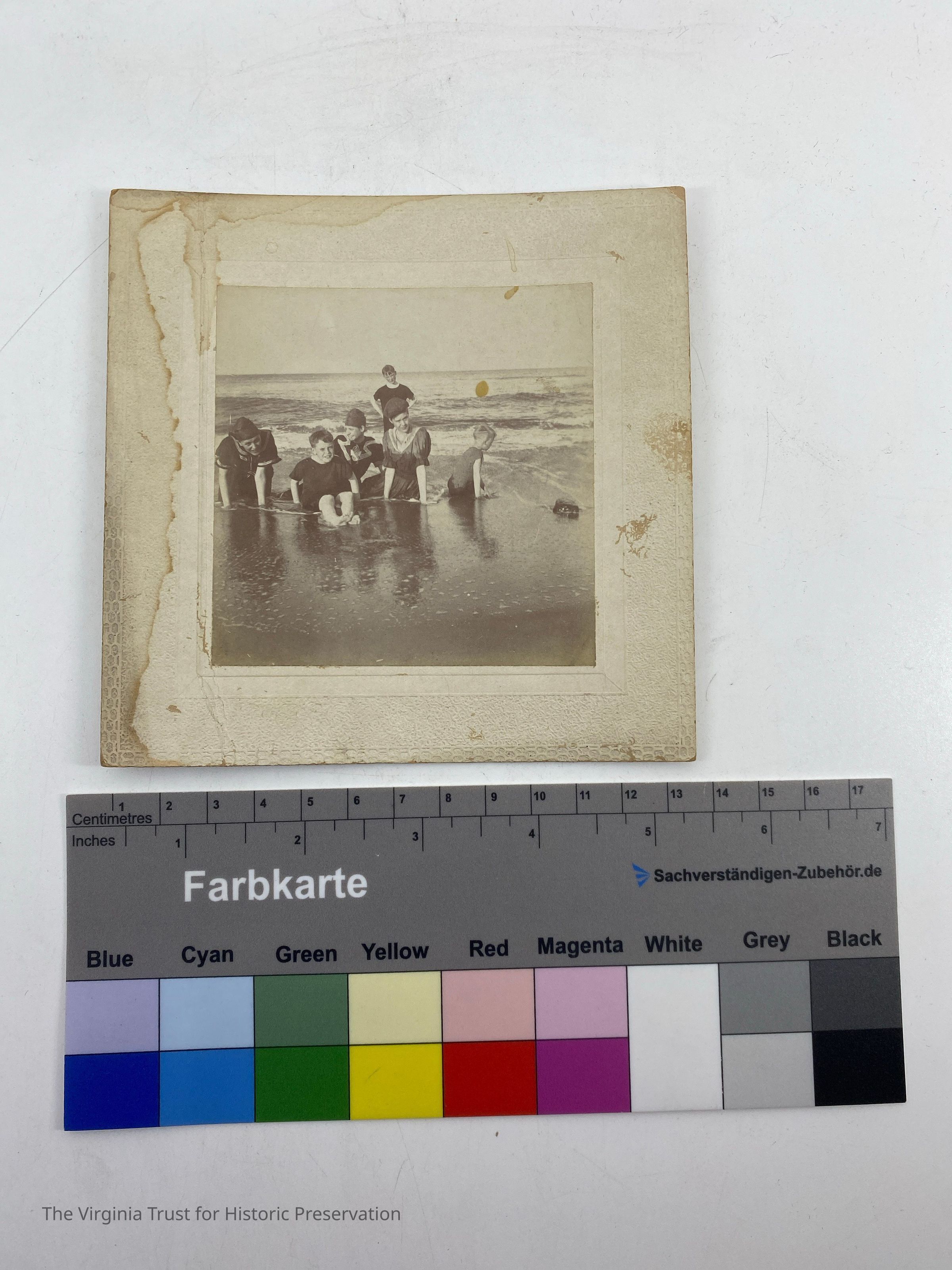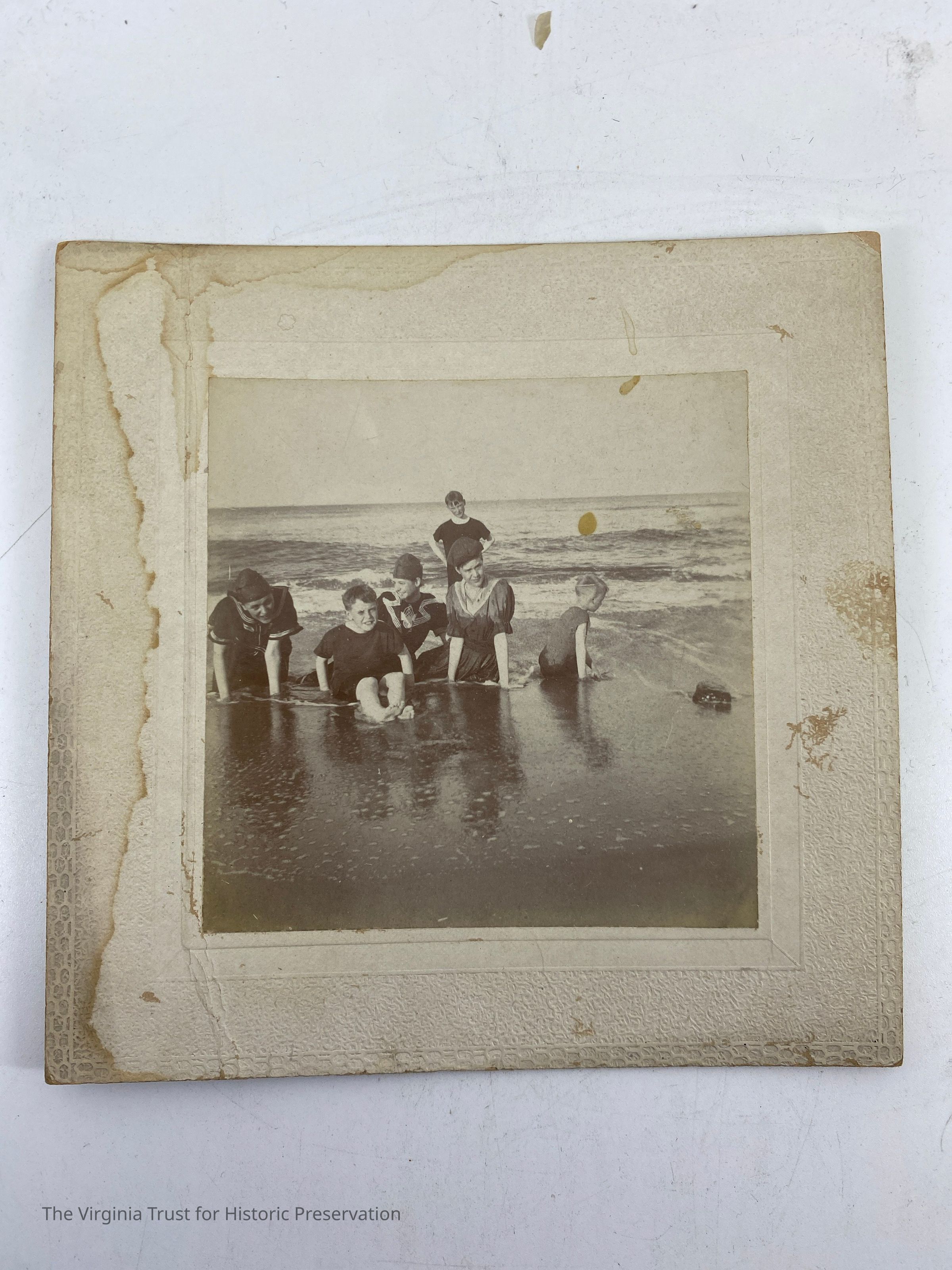 One of 24 theater programs, souvenirs, photos, and papers collected by Maude Downham. Group of six (three girls, three boys) in bathing dress sitting in the waves. Photo is water stained.
