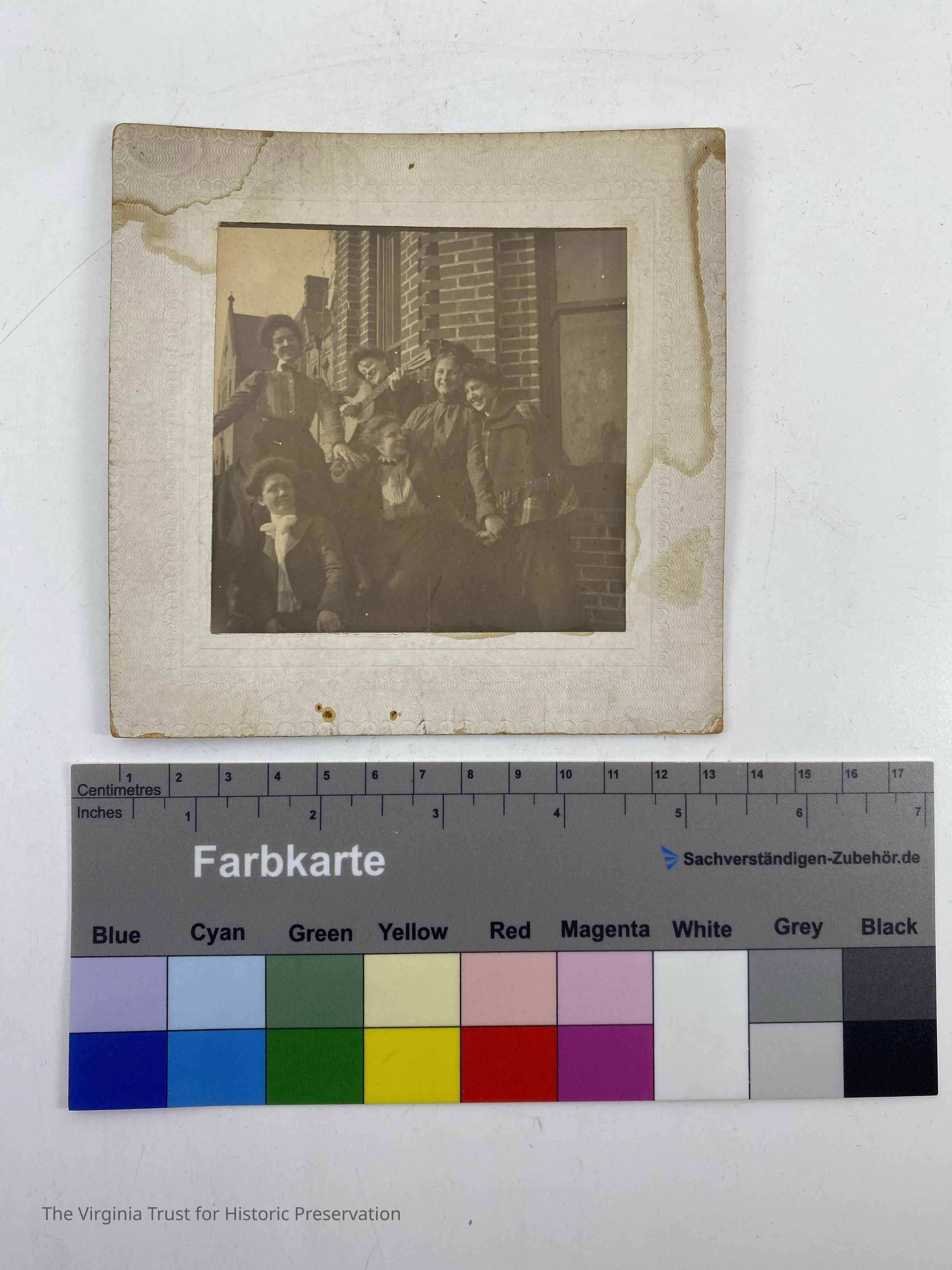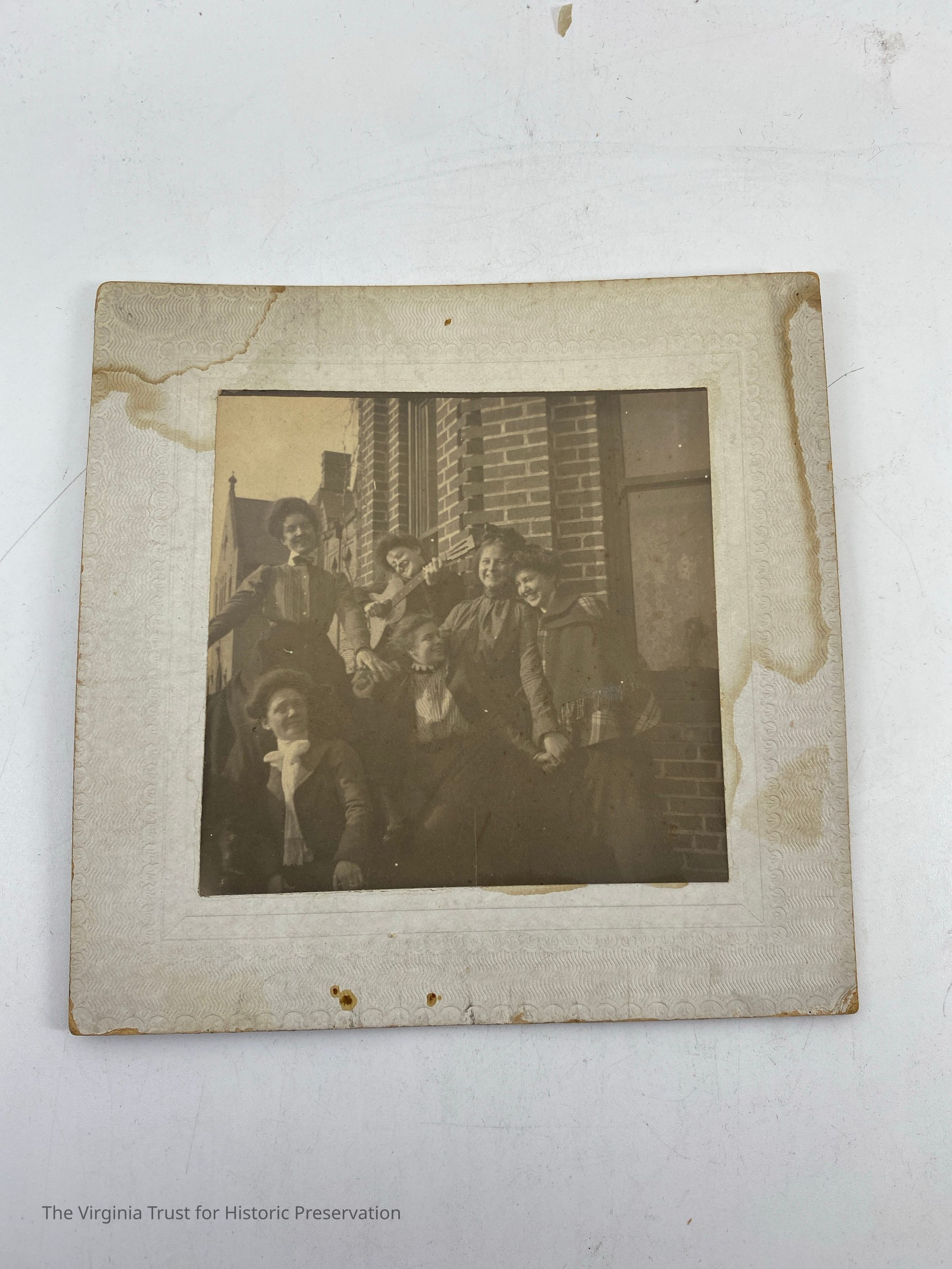 Group of six young women casually posed in front of a brick building with windows. One young woman holds a guitar. Photo is water stained.