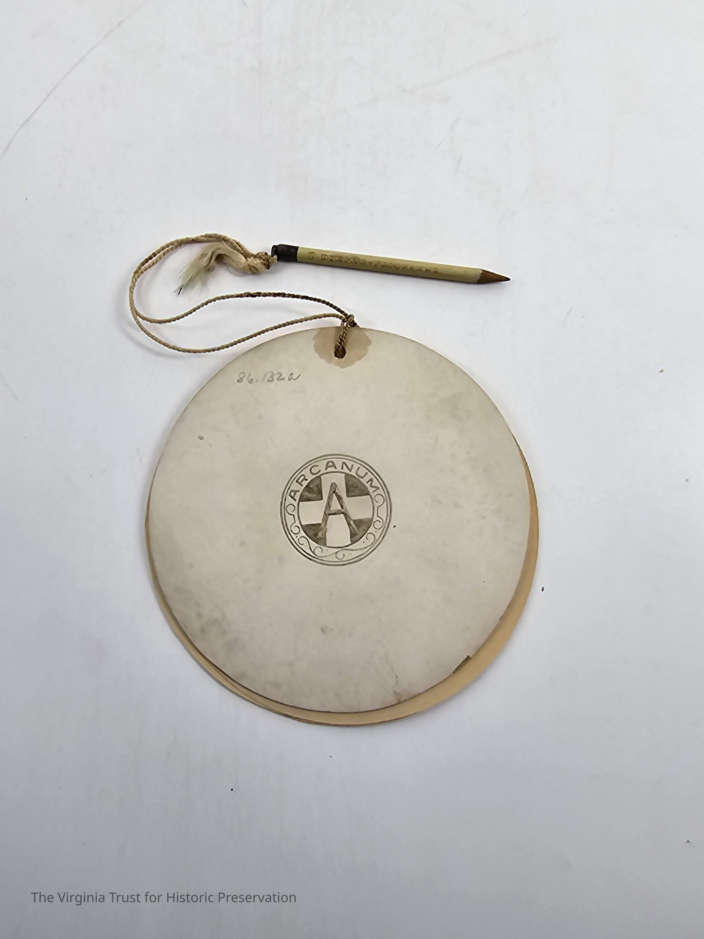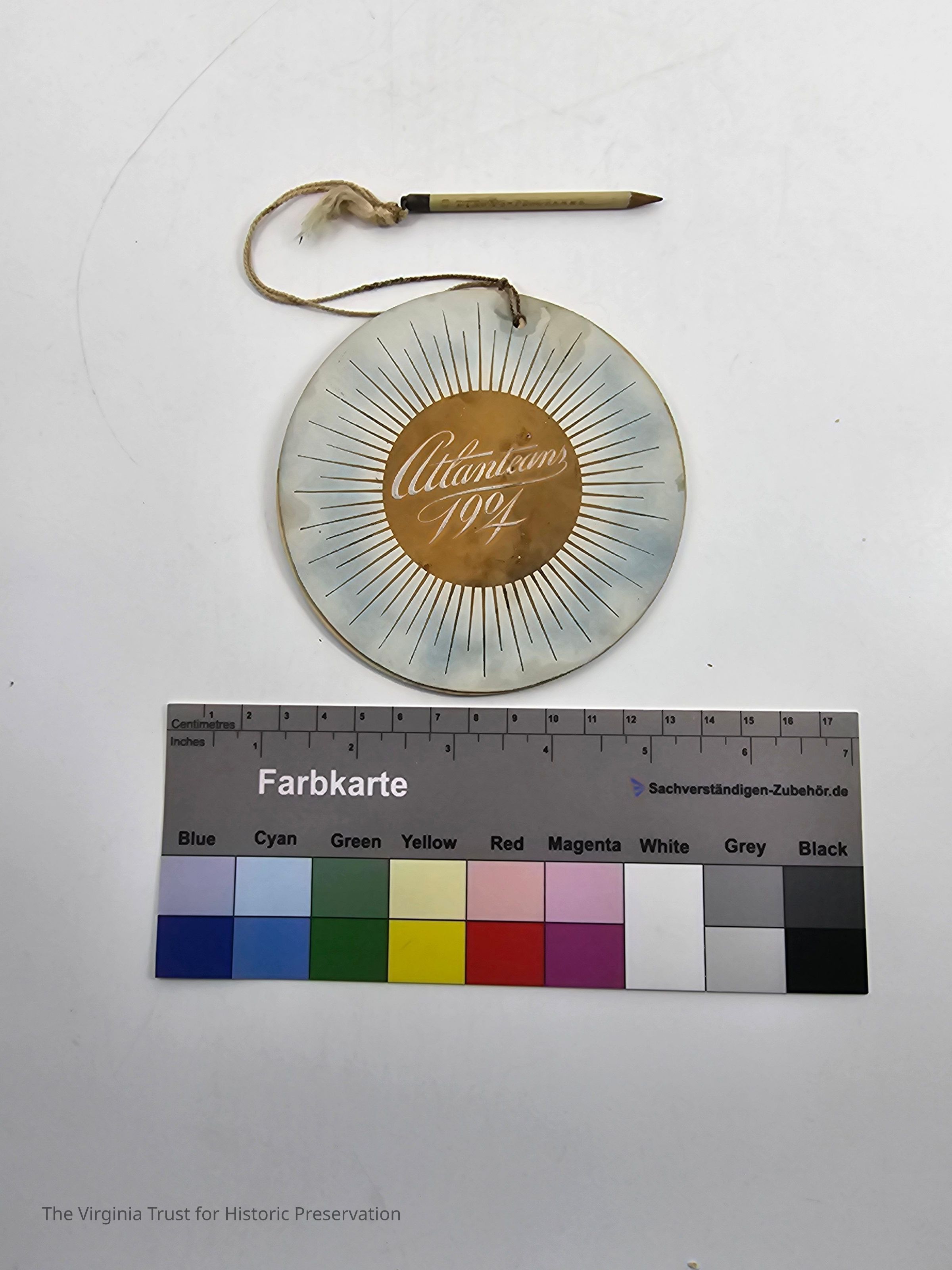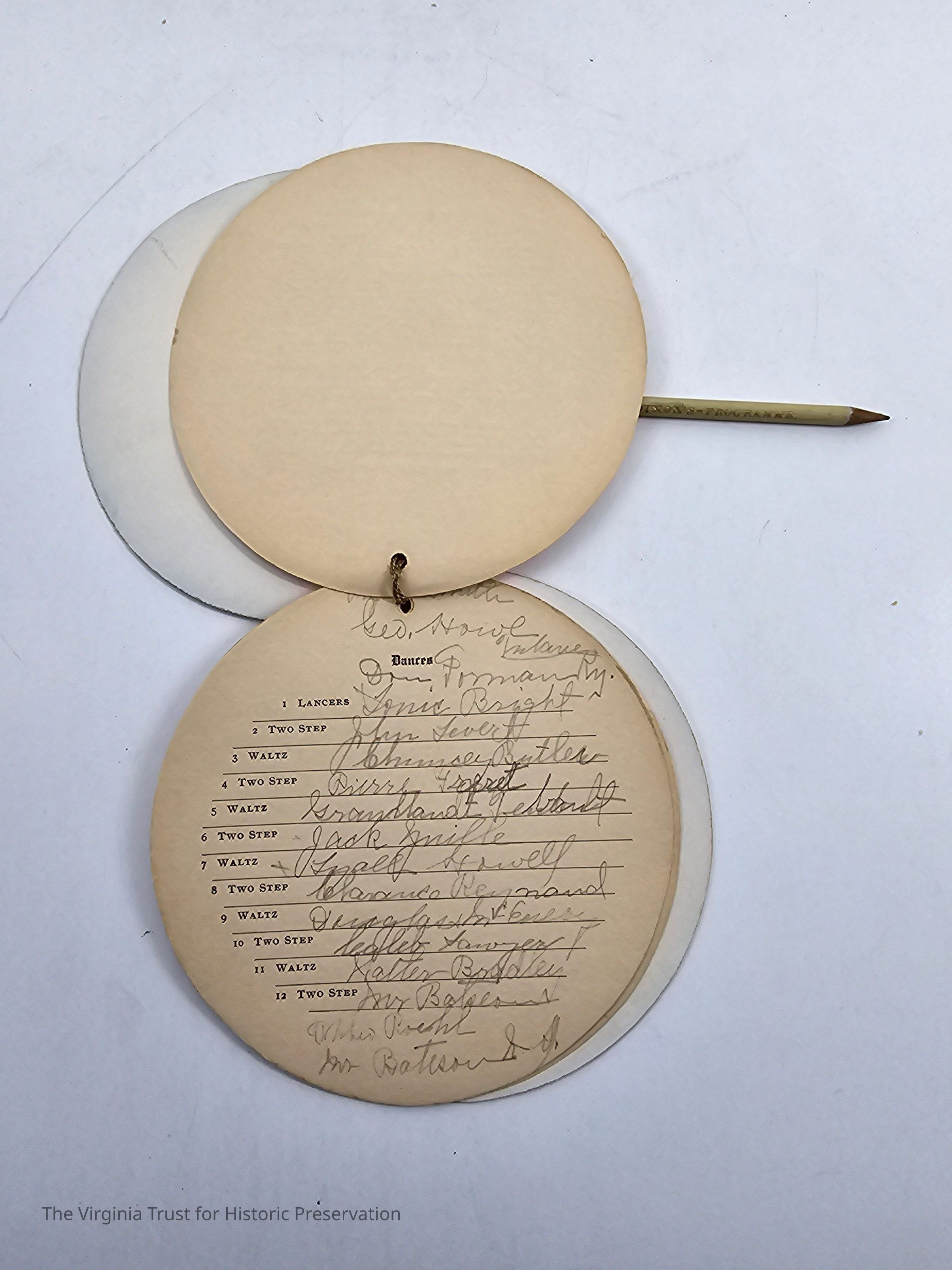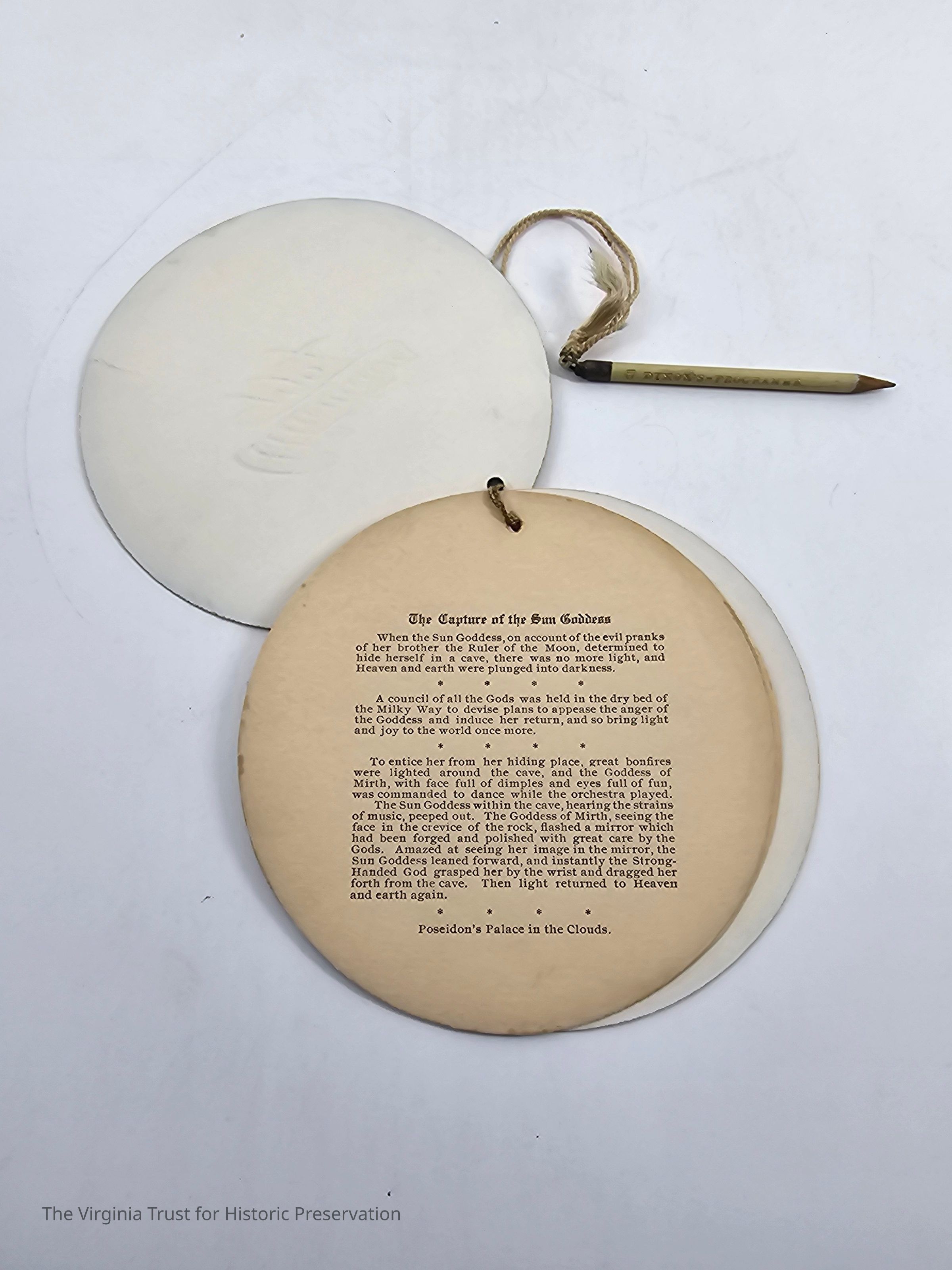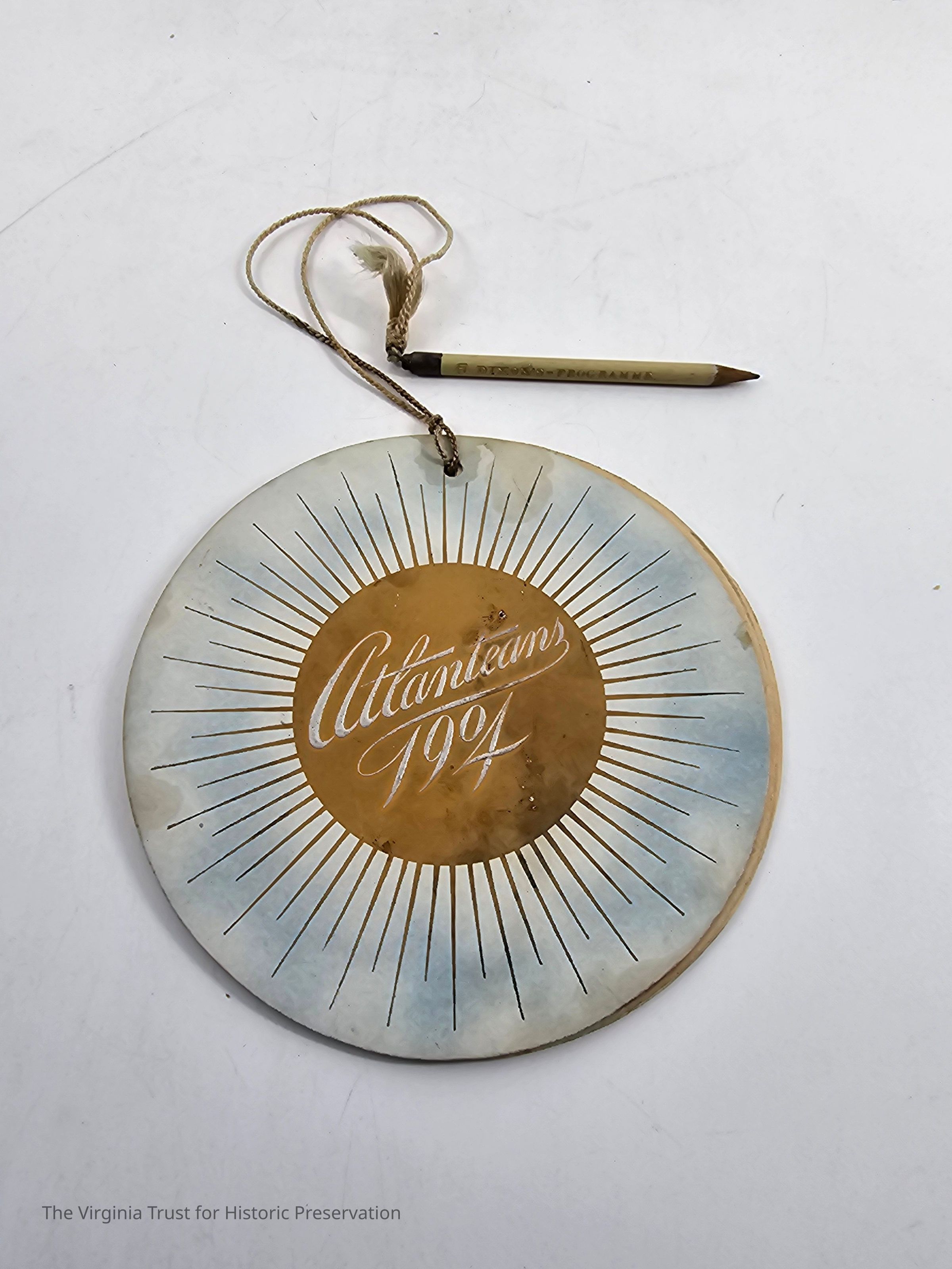 Atlanteans 1904. Circular dance card with attached pencil. "The Capture of the Sun Goddess" story on first page.