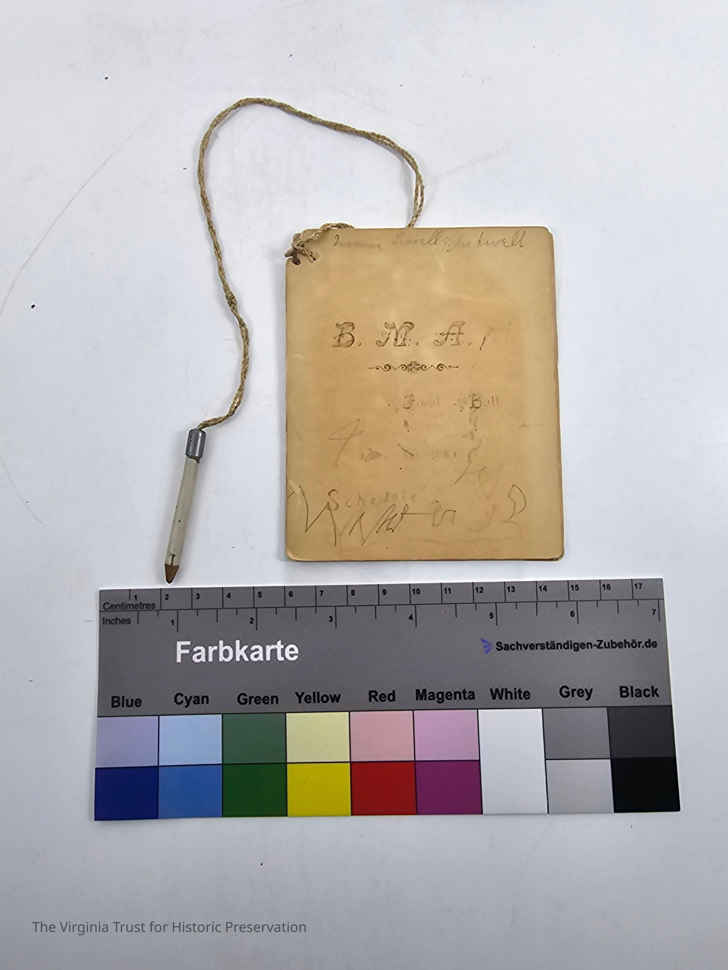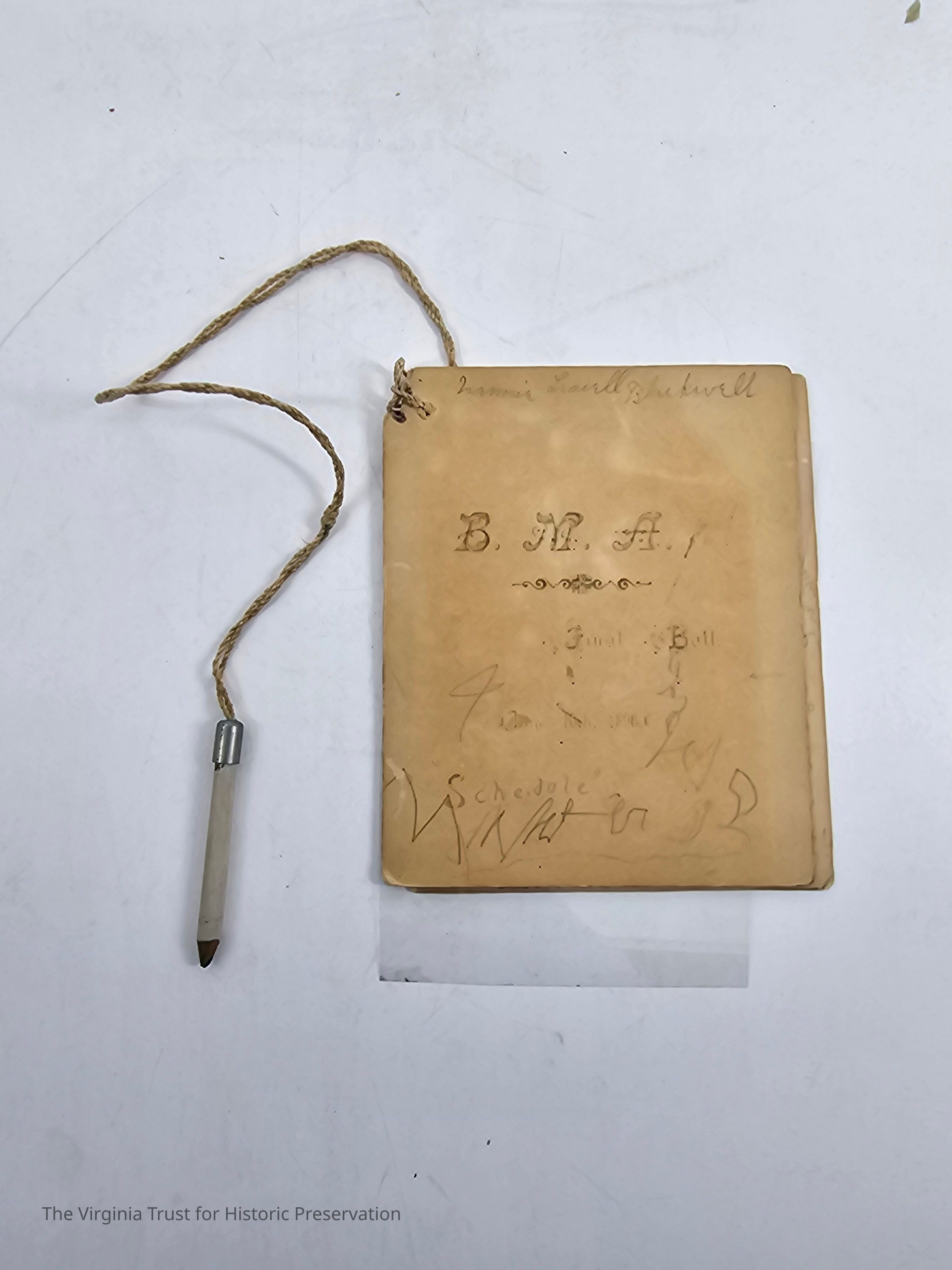 One of 24 theater programs, souvenirs, photos, and papers collected by Maude Downham. Bethel Military Academy Final Ball program dated June 10, 1896. Pencil attached.