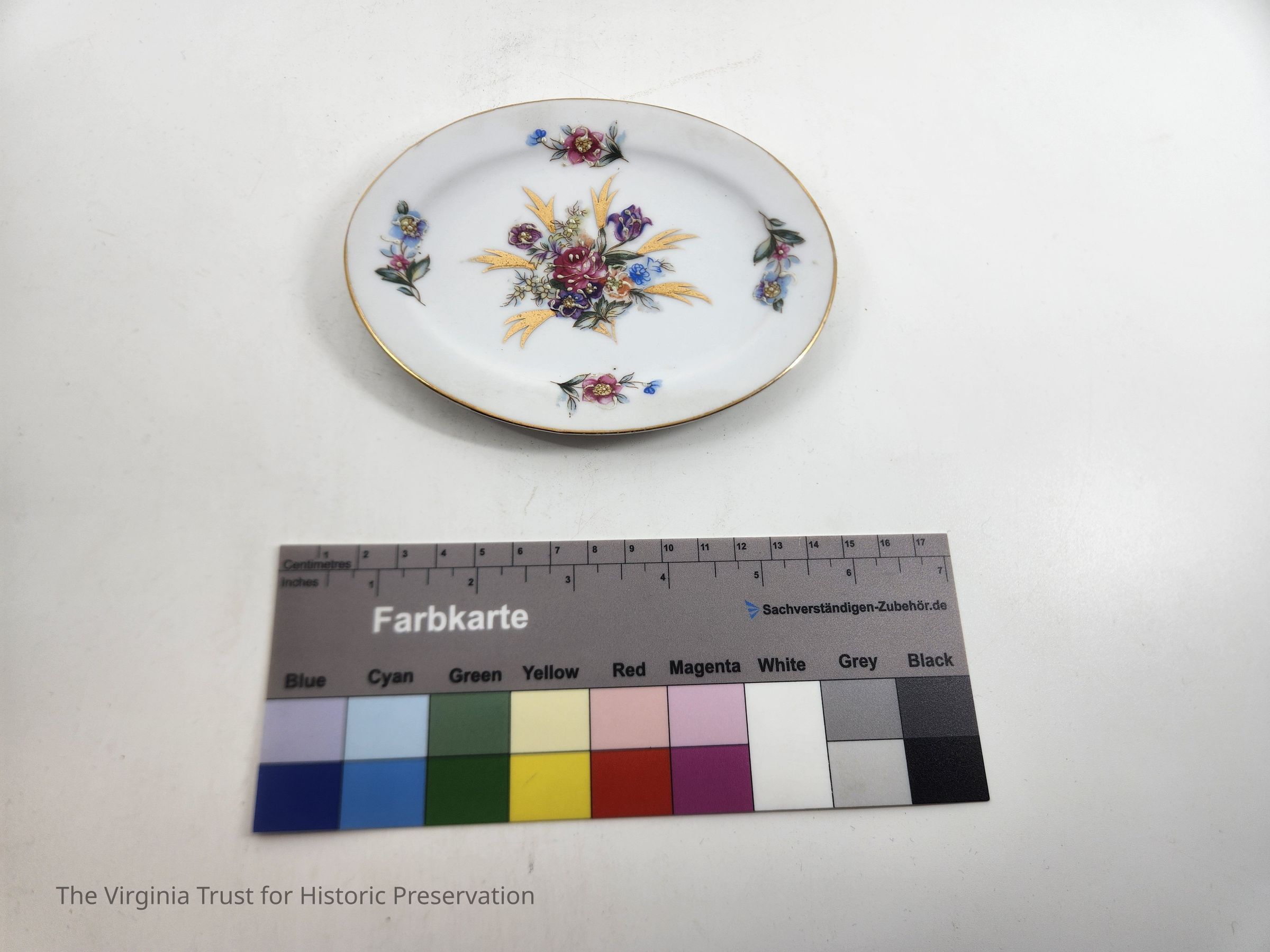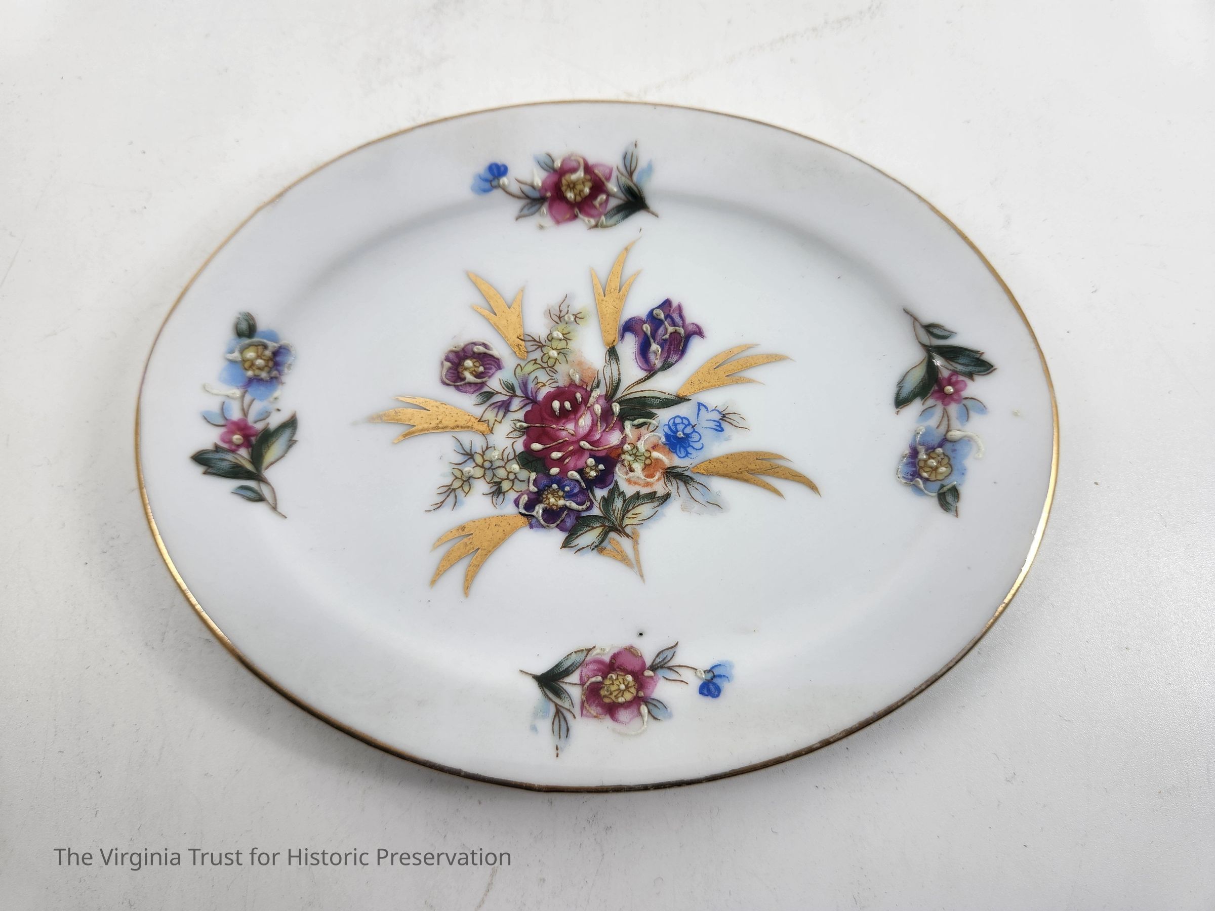 Miniature undertray to matching tureen (1986.138 A). White with floral designs and gold rim. Marked "Made in Japan". Doll dishes.